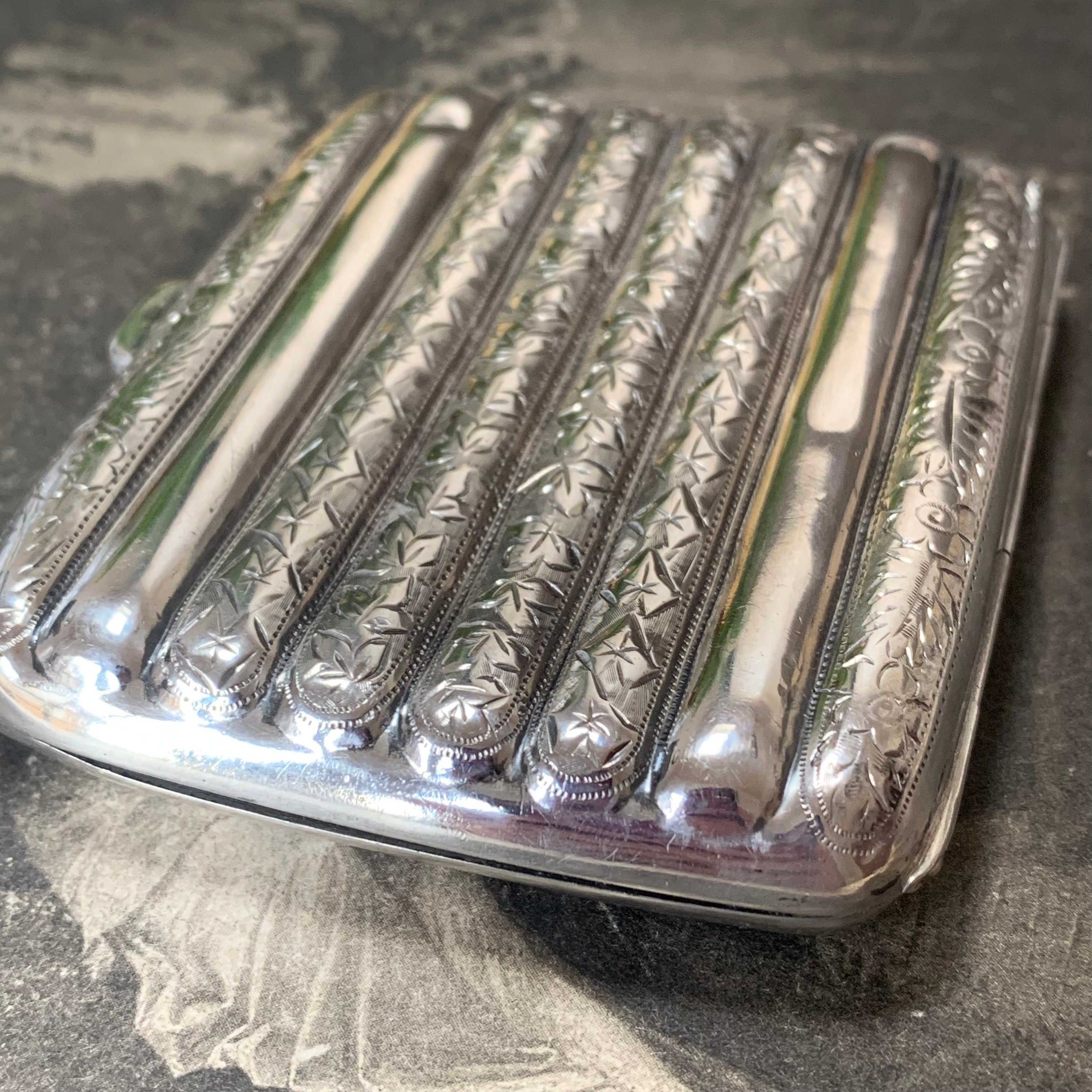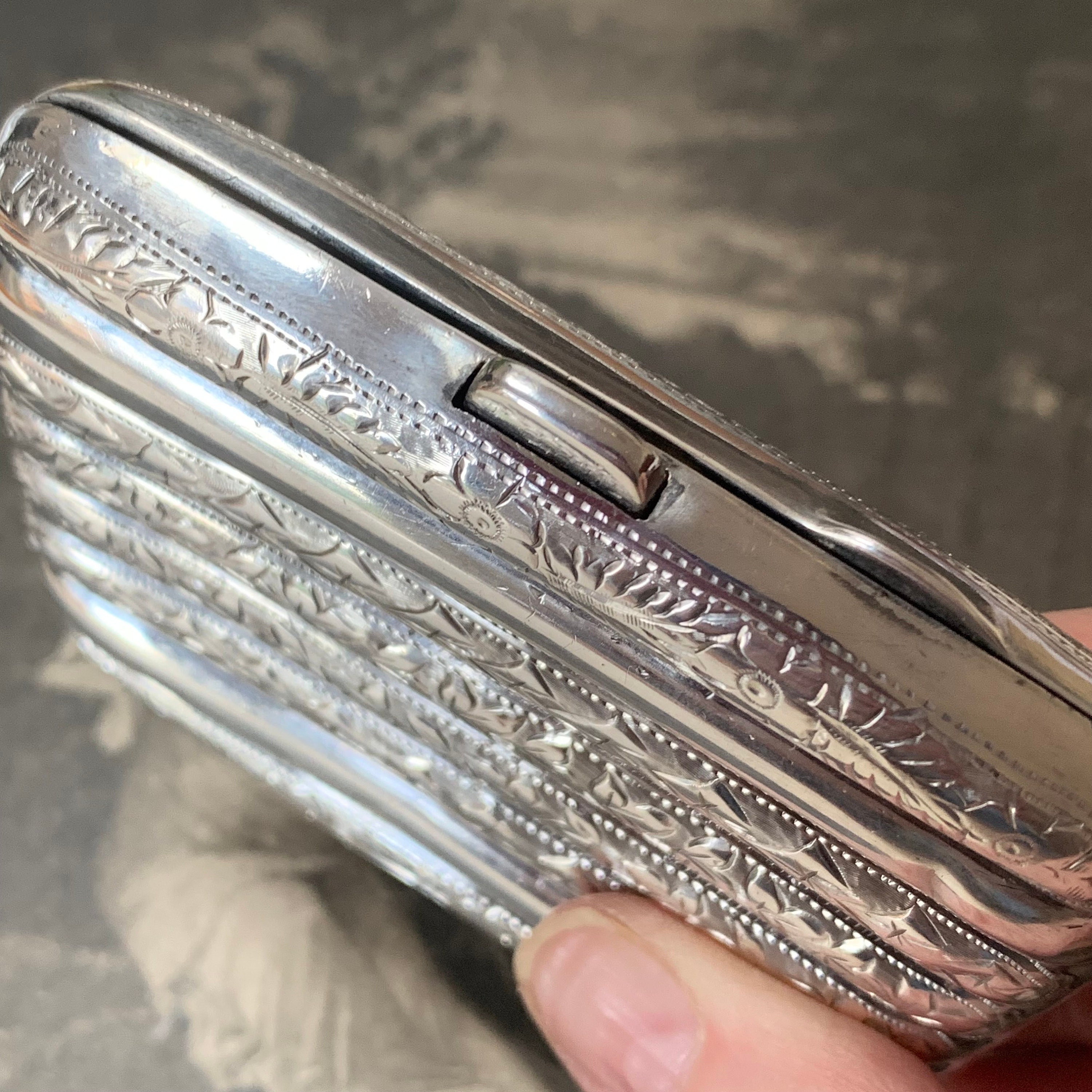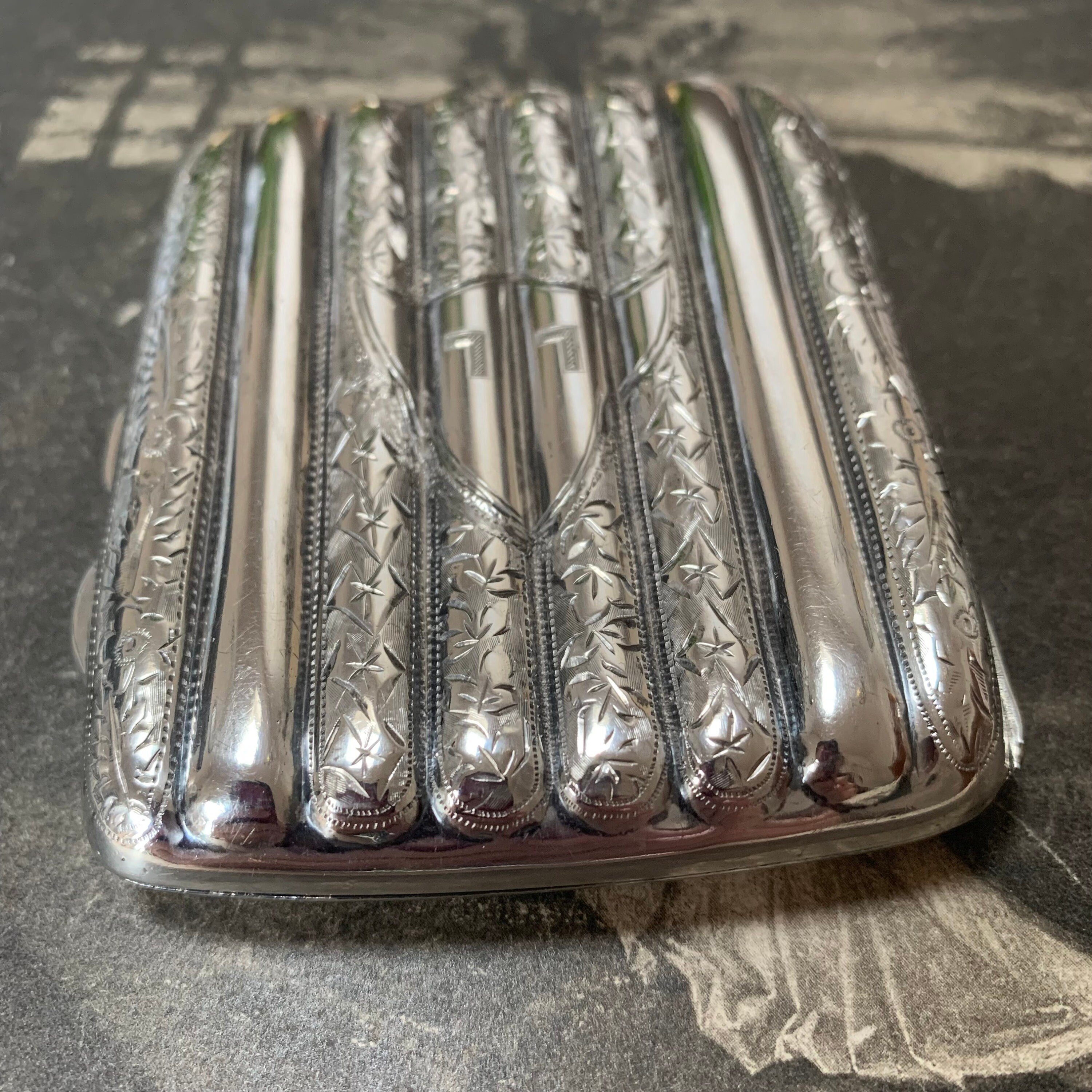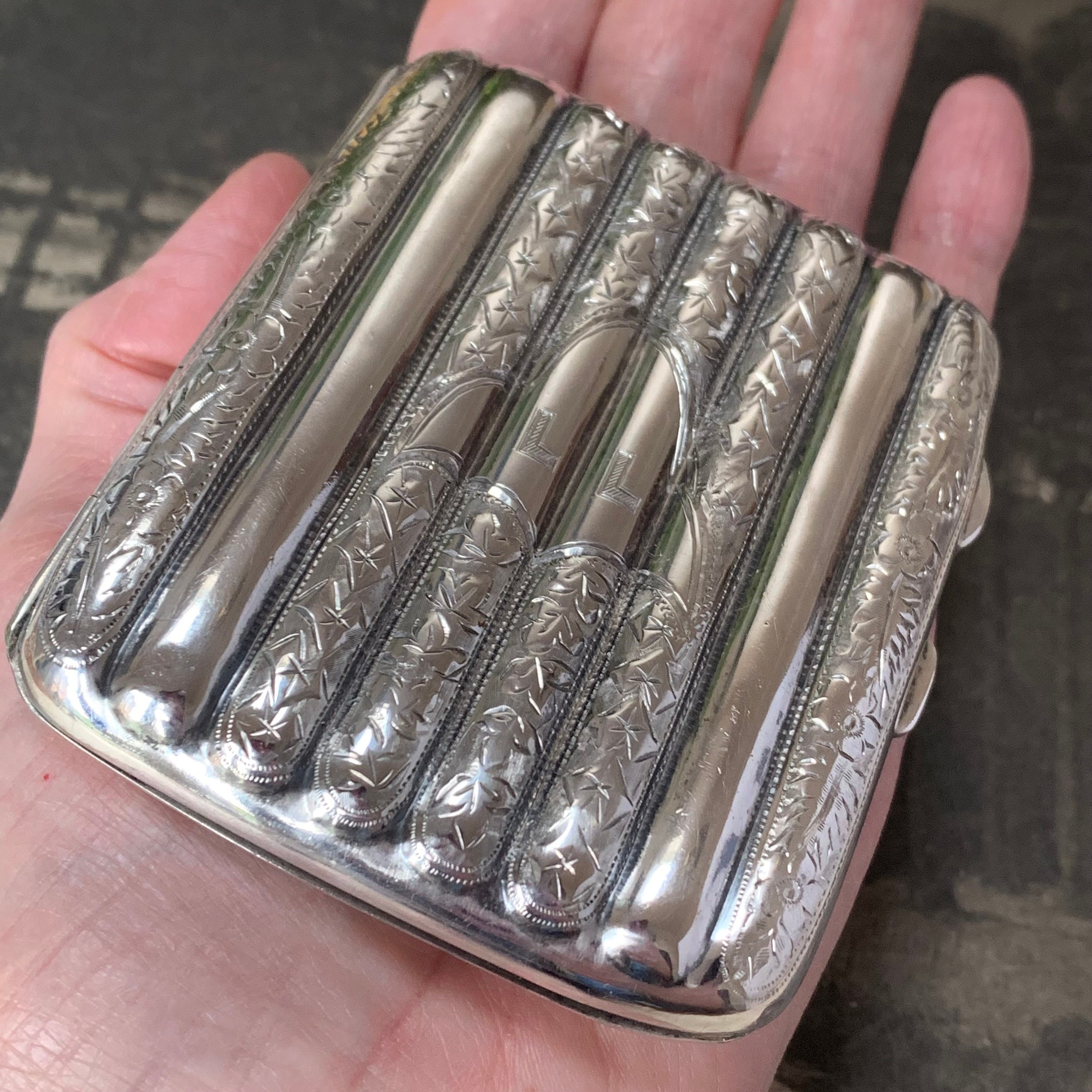 Art Deco antique silver cigarette case 81.2 grames in weight. 1912 Birmingham hallmark. Engraved forget-me-not and ivy leaves to both the front and the back. The case is made from solid sterling silver and is hallmarked for Birmingham, Lion Passant and a date letter for 1912. The case compartmented in style and is richly engraved with a cartouche to the front that has the initials LL which form part of its historic narrative. The inside has been gilt satin finished and bears the hallmark to both sides. With elastic style retainers to secure its contents. Due to its age the case has a small dink to the back along with other minor associated historic wear commensurate with an item of its age, however is still in fabulous condition for a piece of its era.