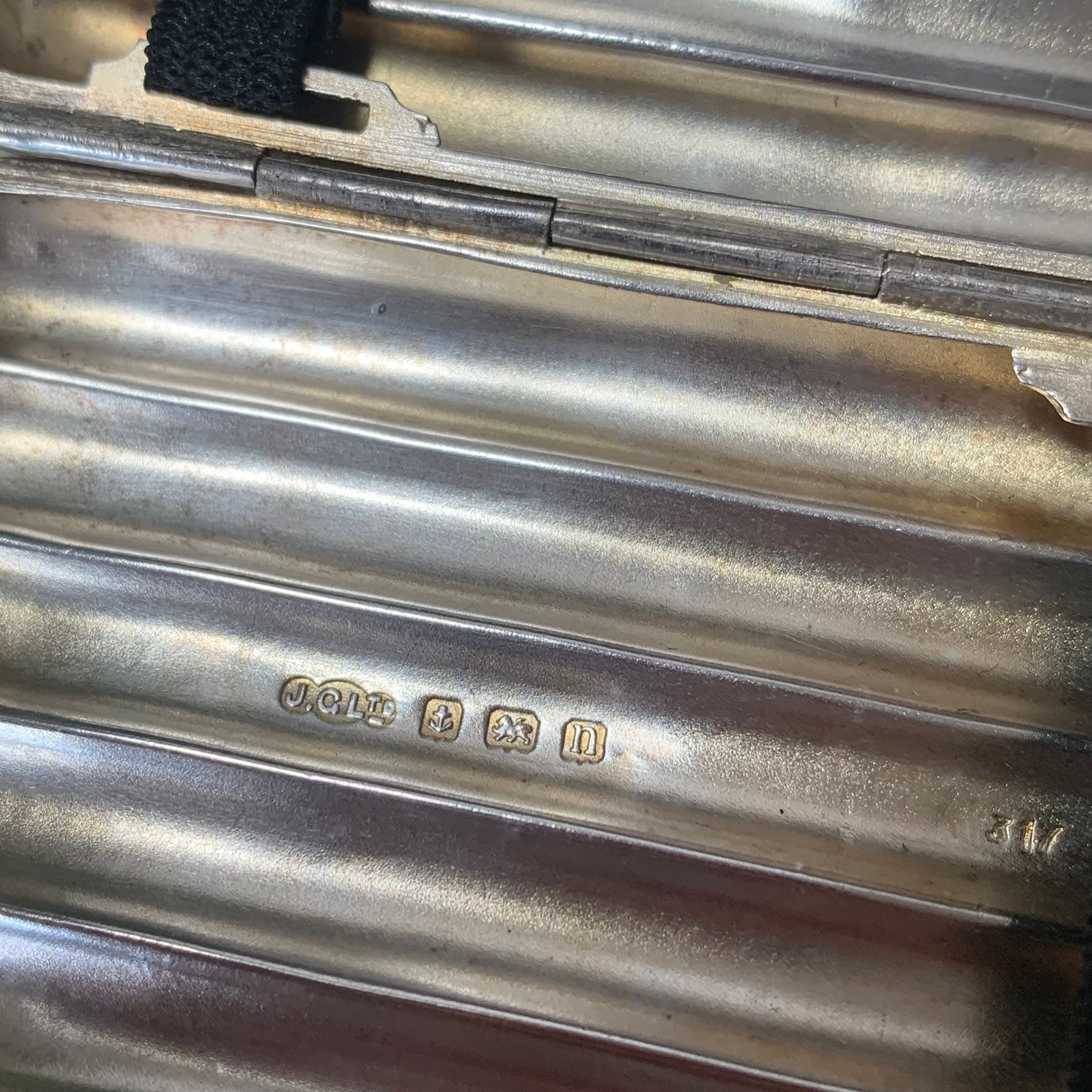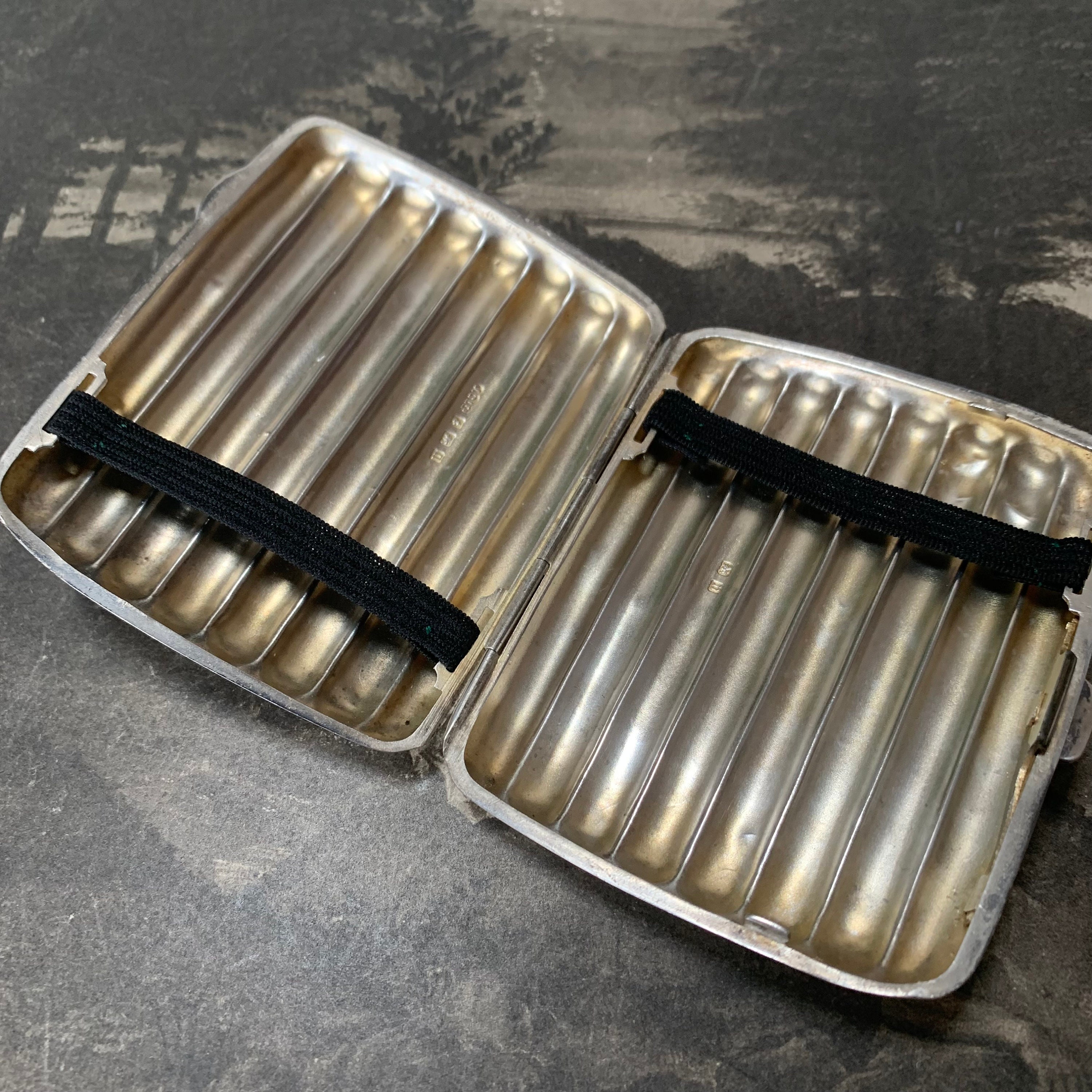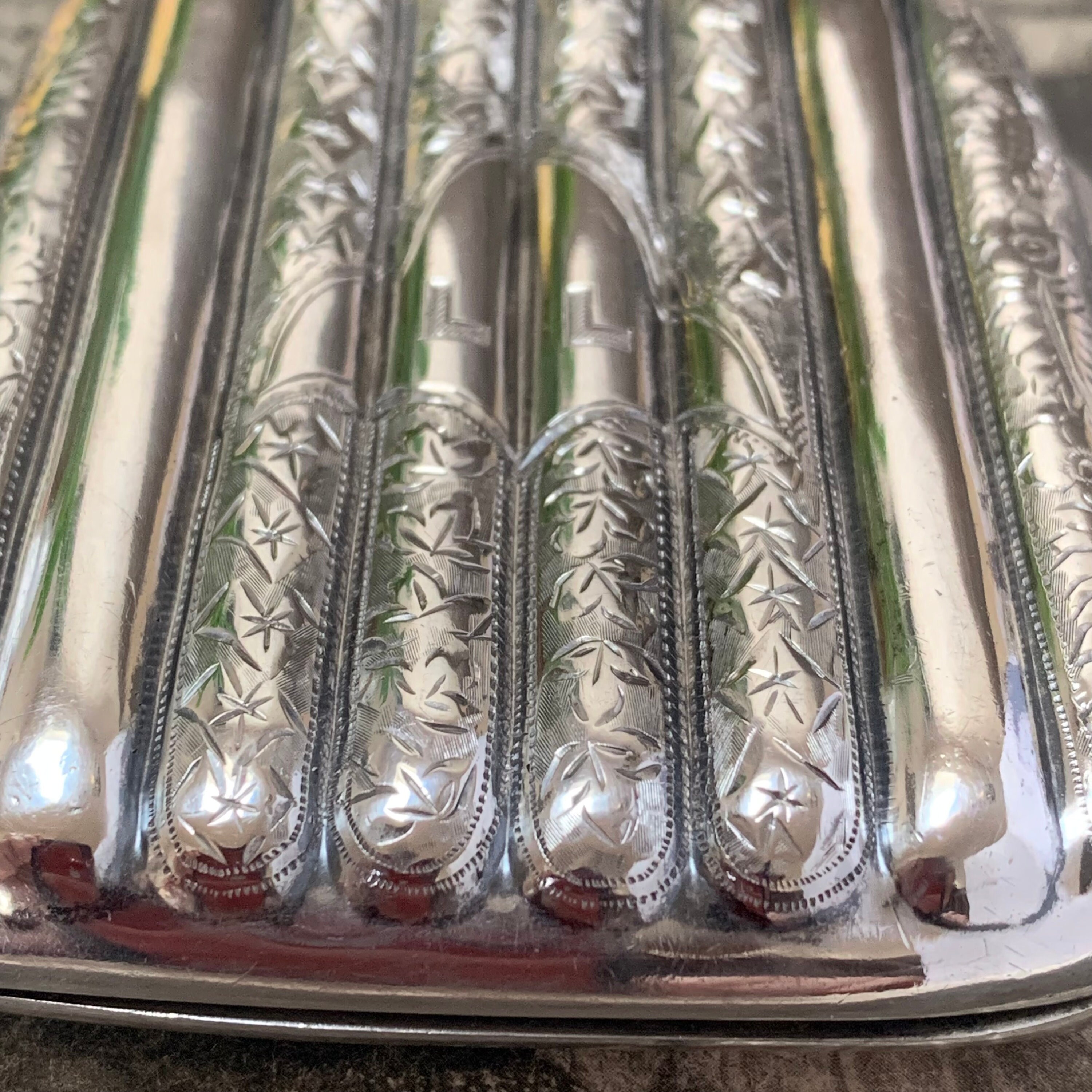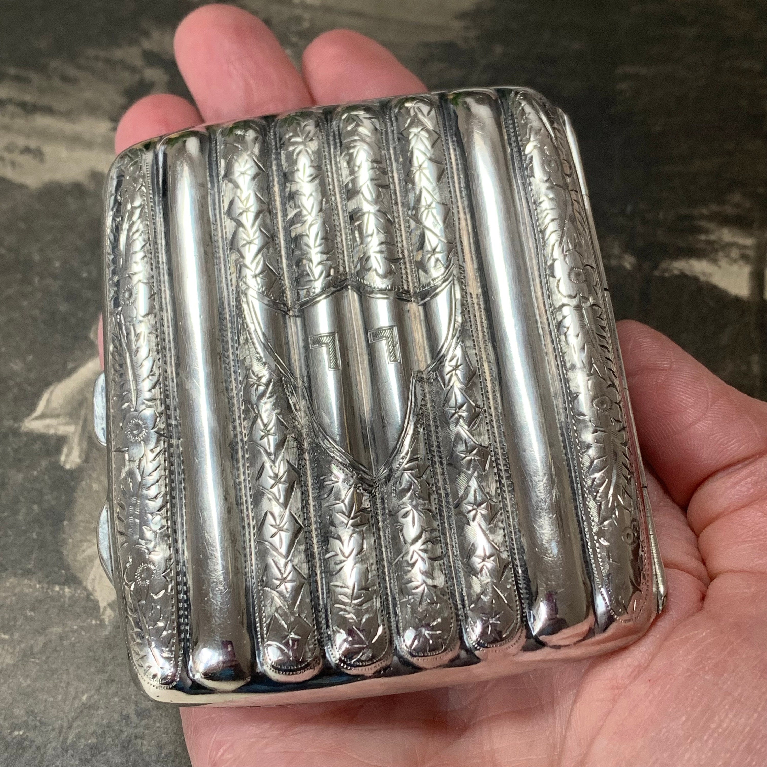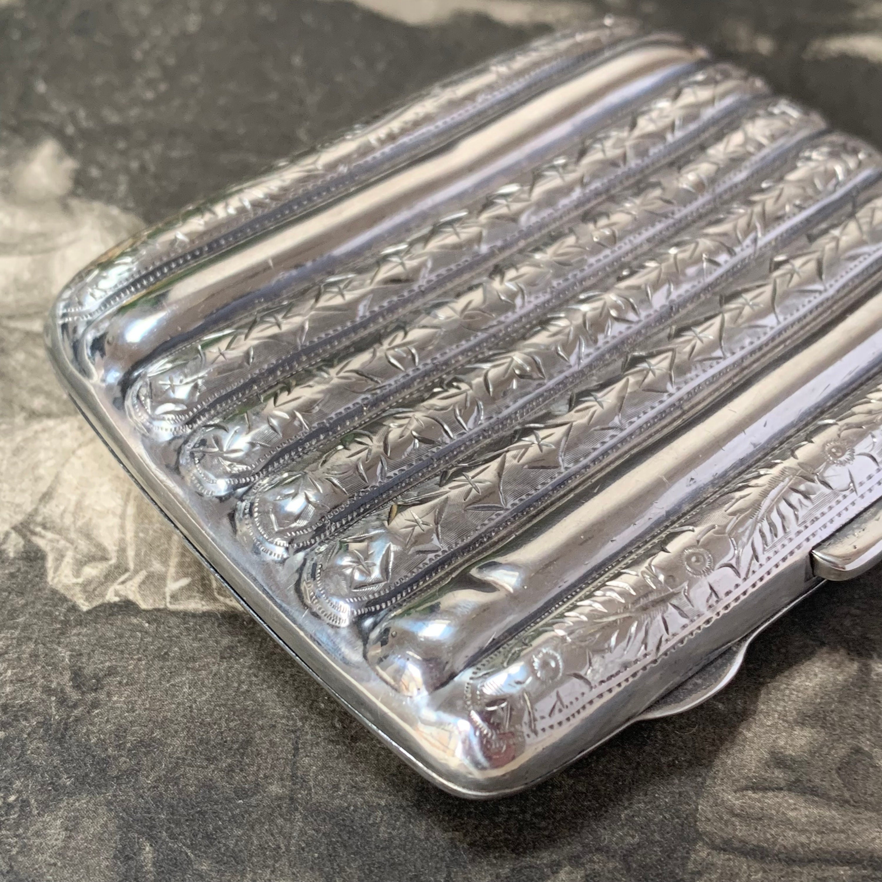 Art Deco antique silver cigarette case 81.2 grames in weight. 1912 Birmingham hallmark. Engraved forget-me-not and ivy leaves to both the front and the back. The case is made from solid sterling silver and is hallmarked for Birmingham, Lion Passant and a date letter for 1912. The case compartmented in style and is richly engraved with a cartouche to the front that has the initials LL which form part of its historic narrative. The inside has been gilt satin finished and bears the hallmark to both sides. With elastic style retainers to secure its contents. Due to its age the case has a small dink to the back along with other minor associated historic wear commensurate with an item of its age, however is still in fabulous condition for a piece of its era.