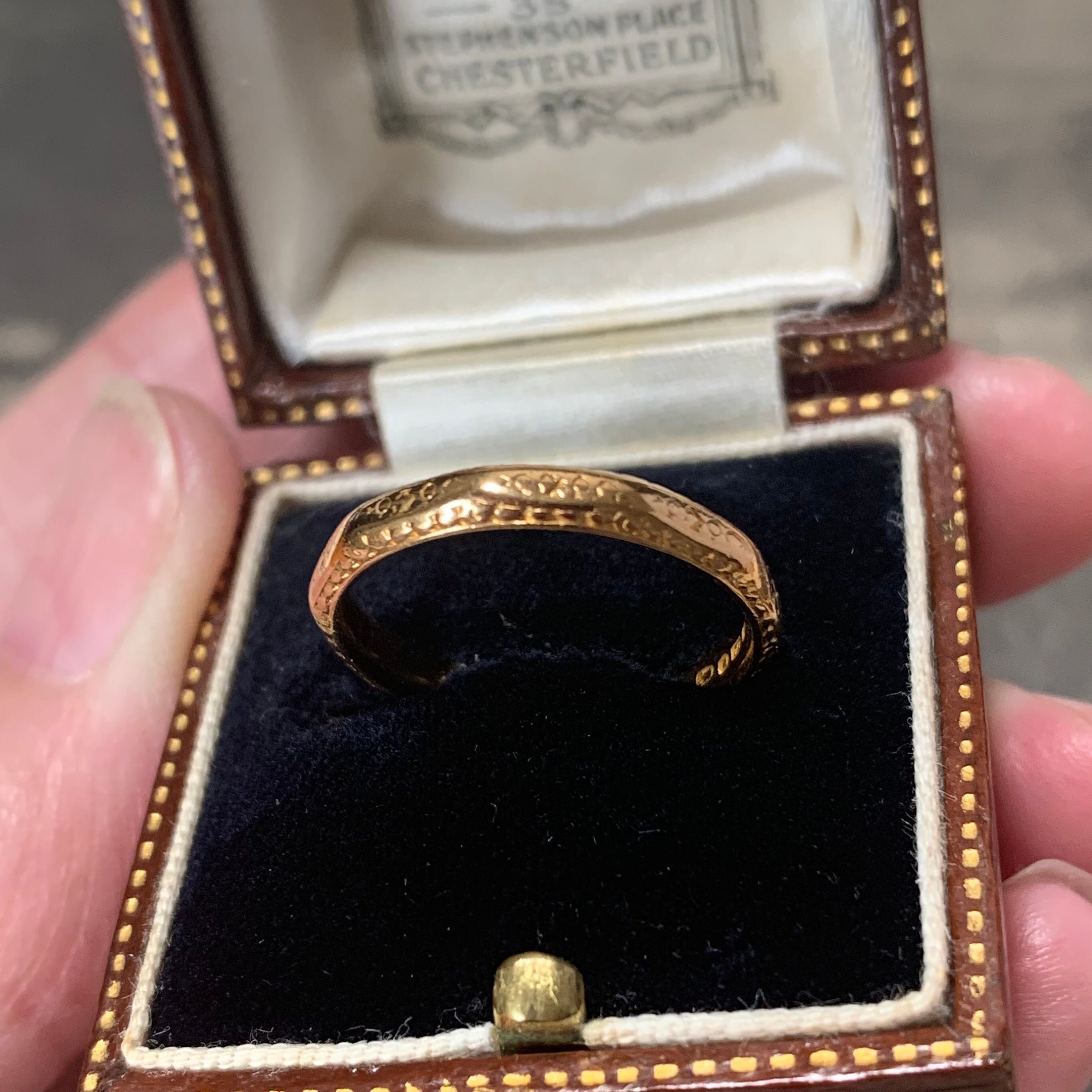 The ring is hallmarked in London, dating back to 1953, and includes a coronation mark along with the word ‘century’ stamped inside. This rare piece, weighing 3.5 grams, has been sympathetically repolished and is in very good condition for its age, showing only minimal age-related wear. Please note that while the antique box is not included, this exquisite 22ct gold band will be presented in a new ring box.