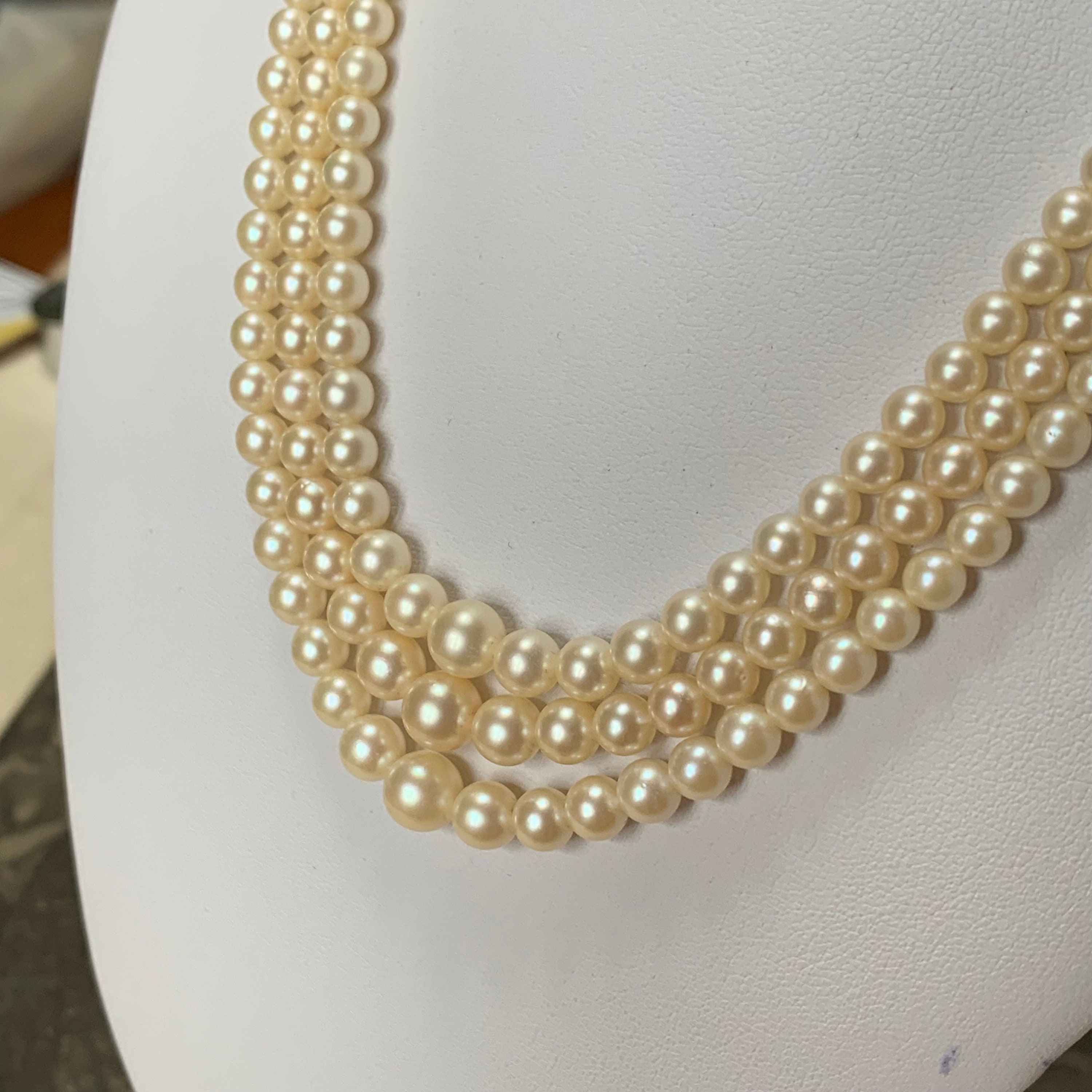 Art deco three-strand cultured pearl necklace, with 9ct white gold clasp with a lovely old mine cut diamond. Crafted with meticulous care circa 1930s, this necklace boasts a total of 277 luminous saltwater cultured pearls, each meticulously matched to perfection.