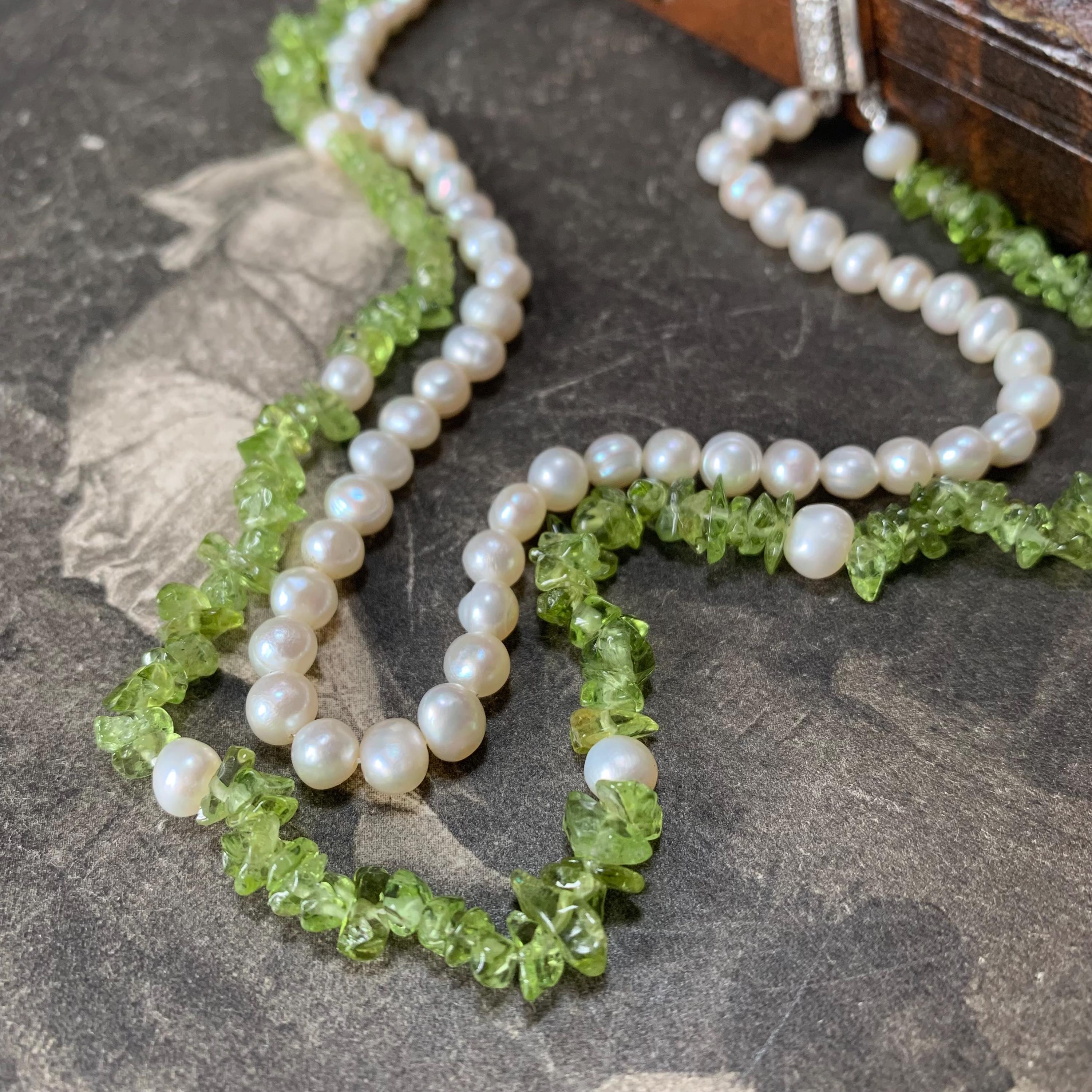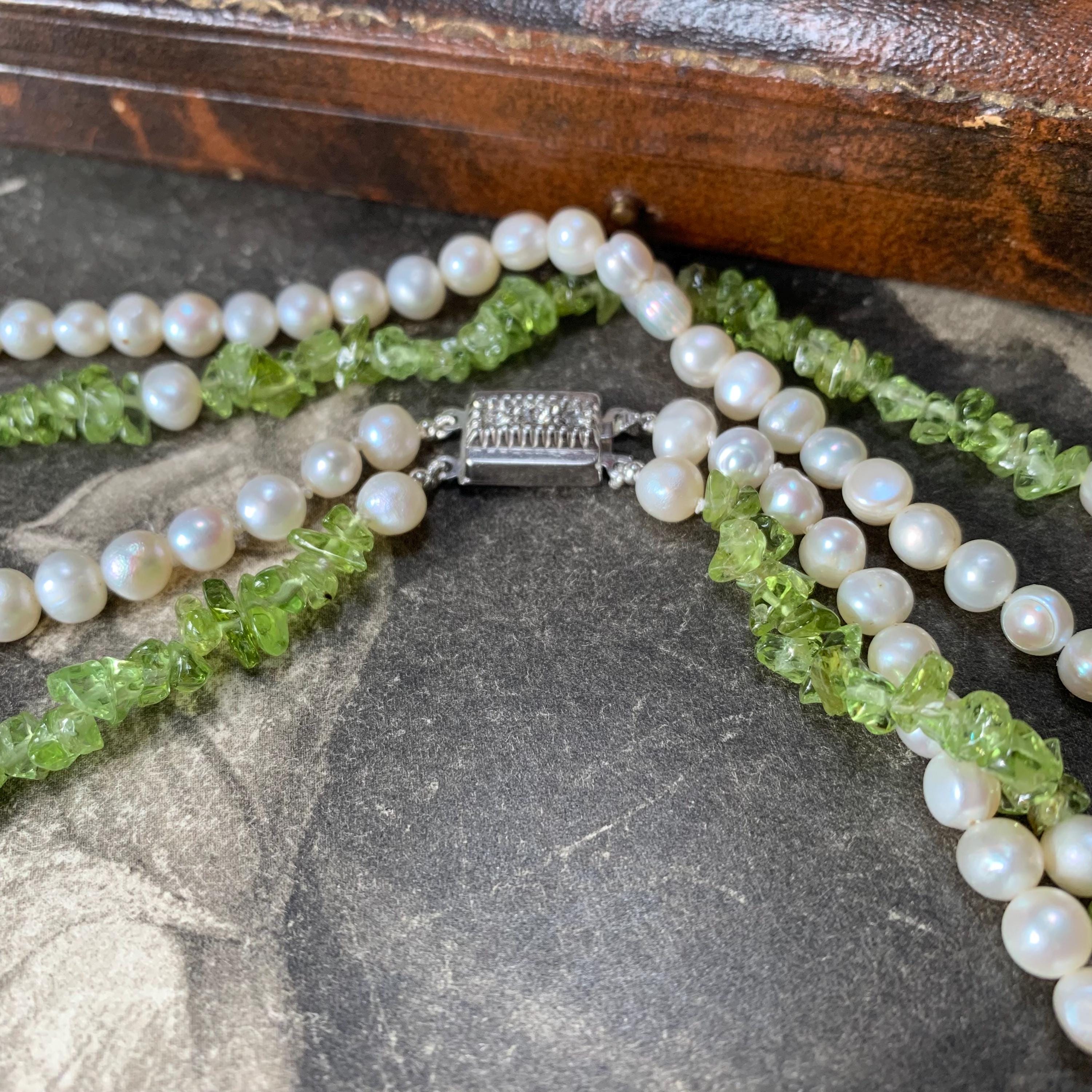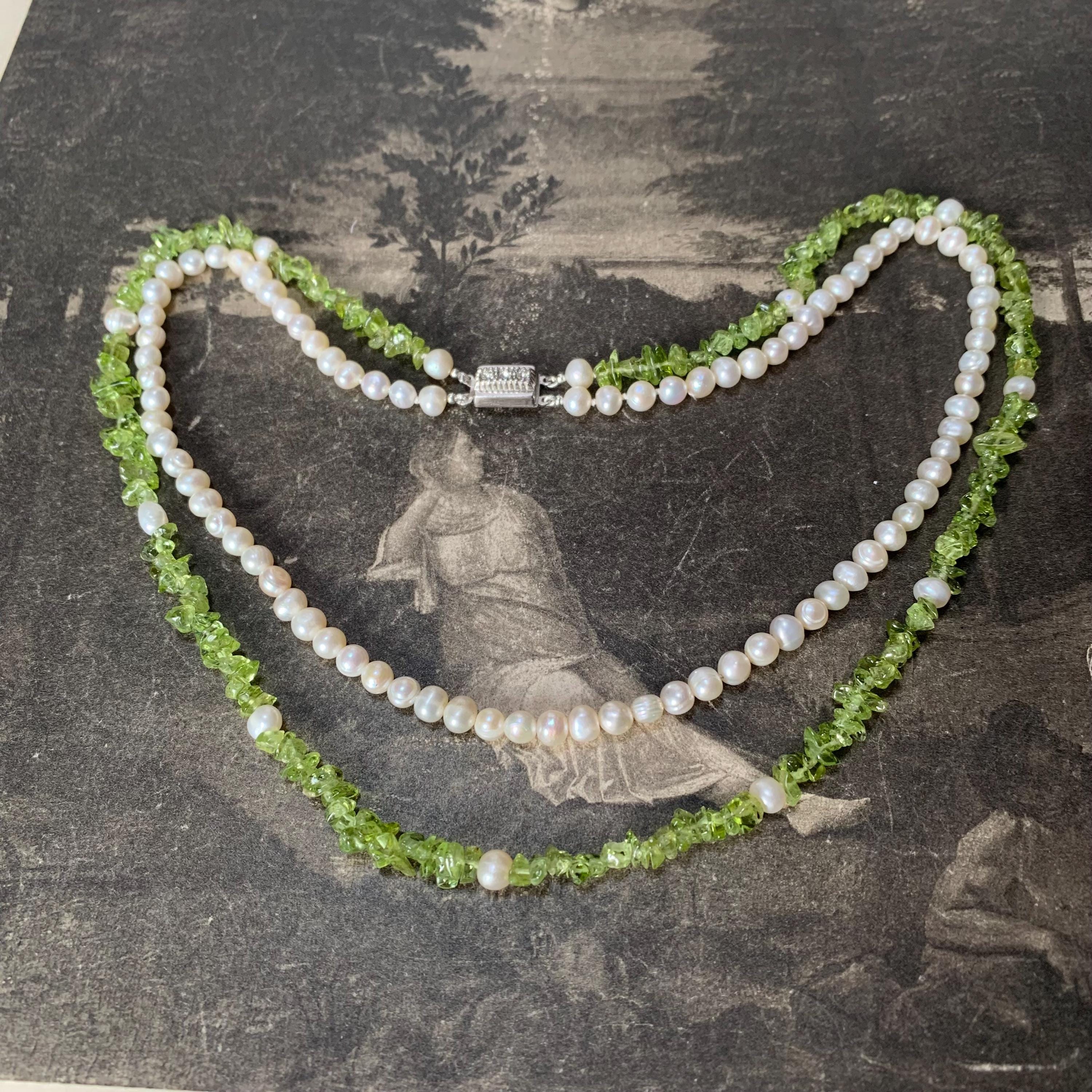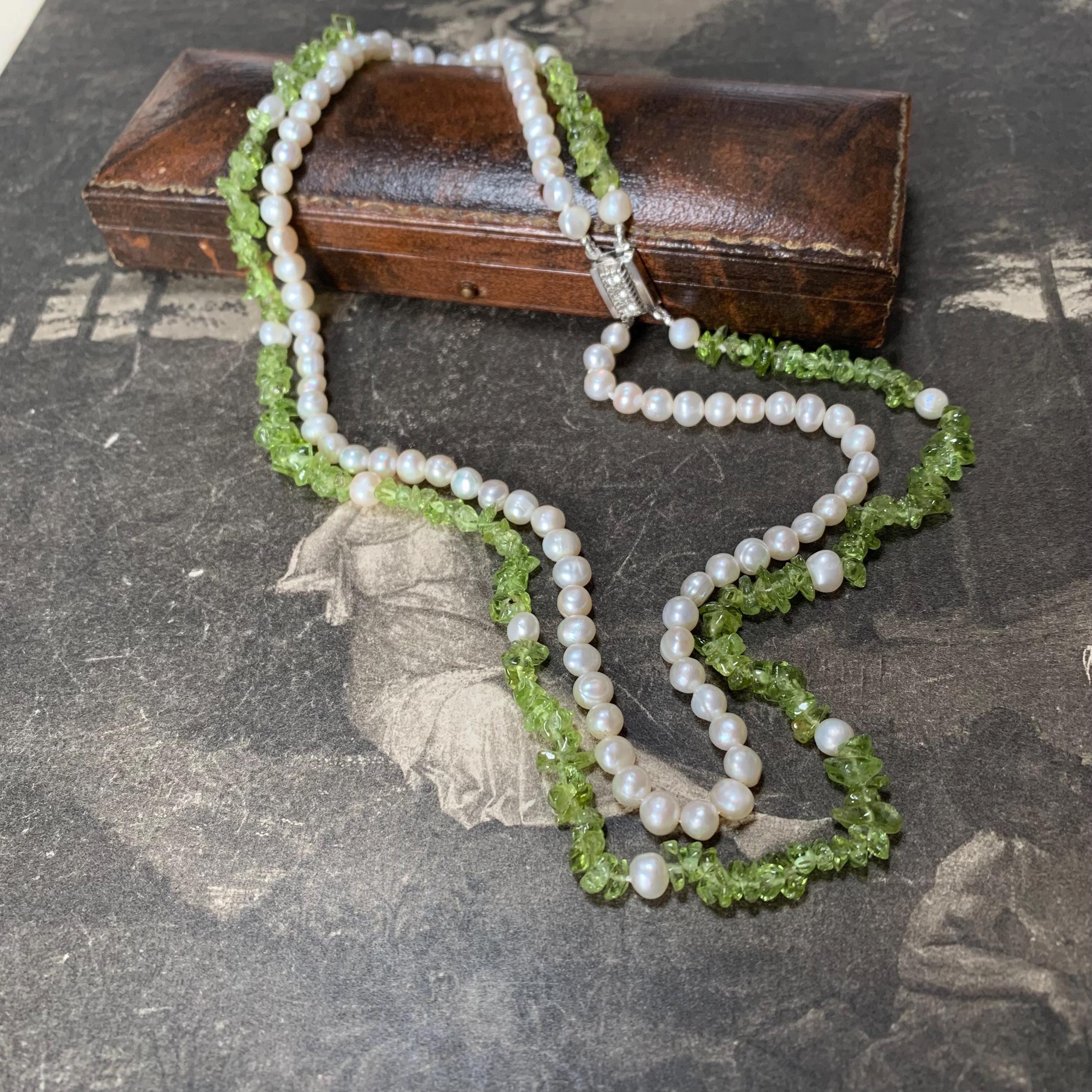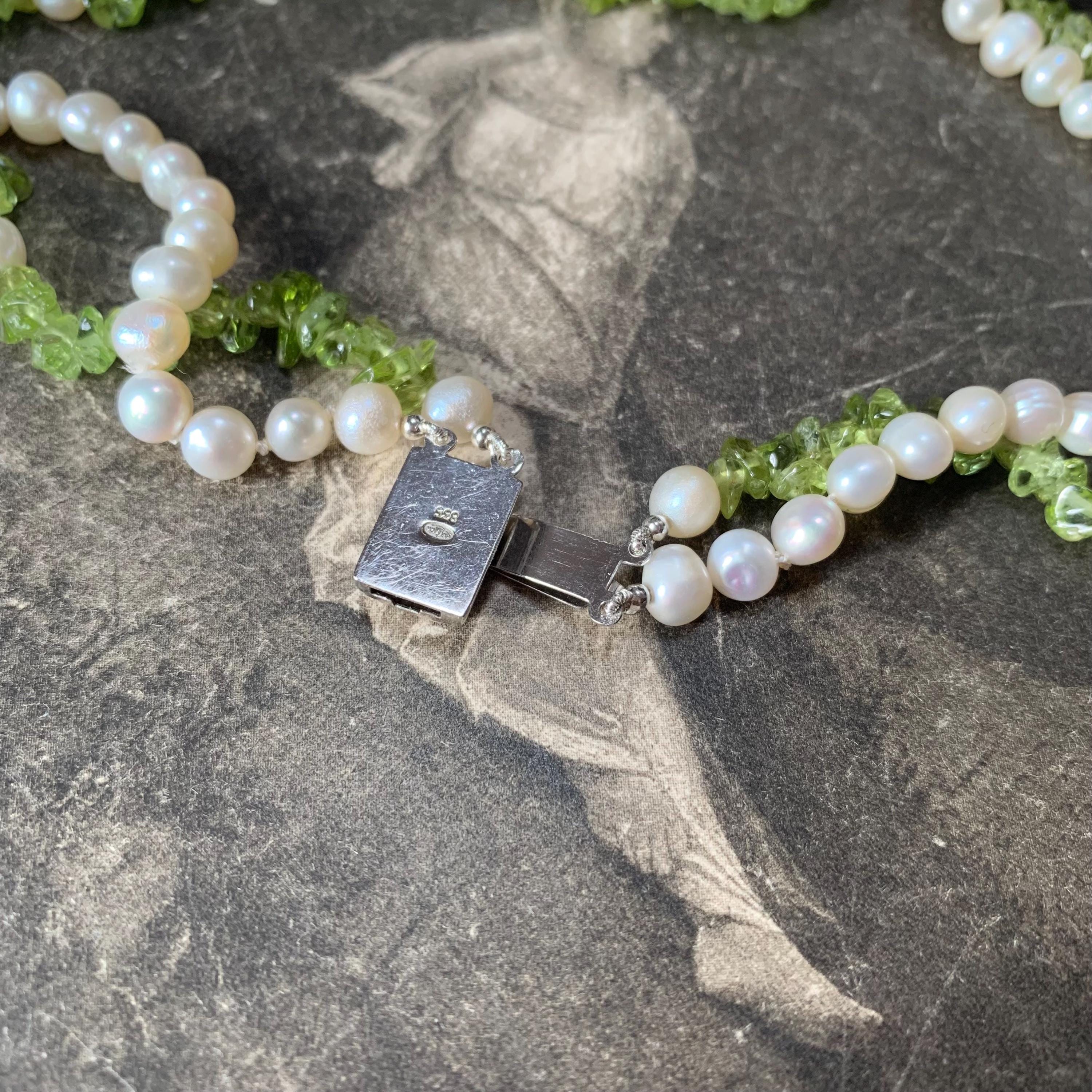 Natural peridot and freshwater double strand pearl necklace with silver and marcasite set clasp. A modern take on a classic two row necklace with the luscious green peridot gemstone in harmony with the white freshwater pearls. The clasp is marked silver and the necklace length is 46.5 cm for the shorter strand and 51cm for the longer strand. Hand strung in our studio and in new condition. The matinee length falls between the princess and opera lengths. It is often chosen for business or semi-formal attire, as it provides a slightly more relaxed look. This necklace will come in a necklace presentation box.