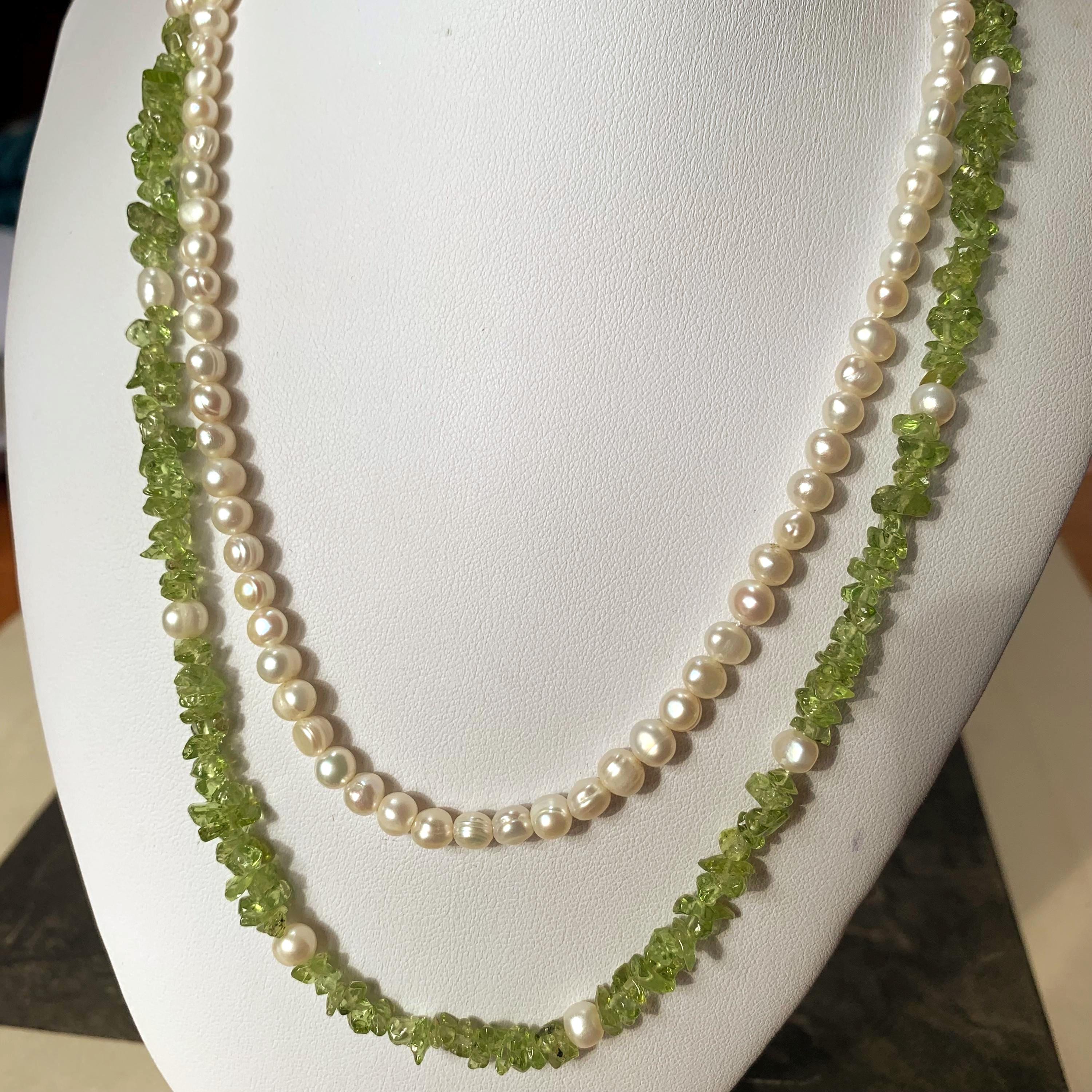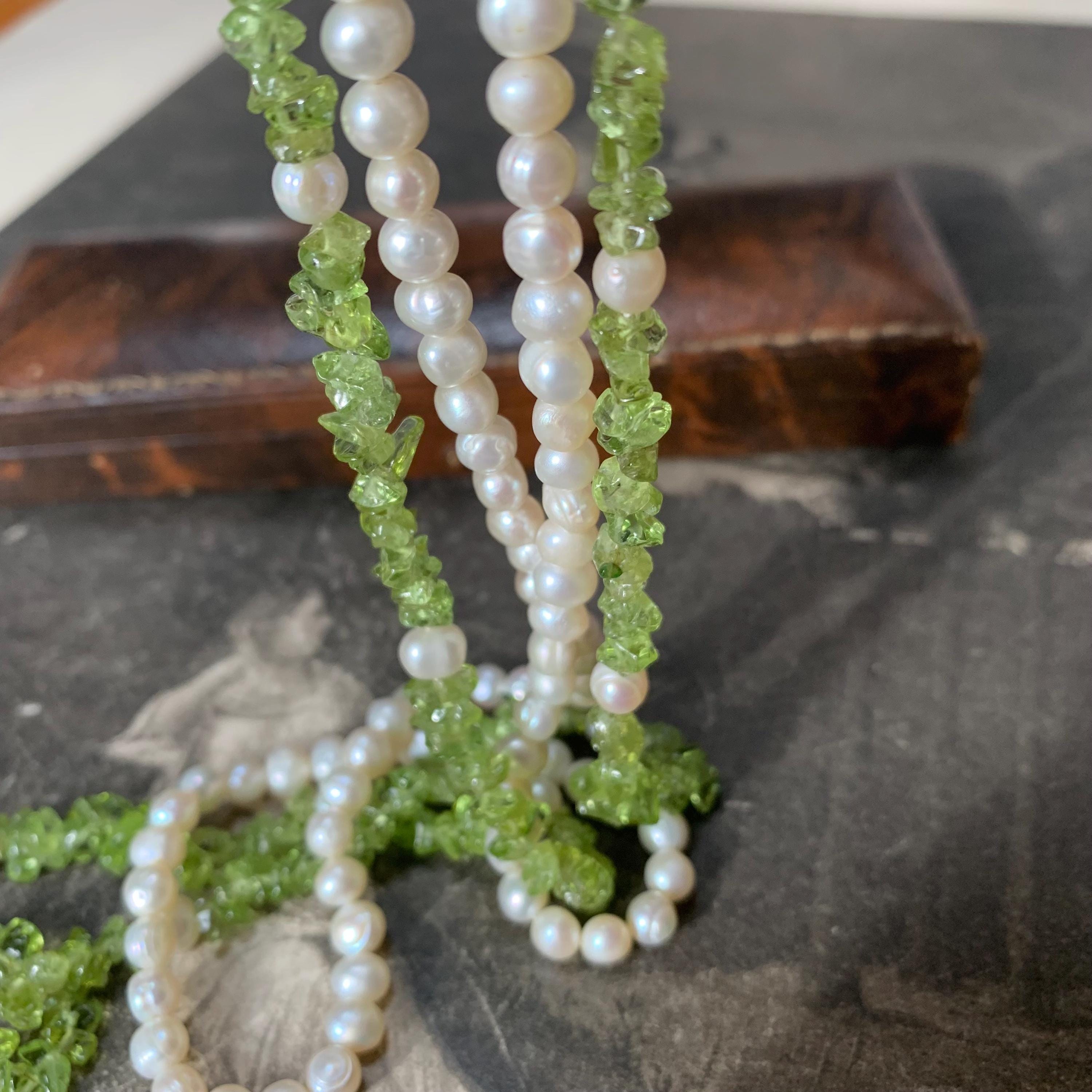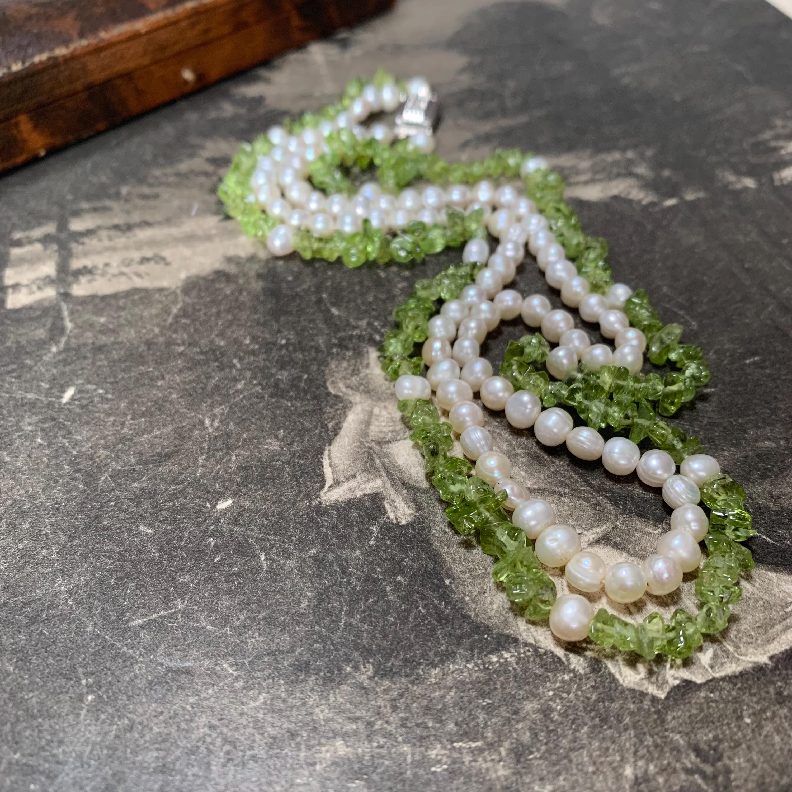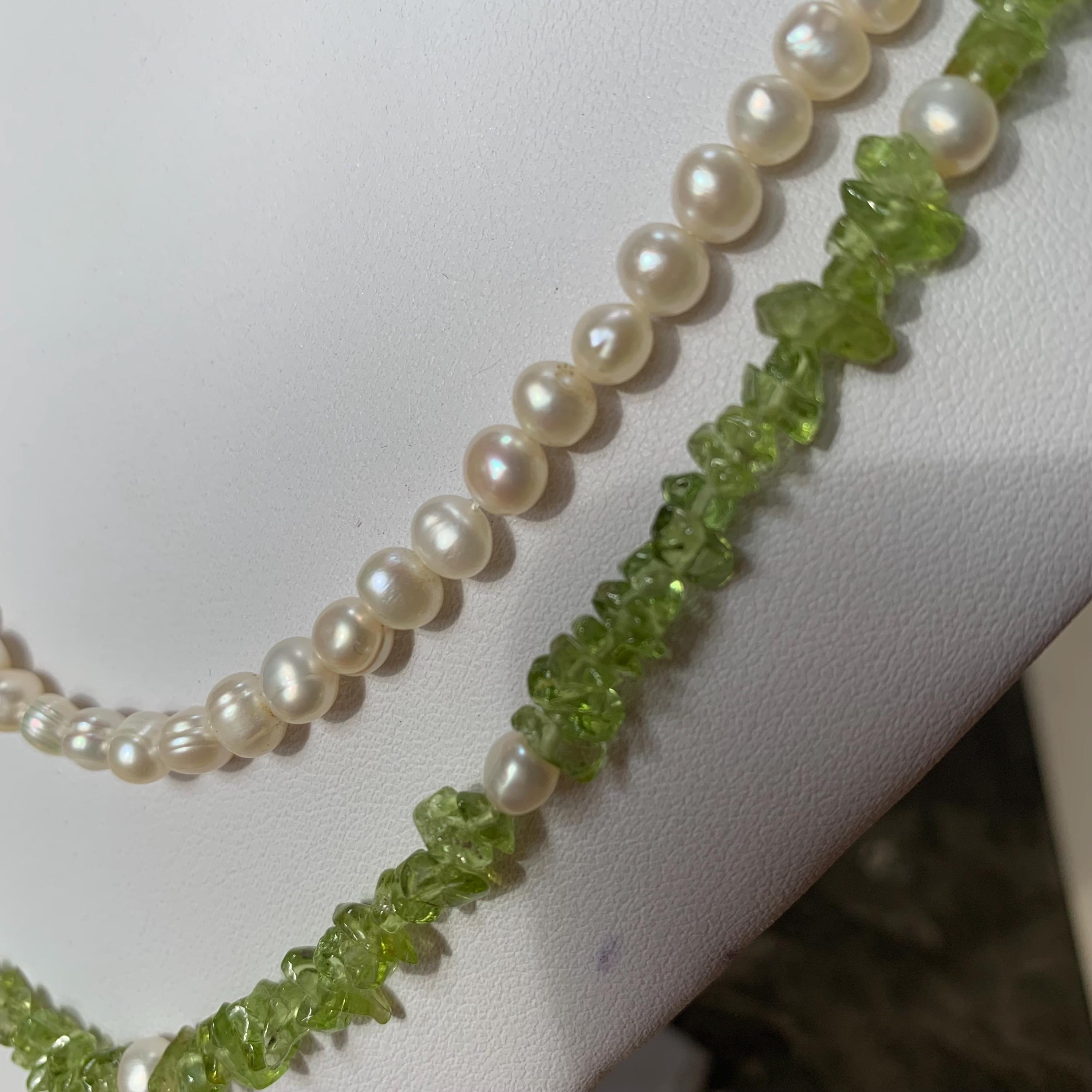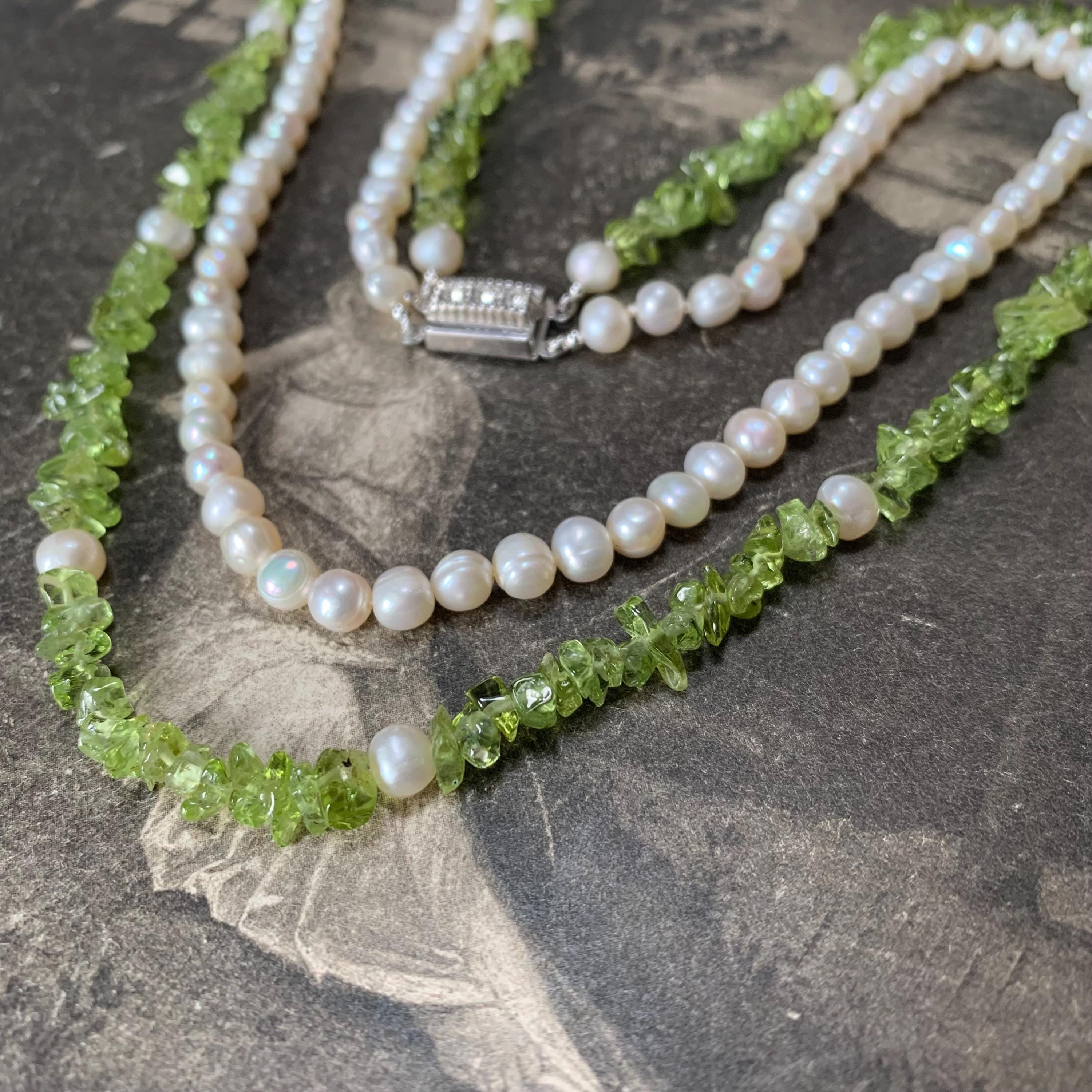 Natural peridot and freshwater double strand pearl necklace with silver and marcasite set clasp. A modern take on a classic two row necklace with the luscious green peridot gemstone in harmony with the white freshwater pearls. The clasp is marked silver and the necklace length is 46.5 cm for the shorter strand and 51cm for the longer strand. Hand strung in our studio and in new condition. The matinee length falls between the princess and opera lengths. It is often chosen for business or semi-formal attire, as it provides a slightly more relaxed look. This necklace will come in a necklace presentation box.