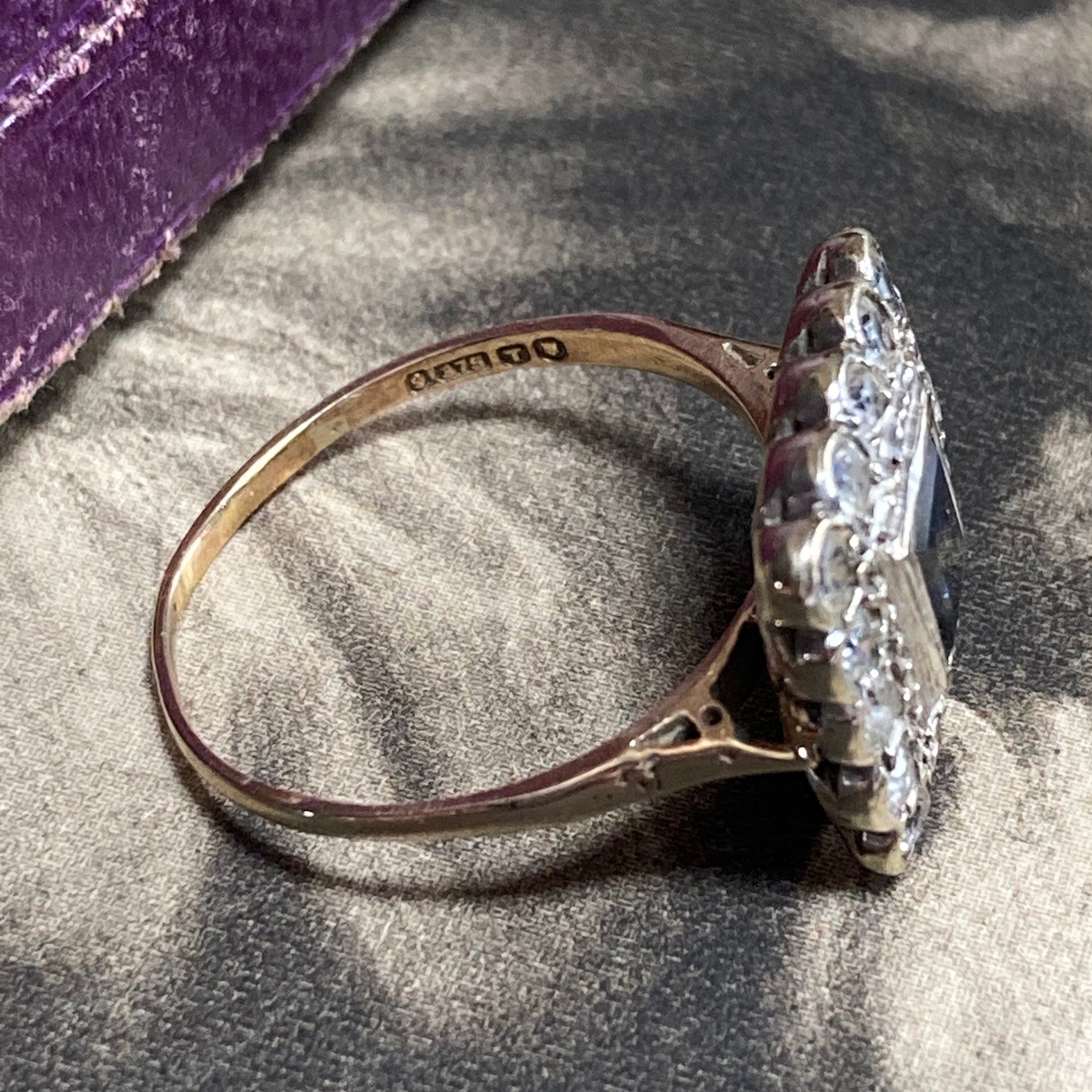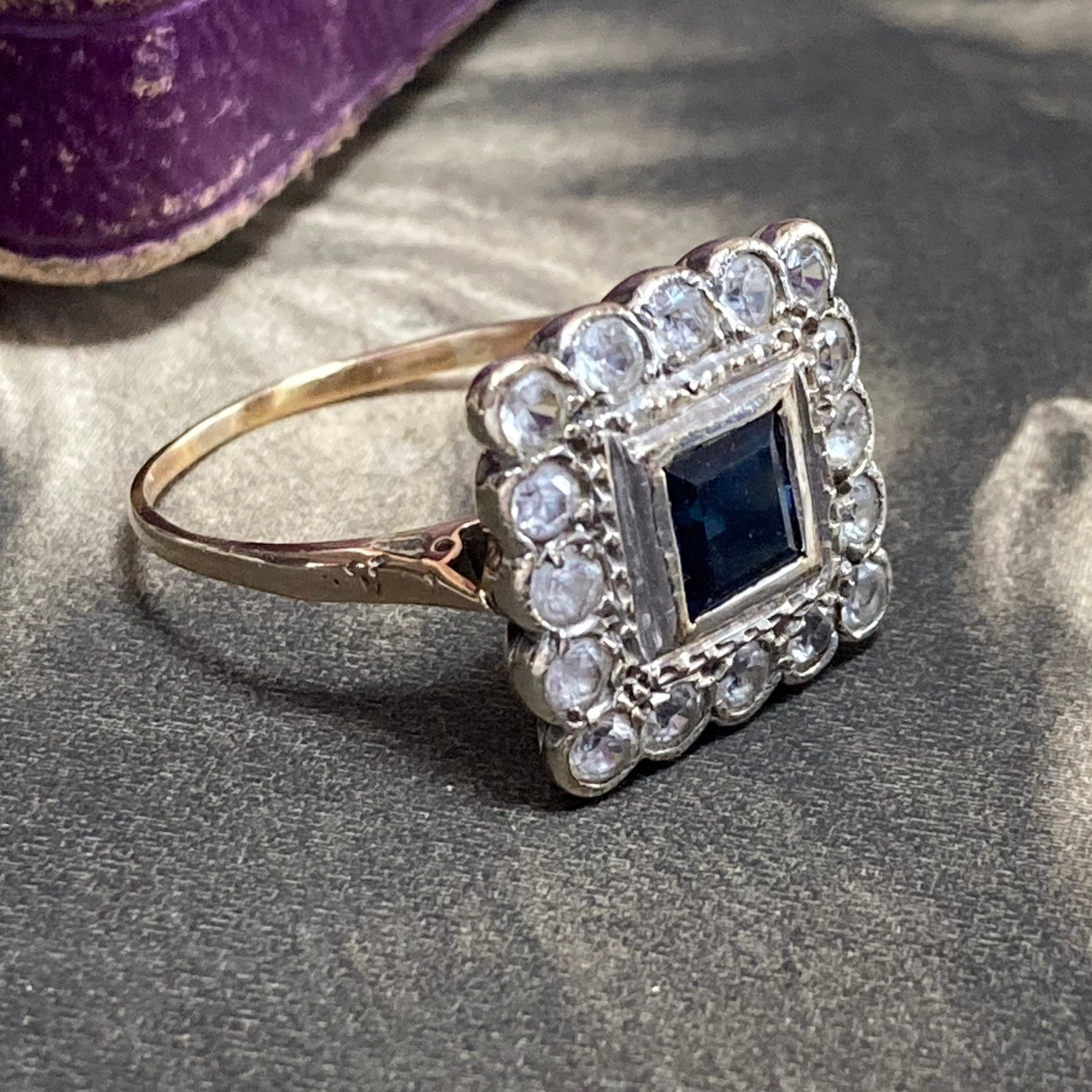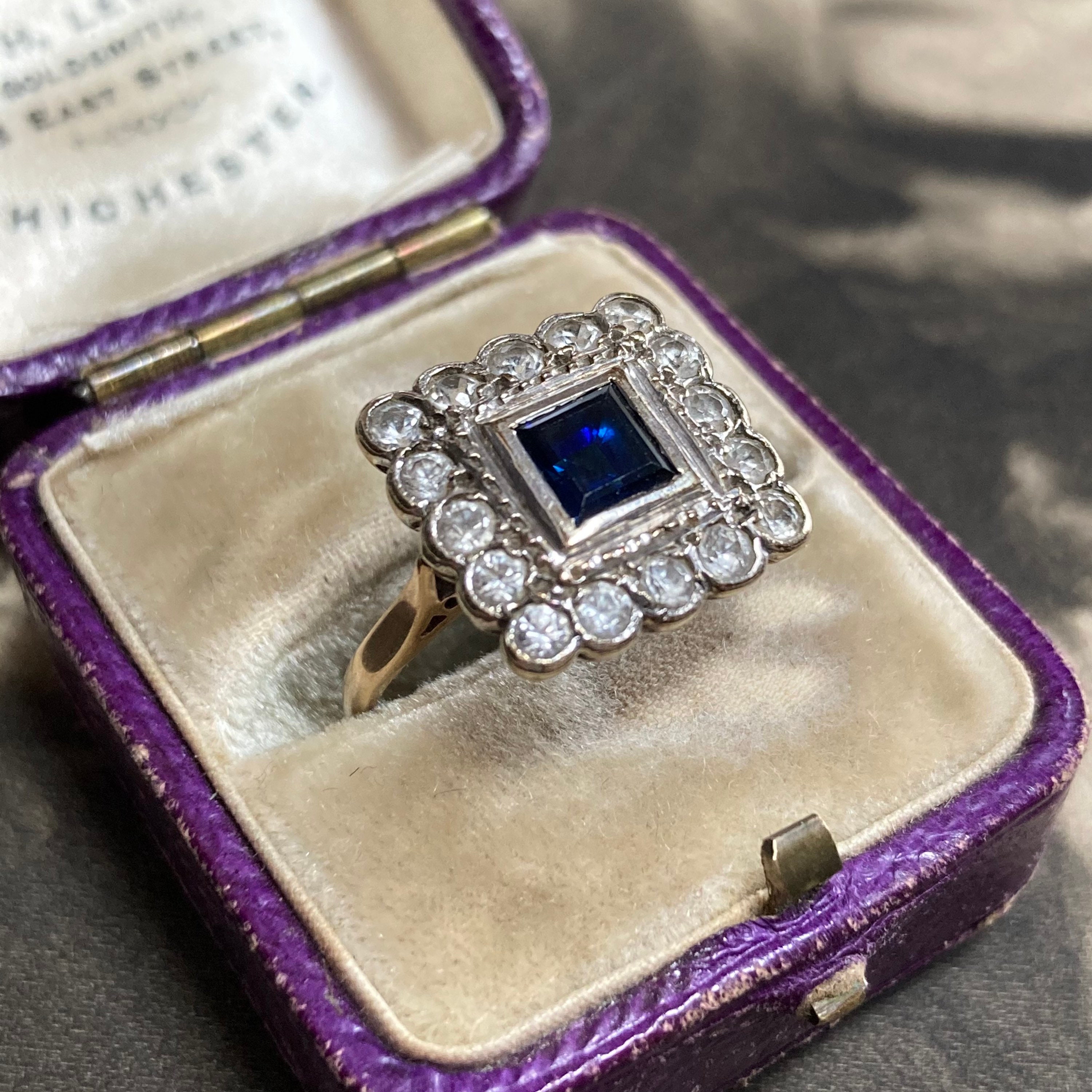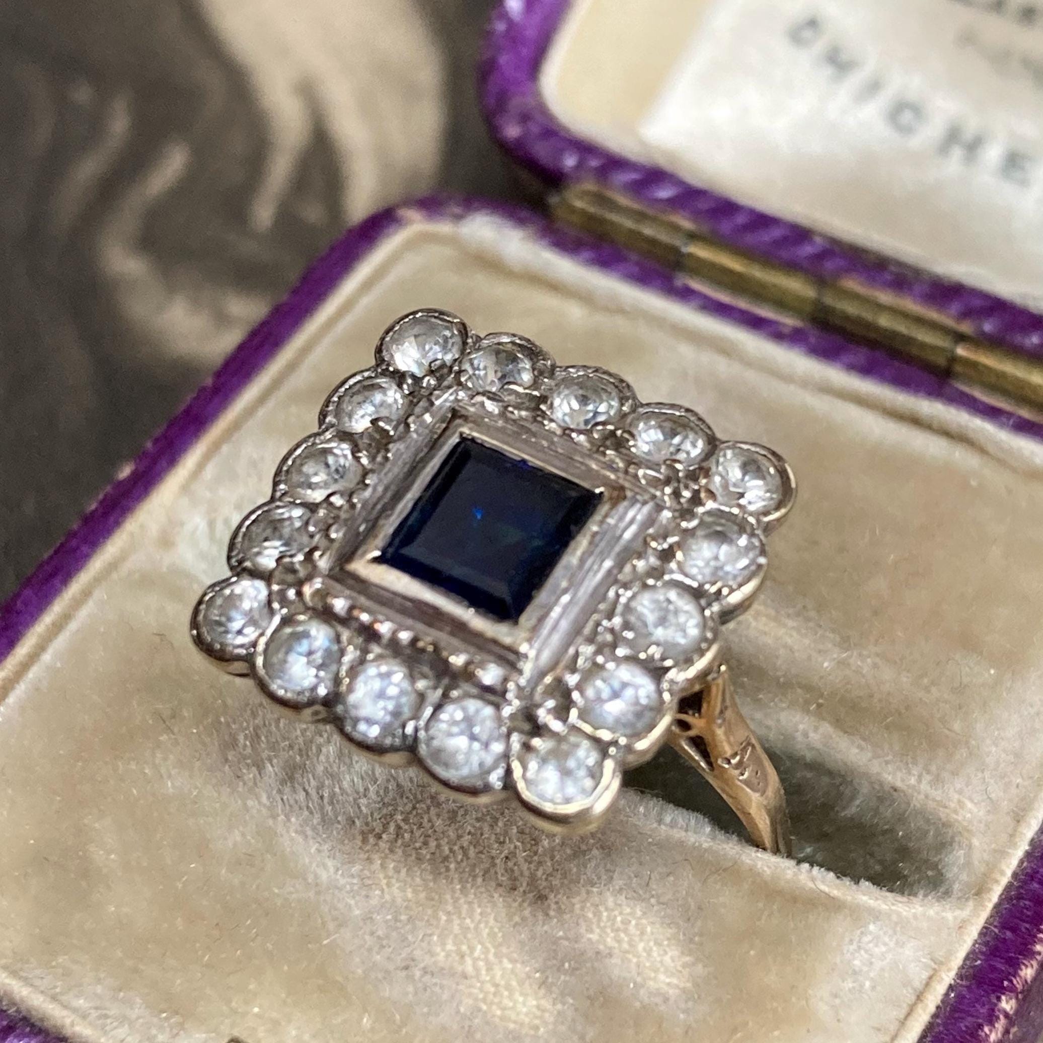 Vintage Blue and White sapphire Ring London hallmarks 1954. Stunning 9ct yellow and white gold square cluster ring set art deco style. Ring size; UK O, US 7 centre. Very finely made with full UK hallmarks for London and a weight of 3.3 grams. The square head of the ring is generous, some thinning to the back of shank, all hallmarks clearly visible. The gemstones are in excellent condition with some wear to the table facets. The ring is preowned and in good condition for a ring that was made in 1954 with historic patina. Cleaned and sympathetically re-polished and in ready to wear condition. Note that the antique box is not included, this delightful ring will come in a new ring box.