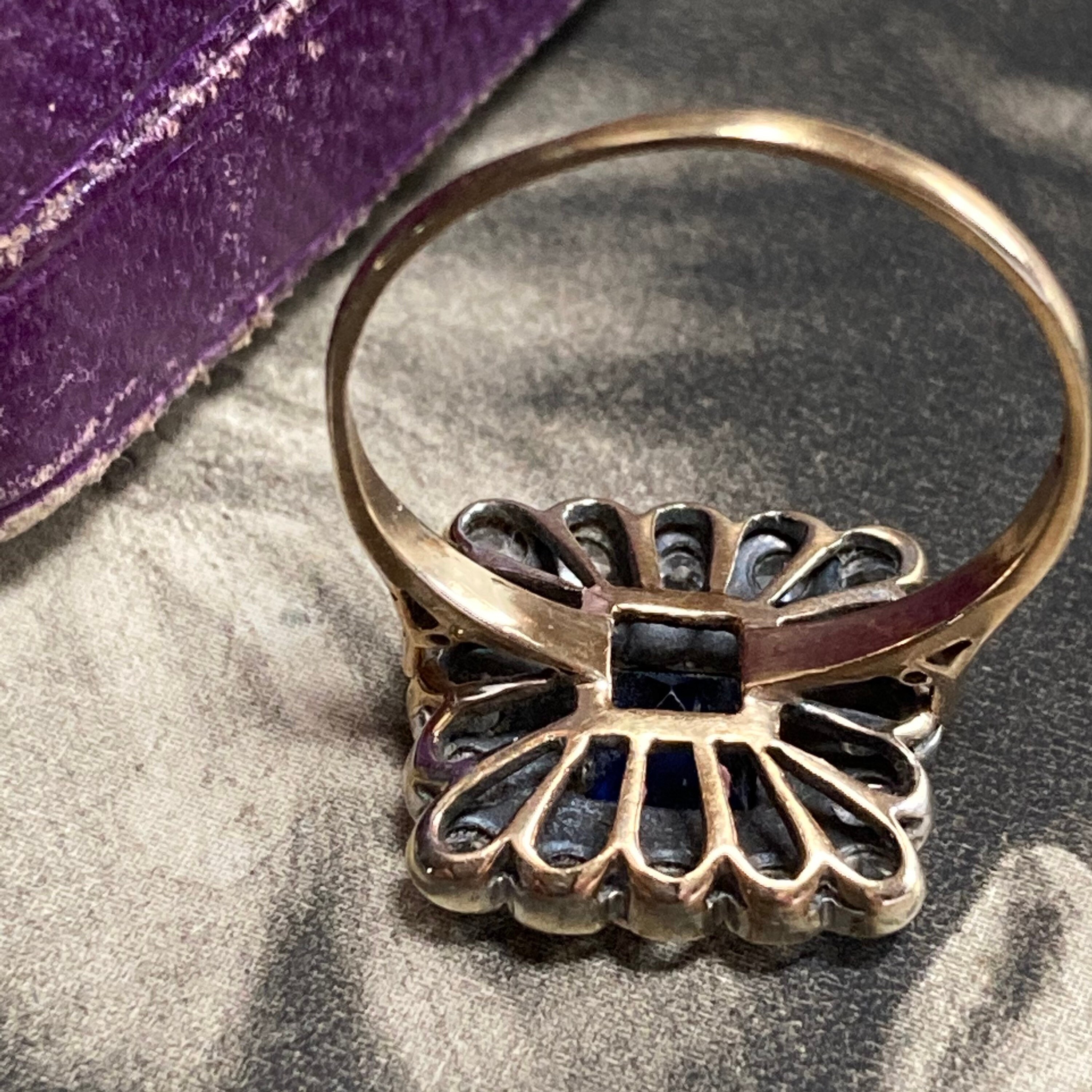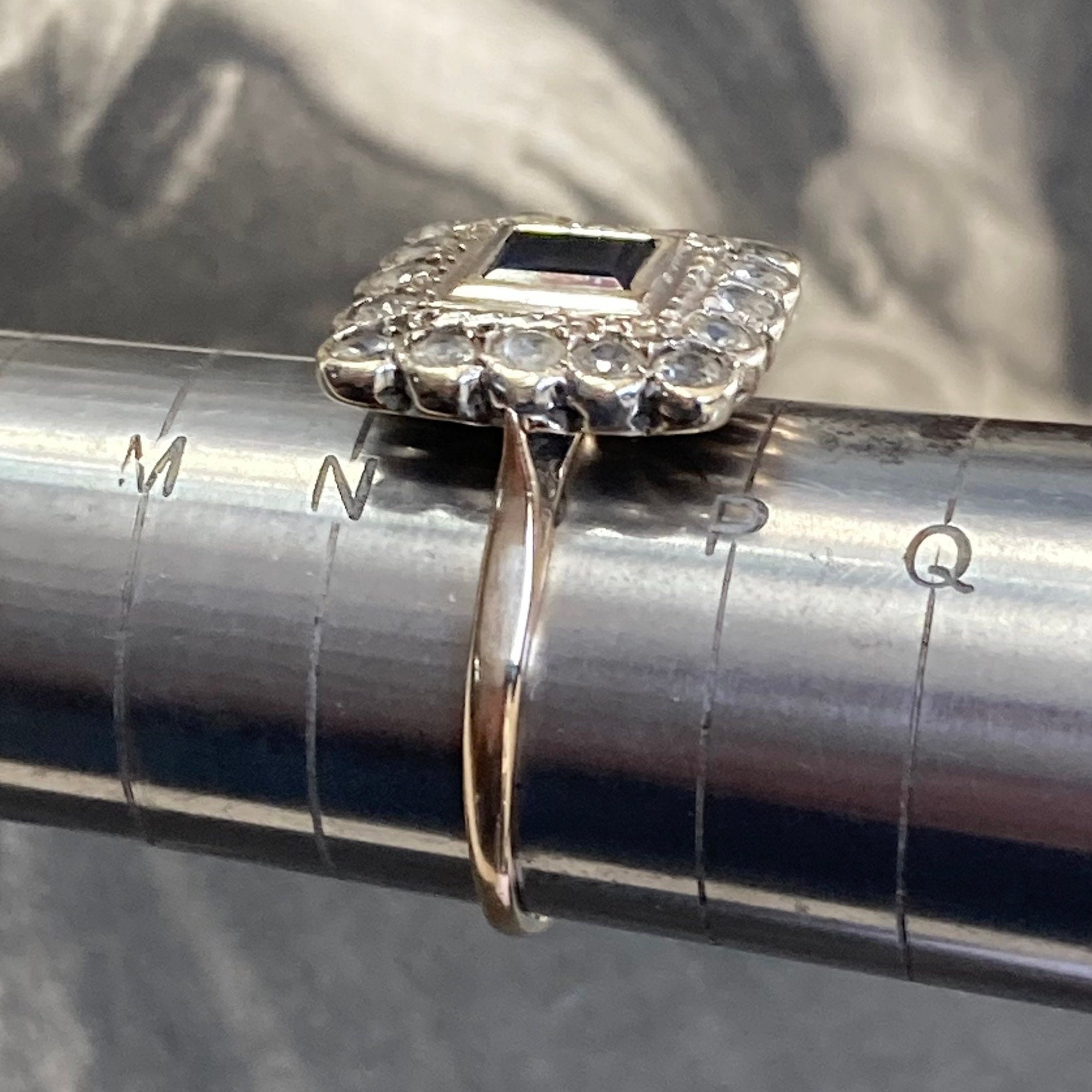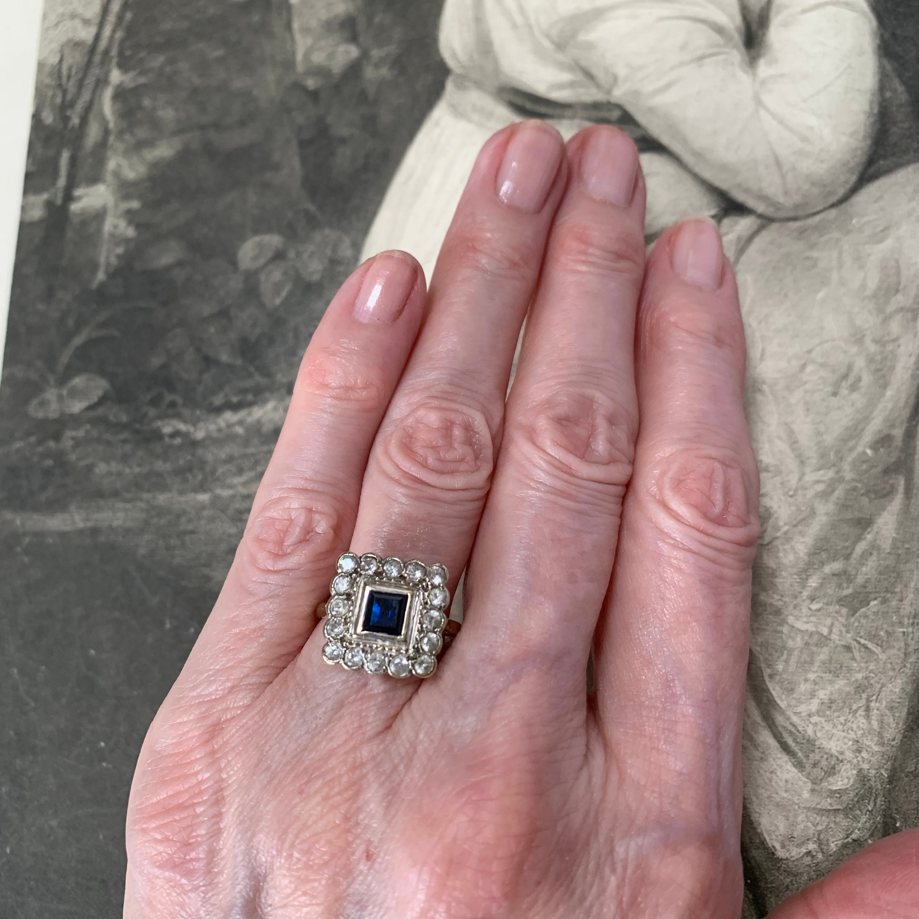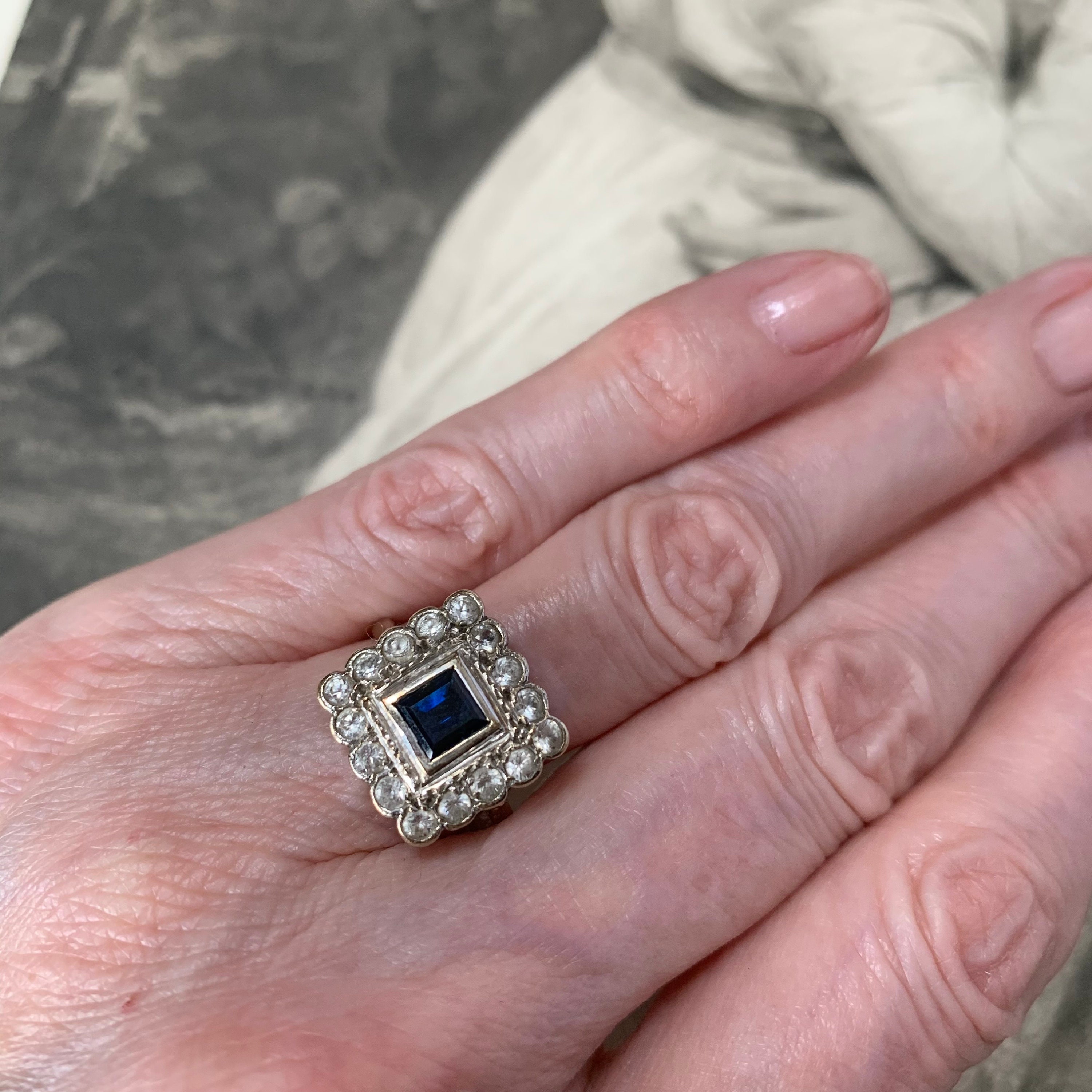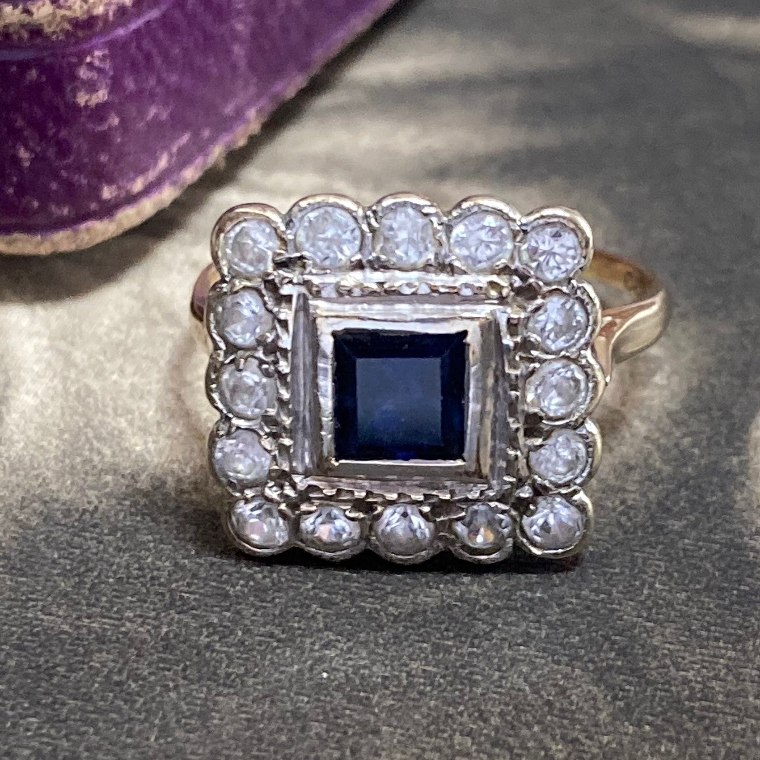 Vintage Blue and White sapphire Ring London hallmarks 1954. Stunning 9ct yellow and white gold square cluster ring set art deco style. Ring size; UK O, US 7 centre. Very finely made with full UK hallmarks for London and a weight of 3.3 grams. The square head of the ring is generous, some thinning to the back of shank, all hallmarks clearly visible. The gemstones are in excellent condition with some wear to the table facets. The ring is preowned and in good condition for a ring that was made in 1954 with historic patina. Cleaned and sympathetically re-polished and in ready to wear condition. Note that the antique box is not included, this delightful ring will come in a new ring box.