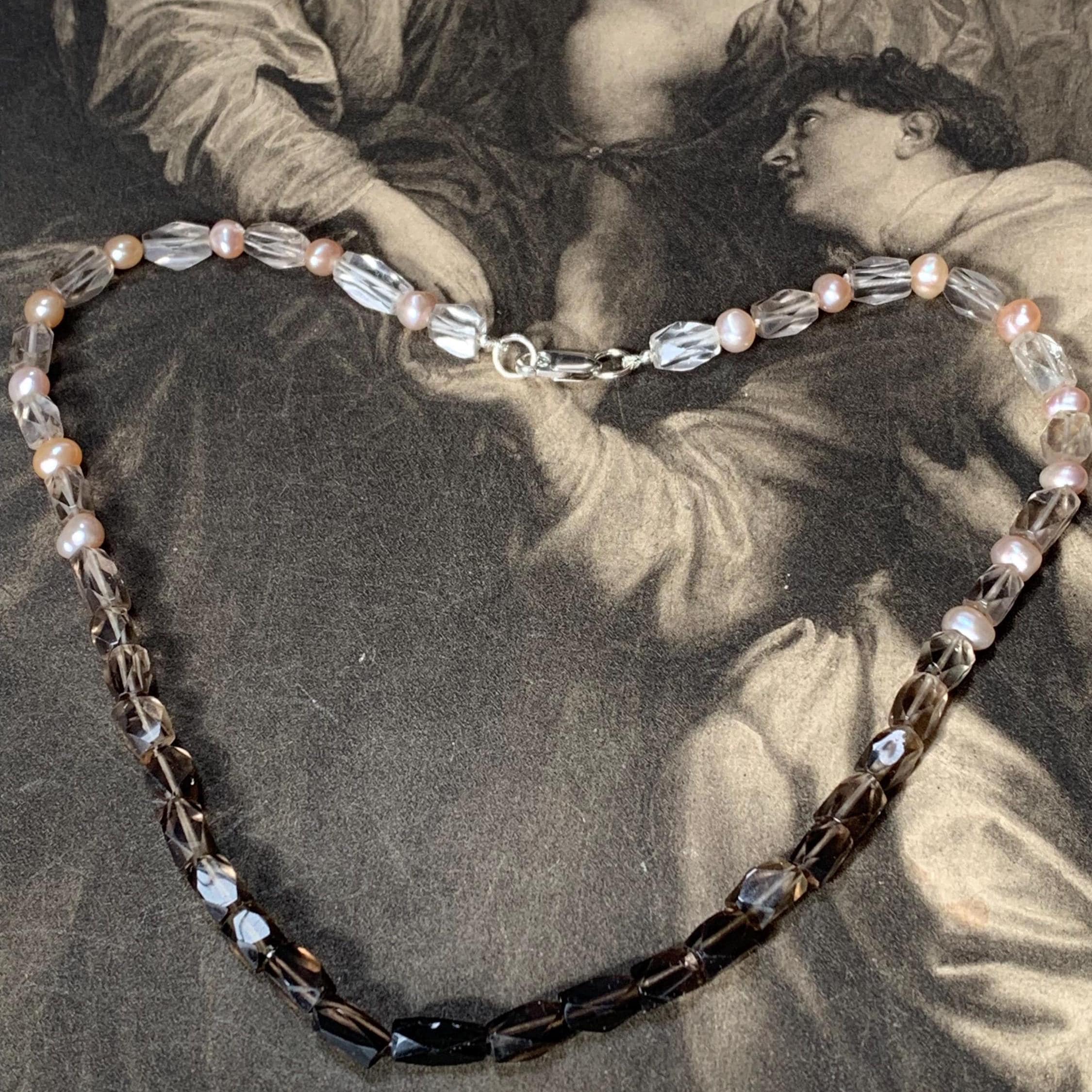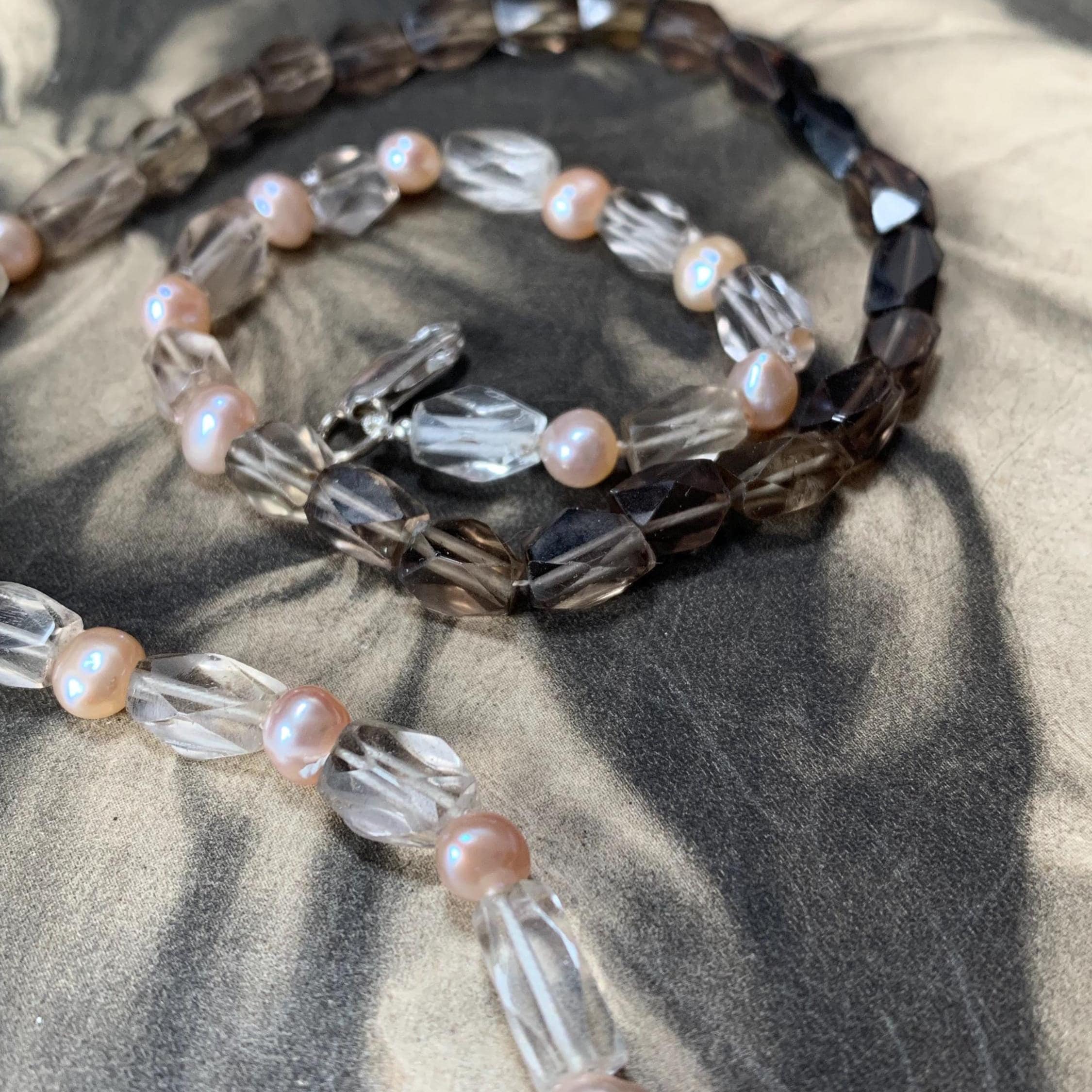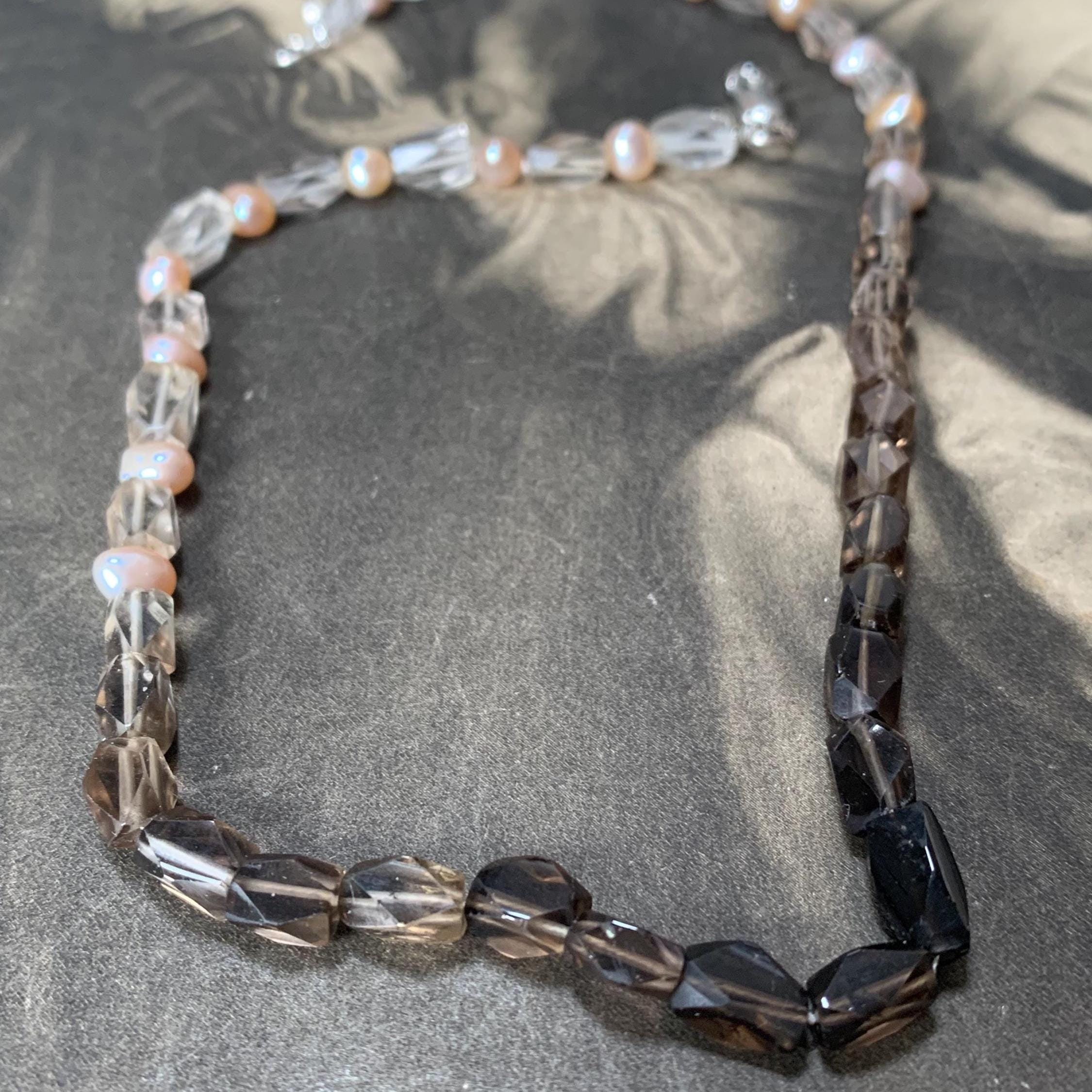 Faceted smoky quartz and pink freshwater pearl necklace with silver Argentium clasp. This is a stunning and graduated in colour natural smoky quartz necklace interspersed with pink/peach freshwater pearls to each side, 16 in total. The quartz beads size are between 6.5 mm - 9.7 mm x 5mm wide and are colour graduated from clearer to to brown. The pearls are approximately 5.4mm in size and the necklace has a length of 40.5 cm (approx 16 inches), hand-strung to silk. A fine and unusual piece which will come gift boxed.