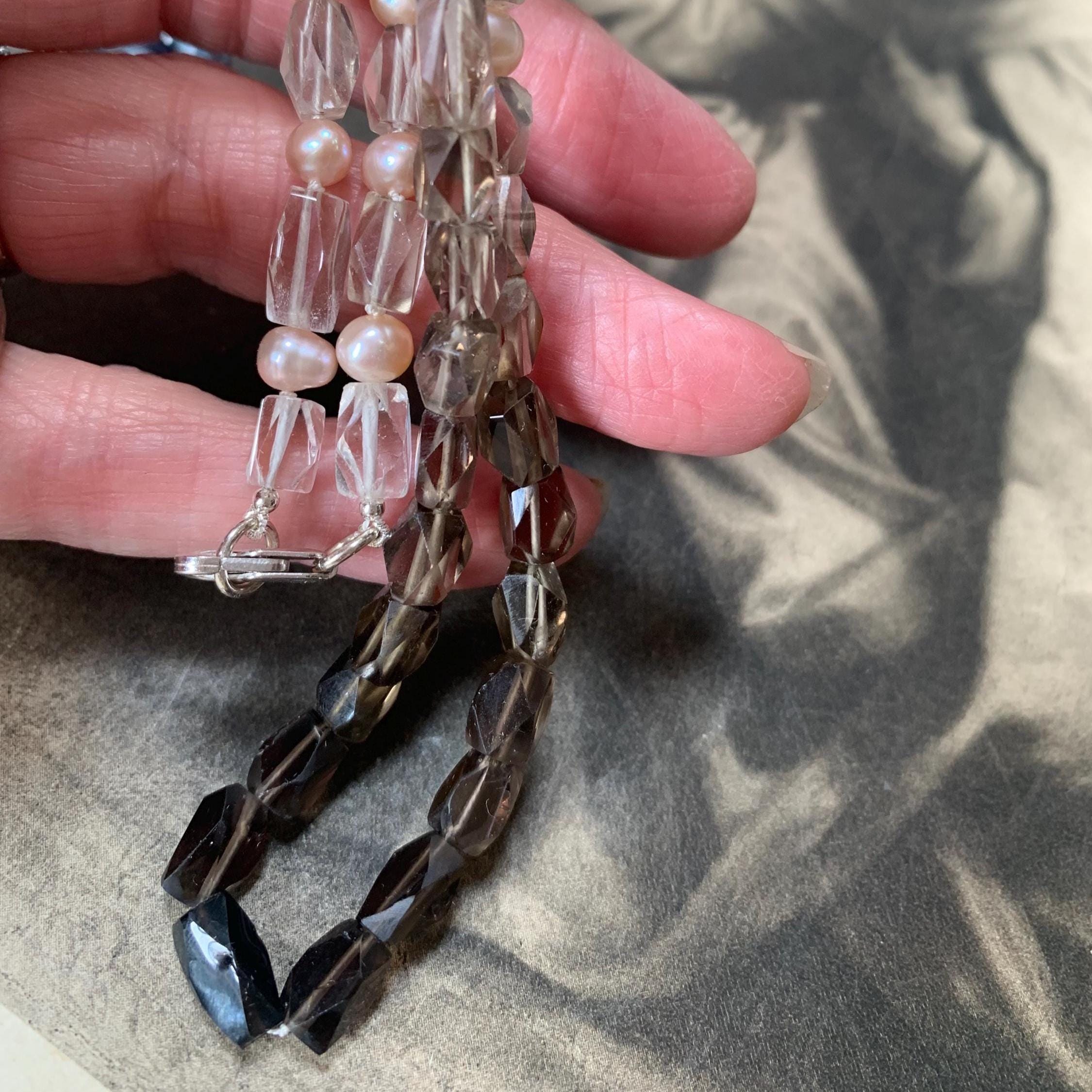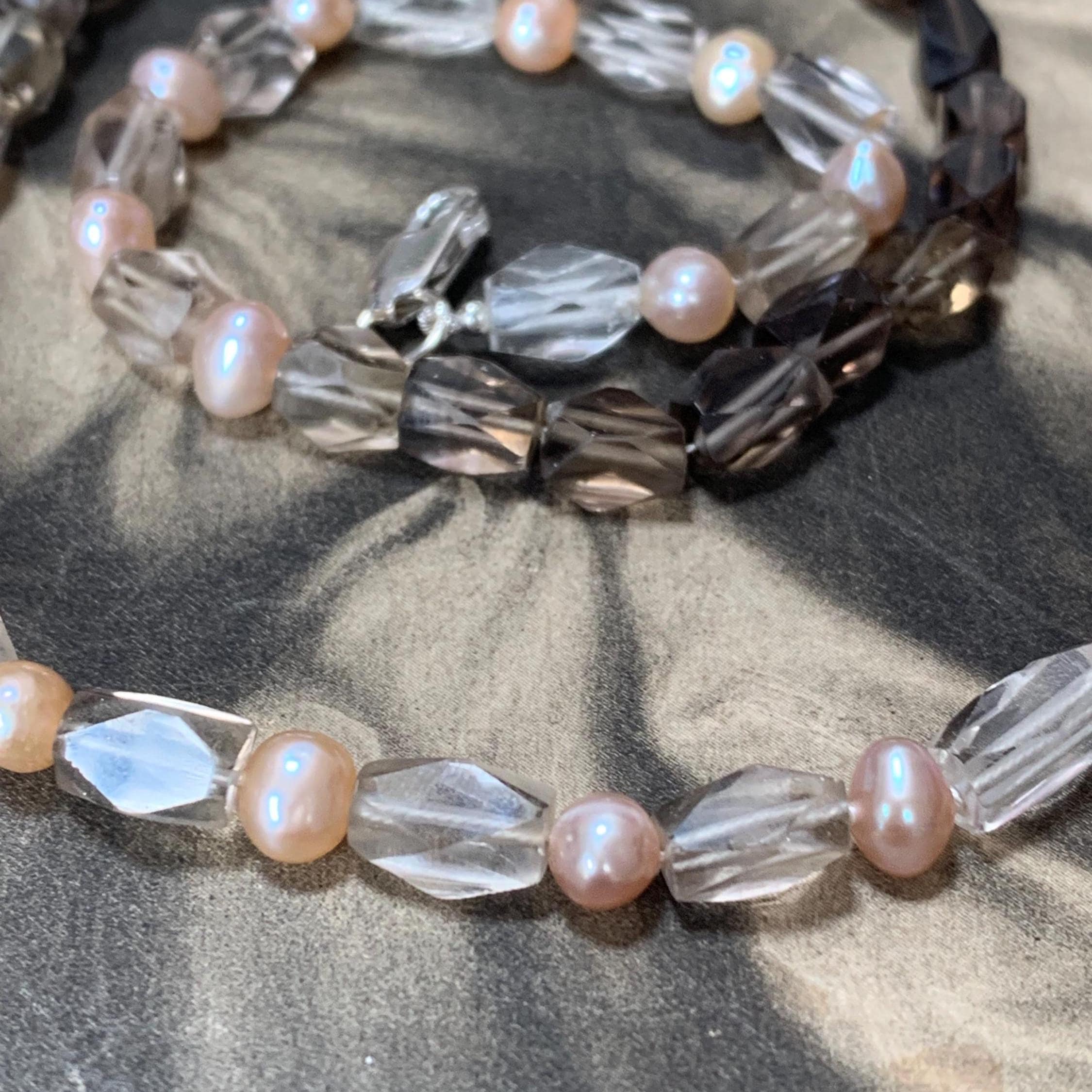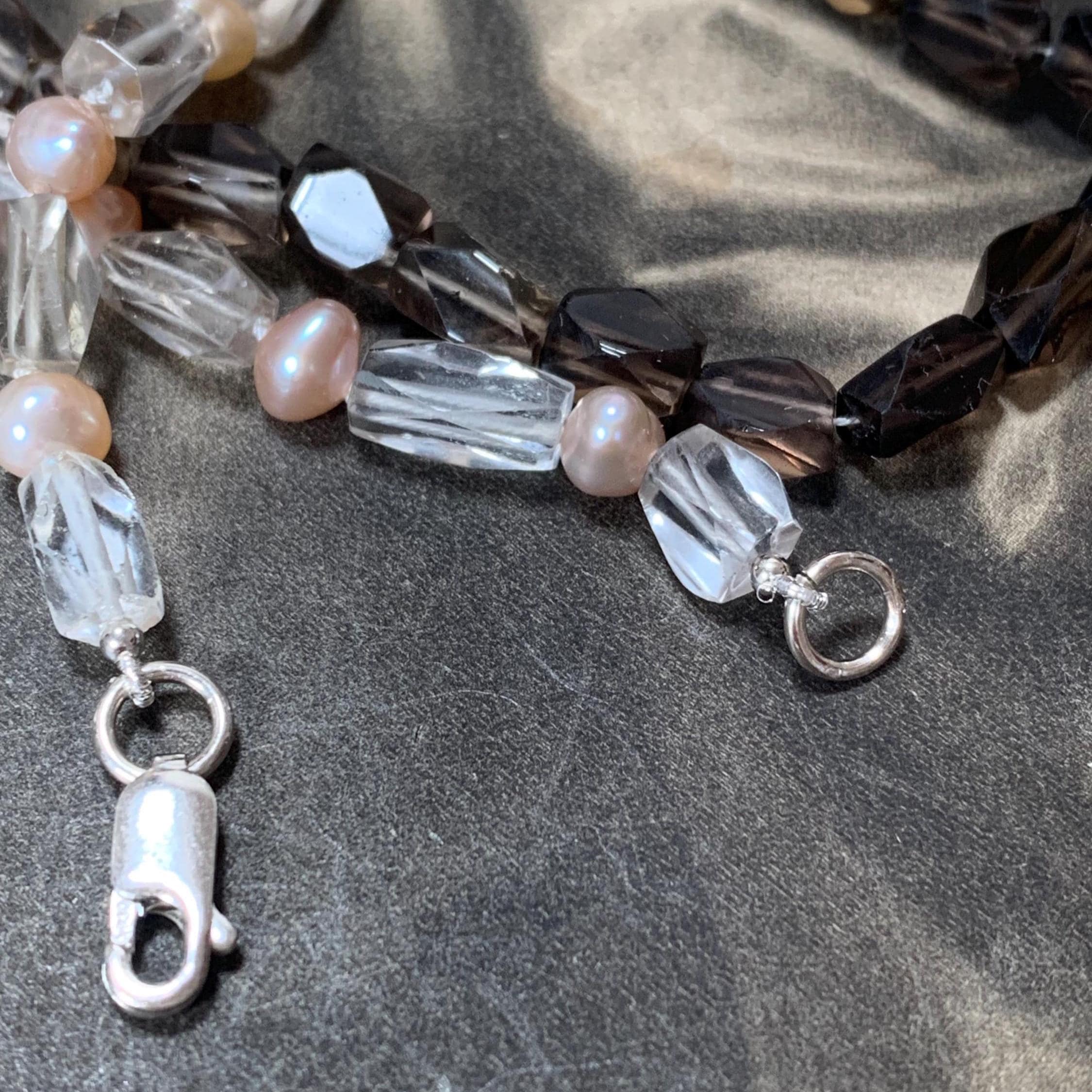 Faceted smoky quartz and pink freshwater pearl necklace with silver Argentium clasp. This is a stunning and graduated in colour natural smoky quartz necklace interspersed with pink/peach freshwater pearls to each side, 16 in total. The quartz beads size are between 6.5 mm - 9.7 mm x 5mm wide and are colour graduated from clearer to to brown. The pearls are approximately 5.4mm in size and the necklace has a length of 40.5 cm (approx 16 inches), hand-strung to silk. A fine and unusual piece which will come gift boxed.