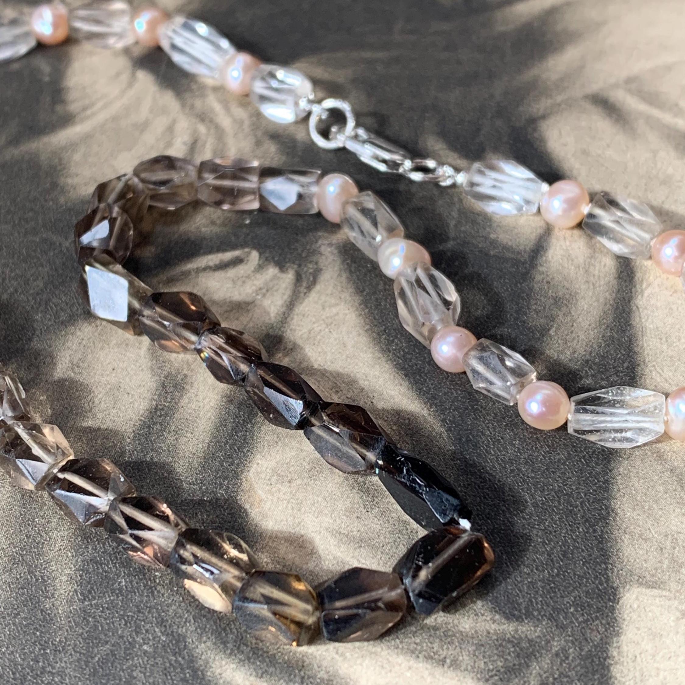 Smoky quartz is known as a ‘grounding stone’ that connects individuals to the present, neutralizing negative energies, alleviating anxiety and promoting physical and emotional well-being. Pearls compliment this stone as they are said to be attributed to calming and centring.