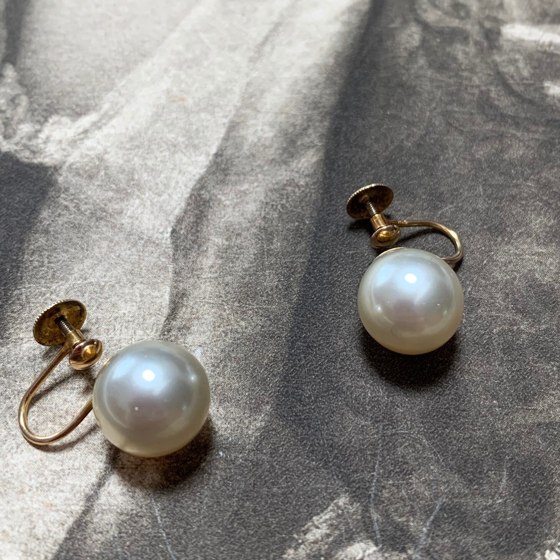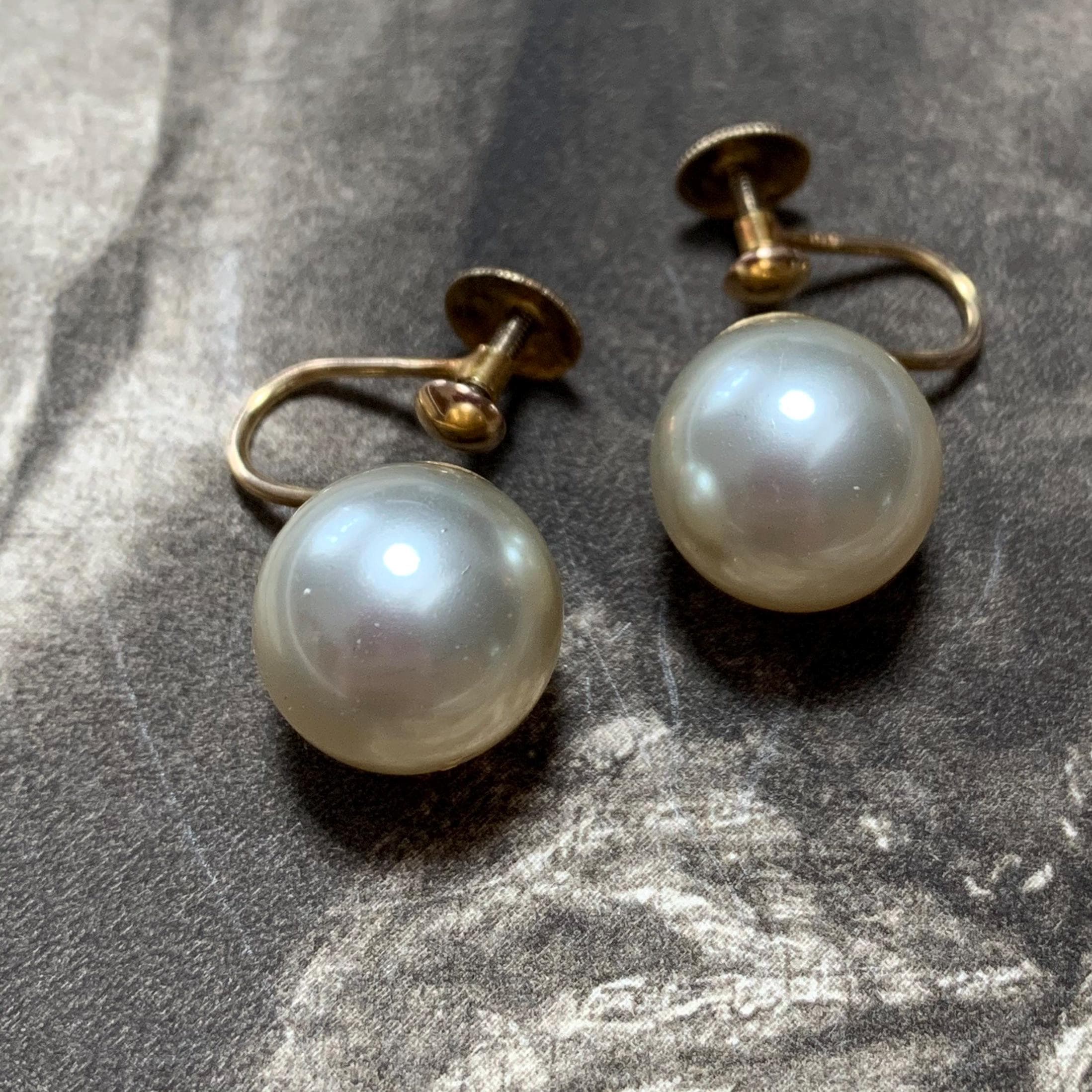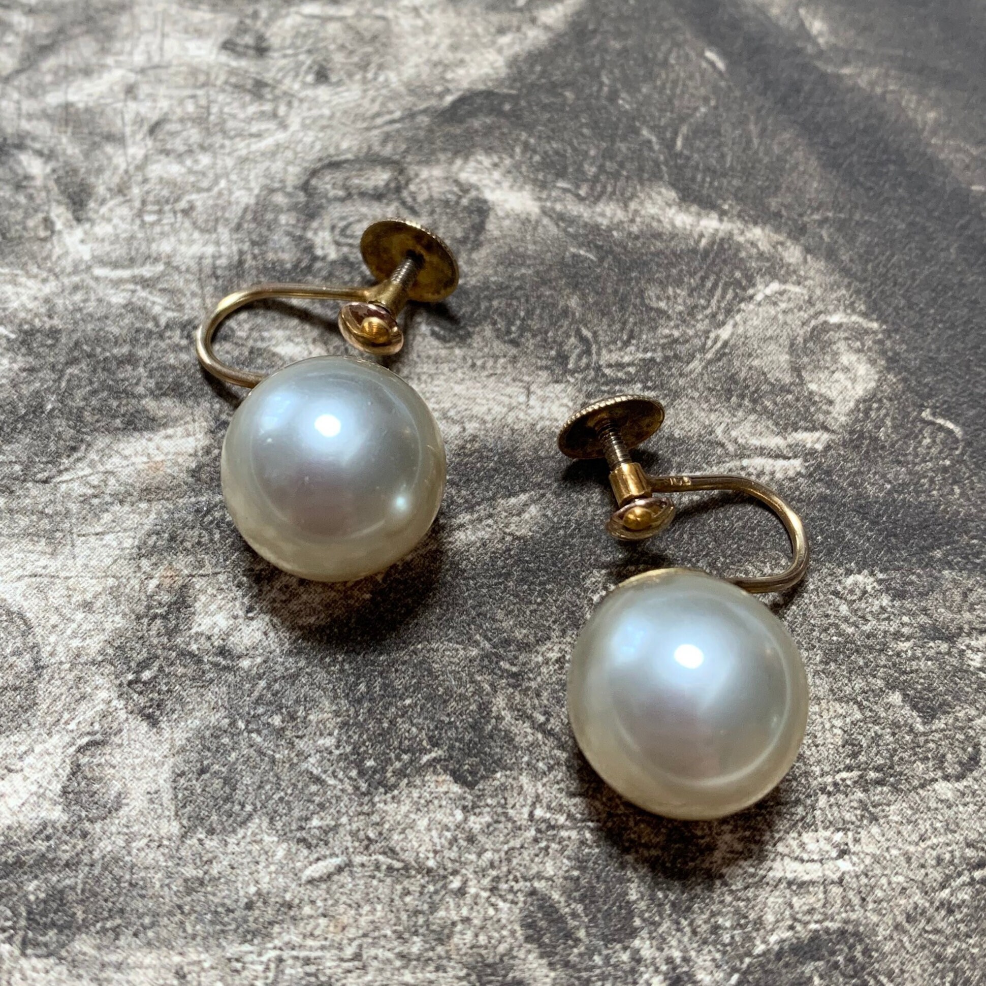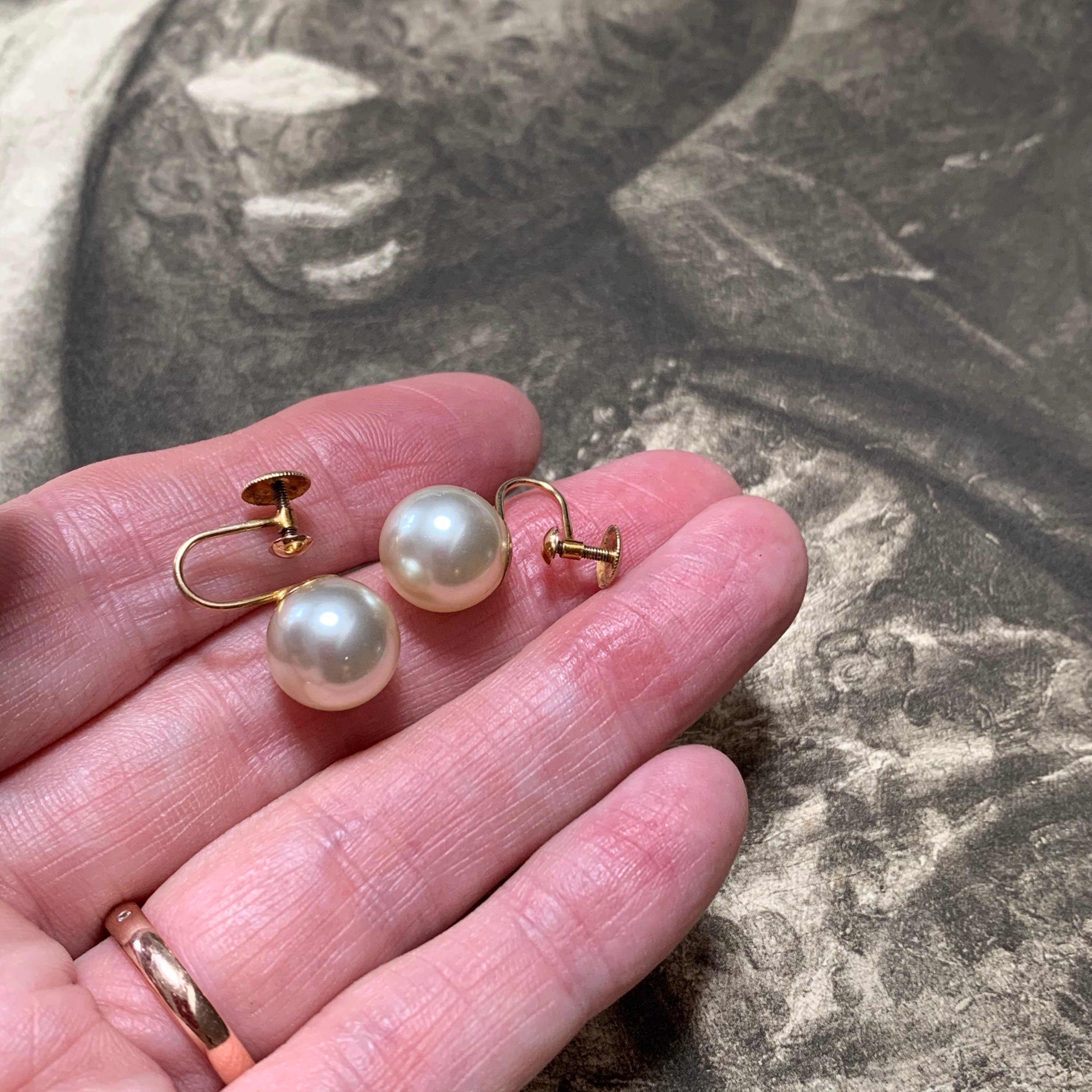 11mm faux pearls 9ct gold screw back earrings. 1960s retro the pearls measure an impressive 11.3mm in width, are set onto a substantial 9ct gold screw-back fitting. These fittings are clearly marked '9ct,' ensuring the authenticity of the gold content.