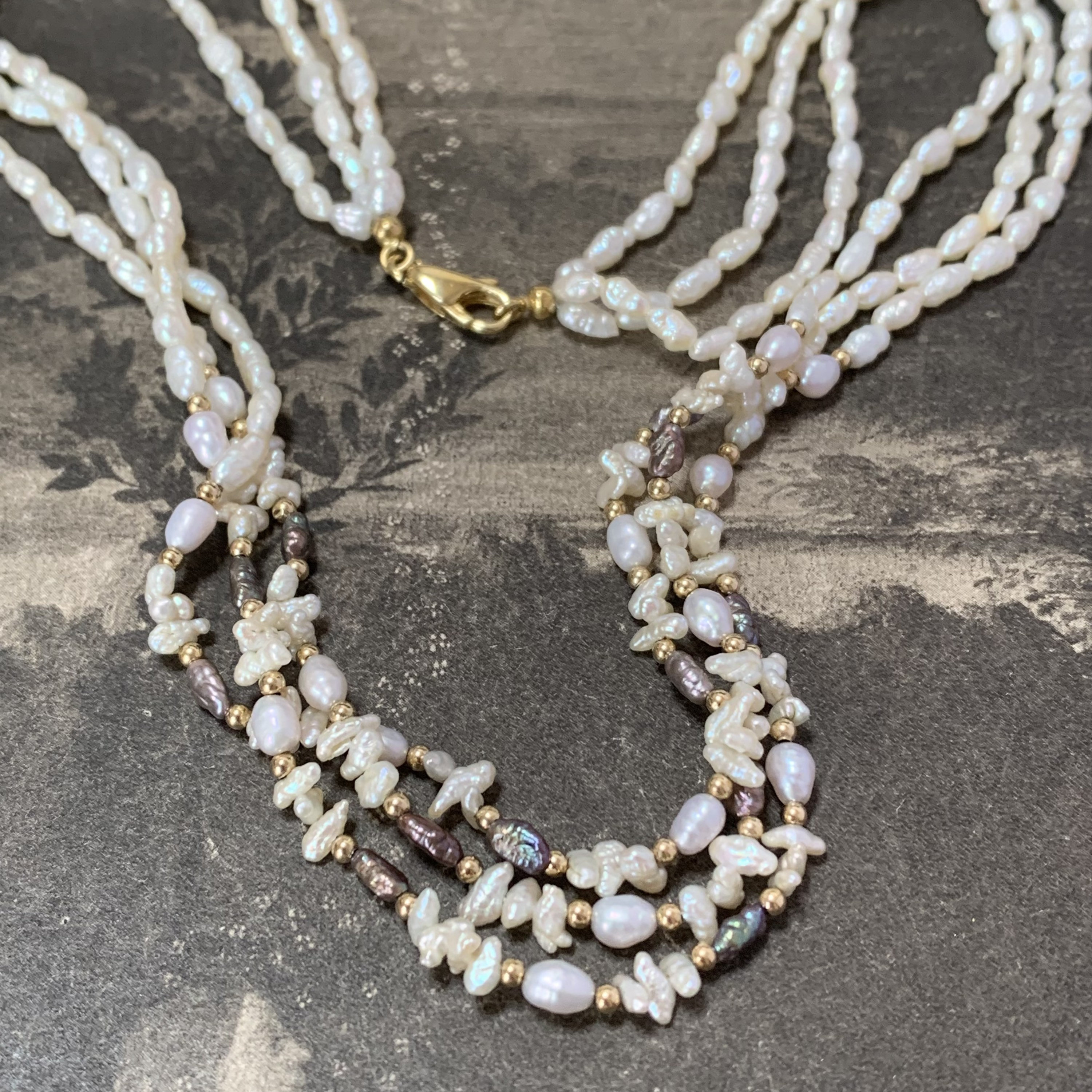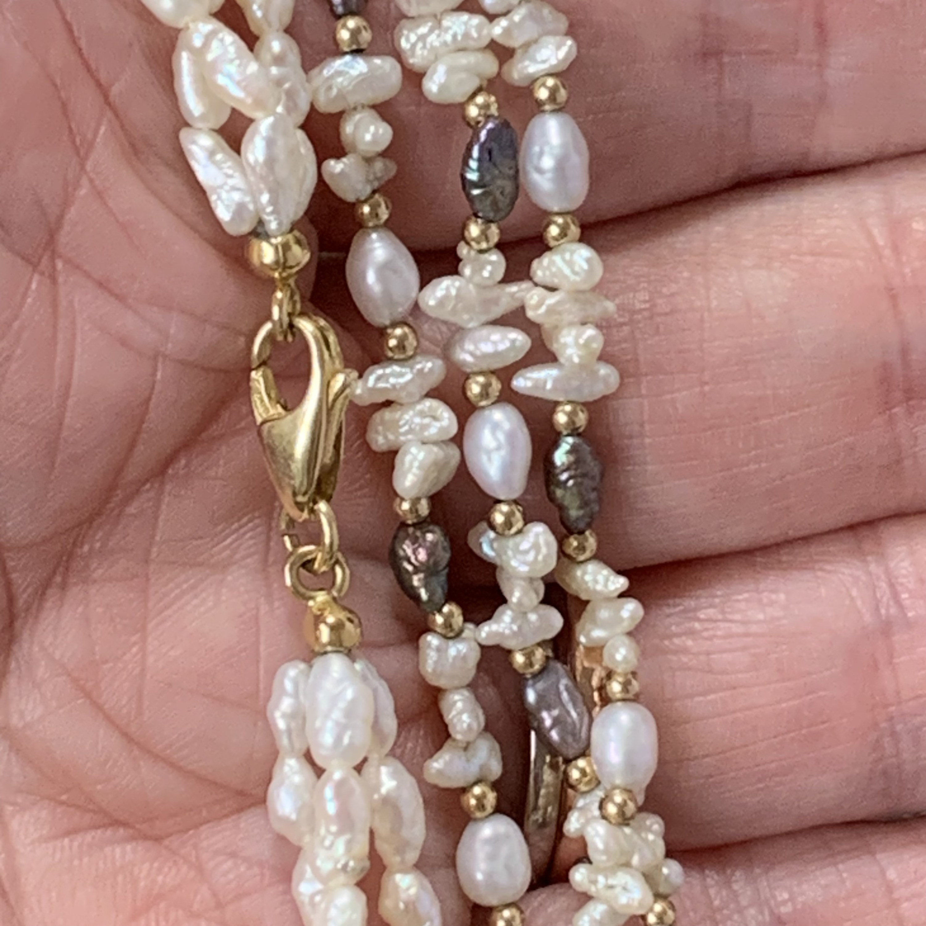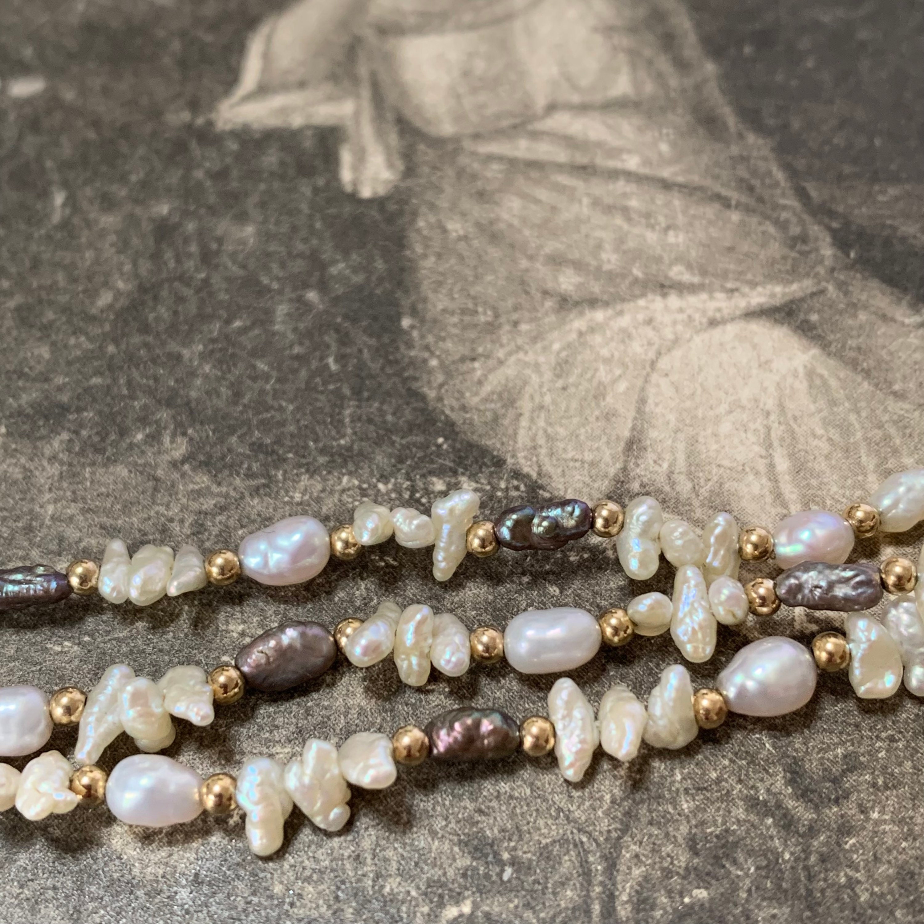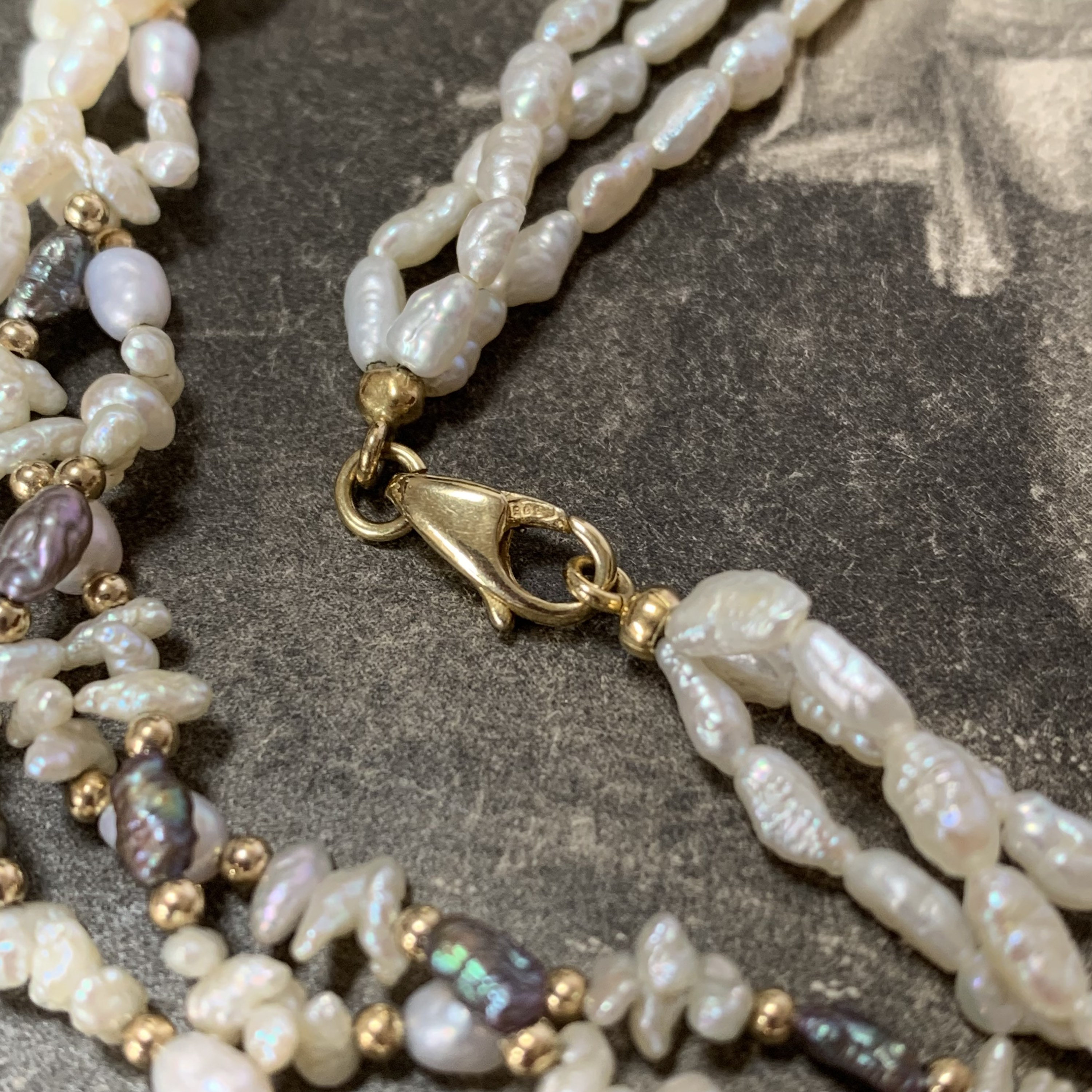 Princess length Vintage 14ct gold multi-strand pearl necklace. Its design features three strands of freshwater pearls with white and grey hues with gold beads.