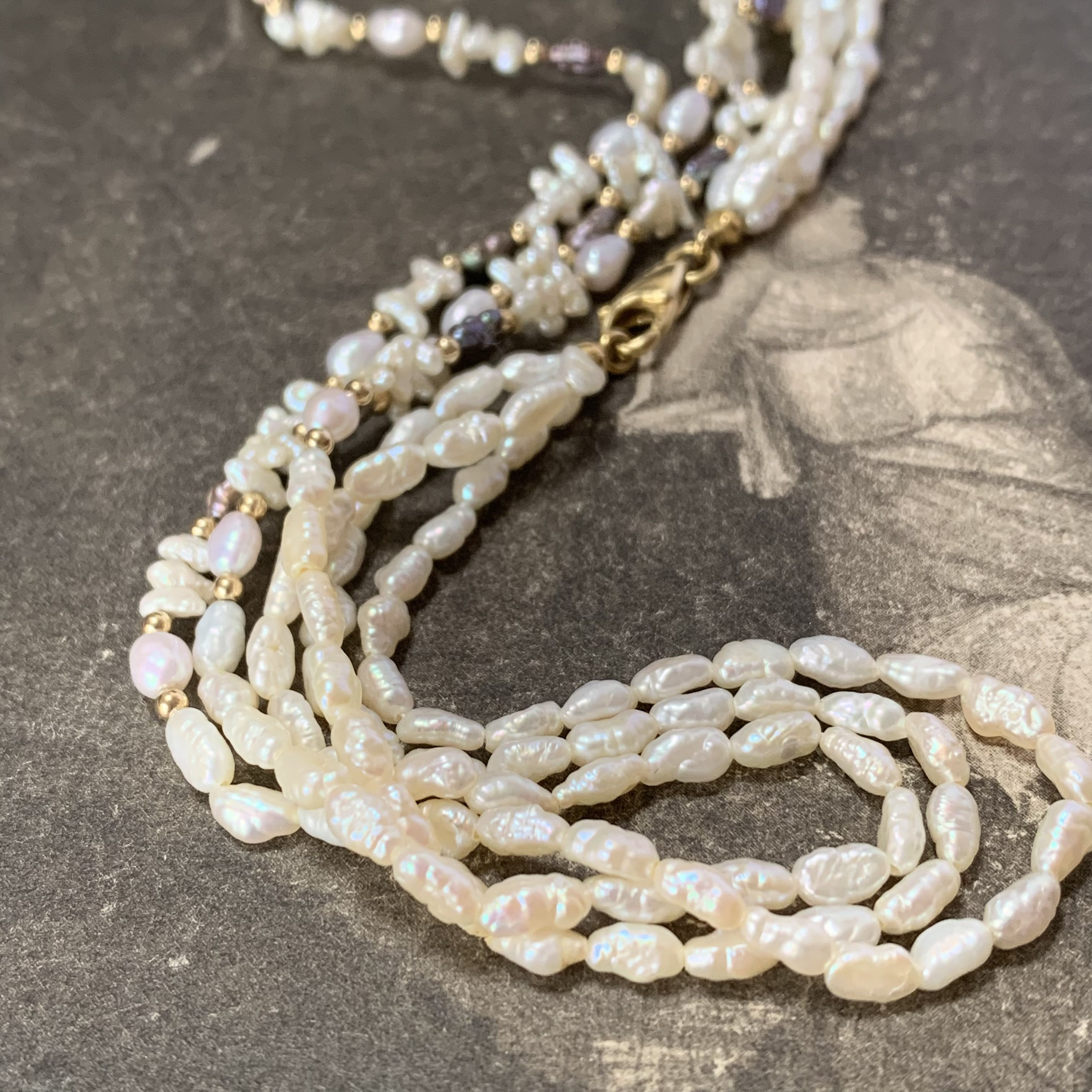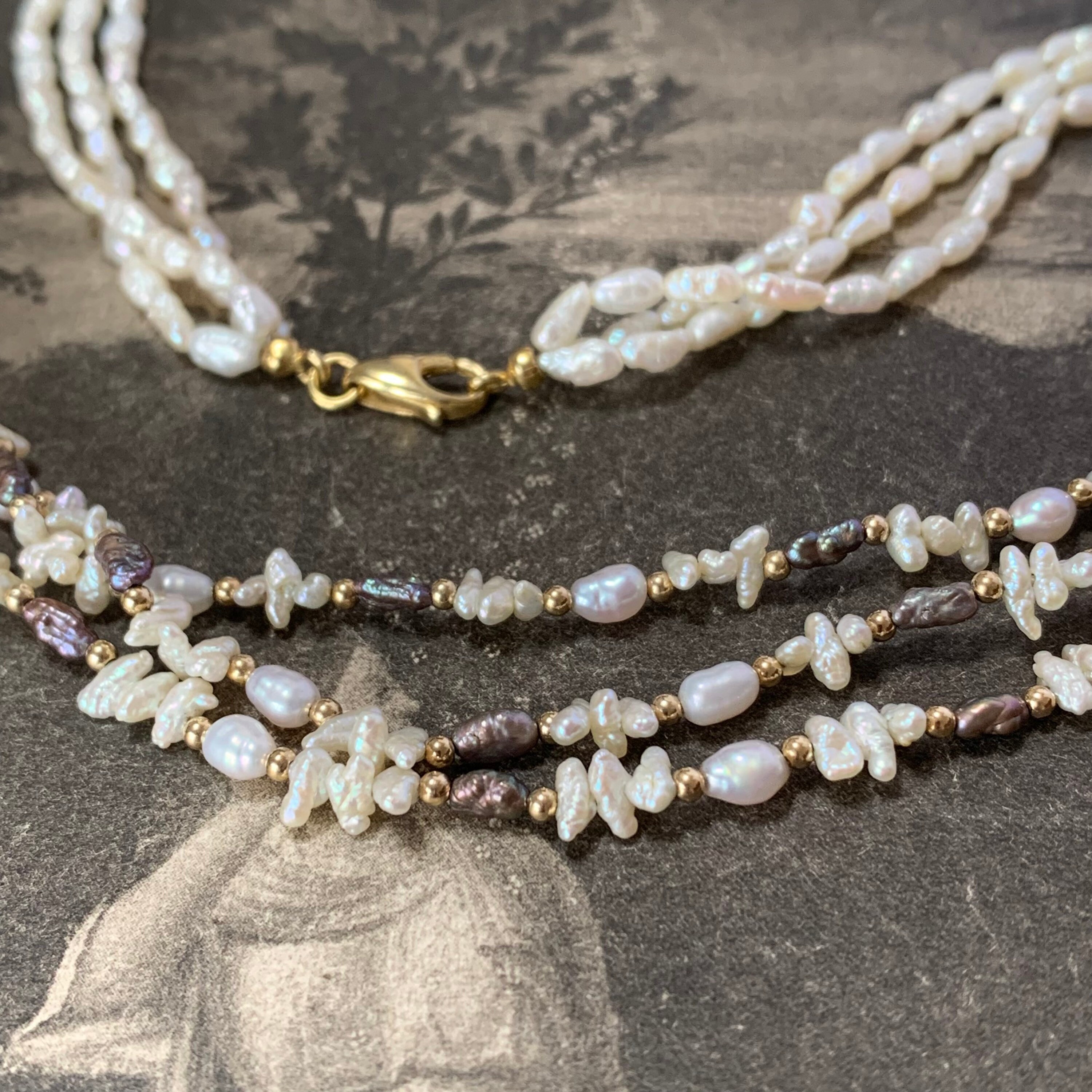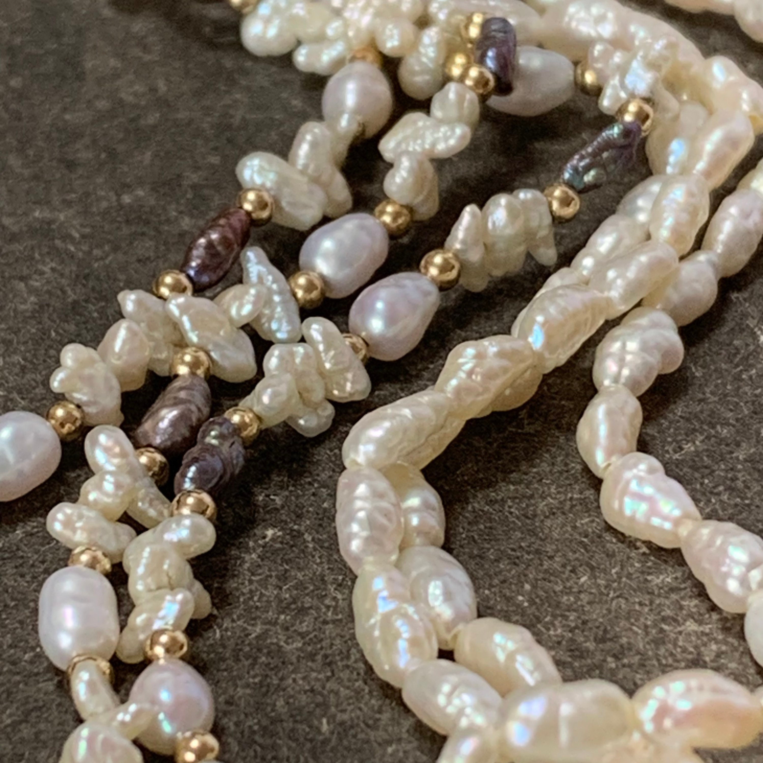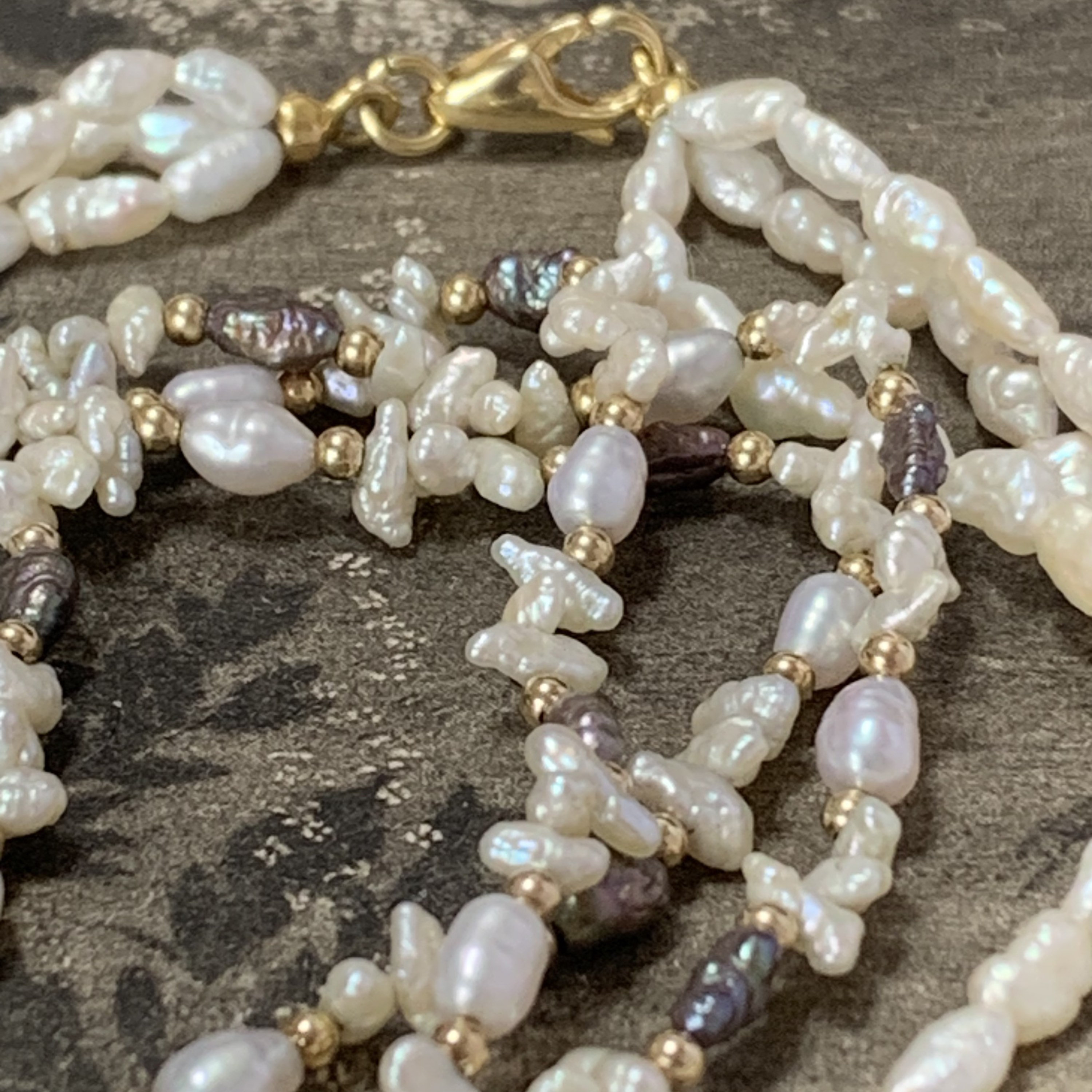 Princess length Vintage 14ct gold multi-strand pearl necklace. Its design features three strands of freshwater pearls with white and grey hues with gold beads.