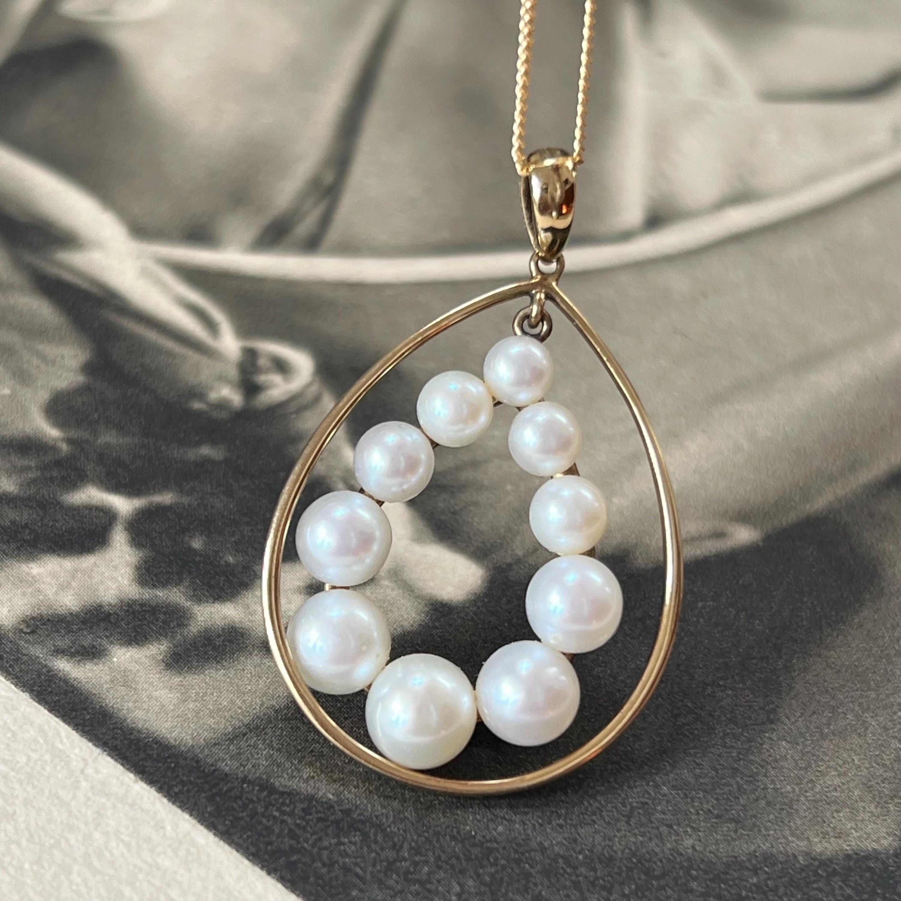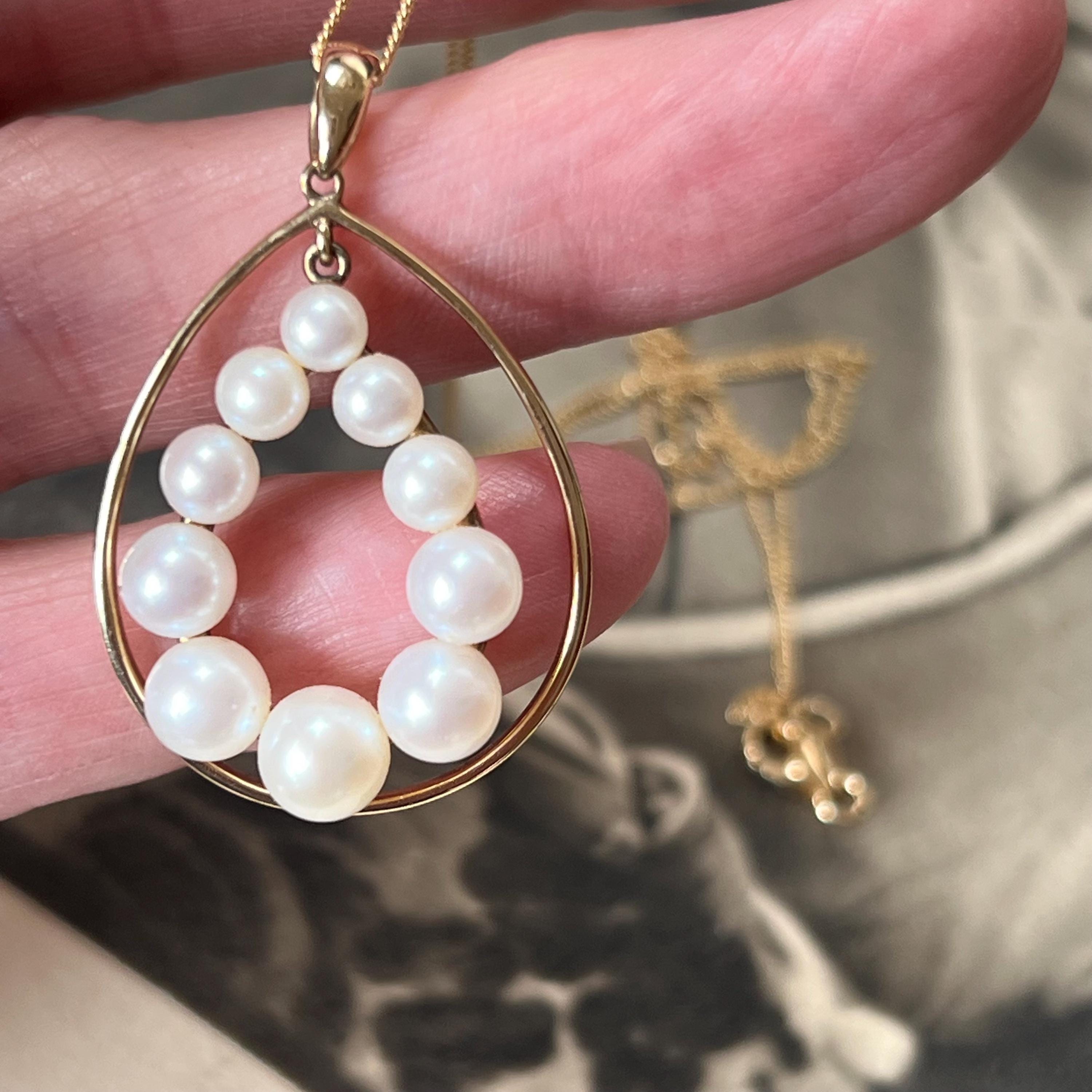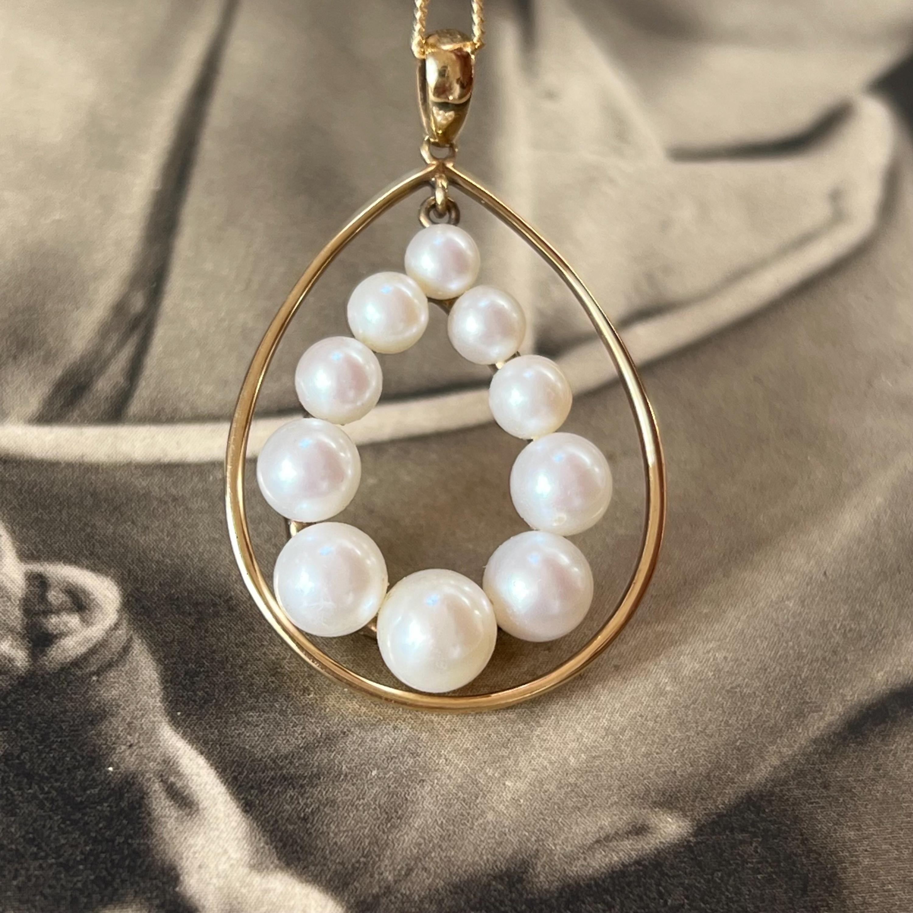 The Exquisite Vintage Pearl Pendant is a stunning piece of jewelry, meticulously crafted with care to showcase the beauty of cultured pearls. It's made of 9ct gold, marked with a '375' stamp for quality assurance. The pendant boasts ten pearls of varying sizes, ranging from 3.6mm to 6mm, arranged in a lovely graduated pattern.