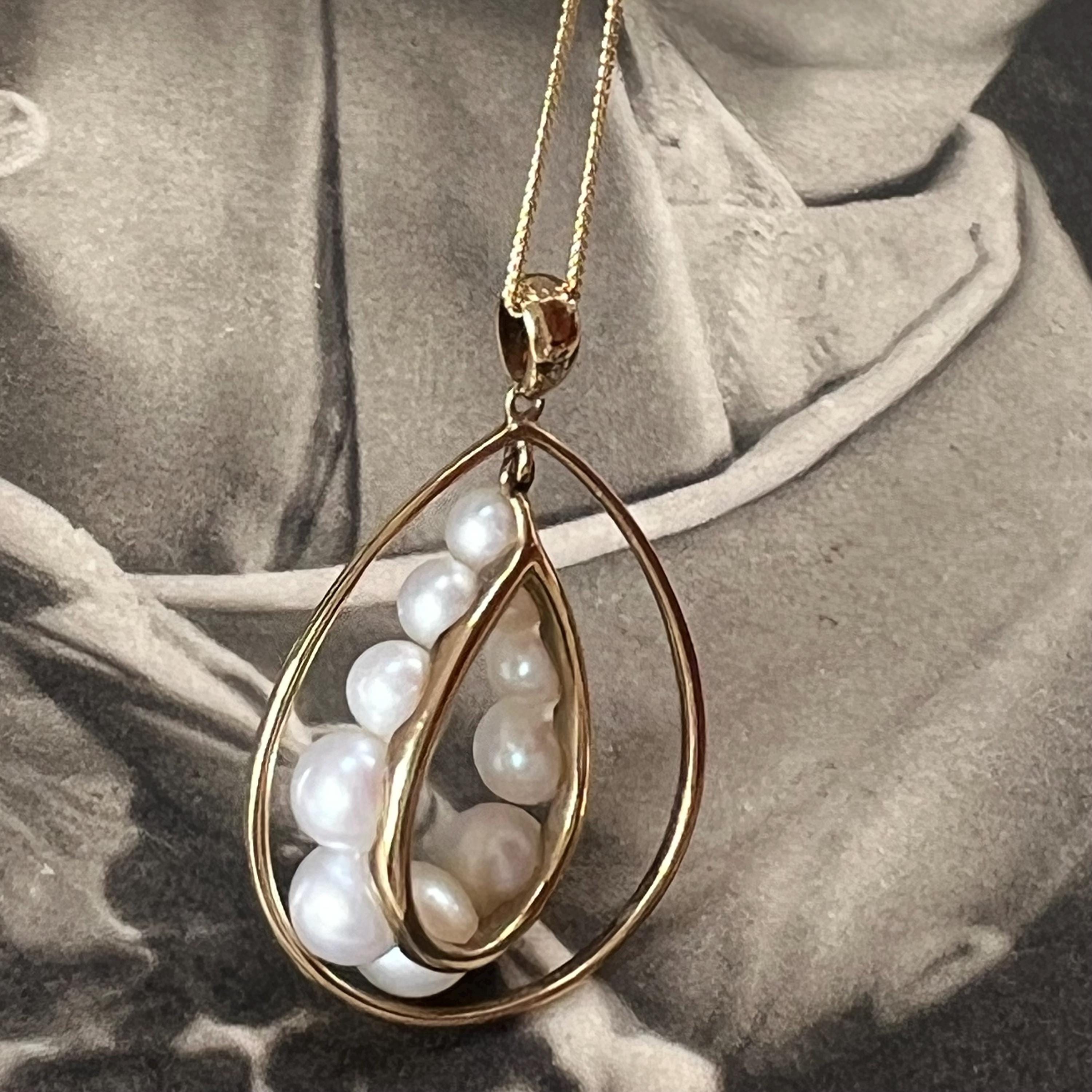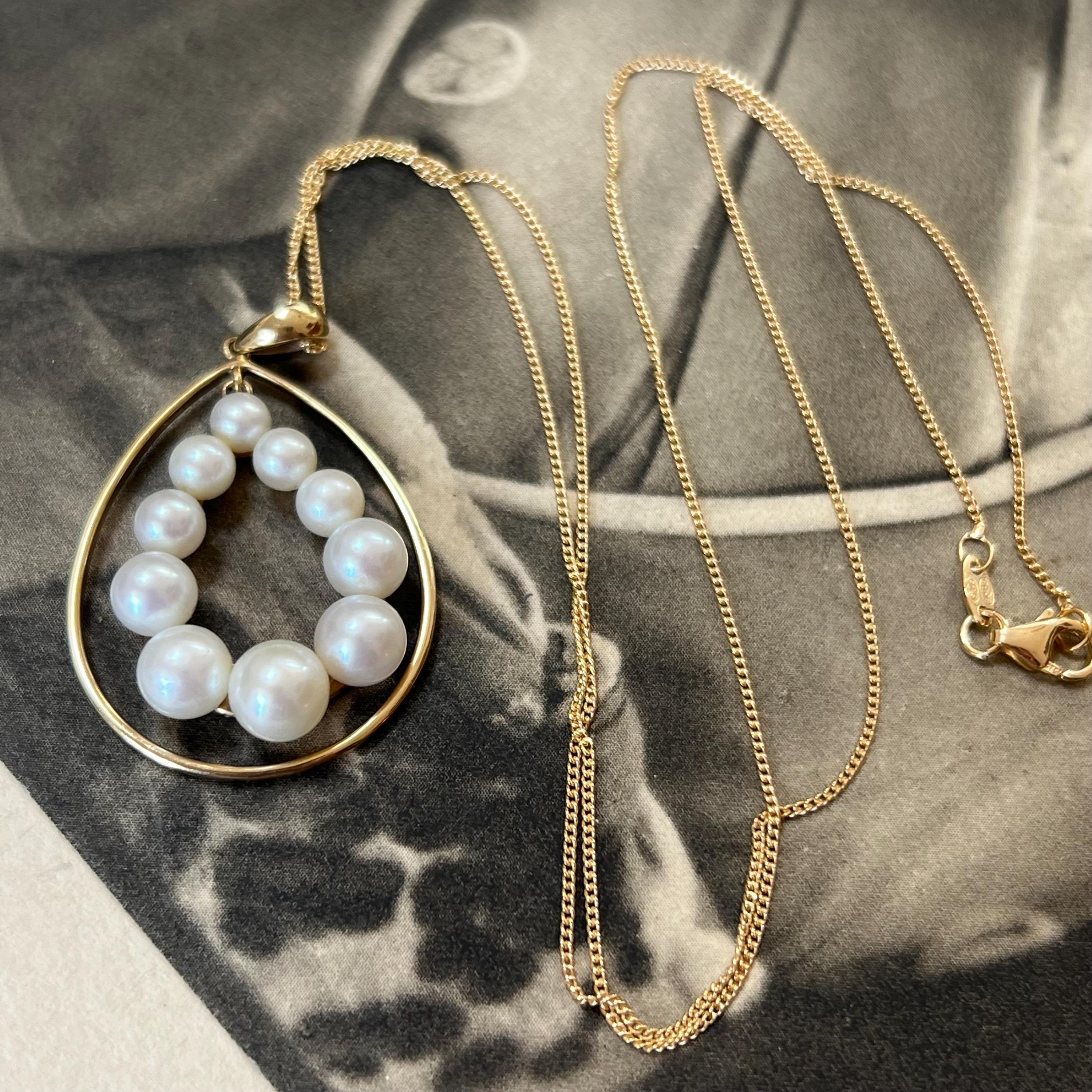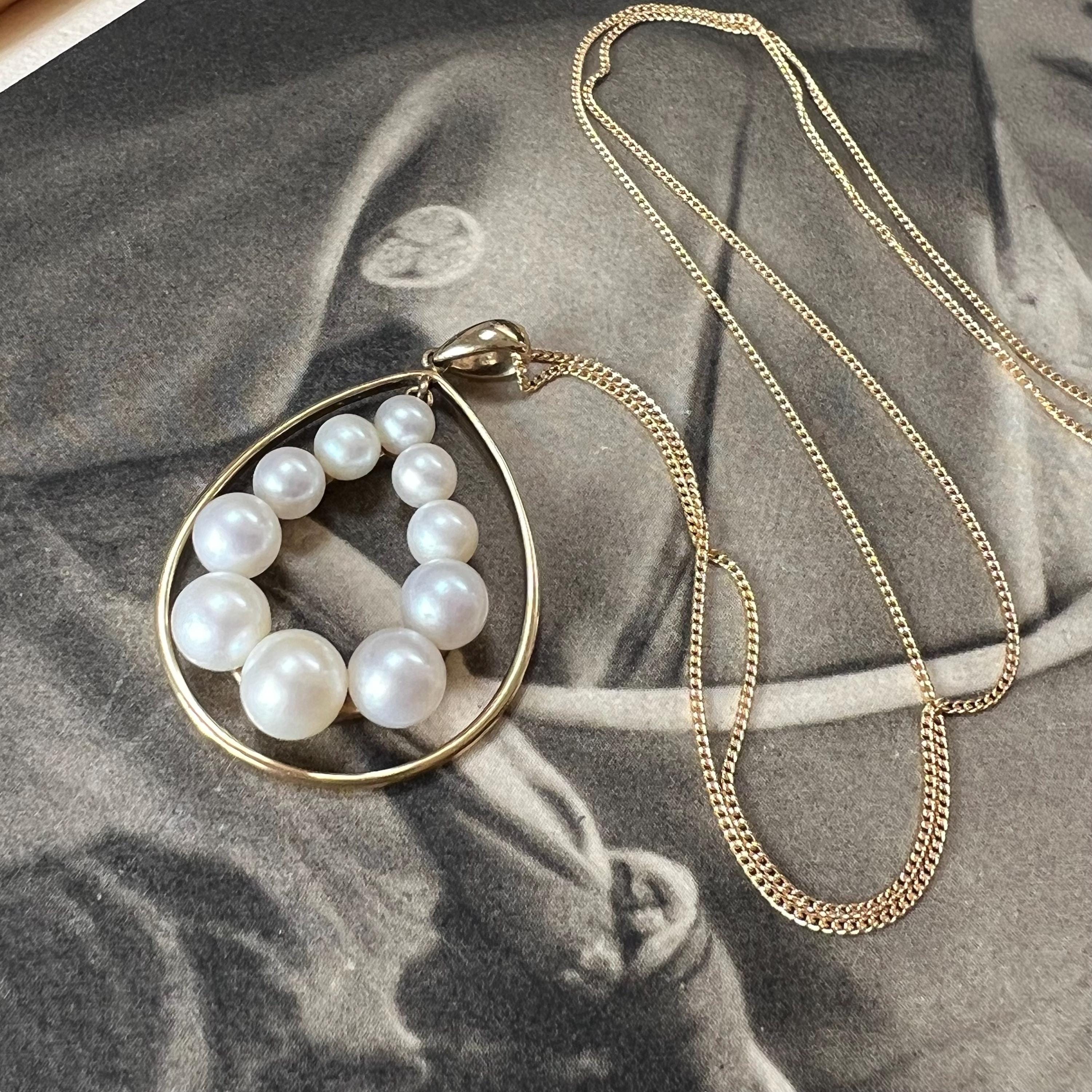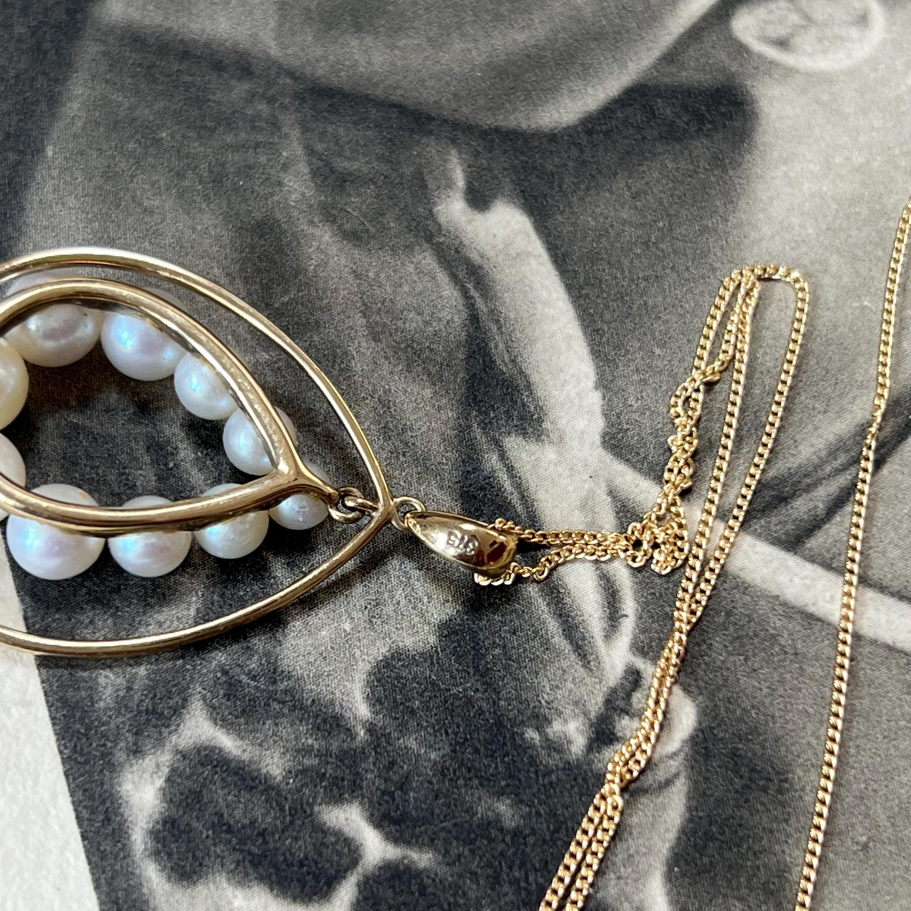 The Exquisite Vintage Pearl Pendant is a stunning piece of jewelry, meticulously crafted with care to showcase the beauty of cultured pearls. It's made of 9ct gold, marked with a '375' stamp for quality assurance. The pendant boasts ten pearls of varying sizes, ranging from 3.6mm to 6mm, arranged in a lovely graduated pattern.