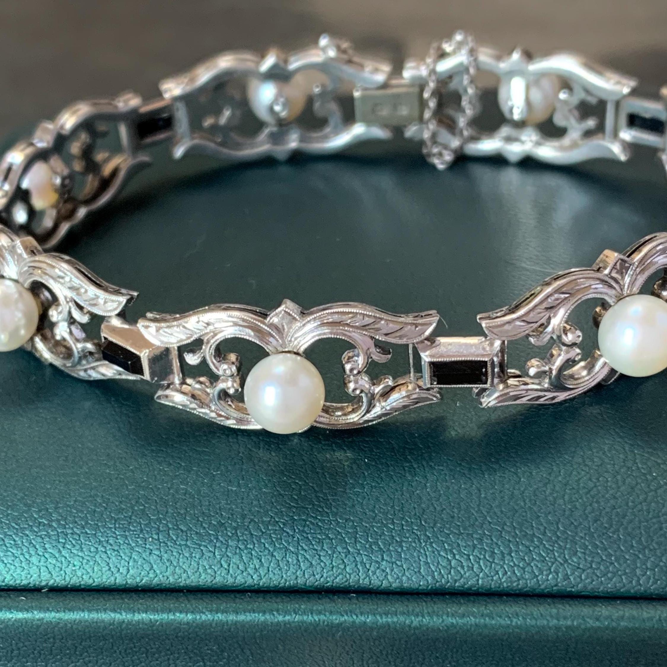 This is a stunning and authentic Mikimoto bracelet made from silver. The Bracelet has been designed with ornate scroll engraved rococo style open links with a Akoya cultured pearl set to each one. Between the links are rectangular cut black onyx bezel set stones. The bracelet has the Mikimoto ‘M’ cartouche of clam shell and ‘S’ for its silver composition.