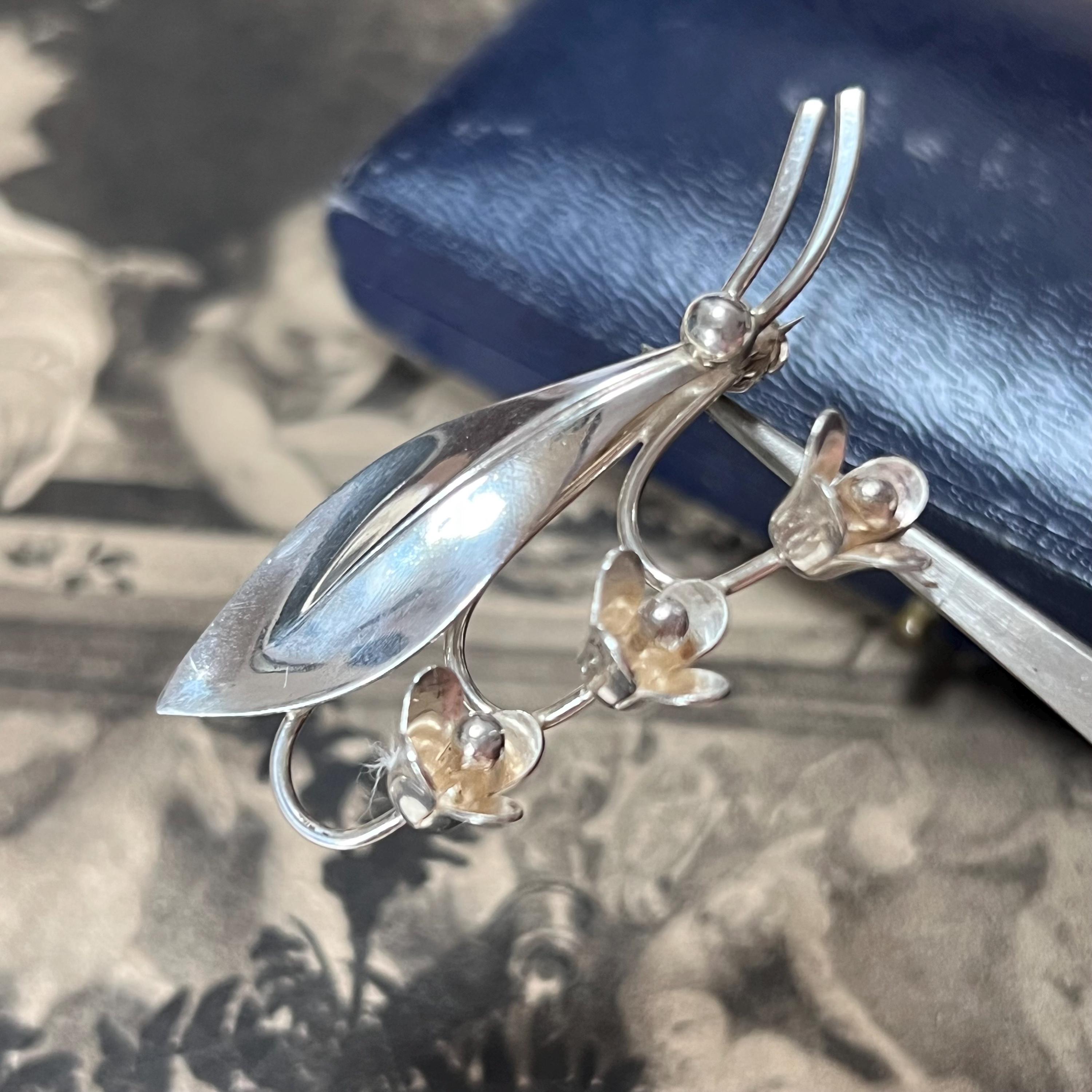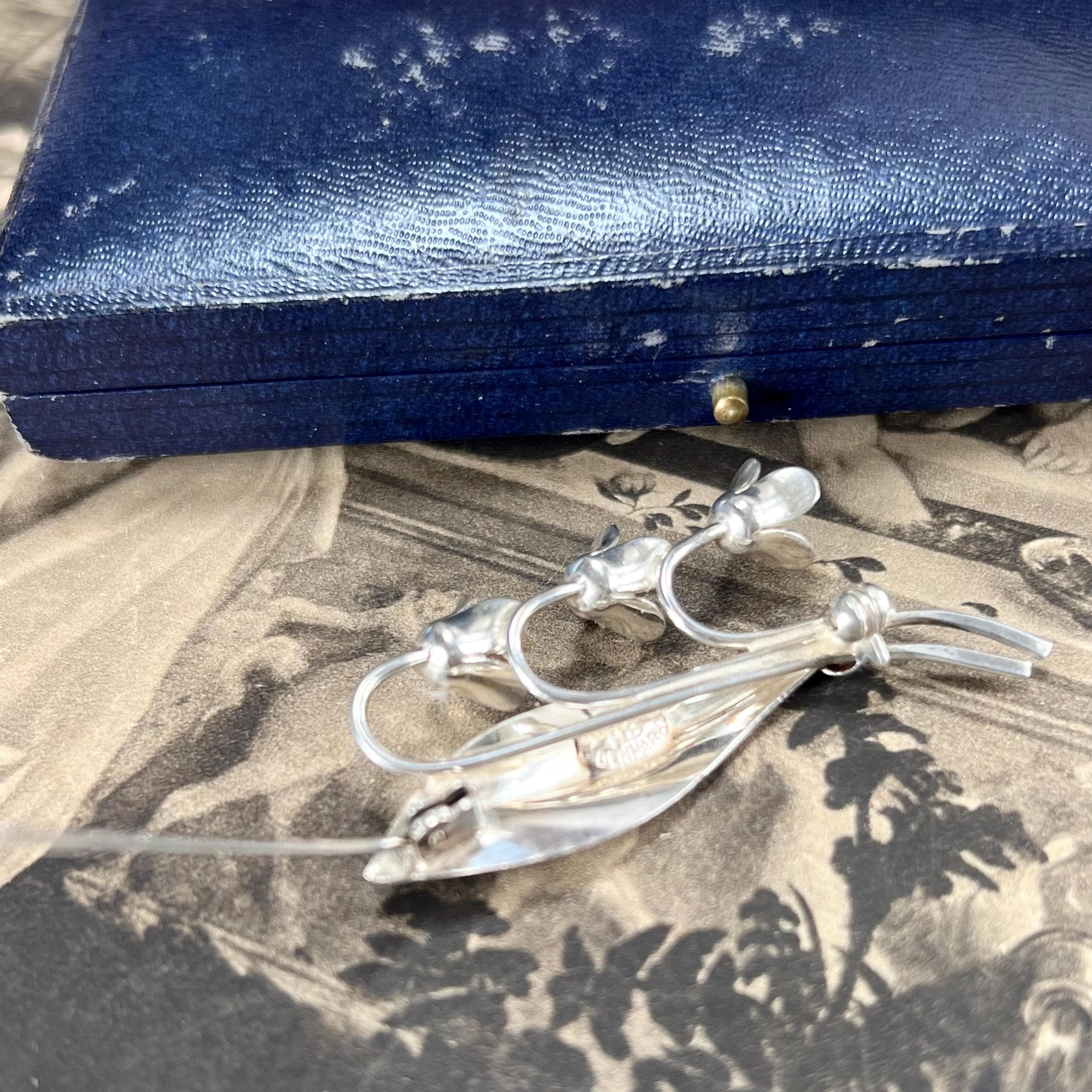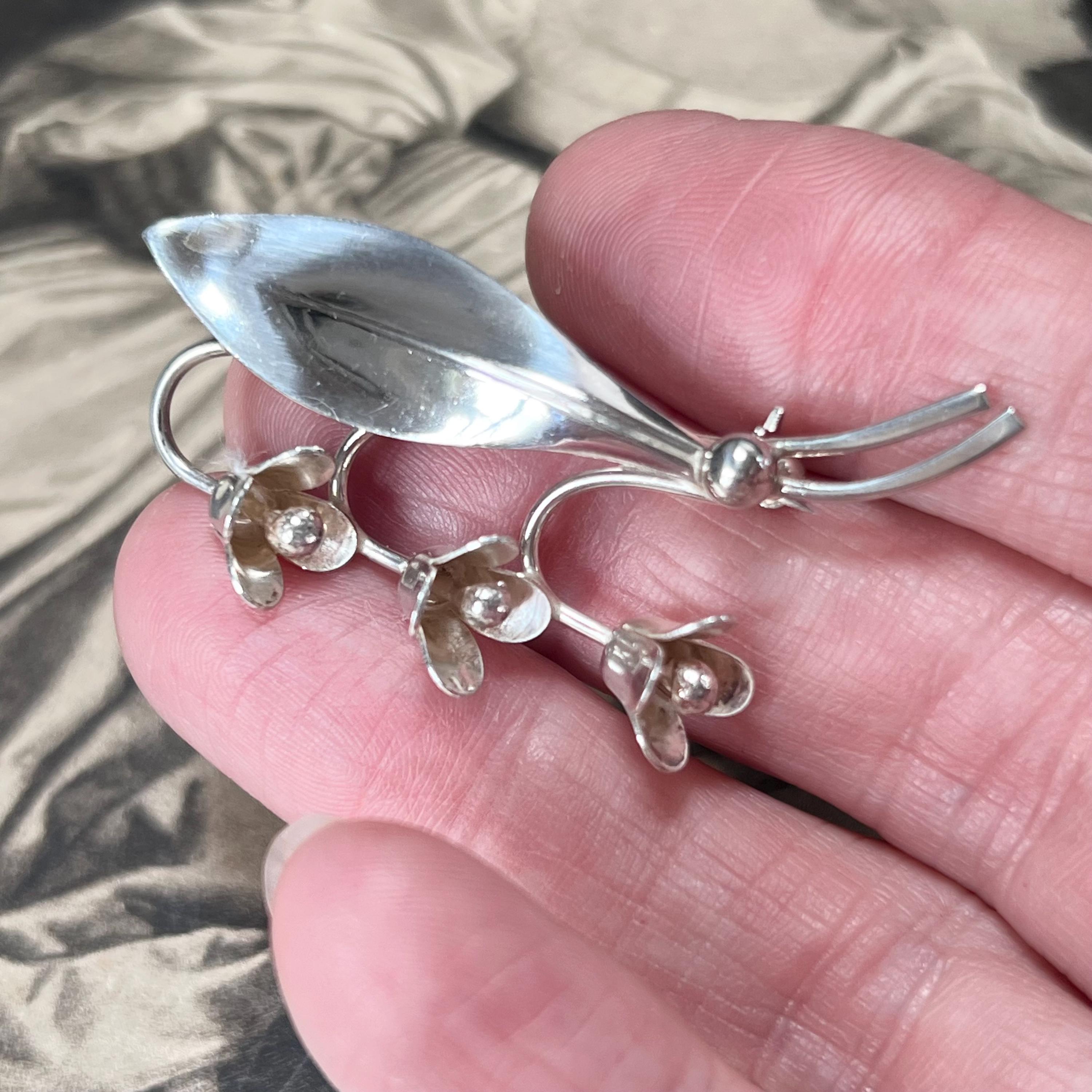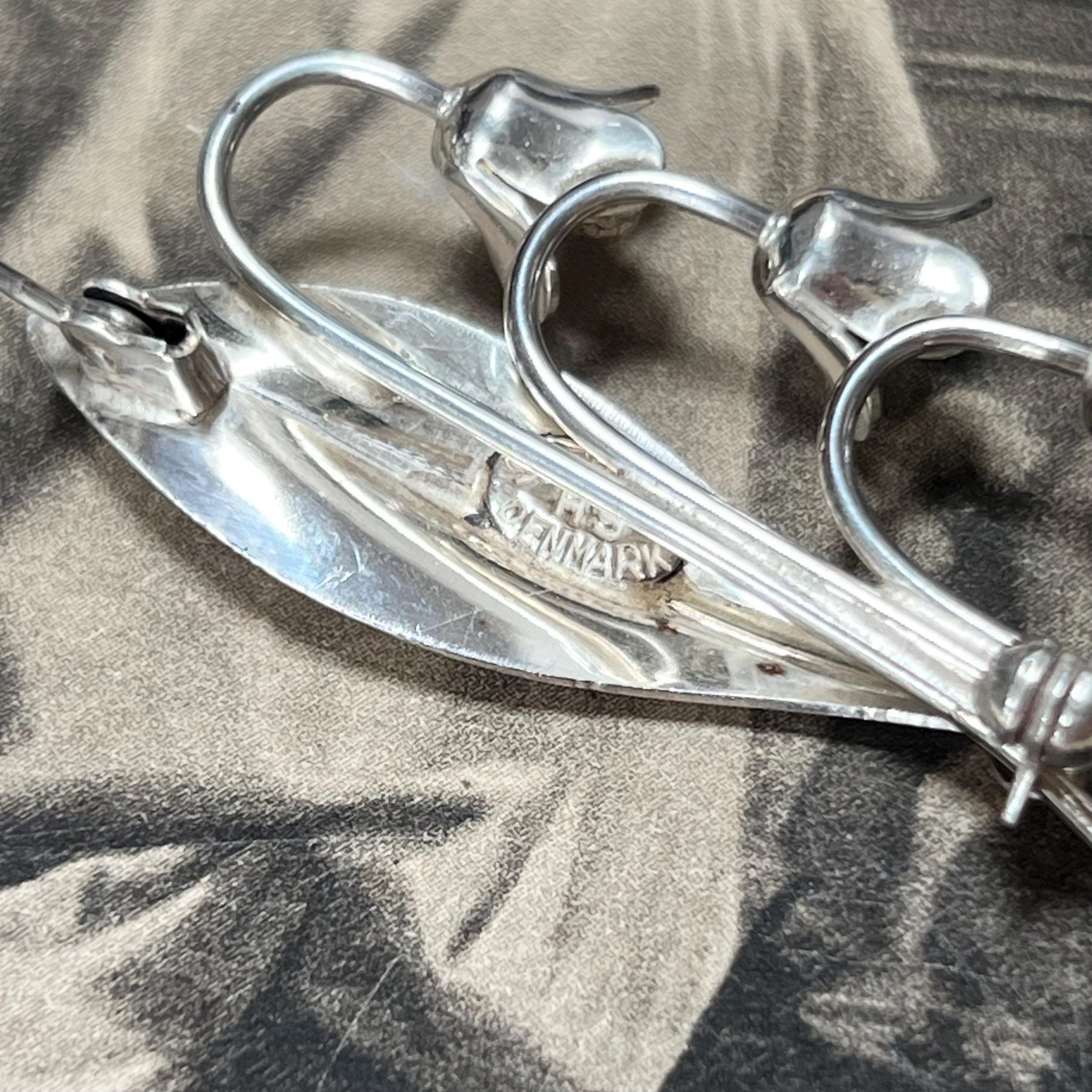 Hermann Siersbol Denmark - Sterling Silver Snowdrop Brooch, vintage dress pin circa 1950s. Stamped to the back HS for Hermann Siersbol, Denmark and 'Sterling'. The size of the brooch is 50 mm long x 22.5 mm wide with pin to the back and a weight of 5.9 grams.