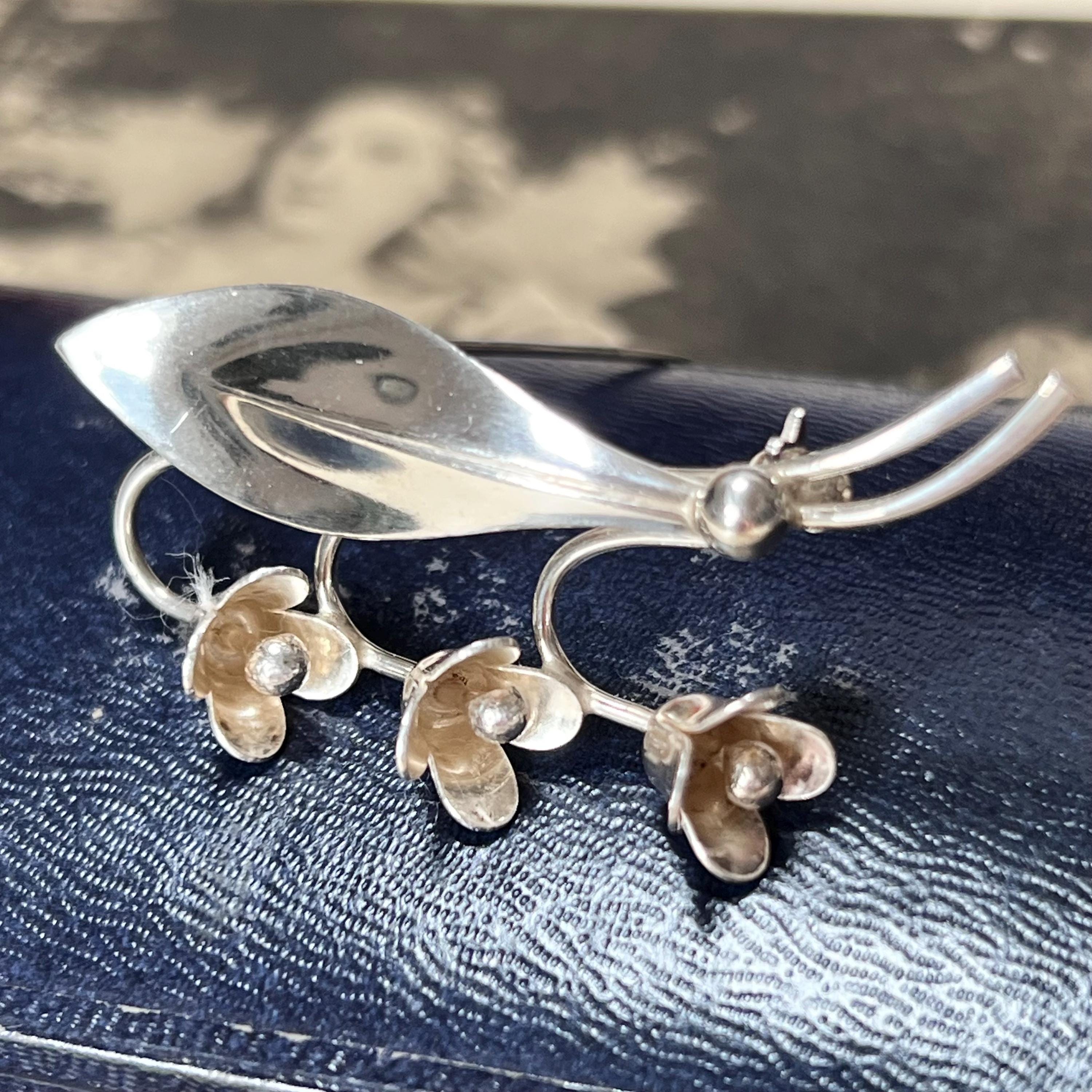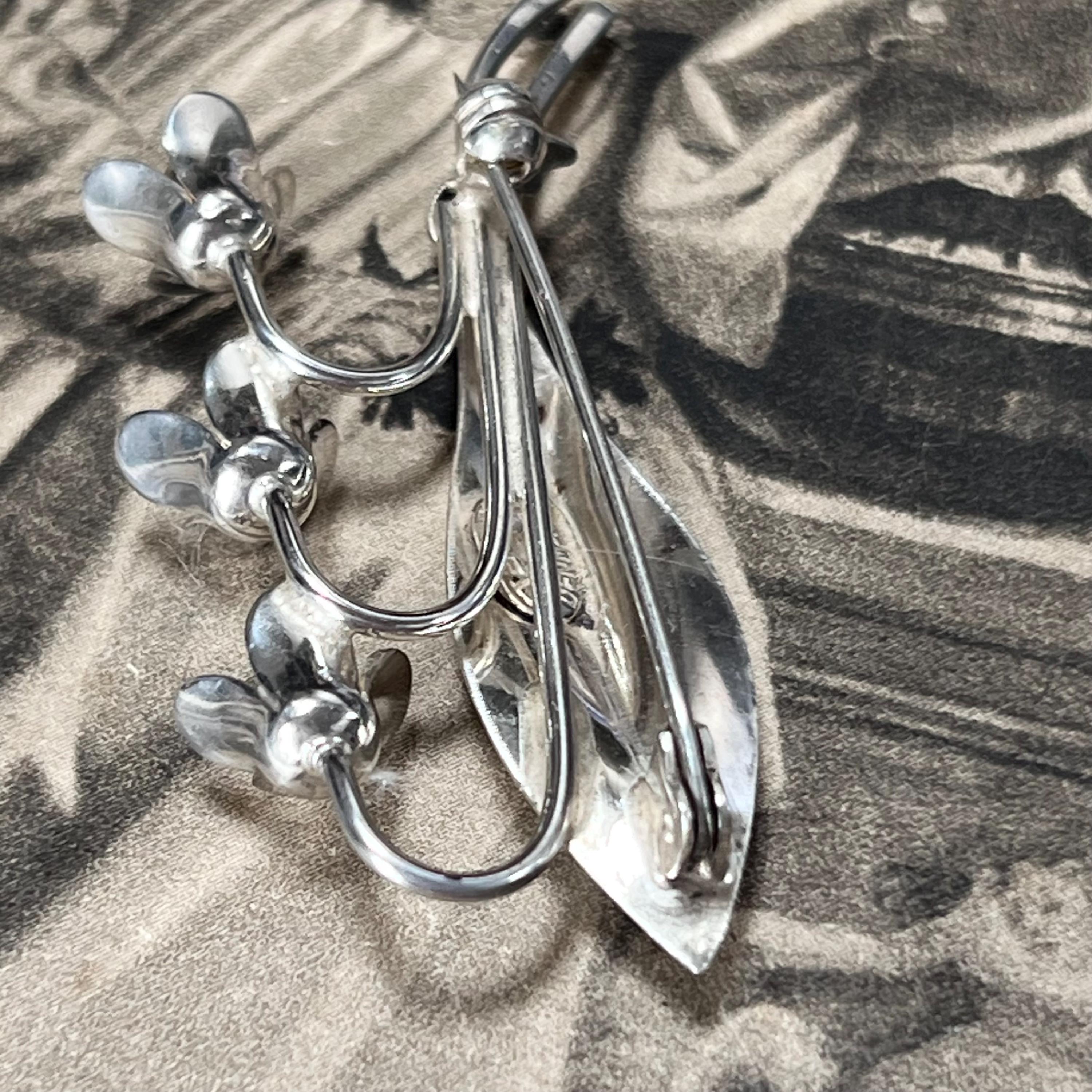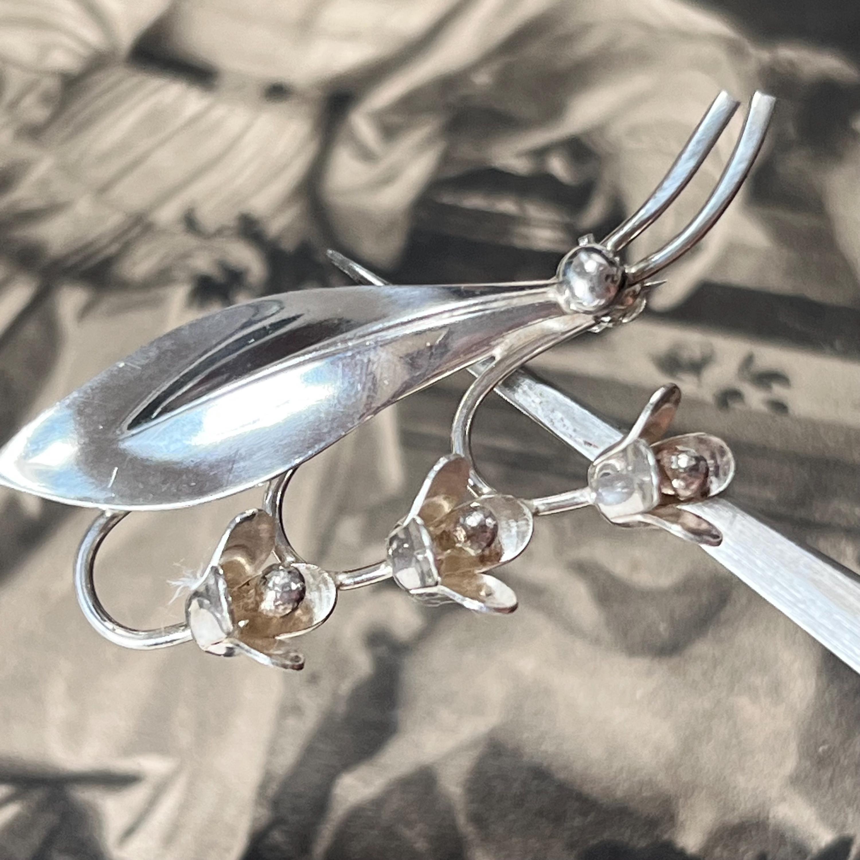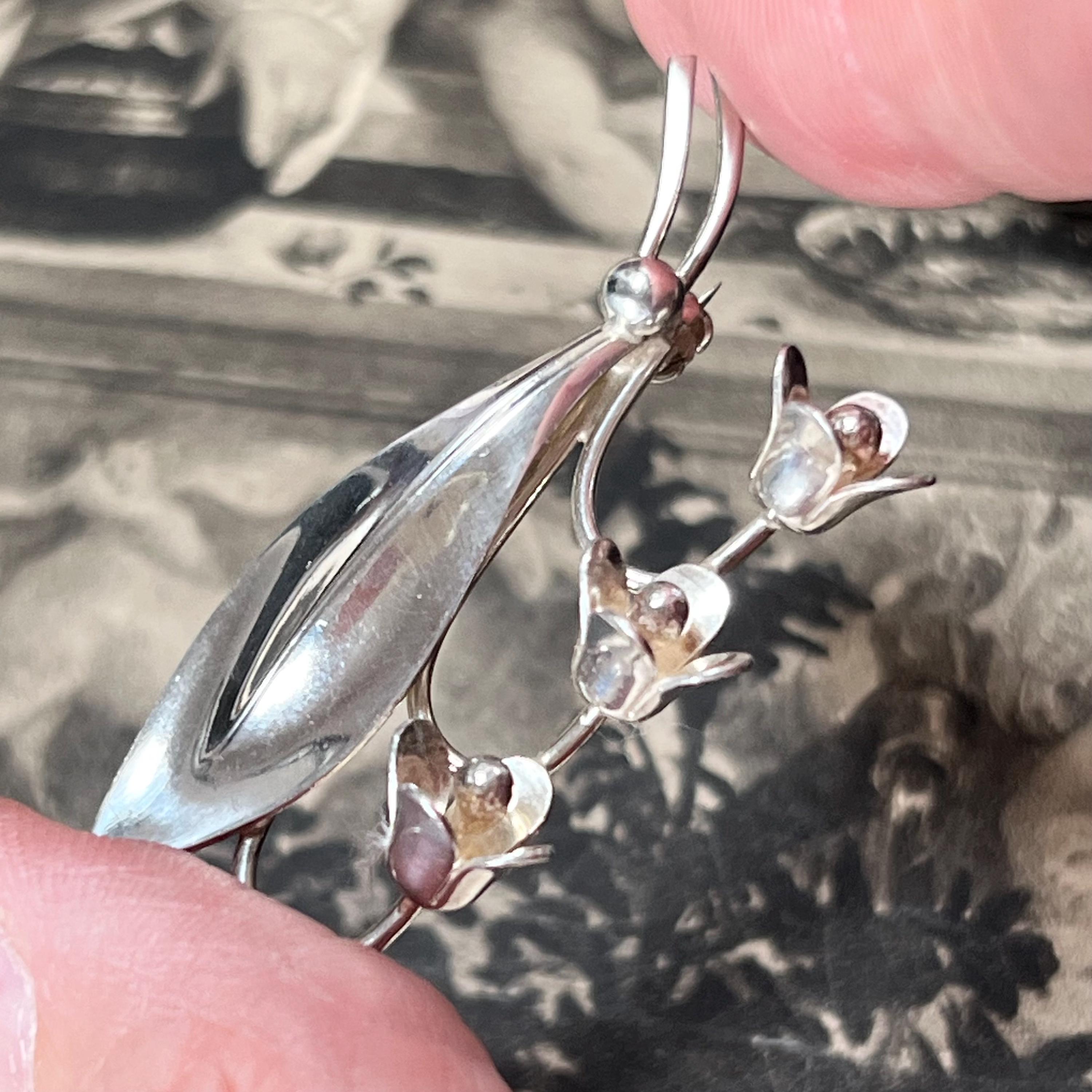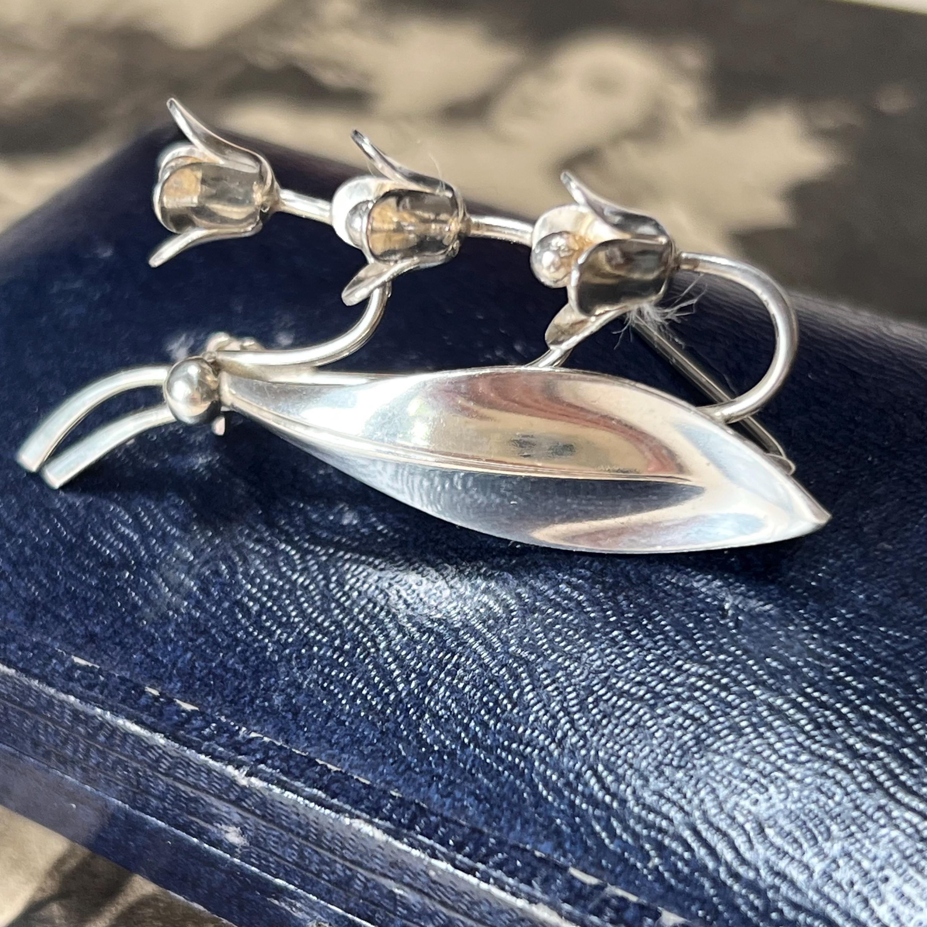 Hermann Siersbol Denmark - Sterling Silver Snowdrop Brooch, vintage dress pin circa 1950s. Stamped to the back HS for Hermann Siersbol, Denmark and 'Sterling'. The size of the brooch is 50 mm long x 22.5 mm wide with pin to the back and a weight of 5.9 grams.