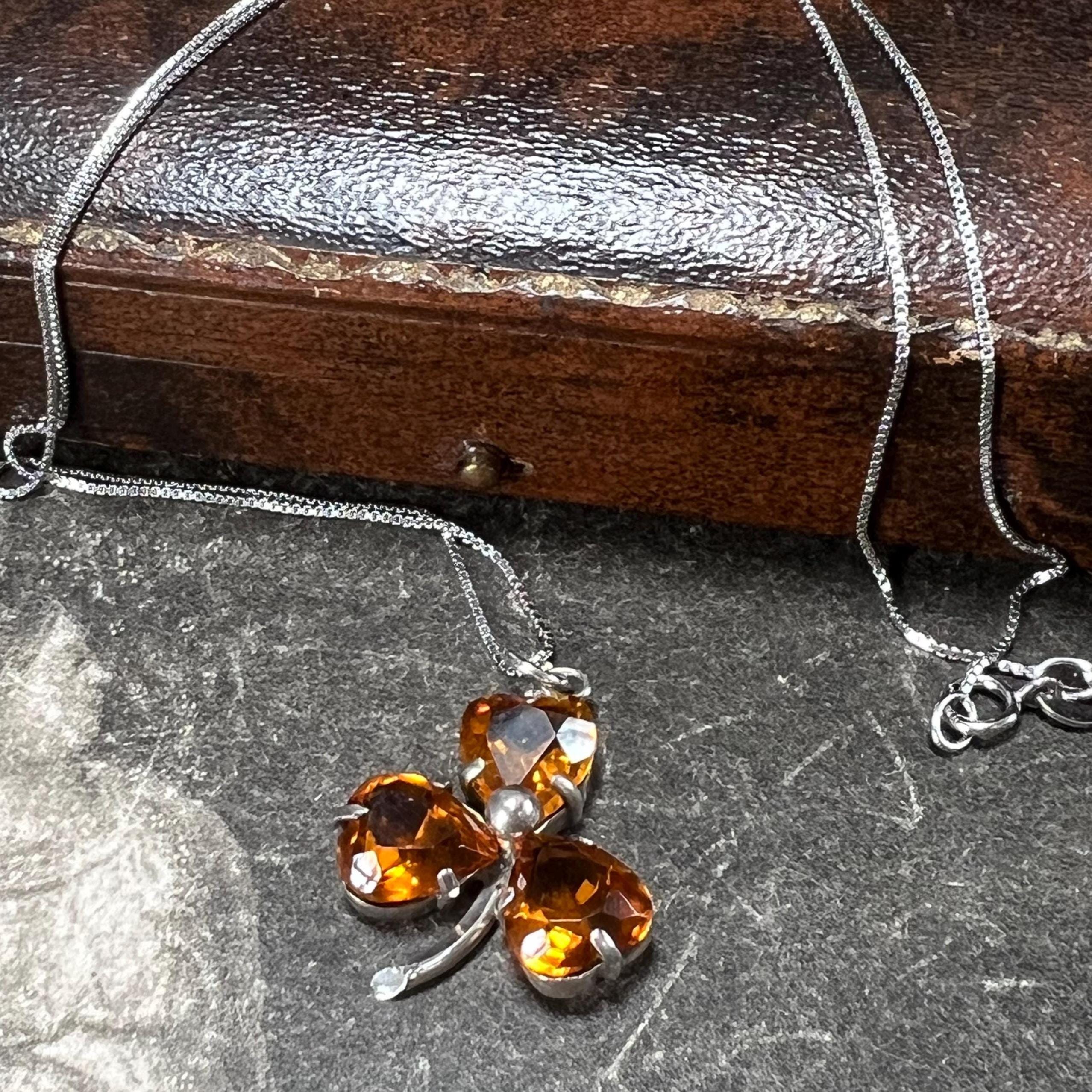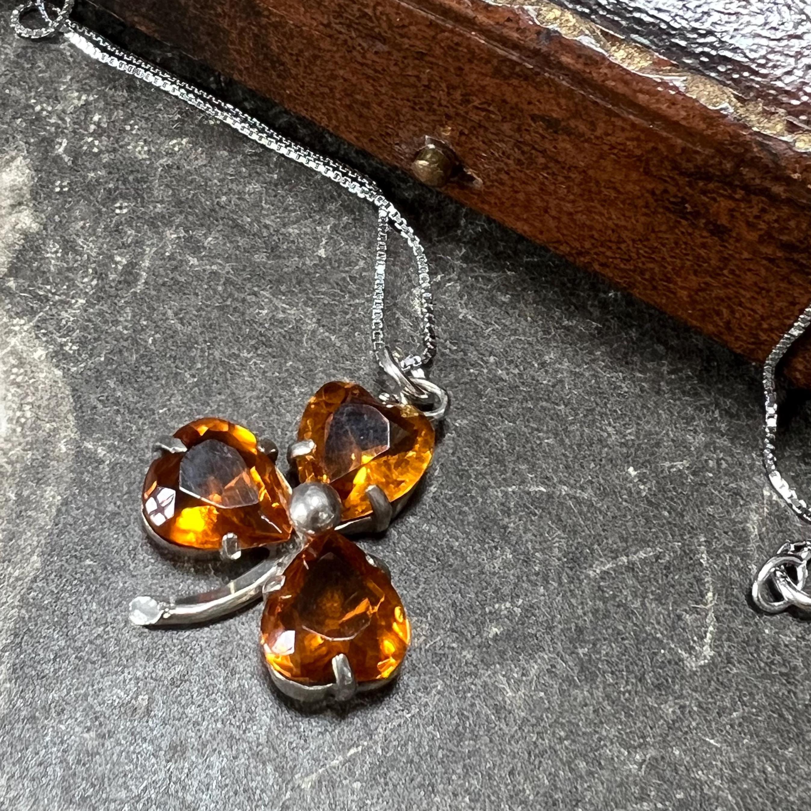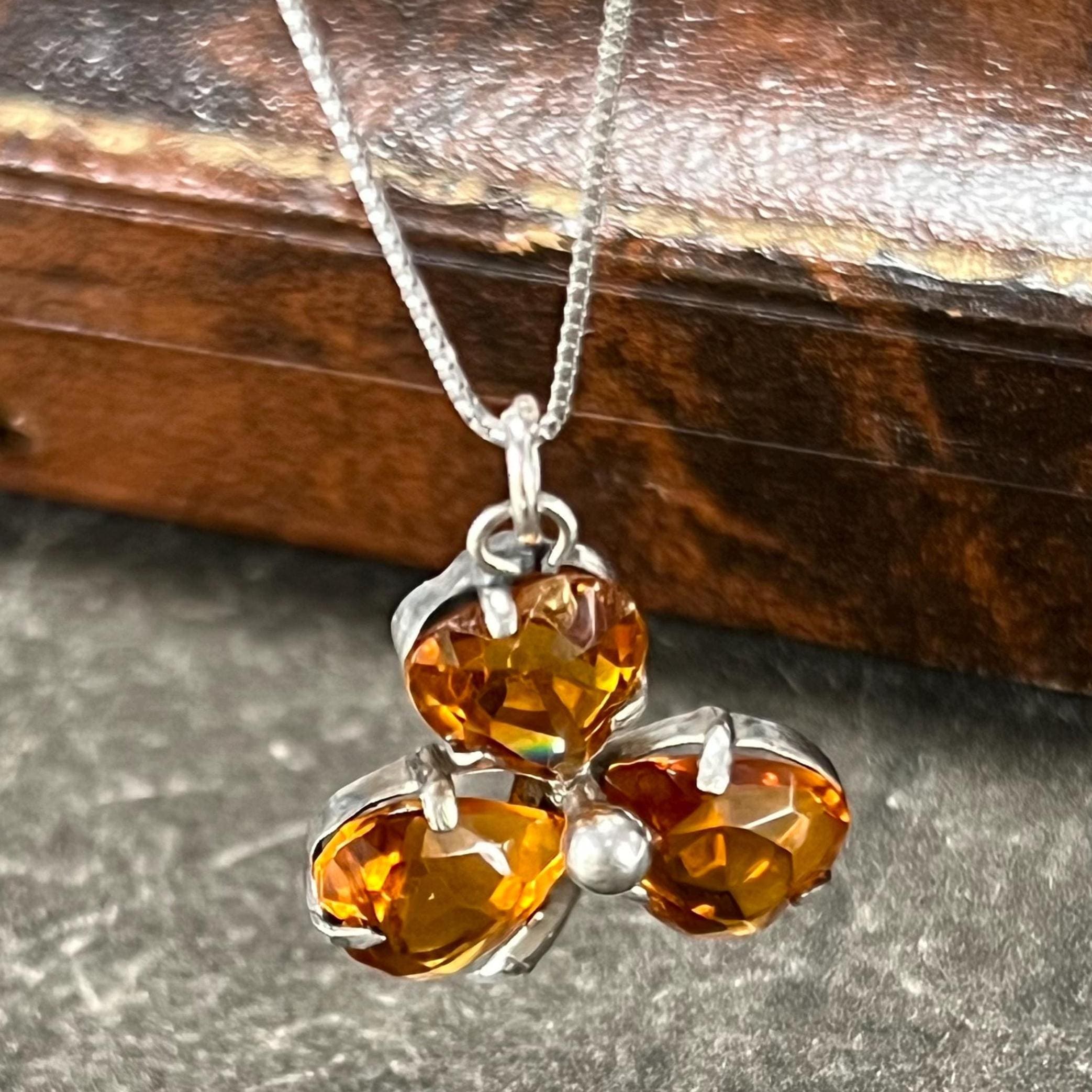 Art Deco silver citrine clover pendant, fully hallmarked for 1910–1911, during the reign of George V. 16 inch vintage 925 silver fine link box chain. A rare and meaningful antique jewel, it features three heart-shaped golden citrines arranged into a beautifully symbolic lucky clover. Citrine has long been associated with joy, positivity, good fortune, and abundance, making this design especially fitting.
