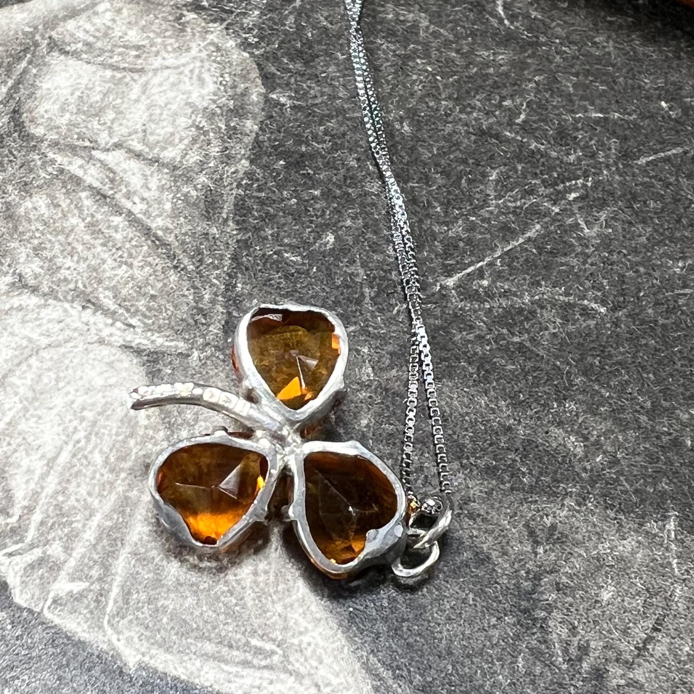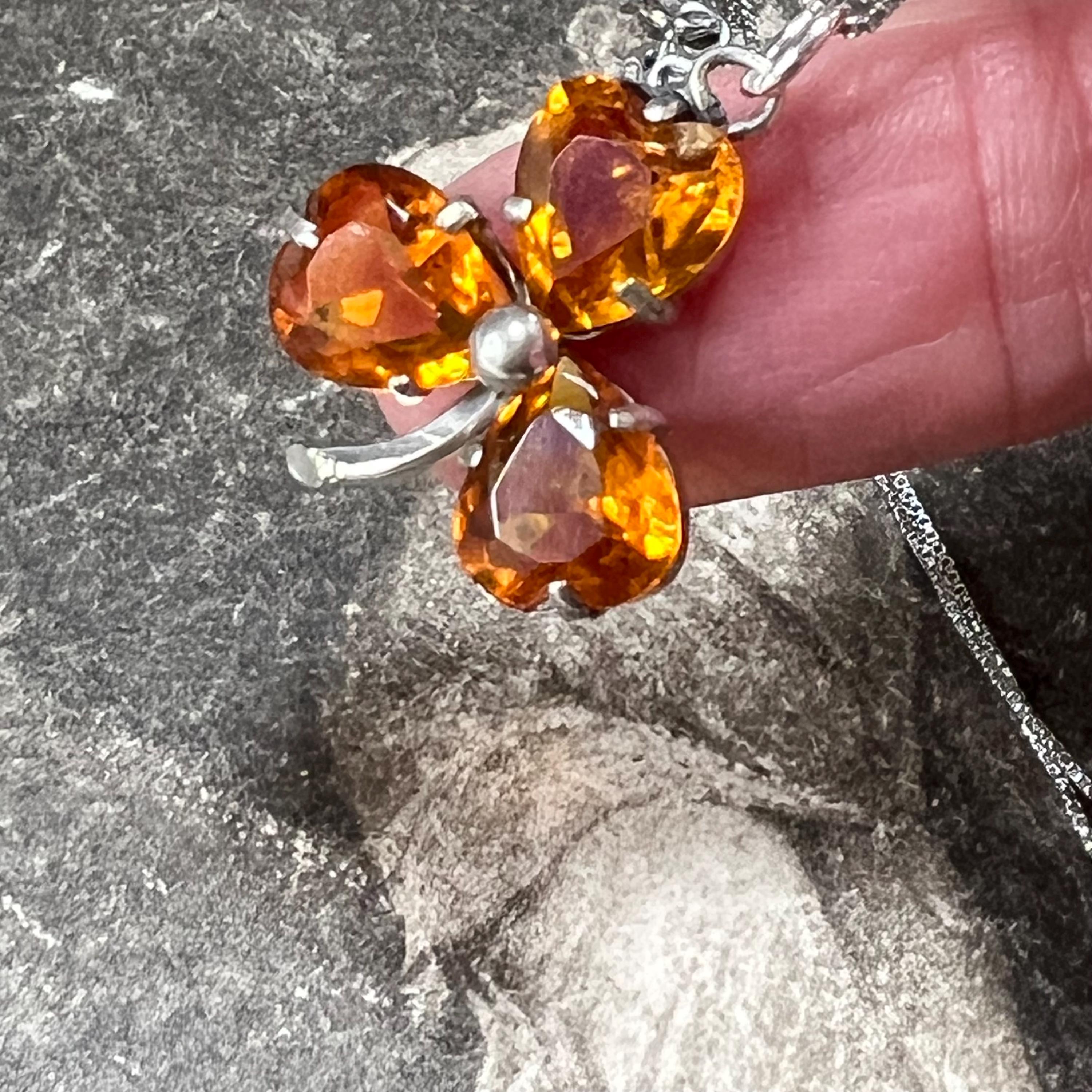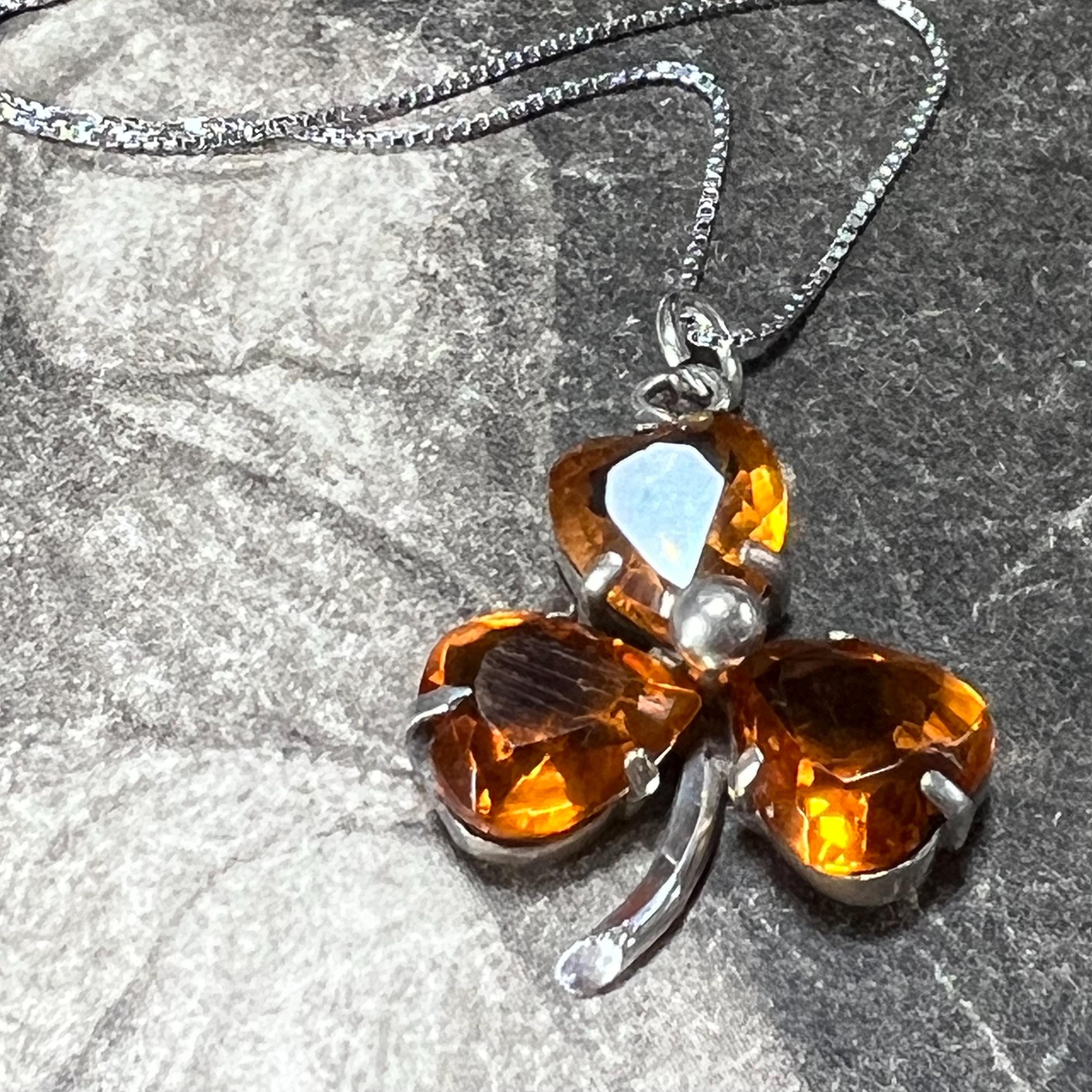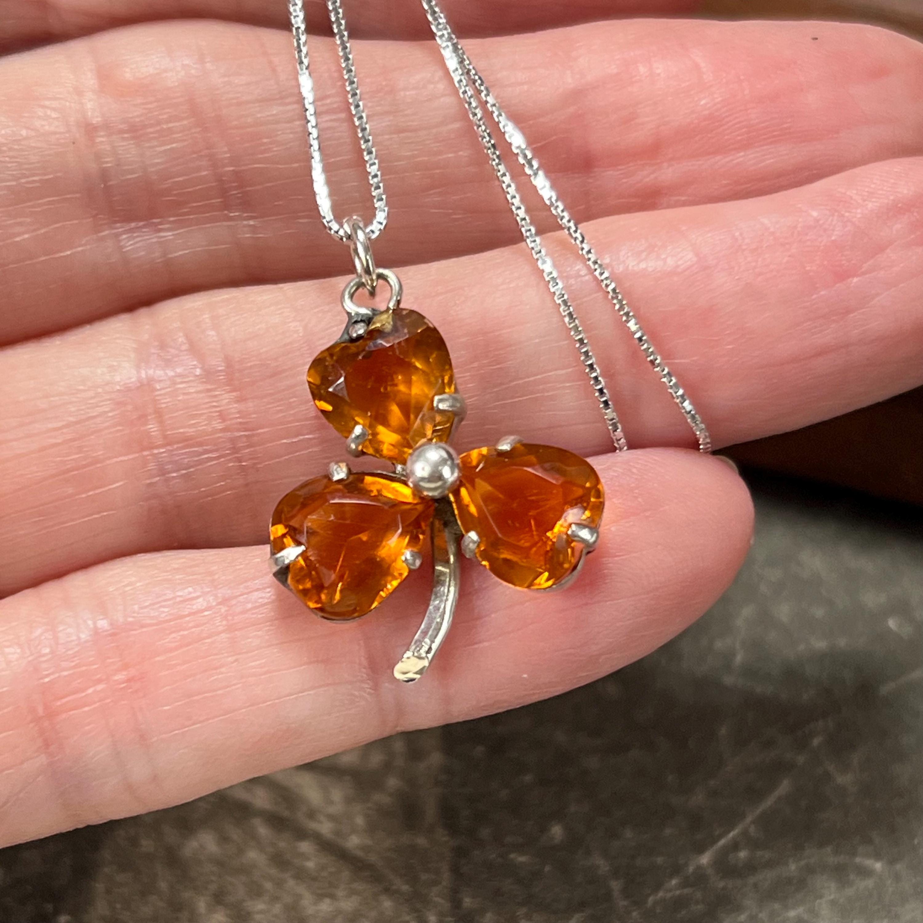 Art Deco silver citrine clover pendant, fully hallmarked for 1910–1911, during the reign of George V. 16 inch vintage 925 silver fine link box chain. A rare and meaningful antique jewel, it features three heart-shaped golden citrines arranged into a beautifully symbolic lucky clover. Citrine has long been associated with joy, positivity, good fortune, and abundance, making this design especially fitting.