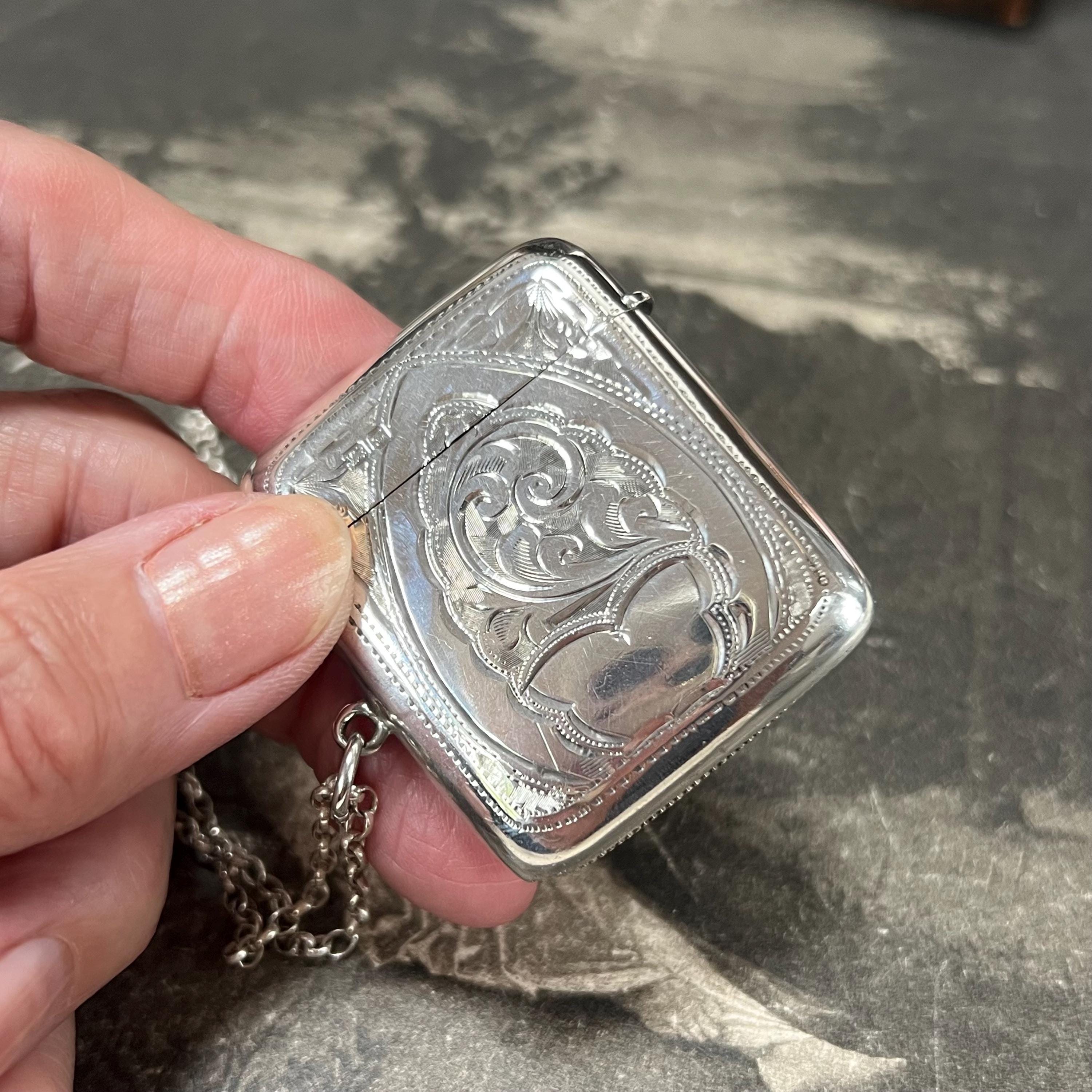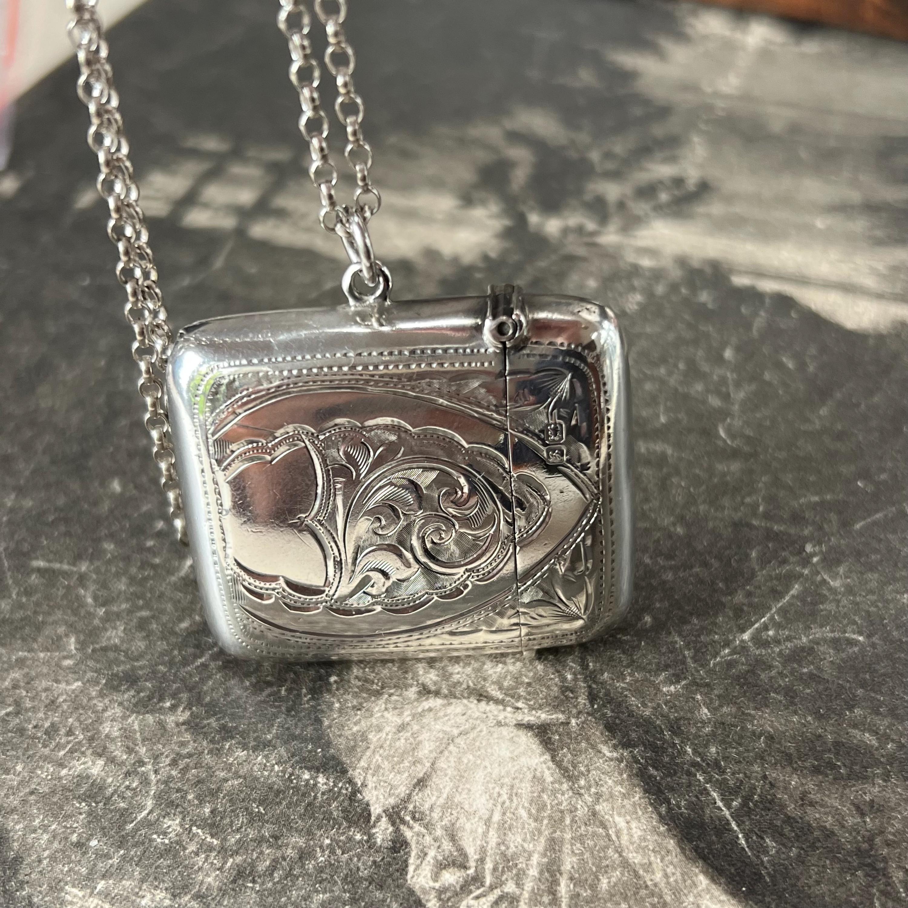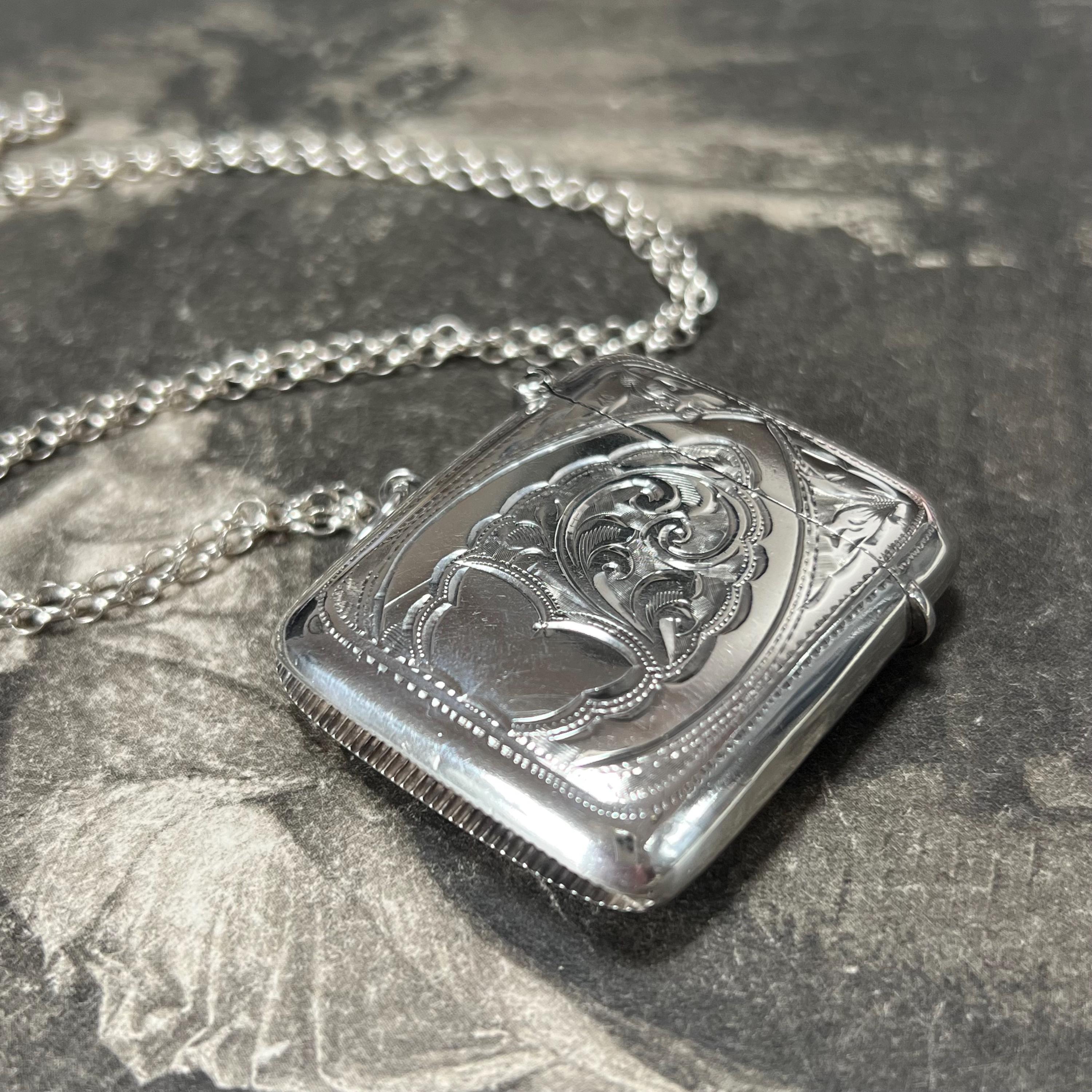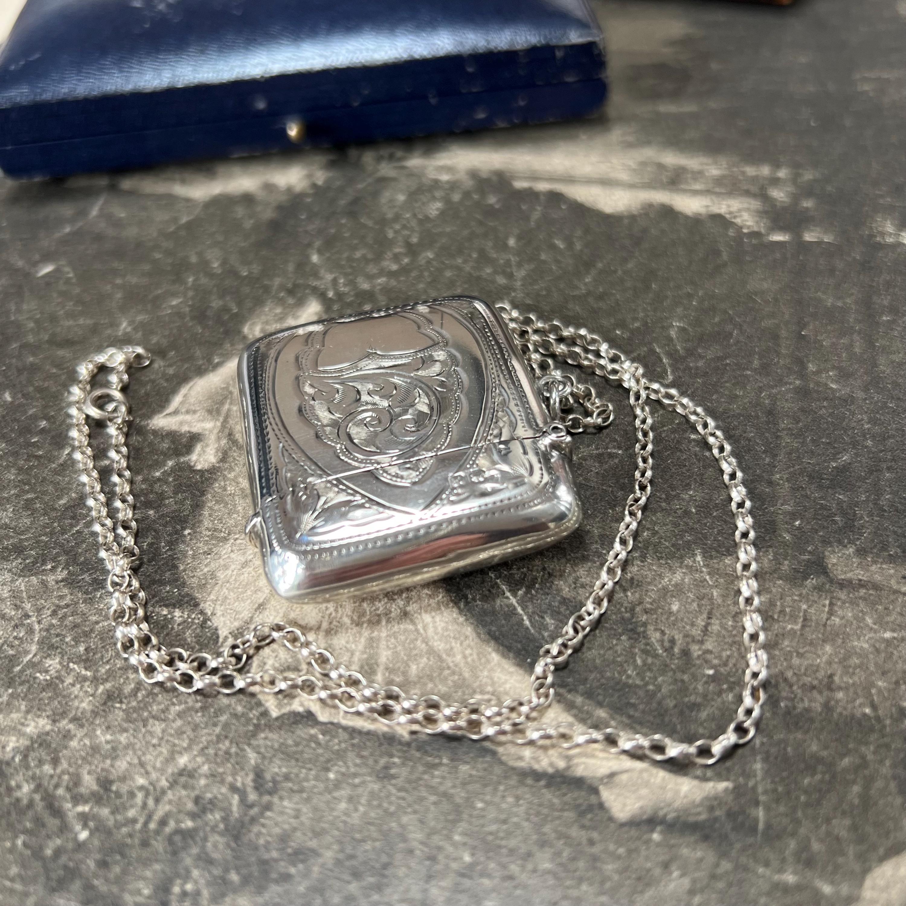 This vesta locket also comes with a vintage 20” silver belcher style chain stamped ‘sterling’ to the bolt ring, bringing the combined weight of case and chain to a generous 29.7 grams. This wonderful case has been restored and is in outstanding condition for a piece of its era and will come in a new eco-friendly box ready for gifting.