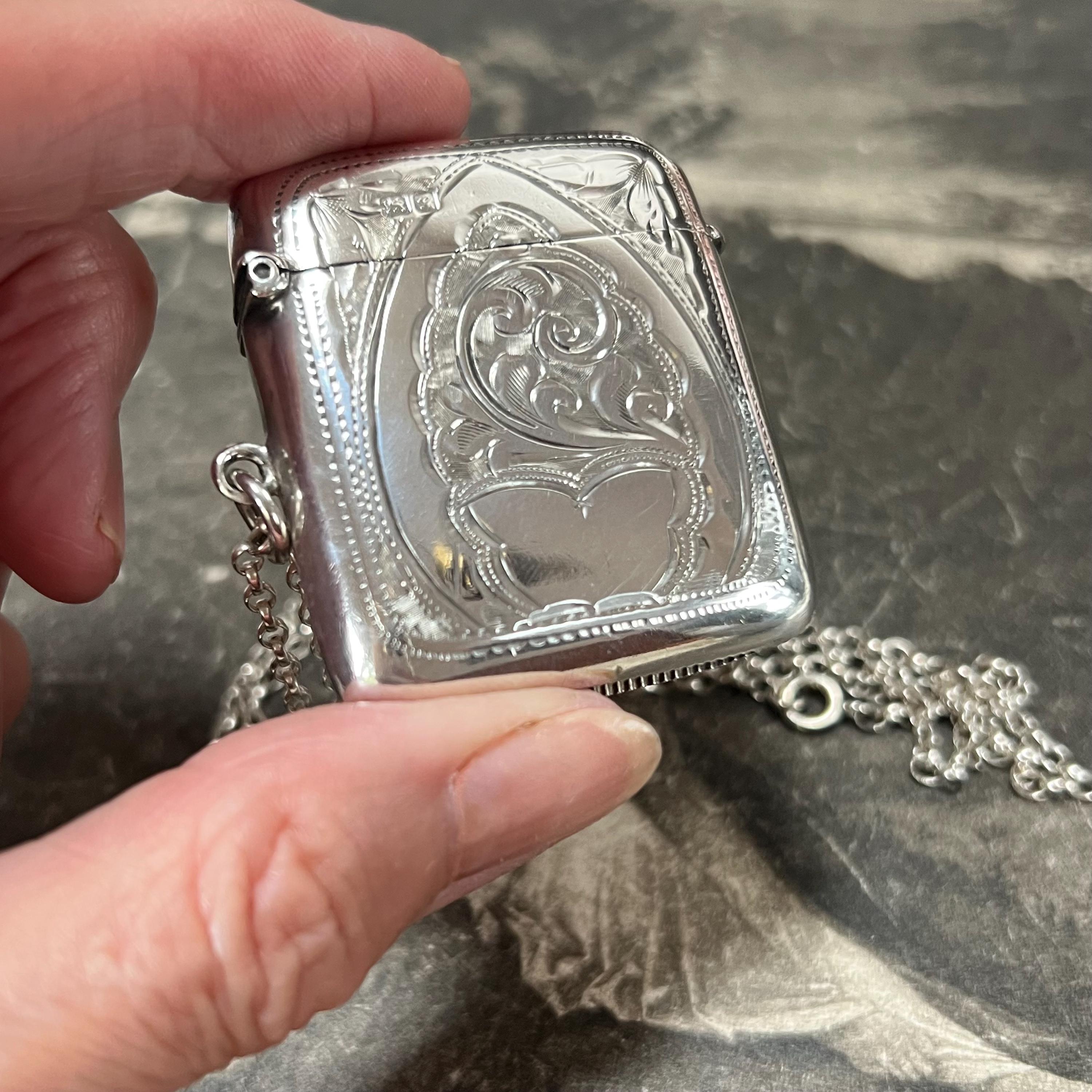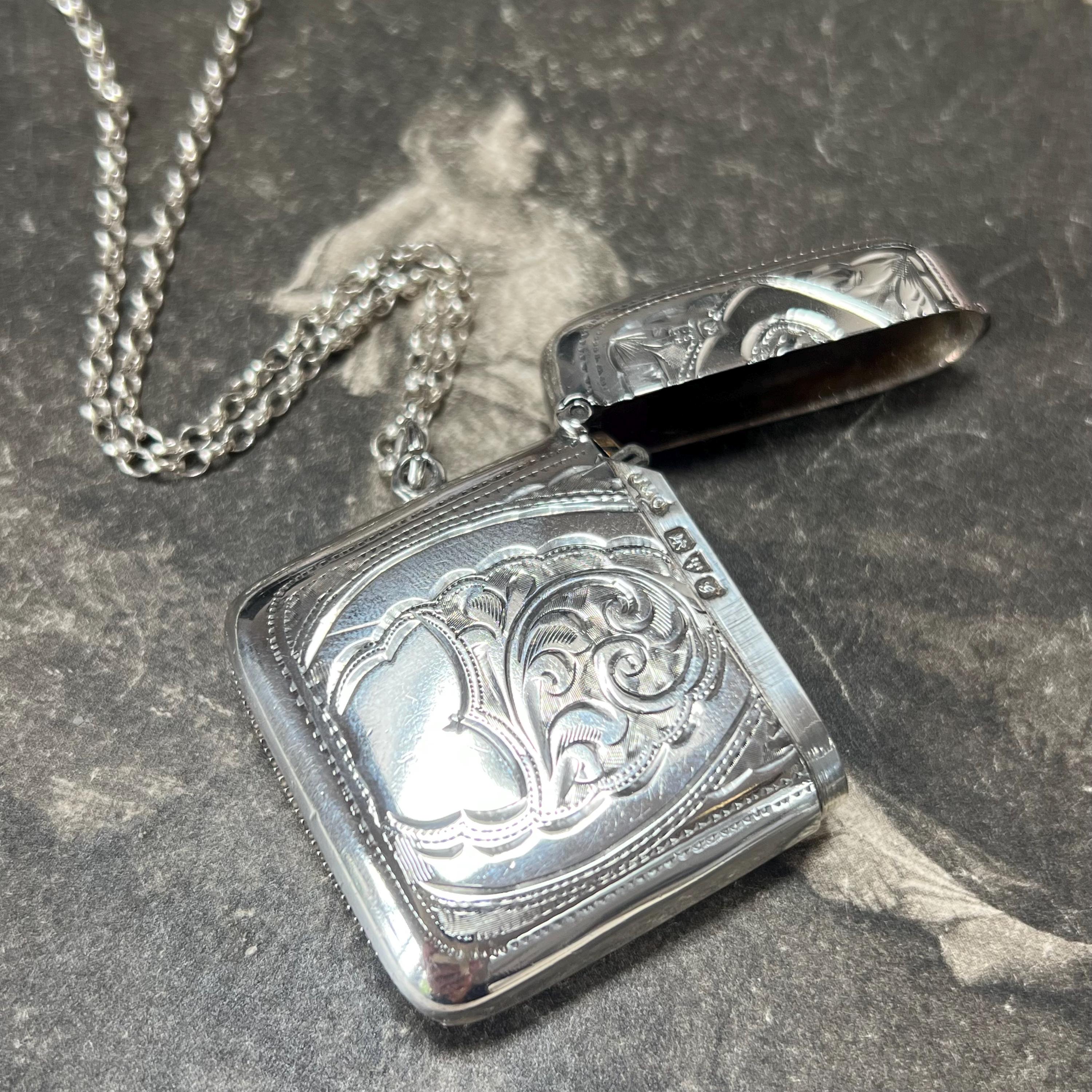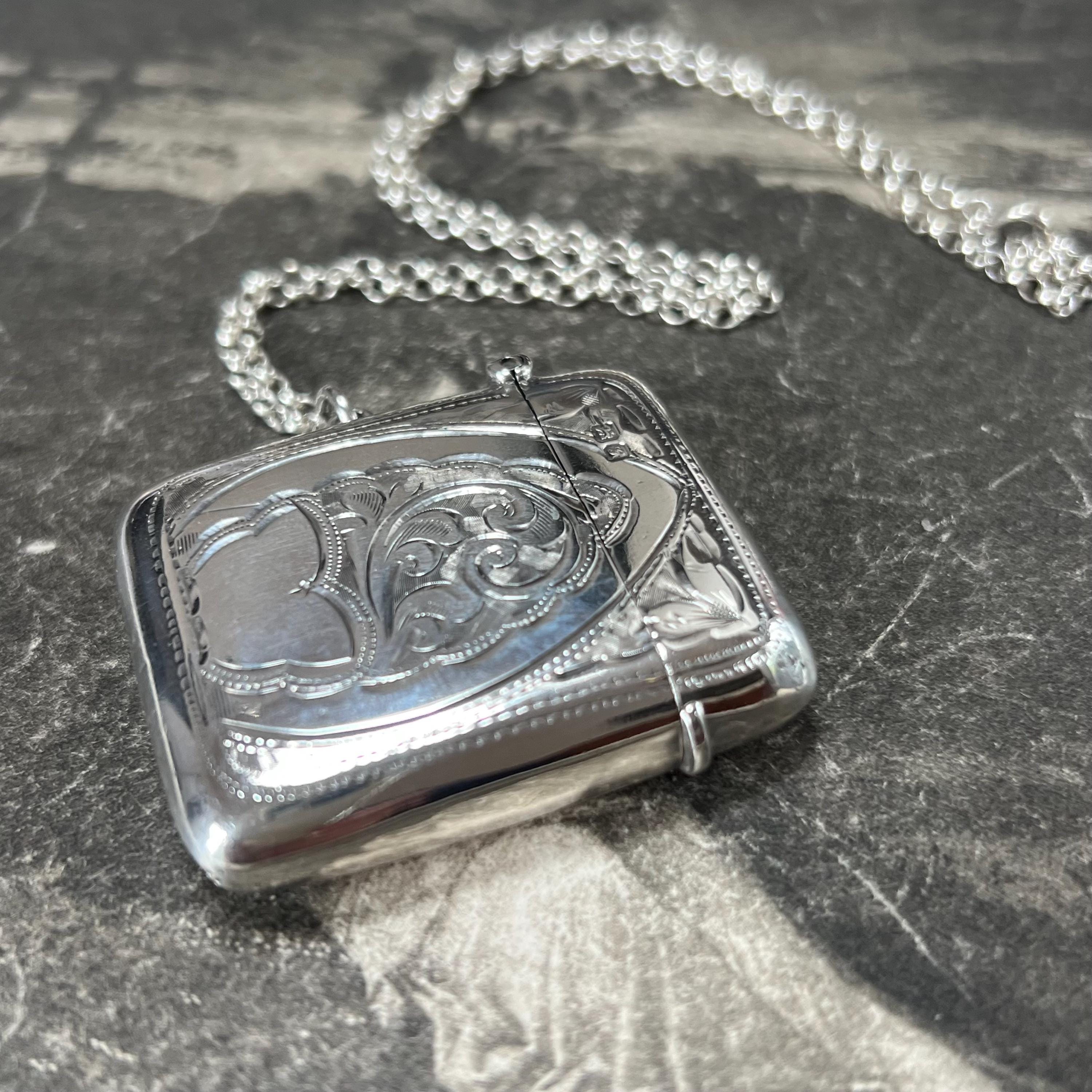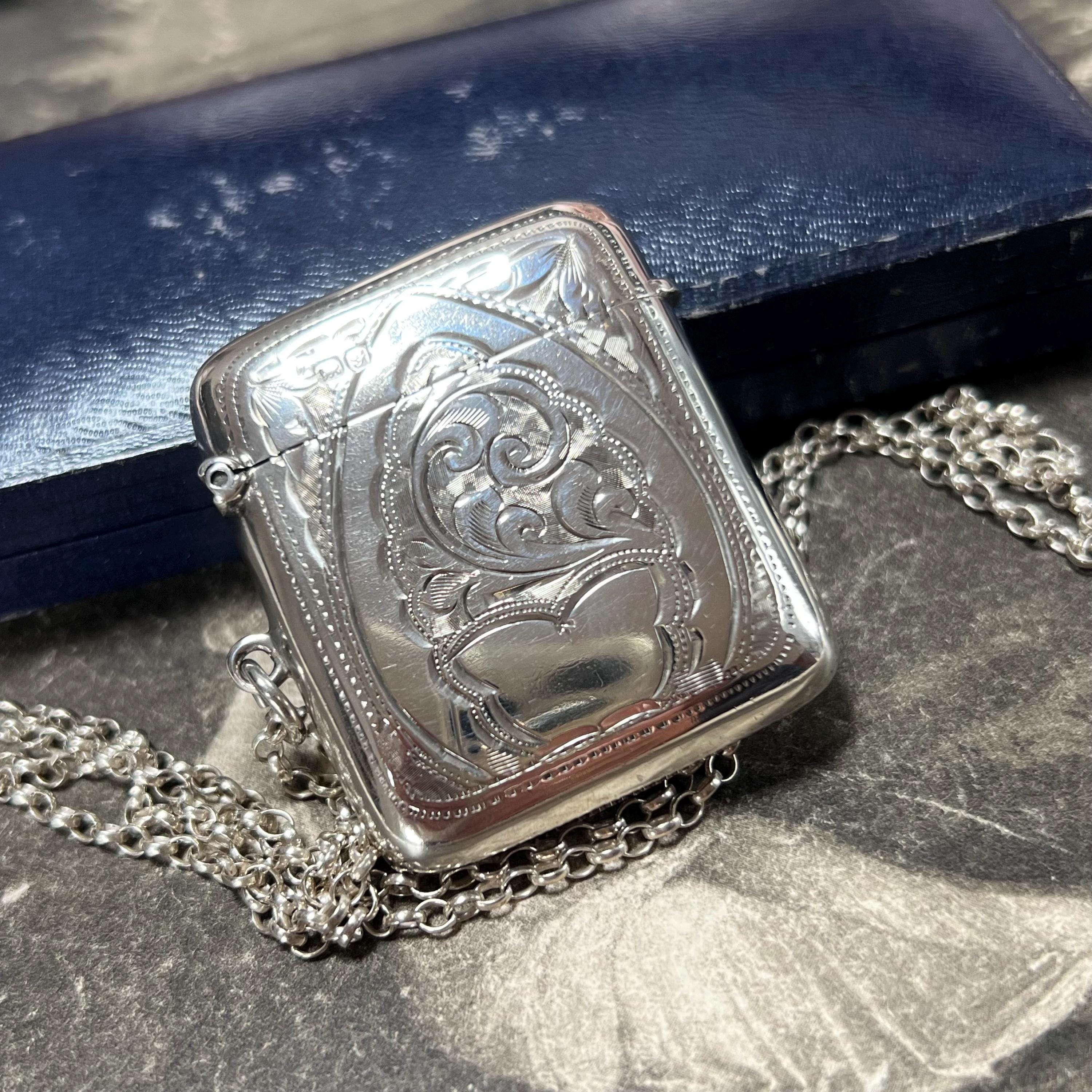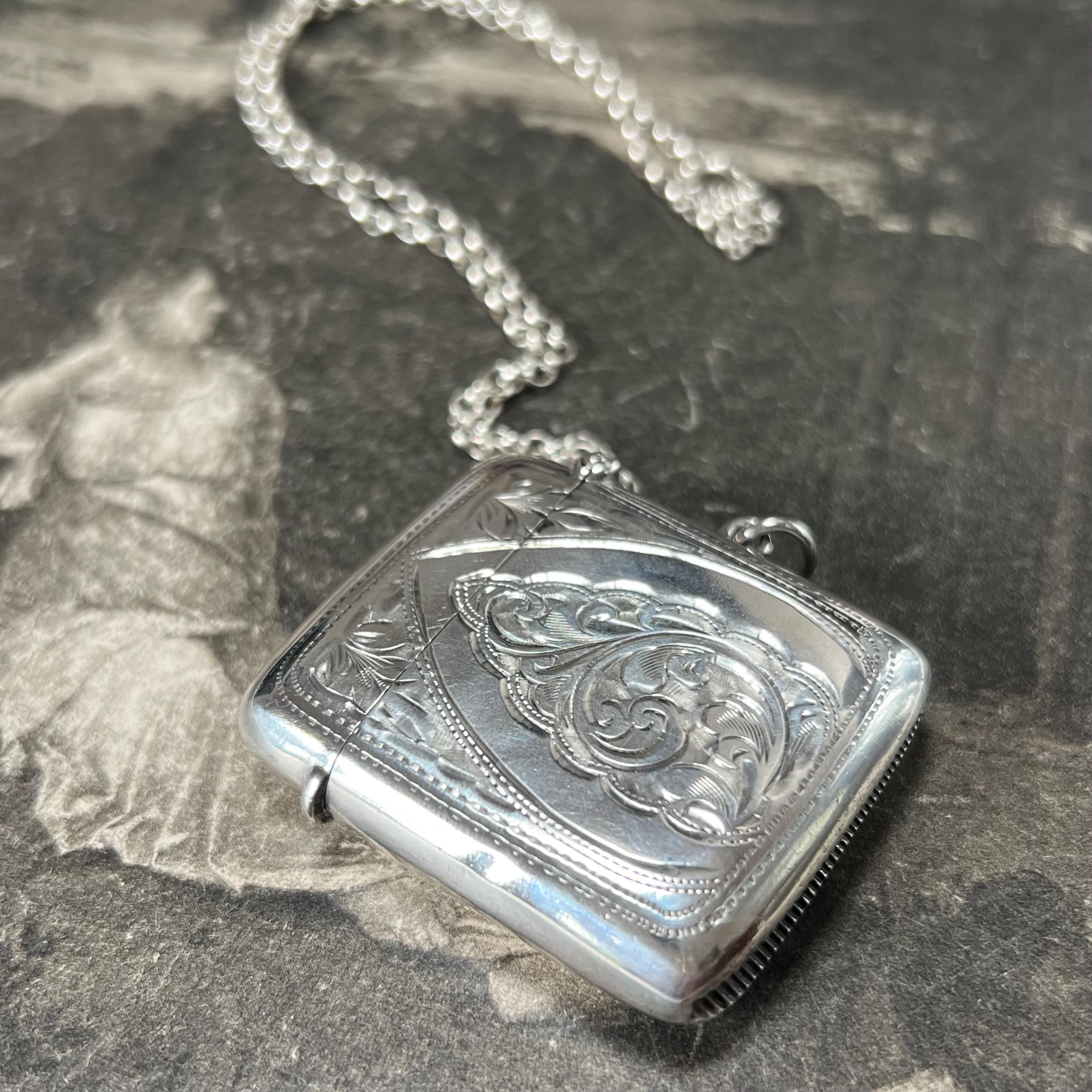 This vesta locket also comes with a vintage 20” silver belcher style chain stamped ‘sterling’ to the bolt ring, bringing the combined weight of case and chain to a generous 29.7 grams. This wonderful case has been restored and is in outstanding condition for a piece of its era and will come in a new eco-friendly box ready for gifting.