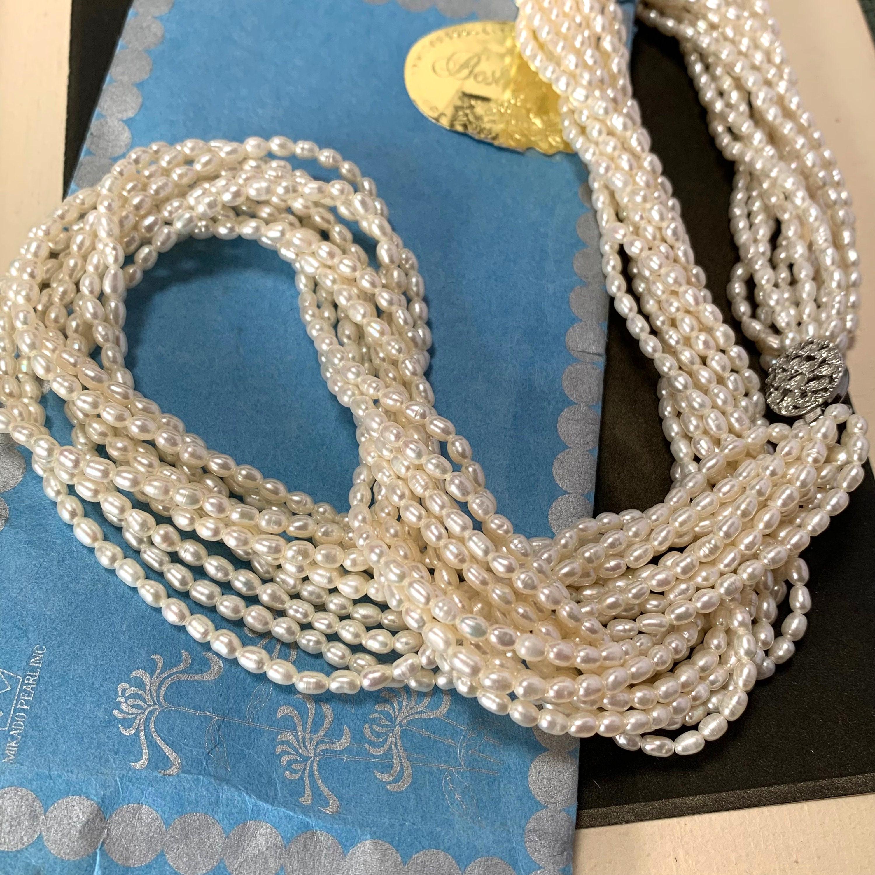 Fabulous vintage multi-strand freshwater pearl necklace with a silver metal clasp. The necklace was made by Mikado Pearls Inc, based in Tokyo, Japan, and dates back to the 1960s. It's also later known as Toshi Pearls. The pearls are in immaculate and unworn condition, making this necklace a remarkable find. The original retail packaging adds to its authenticity and historical significance.