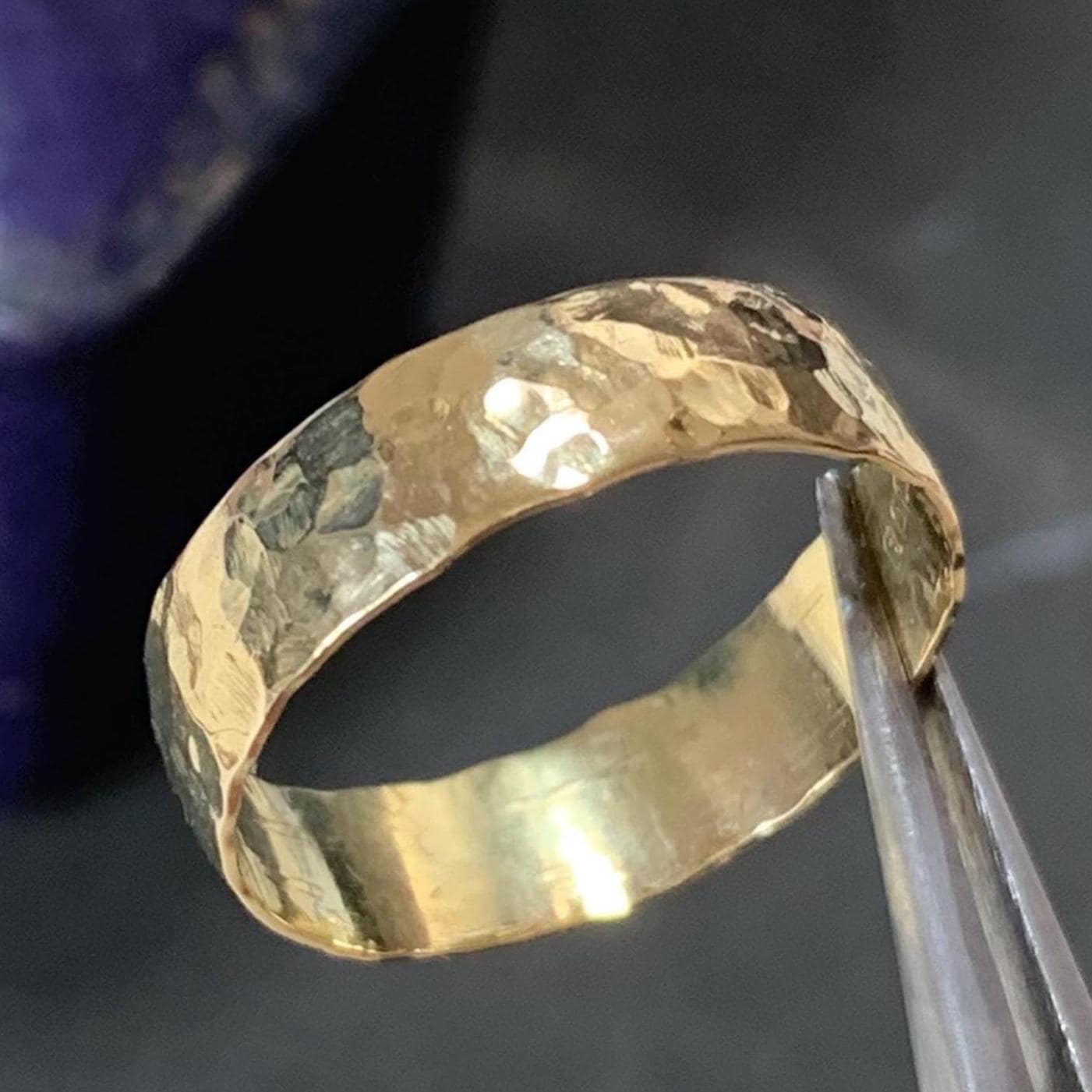 Vintage solid 18k yellow gold wedding ring. 2.6 grams band with English Hallmark dates 1991, hand finished with hammered detail, 5 mm wide, rustic retro band. Stamped to the inside B Bros, 750 denoting 18k purity, hallmarked for London and a date letter for 1991.