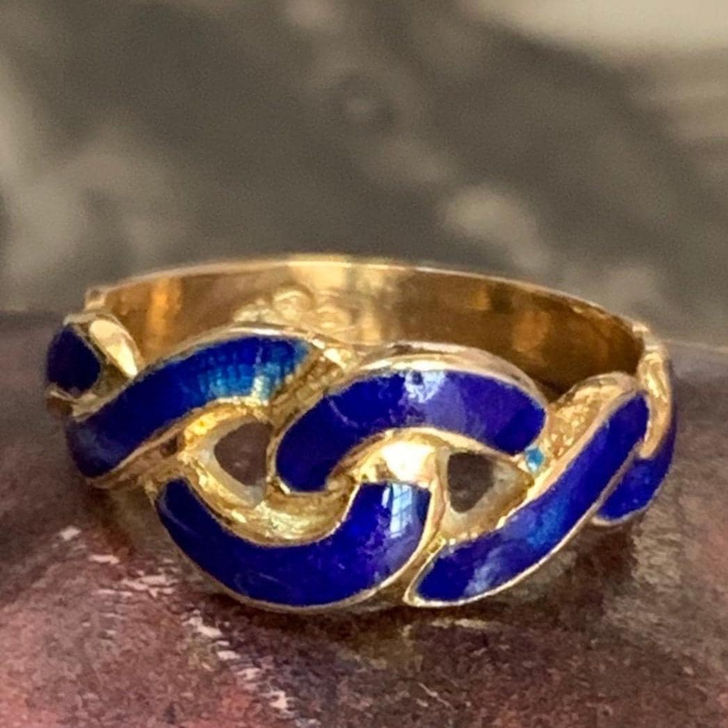 18ct yellow gold blue enamel ring, crafted by Bonauguri Lucio in 1962 at Fabor Gold Workings in Arezzo, Italy (Fabour Lavorazione Ofra), 750 stamp and makers mark to inner shank. Its rich history is evident through its design, which served as a precursor to the iconic rings that emerged in the 80s and 90s. Drawing inspiration from early Victorian Enamel Rings, this piece carries a distinct character. While displaying some signs of enamel loss in select areas, the ring maintains an overall remarkable condition. Its weighty presence on the finger adds to the delightful sensation of wearing it. The ring will be thoughtfully packaged in a ring box for its safekeeping.
