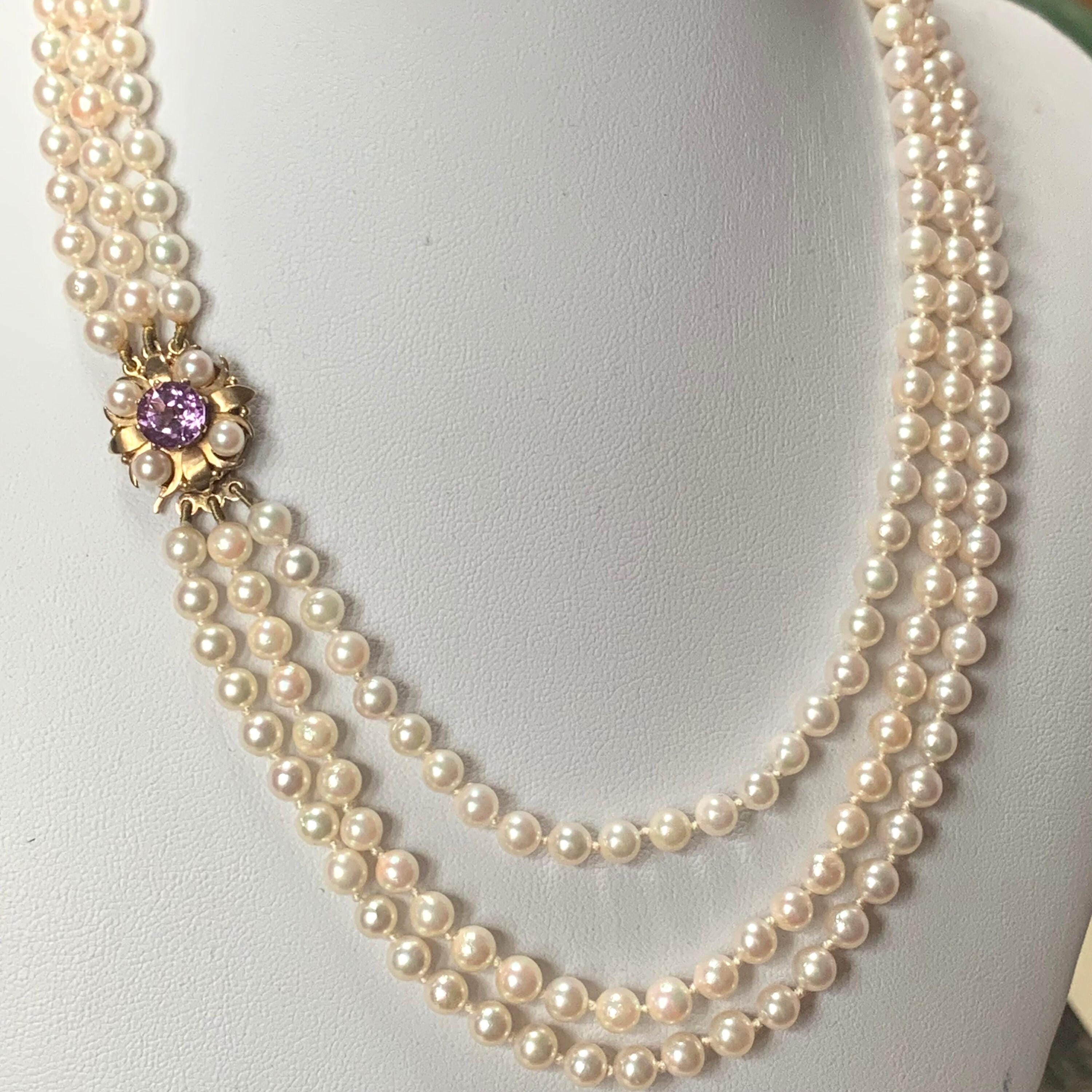 Vintage originally retailed by the London Pearl Company in 1988 with a total of 207 x 4.5mm size pearls throughout the necklace. The clasp is hallmarked and has a central amethyst that is 7mm in diameter with 4 x additionally set pearls. Triple row cultured pearl necklace with a 9ct gold pearl and amethyst set clasp, by the London Pearl Company. A very beautiful vintage saltwater cultured pearl necklace that has three graduated rows of uniform pearls that have been individually hand knotted to silk. The necklace is high neck choker style and would look stunning as a wedding necklace that could be worn and cherished afterwards for many years to come. In outstanding condition albeit with some light surface marks to the rear of the clasp.