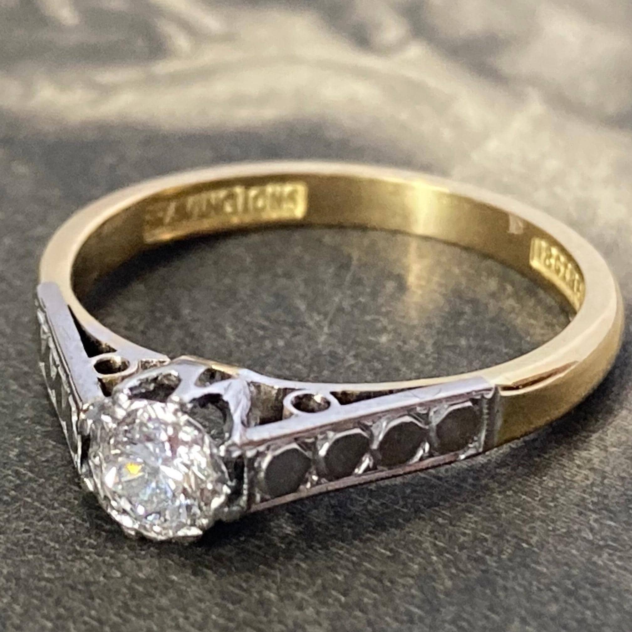 Vintage Diamond Ring in 18ct gold and platinum. Made by Bravingtons , London. 0.20ct diamond VS1. Ring size K, size 5 1/8 US. 3 grams in weight and cleaned and polished. Gift wrapped and free delivery. Crafted in the early 20th century, this antique engagement solitaire has been meticulously maintained and is now in great conditio. Its design captures the essence of the Art Deco era, known for its geometric patterns and bold yet elegant aesthetics.