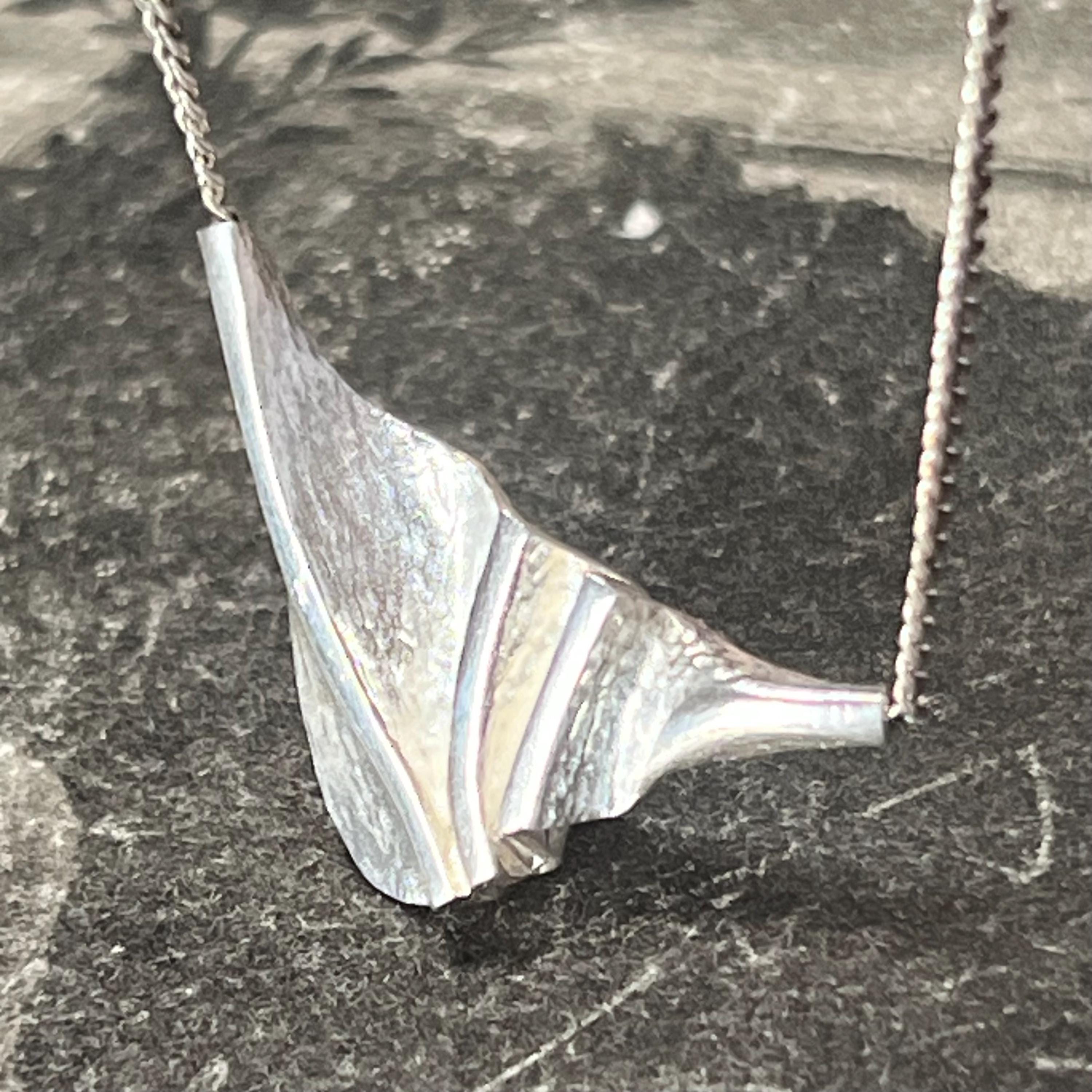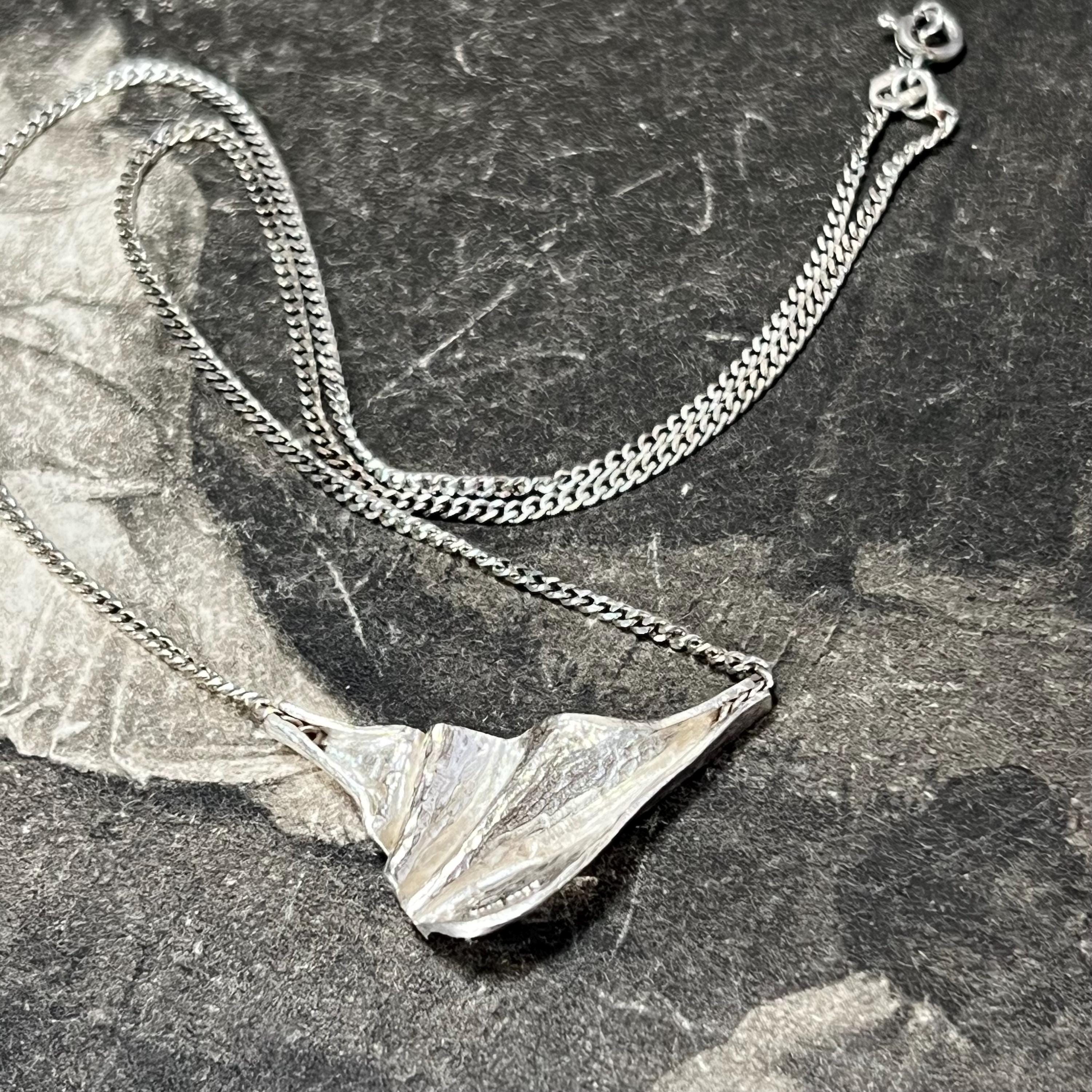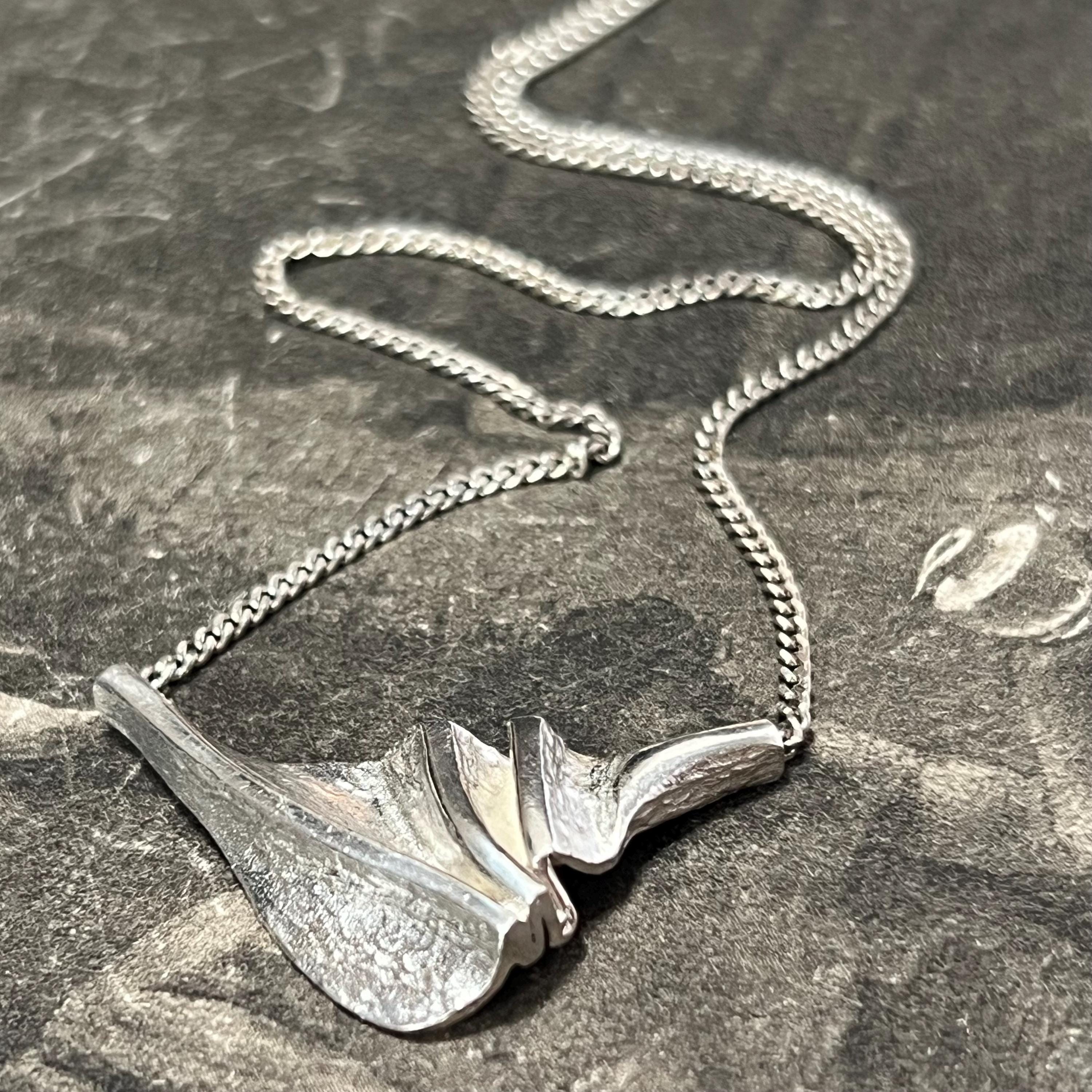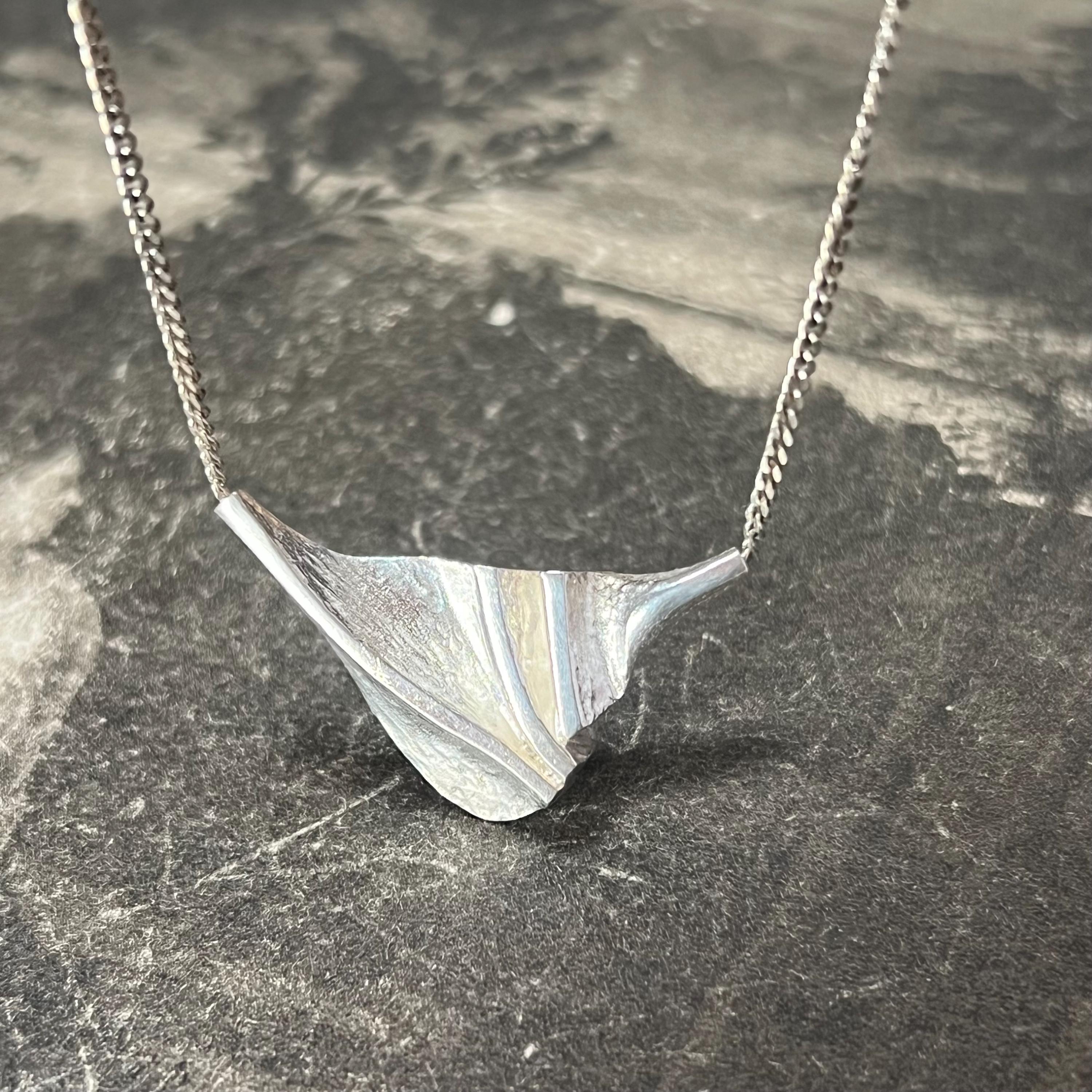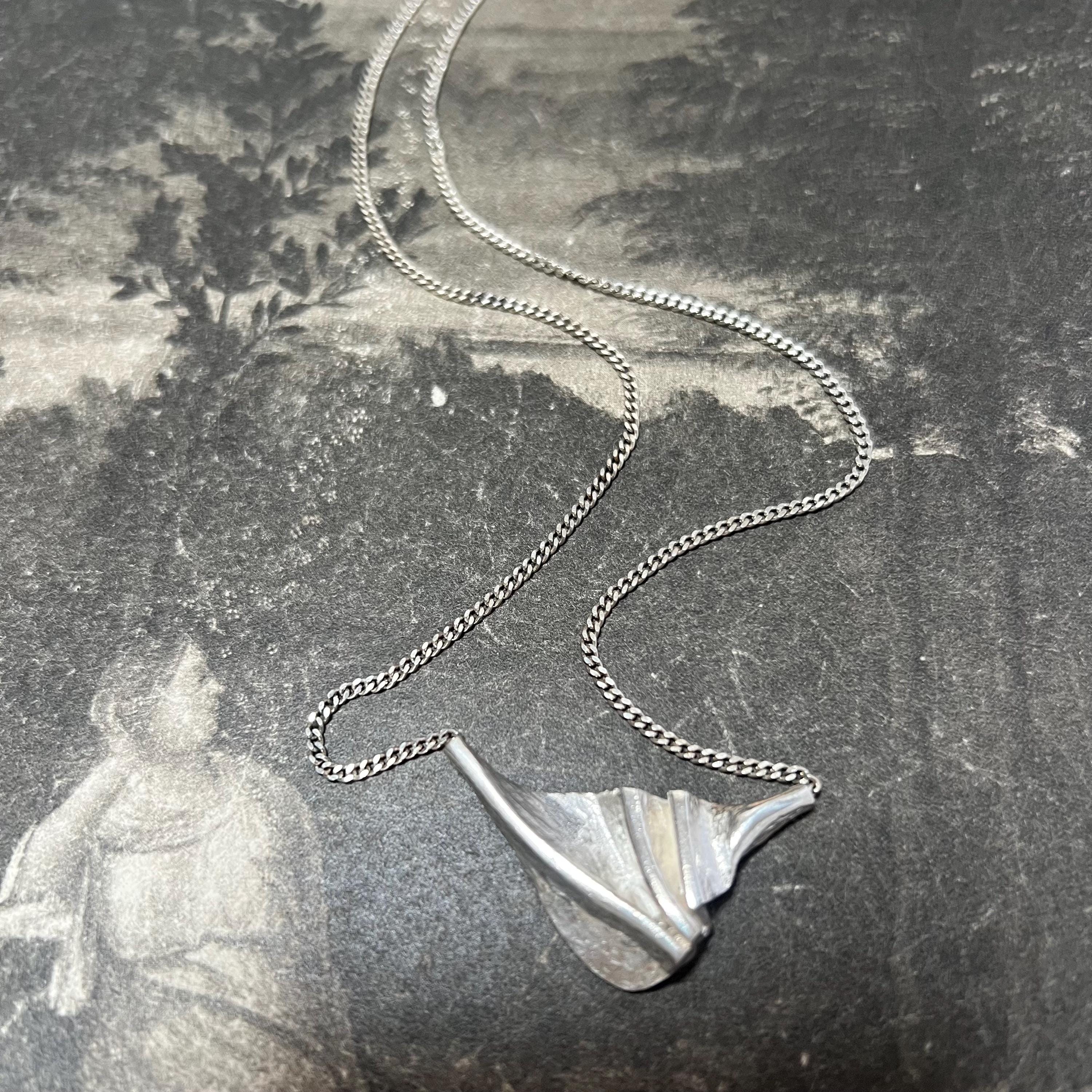 Niels Erik From Denmark silver fold designed necklace with integrated 925 chain. The centre of the pendant is stamped ‘FROM’ & ‘925S' denoting its sterling silver composition. The central panel measures 33 mm long by 17 mm wide and is stamped to the rear with the maker's marks as above. The pendant has an attached fine flat curb link chain that measures 41 cm ( 20.5 cm to each side), the end tag to the chain is stamped LUND, 925. Circa 1960s - Upon 10x magnification there is evidence of a tiny historic repair to the chain which is not apparent to the naked eye, otherwise the pendant is in good vintage condition for a piece of its era.