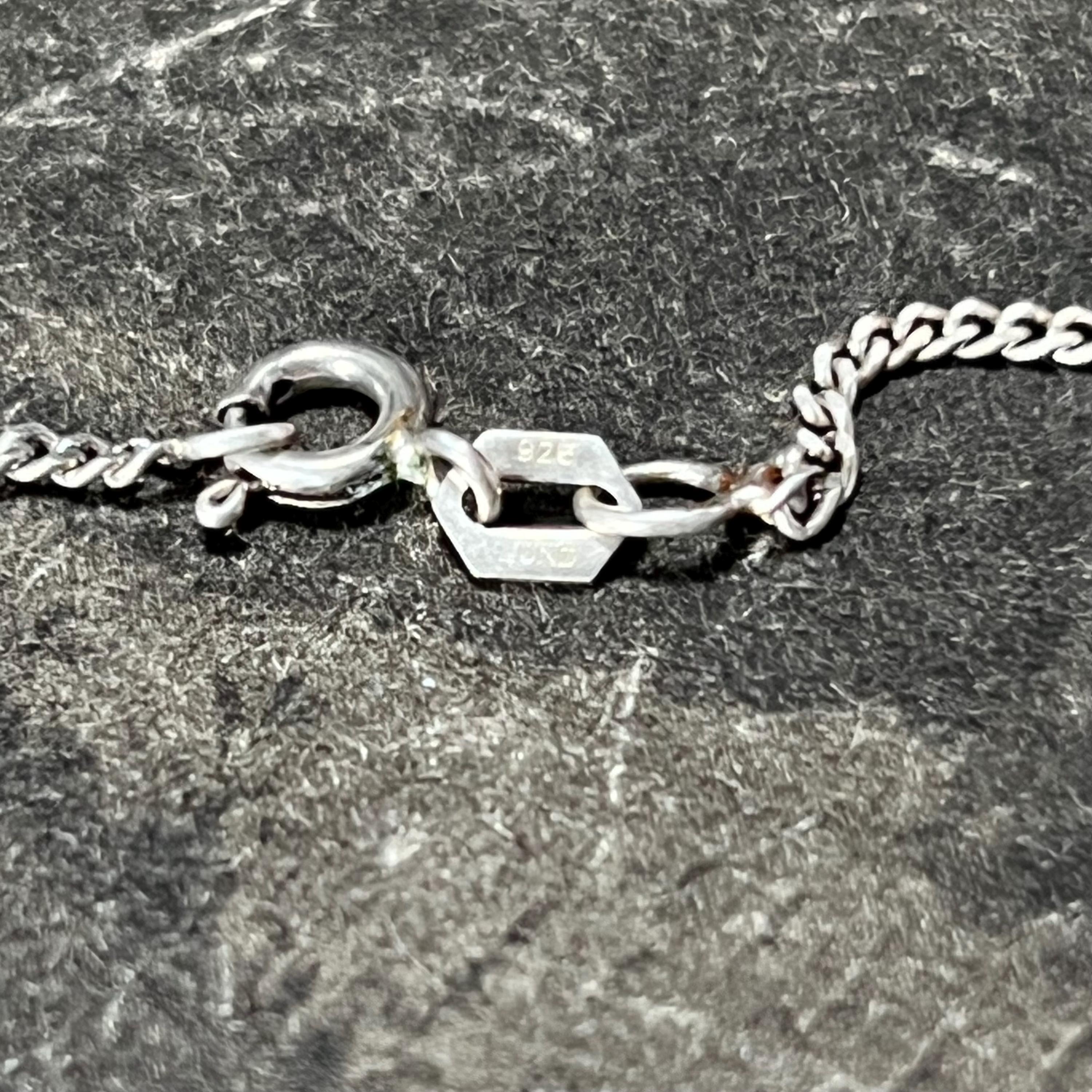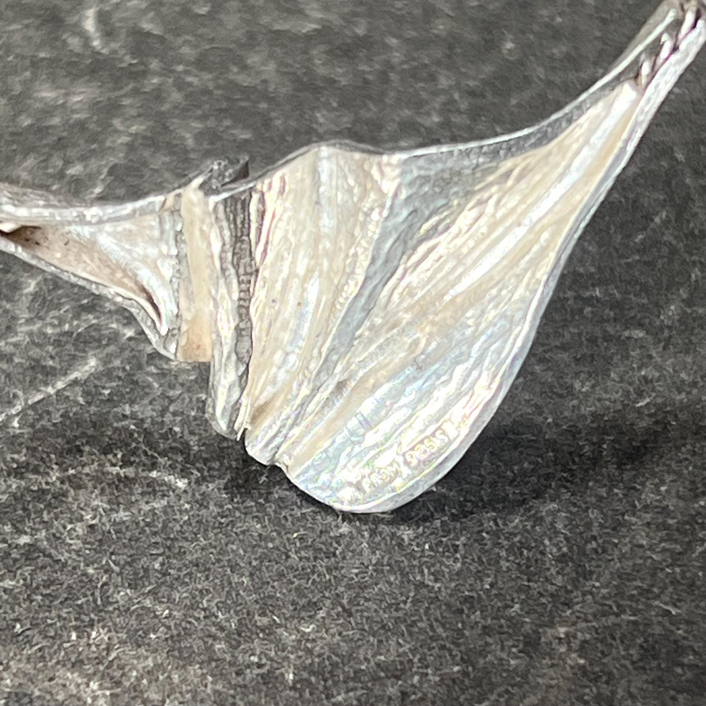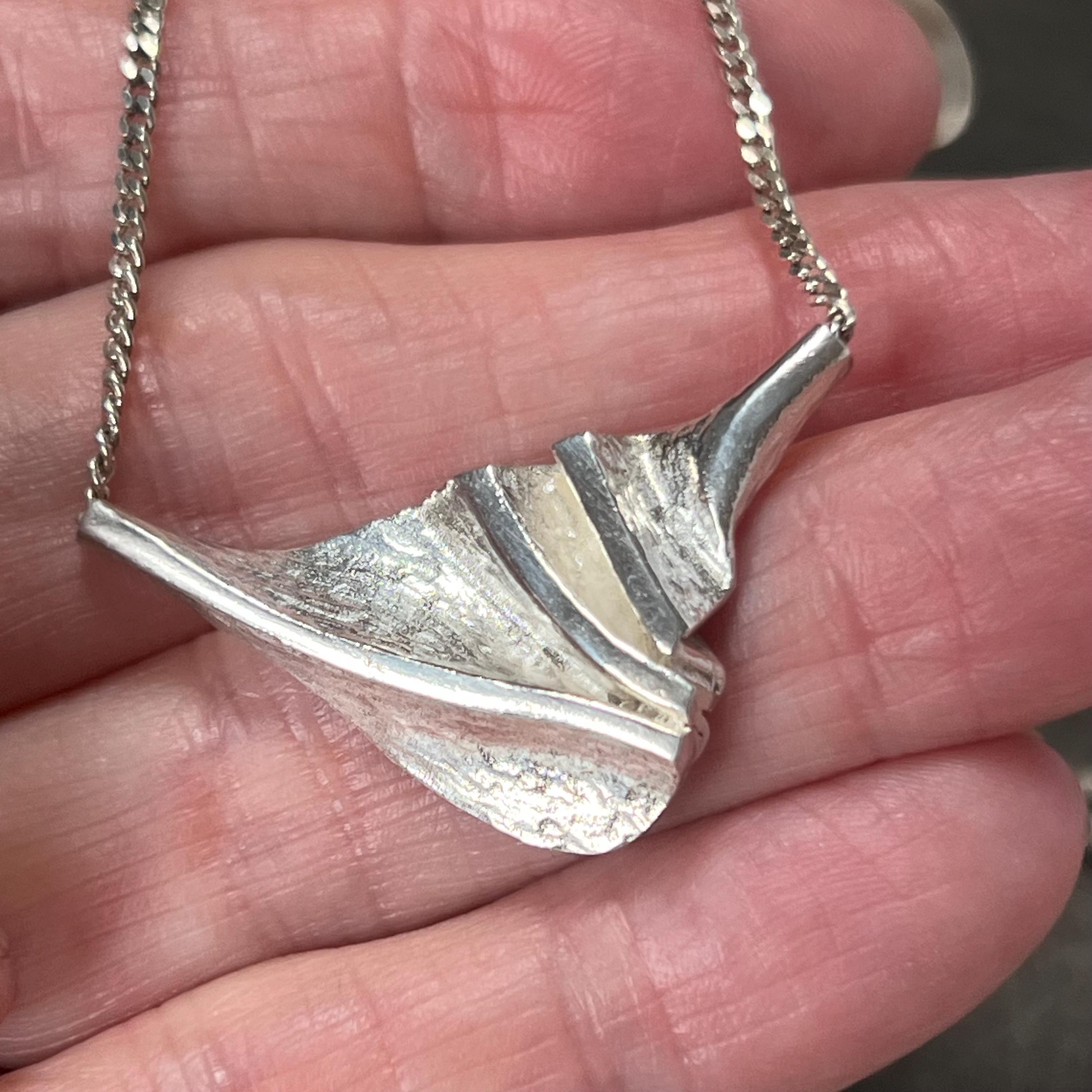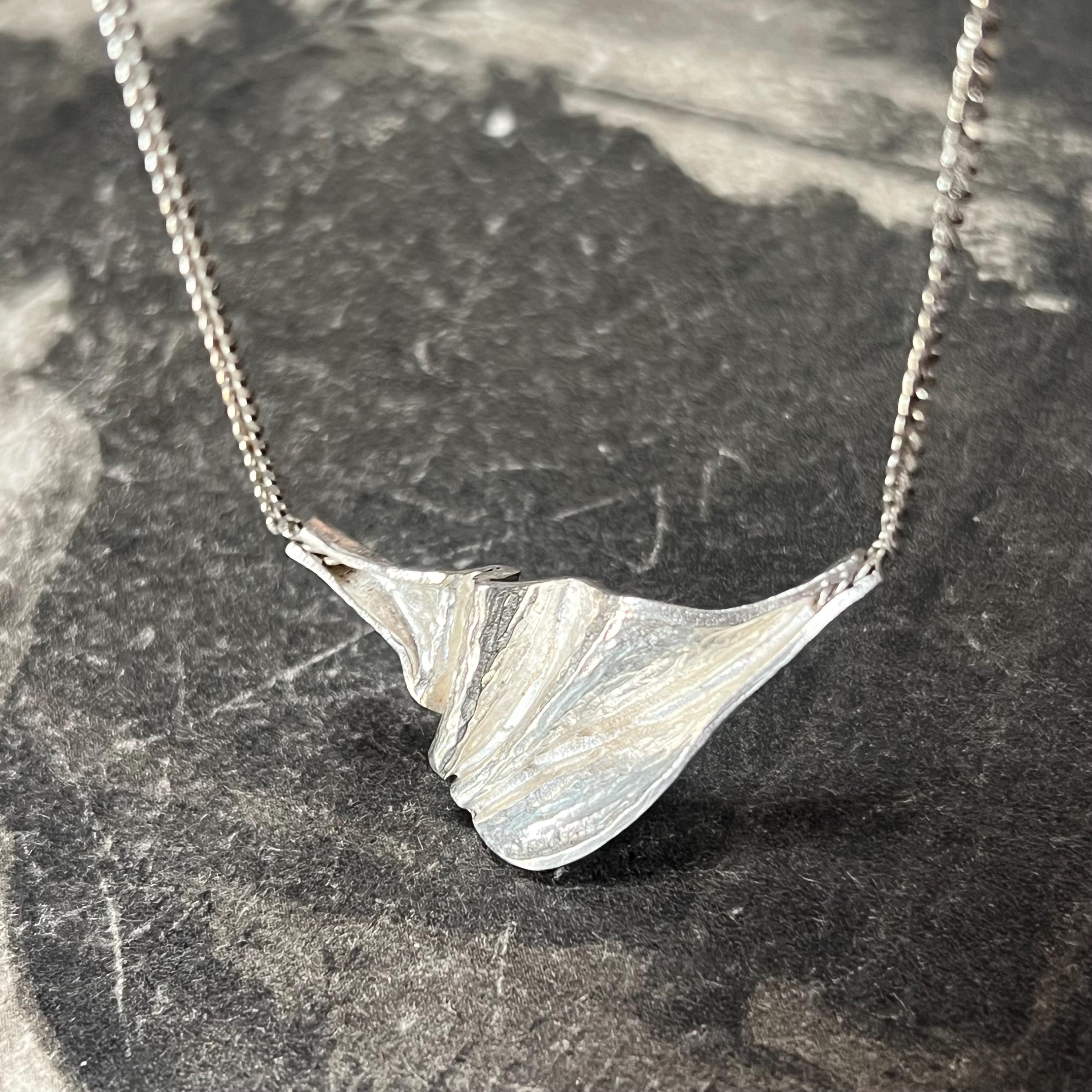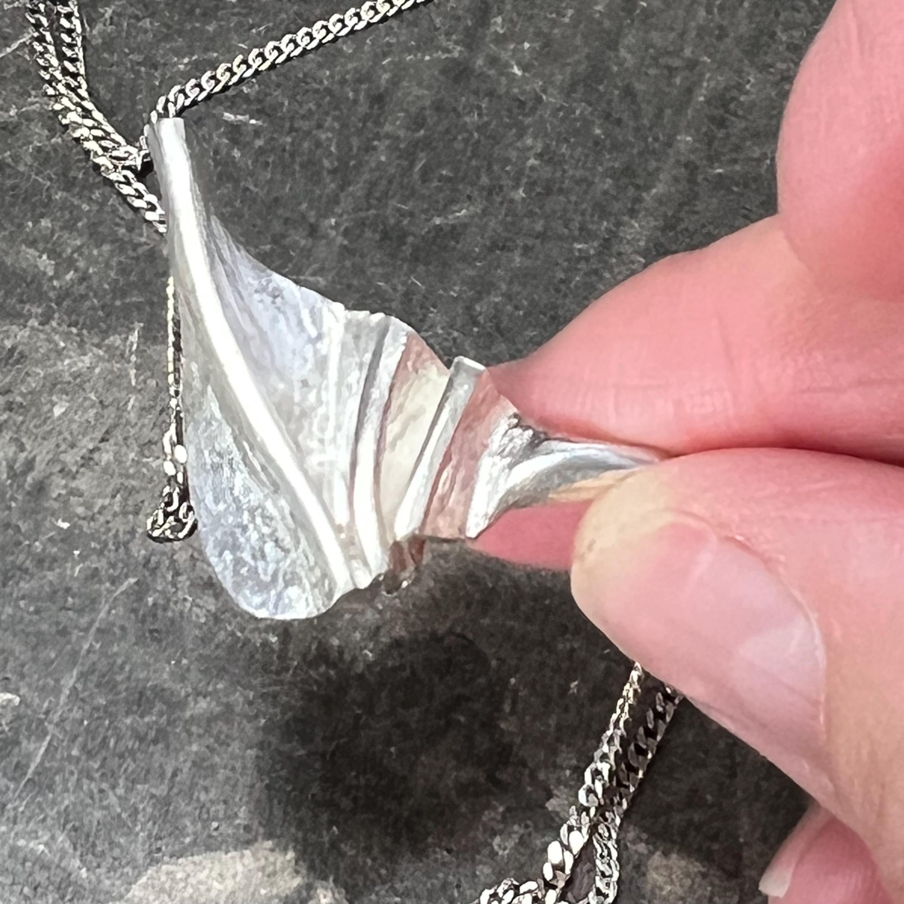 Niels Erik From Denmark silver fold designed necklace with integrated 925 chain. The centre of the pendant is stamped ‘FROM’ & ‘925S' denoting its sterling silver composition. The central panel measures 33 mm long by 17 mm wide and is stamped to the rear with the maker's marks as above. The pendant has an attached fine flat curb link chain that measures 41 cm ( 20.5 cm to each side), the end tag to the chain is stamped LUND, 925. Circa 1960s - Upon 10x magnification there is evidence of a tiny historic repair to the chain which is not apparent to the naked eye, otherwise the pendant is in good vintage condition for a piece of its era.