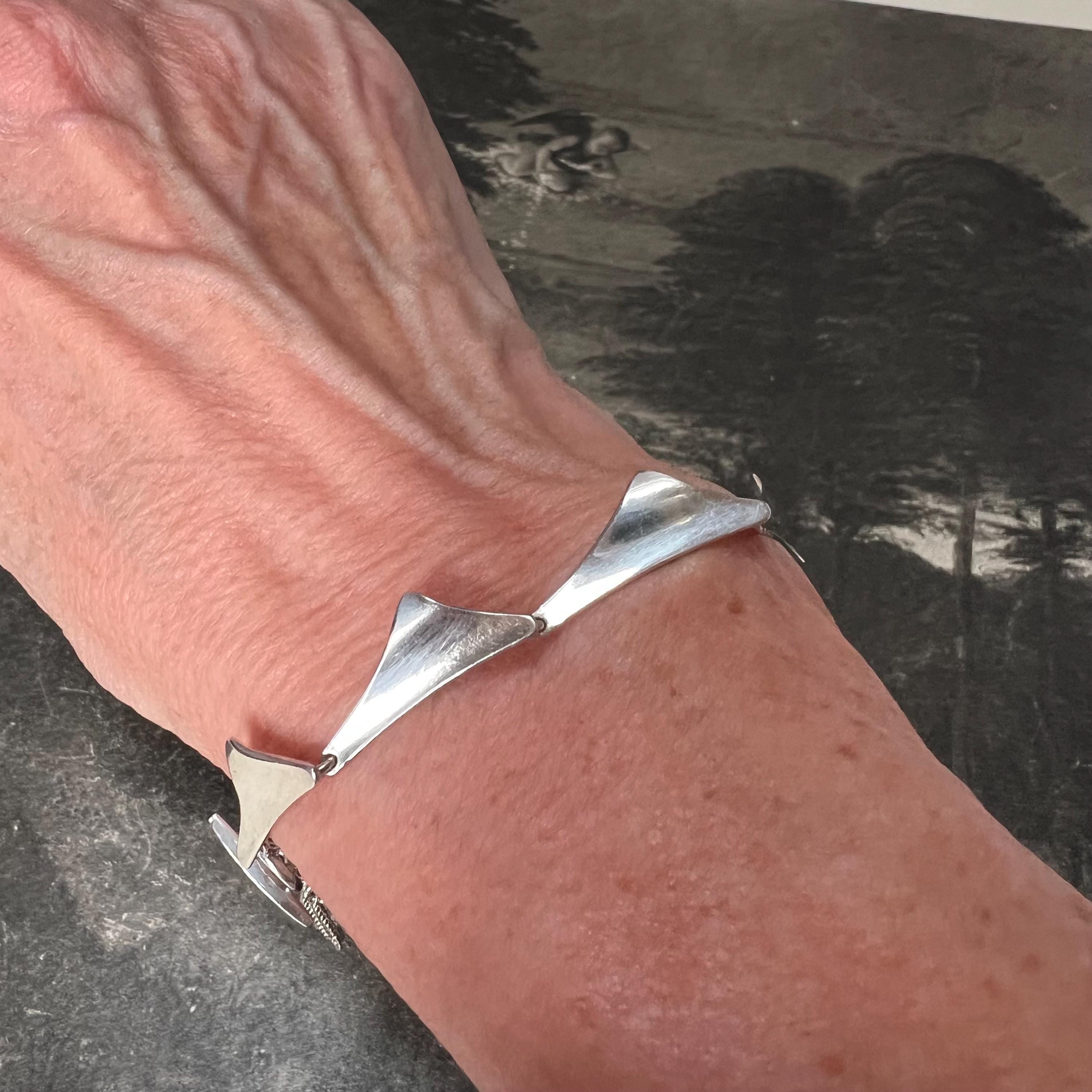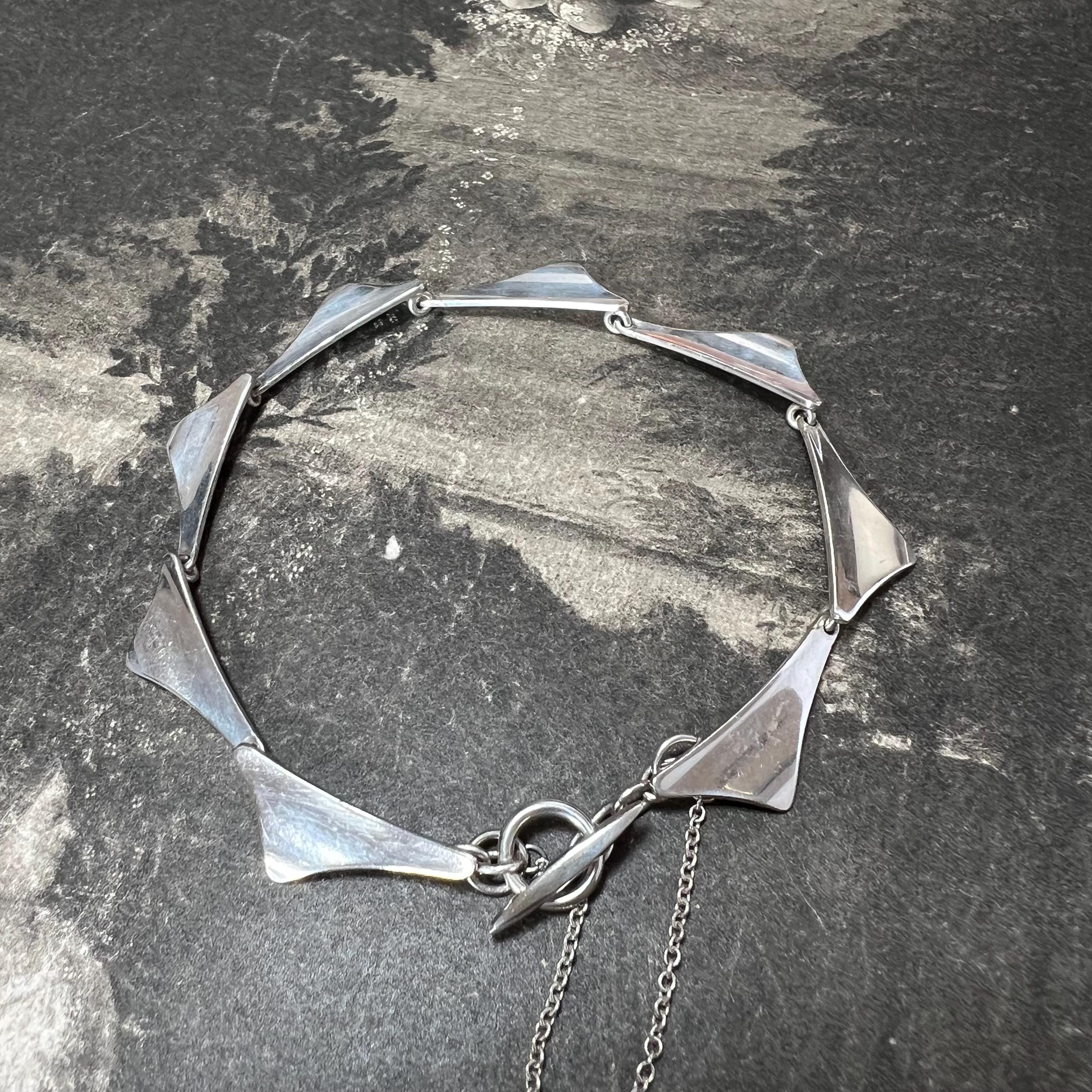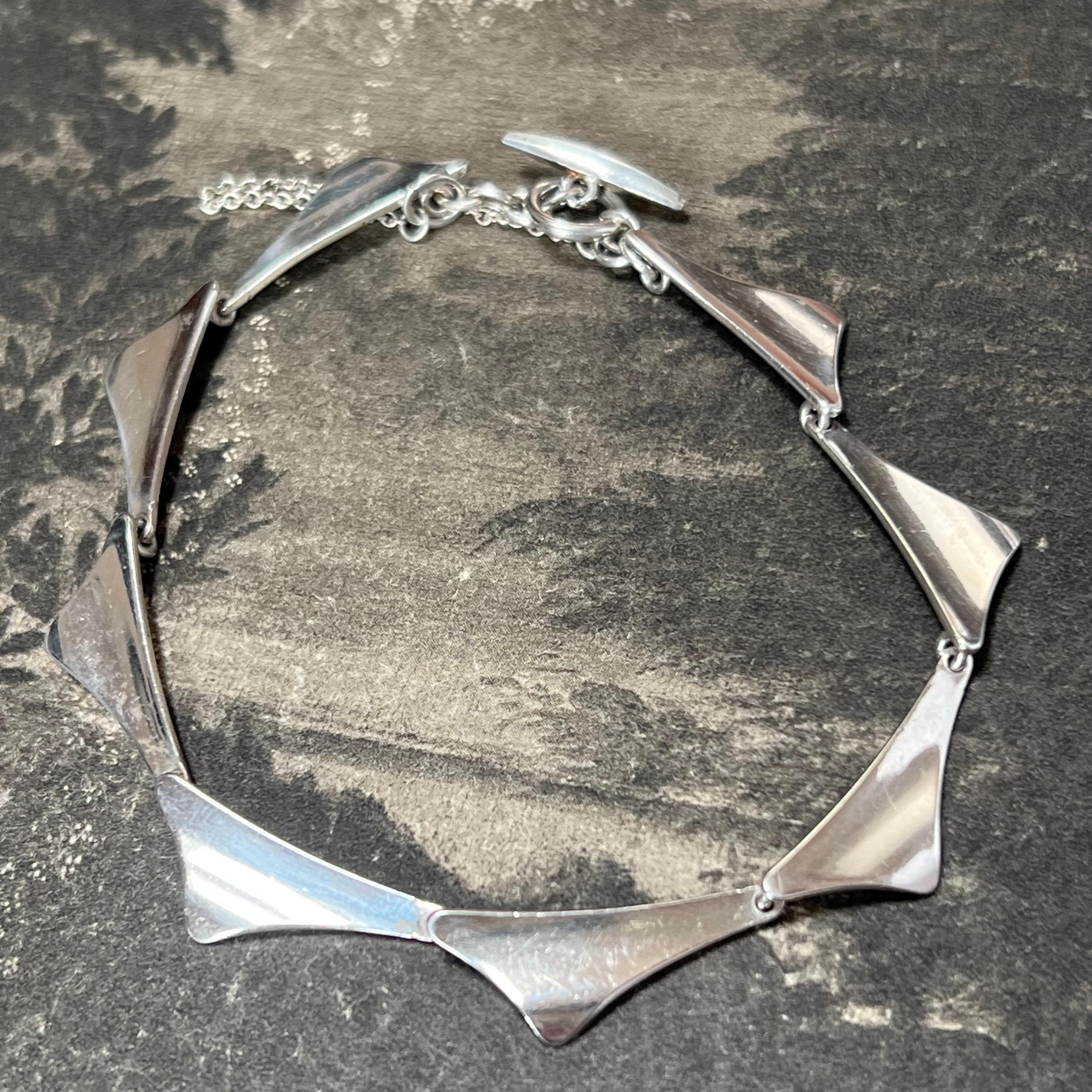 Theodor Skat Rordam Silver Wing Bracelet Denmark Circa 1960s. A lovely modernist sterling silver bracelet by the designer Thoedor Skat Rordam - Denmark, consisting of individual sterling silver wing style links with a T style fastener.. The bracelet measures 18.5 cm long and is stamped ‘Sterling 925, TSR and Denmark to its end link.