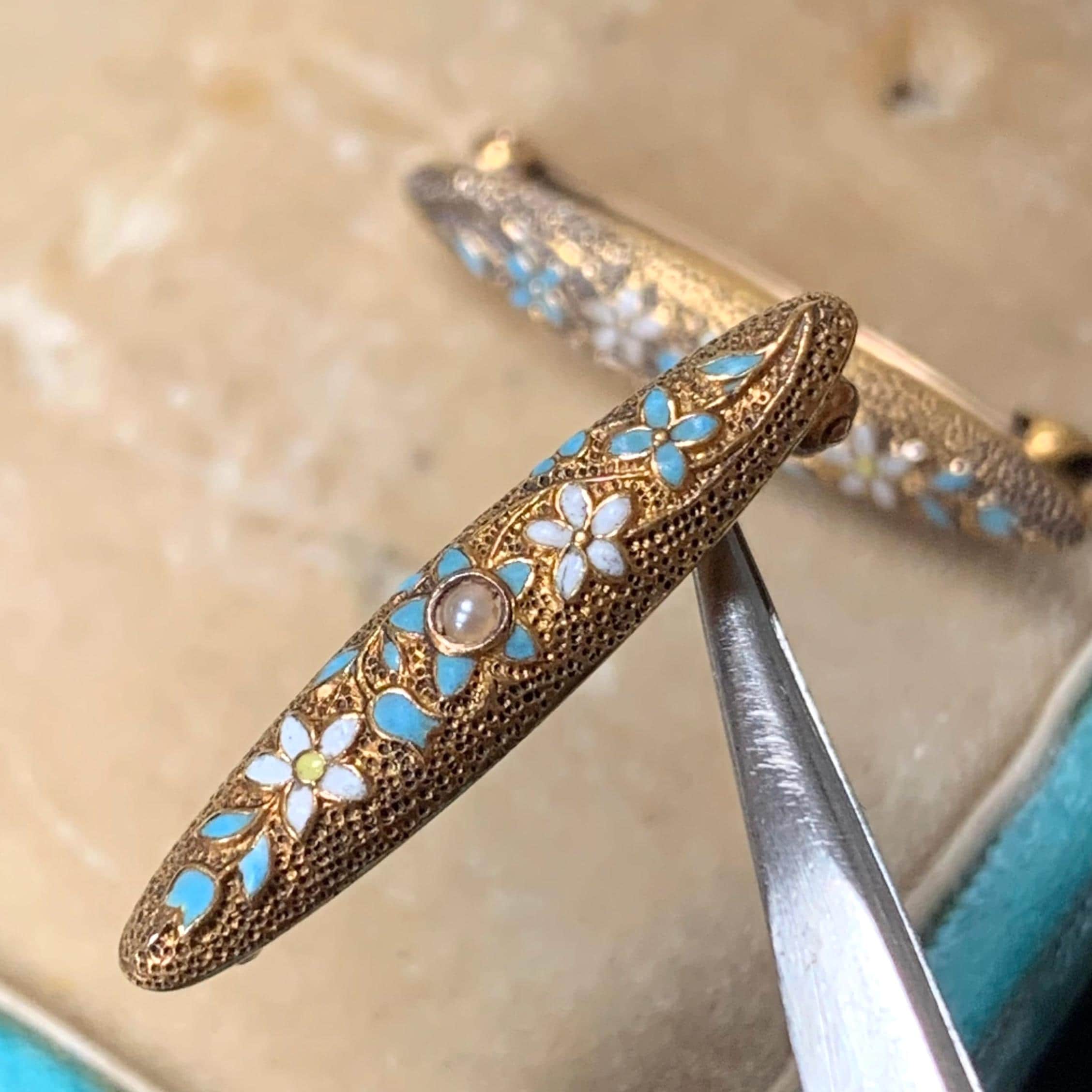 Forget me not dress pins by Bohm Bristol Co San Francisco. Stamped 14K gold cloisonne enamel and pearl petite dress pins in their original box. Art Deco era circa 1920s - 1930s. Stunning detail enameling with white and pale blue forget me not flowers and a tiny natural seed pearl set centre, marked 14K to the fastener end. In amazing condition for a highly rare and collectable piece of jewellery and a matching pair which is even more remarkable. Each pin is a work of art and measures 25mm long x 5mm wide. These are a true marvel of superior craftsmanship and are in excellent antique condition. The antique original box is included.
