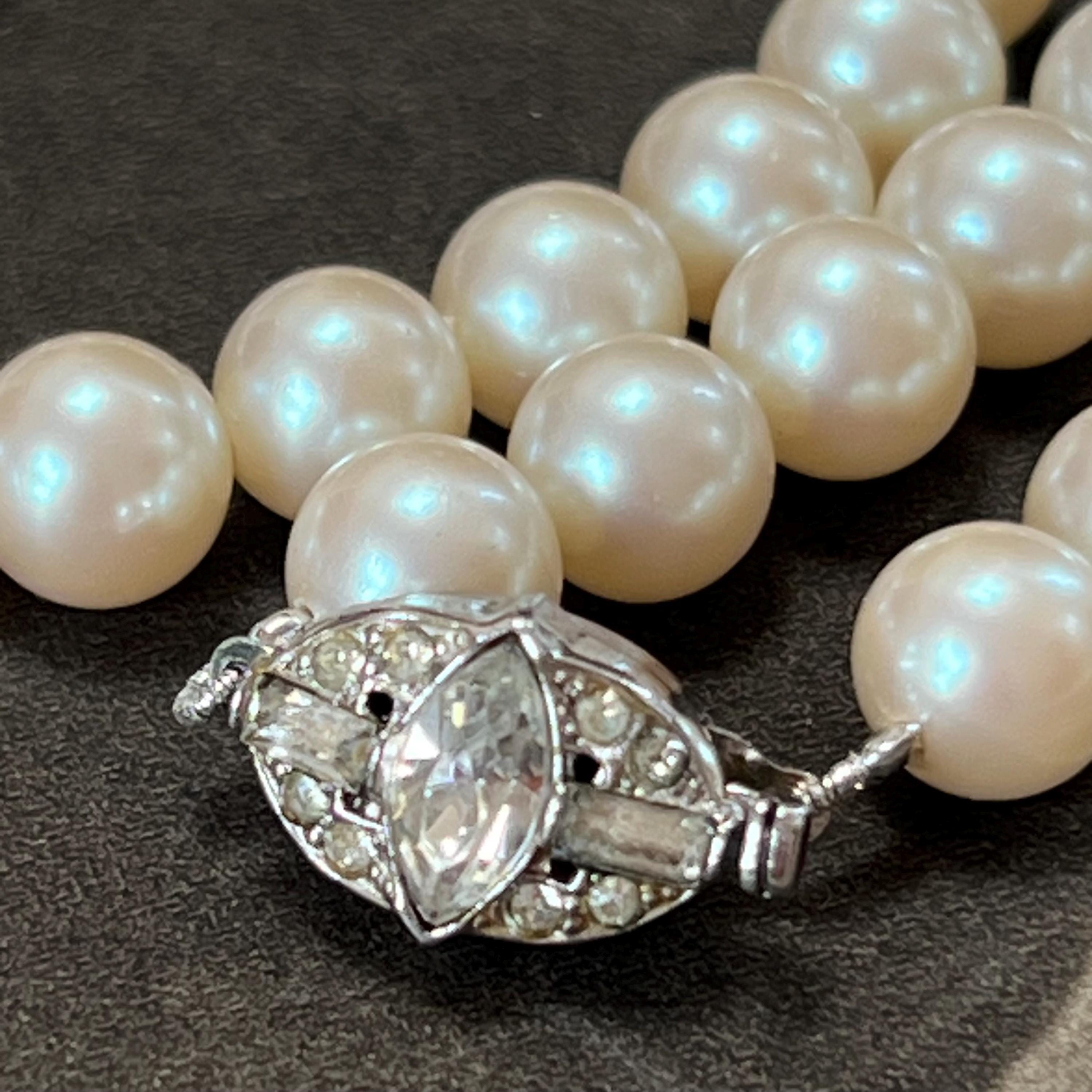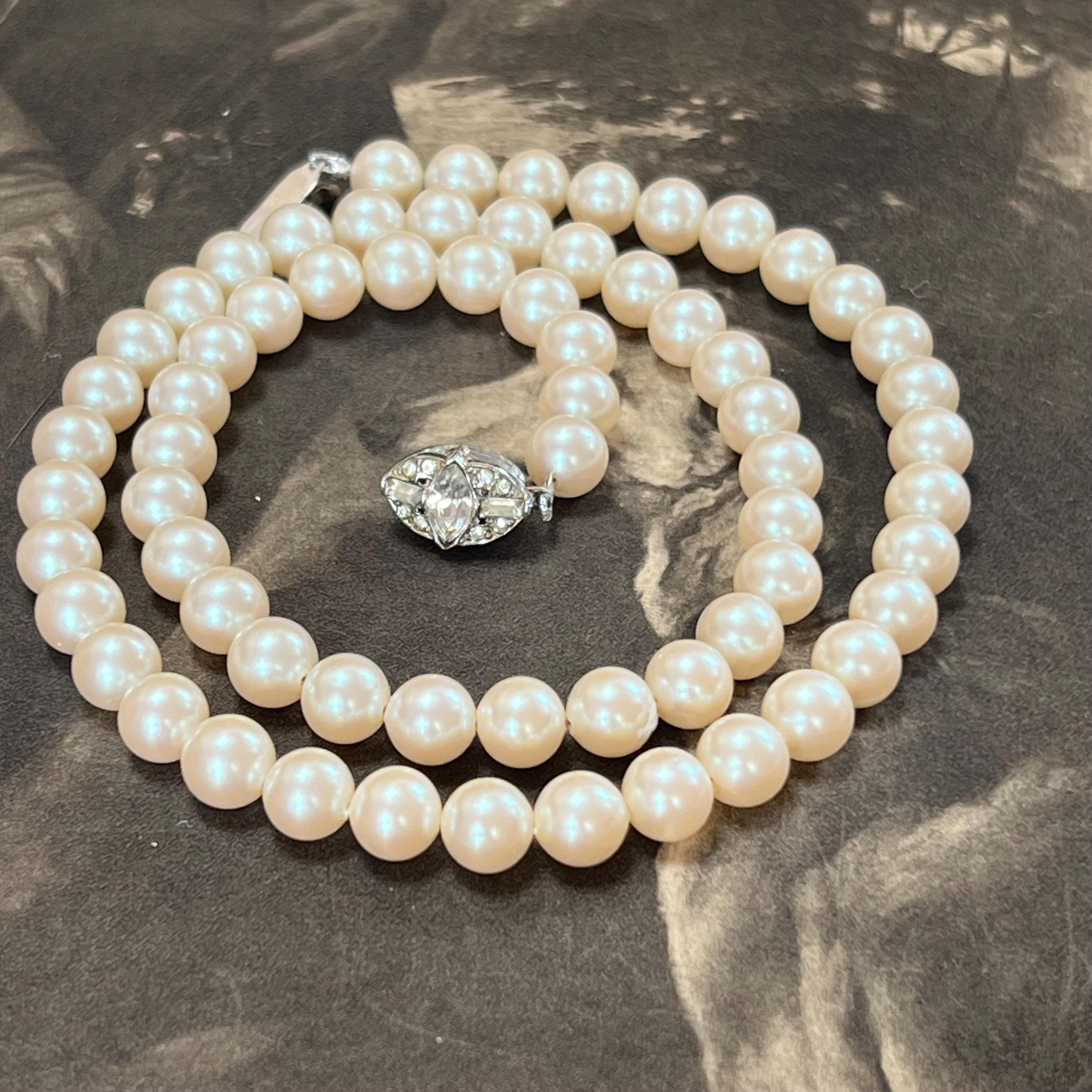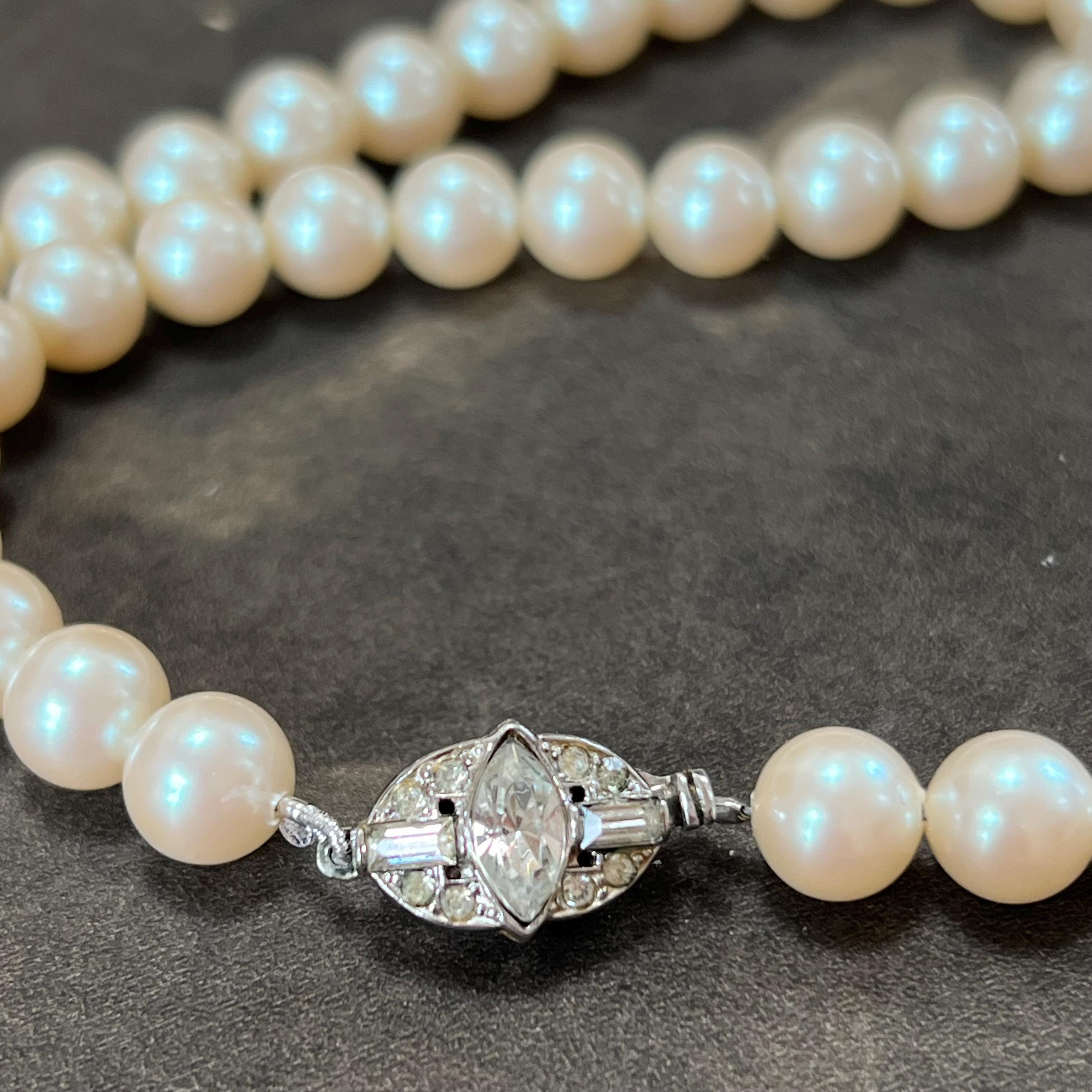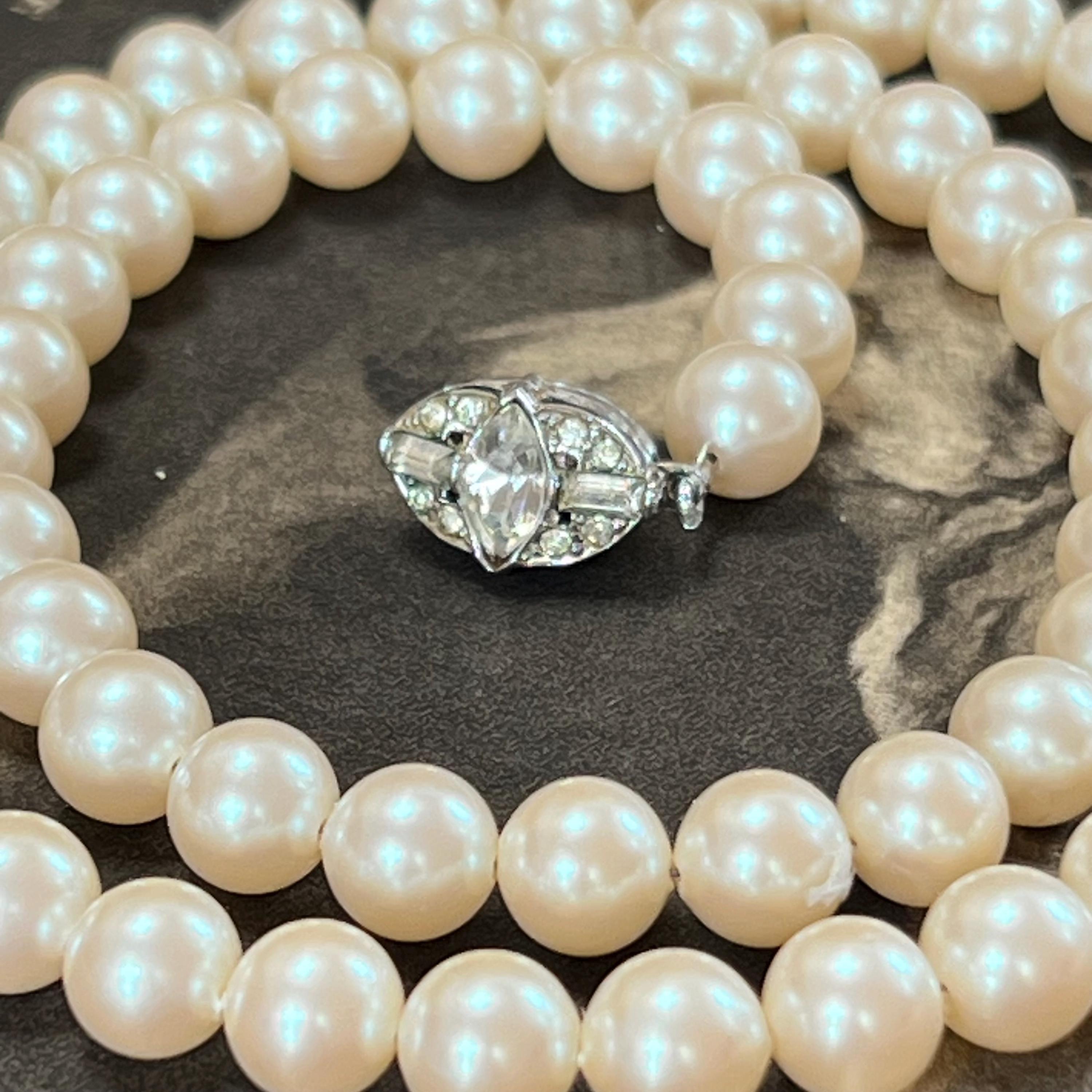 Vintage Trifari faux pearl necklace with pretty paste set clasp. Stamped with the crown ‘Trifari’ (without the copyright symbol) dating it to 1955. Has been cleaned and restored with the pearl beads being 9 mm in size. The silver metal clasp has been set with pretty colourless paste stones (all present). The pearl beads are uniform and the necklace measures 29 inches long (approx. 52 cm), in very good vintage condition having looked like being restring at some point.