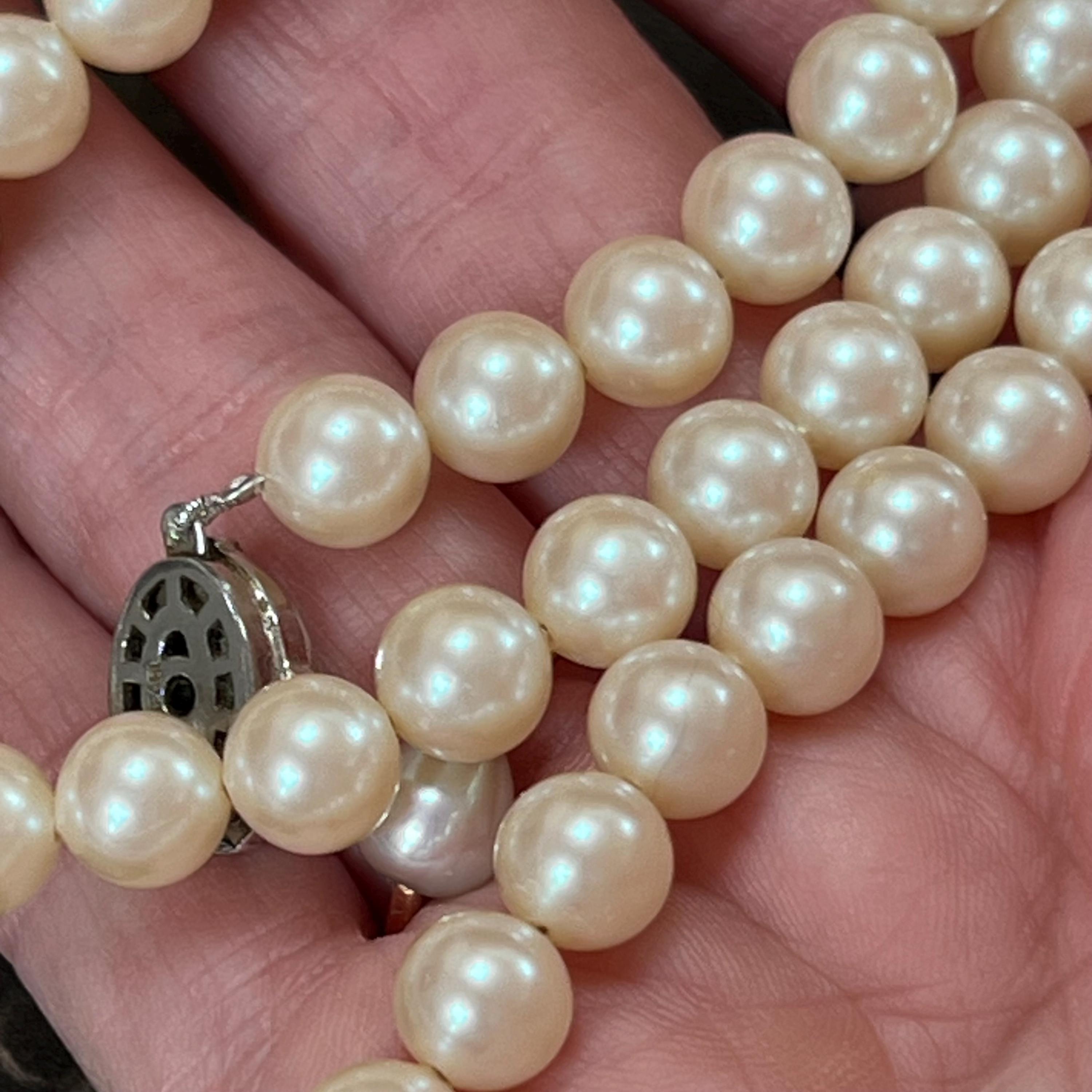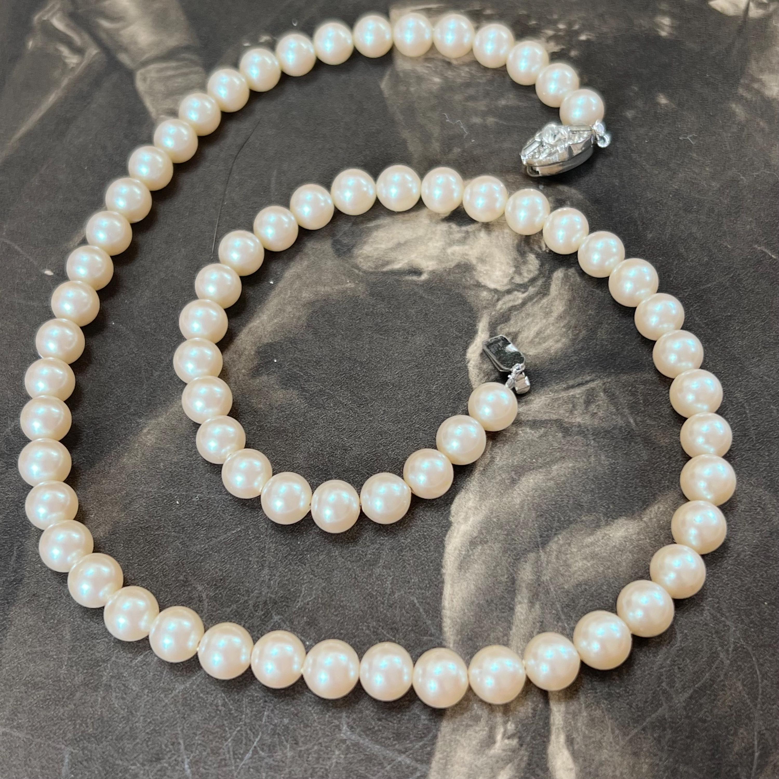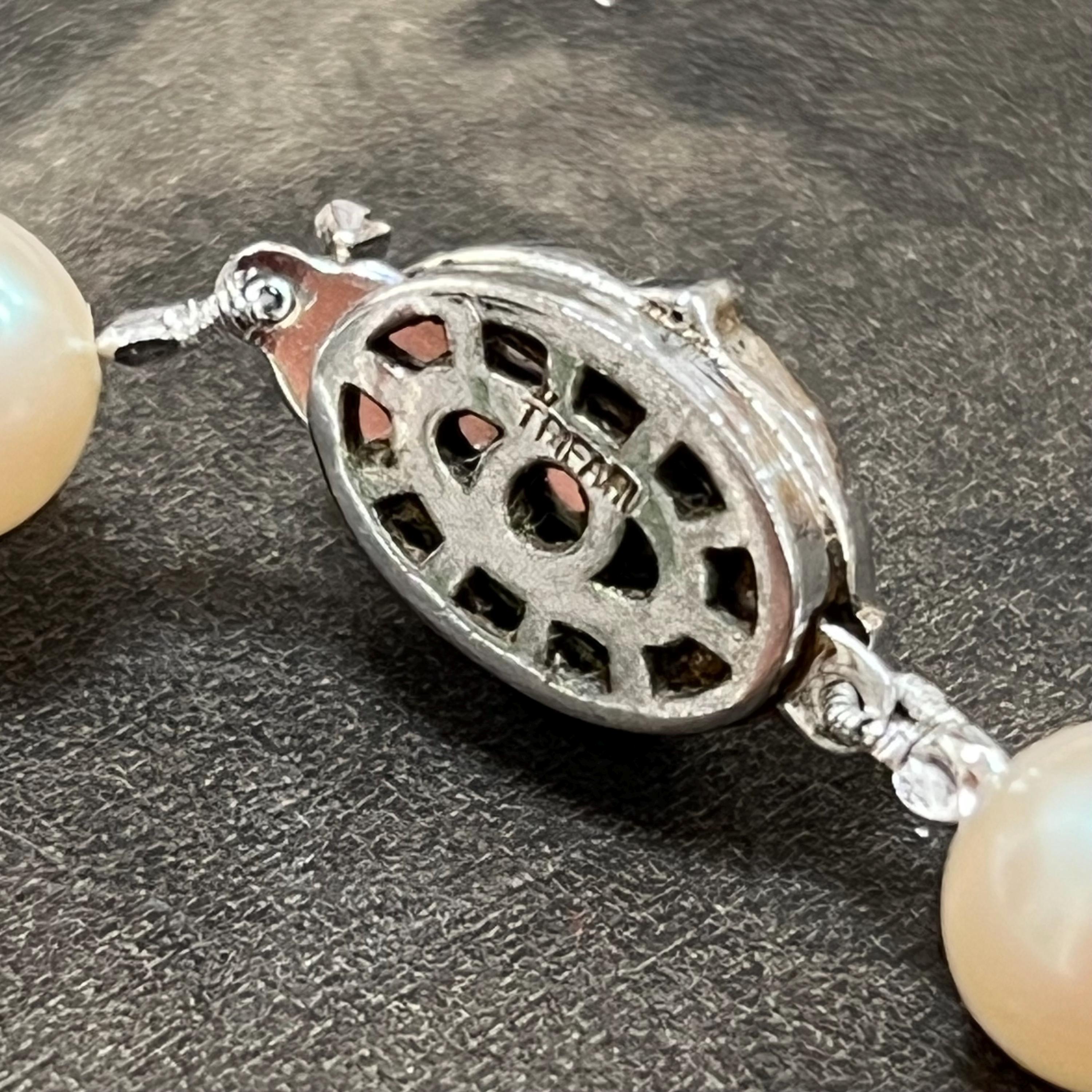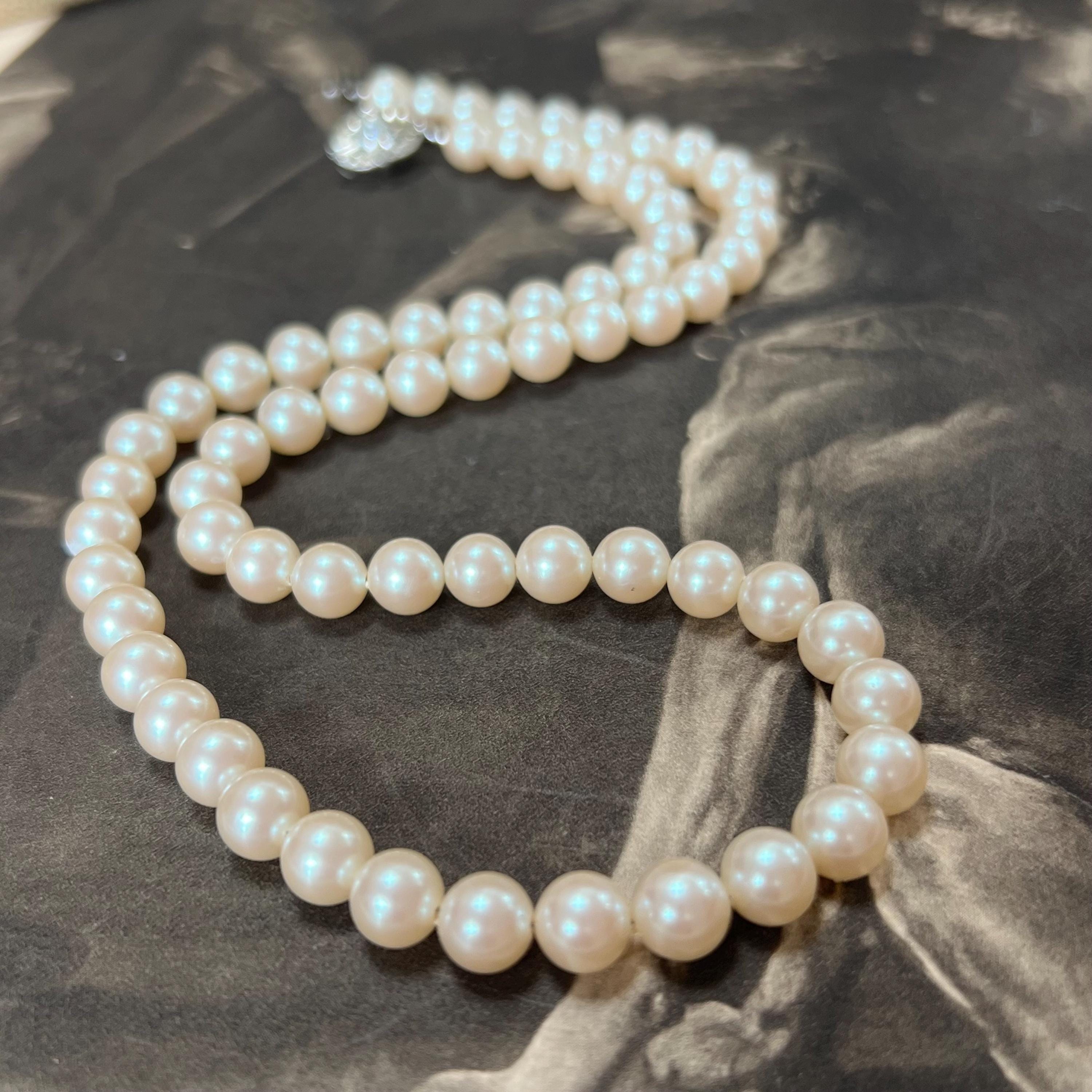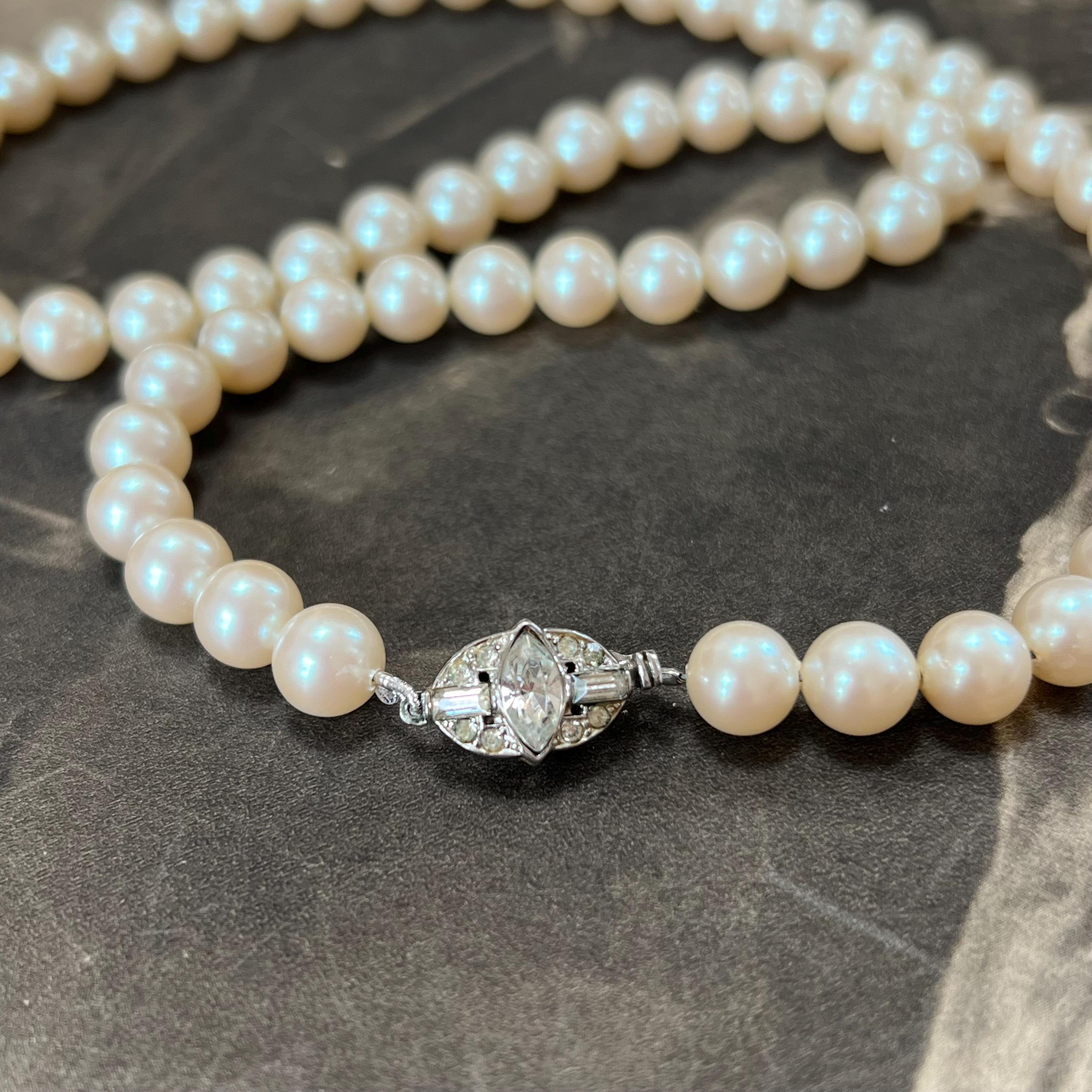 Vintage Trifari faux pearl necklace with pretty paste set clasp. Stamped with the crown ‘Trifari’ (without the copyright symbol) dating it to 1955. Has been cleaned and restored with the pearl beads being 9 mm in size. The silver metal clasp has been set with pretty colourless paste stones (all present). The pearl beads are uniform and the necklace measures 29 inches long (approx. 52 cm), in very good vintage condition having looked like being restring at some point.