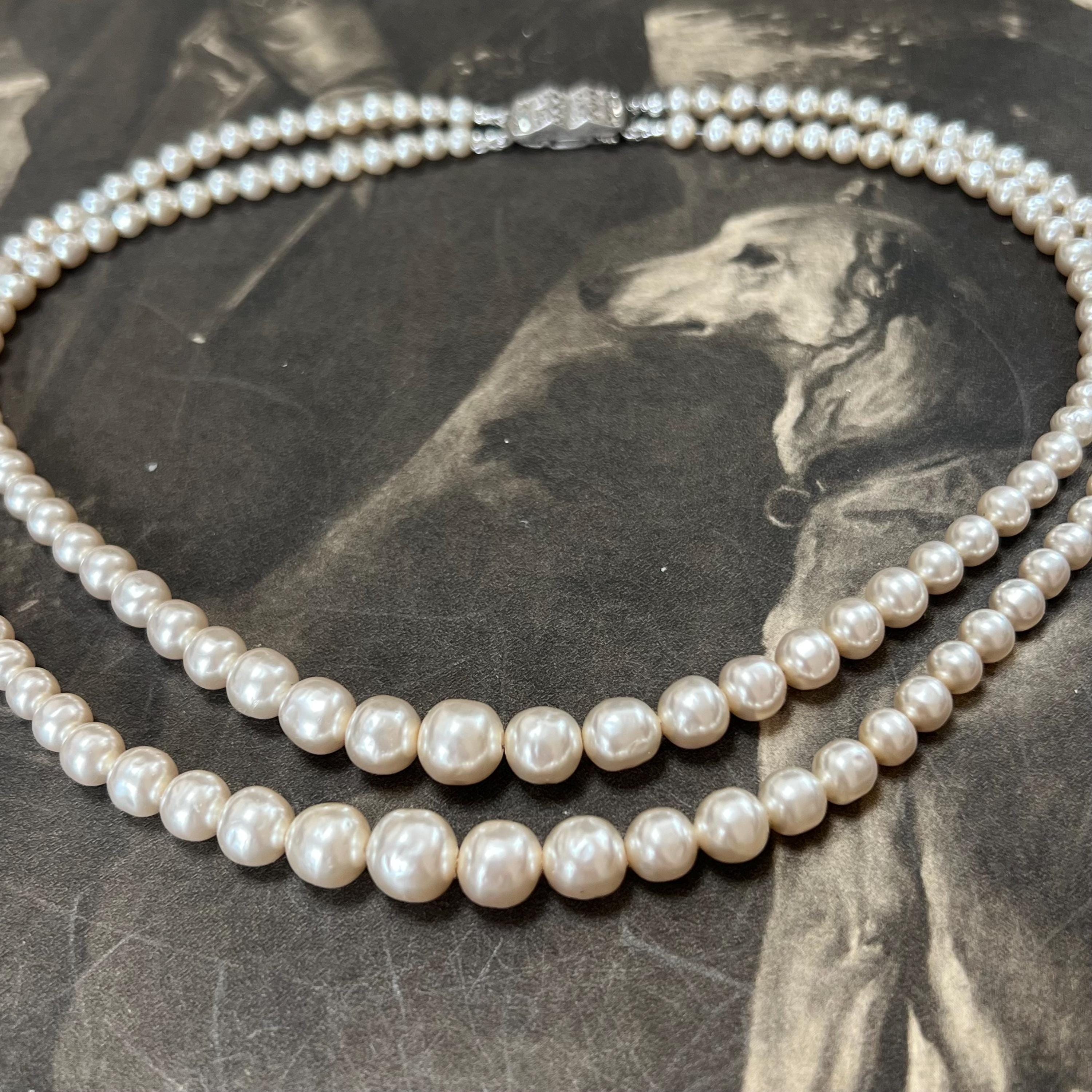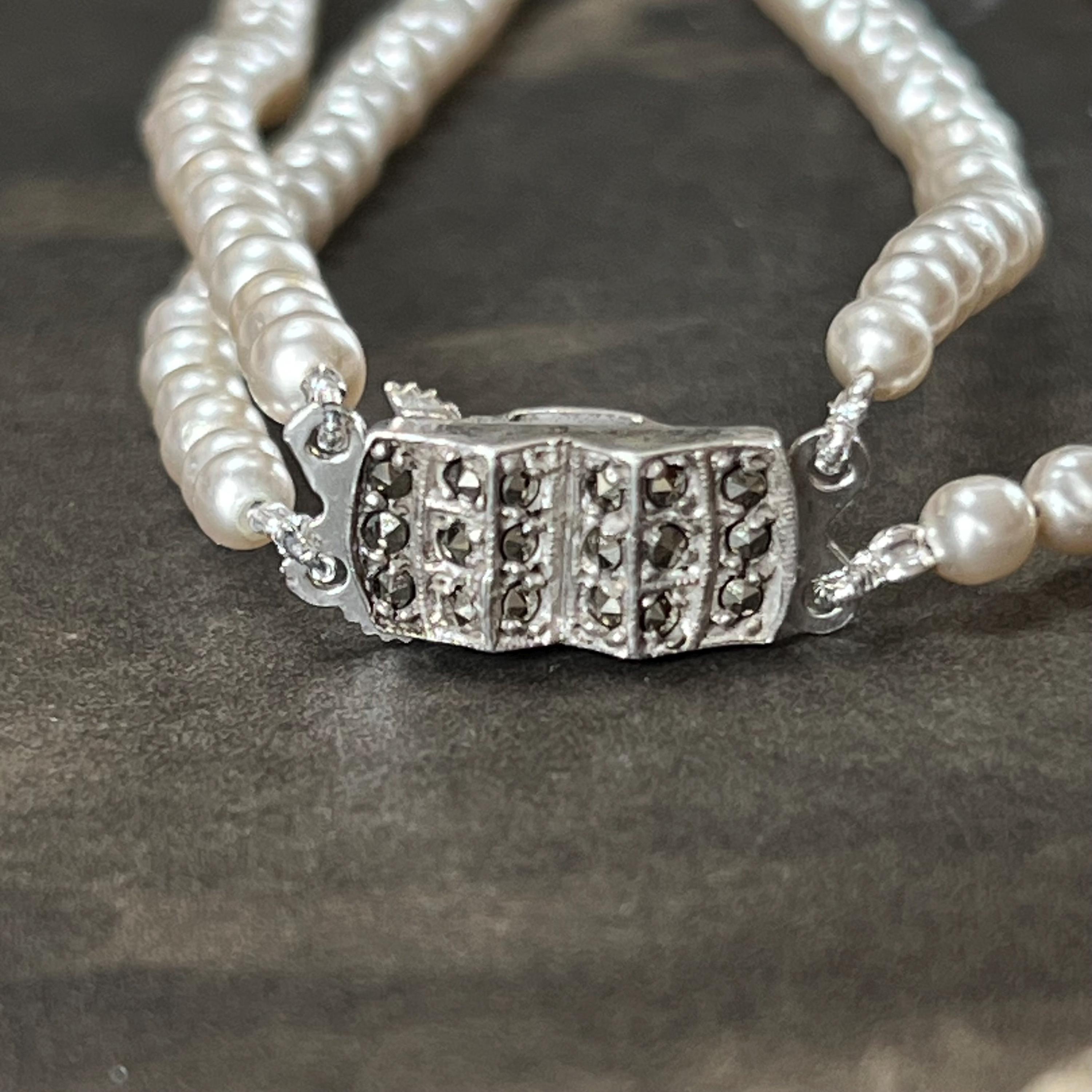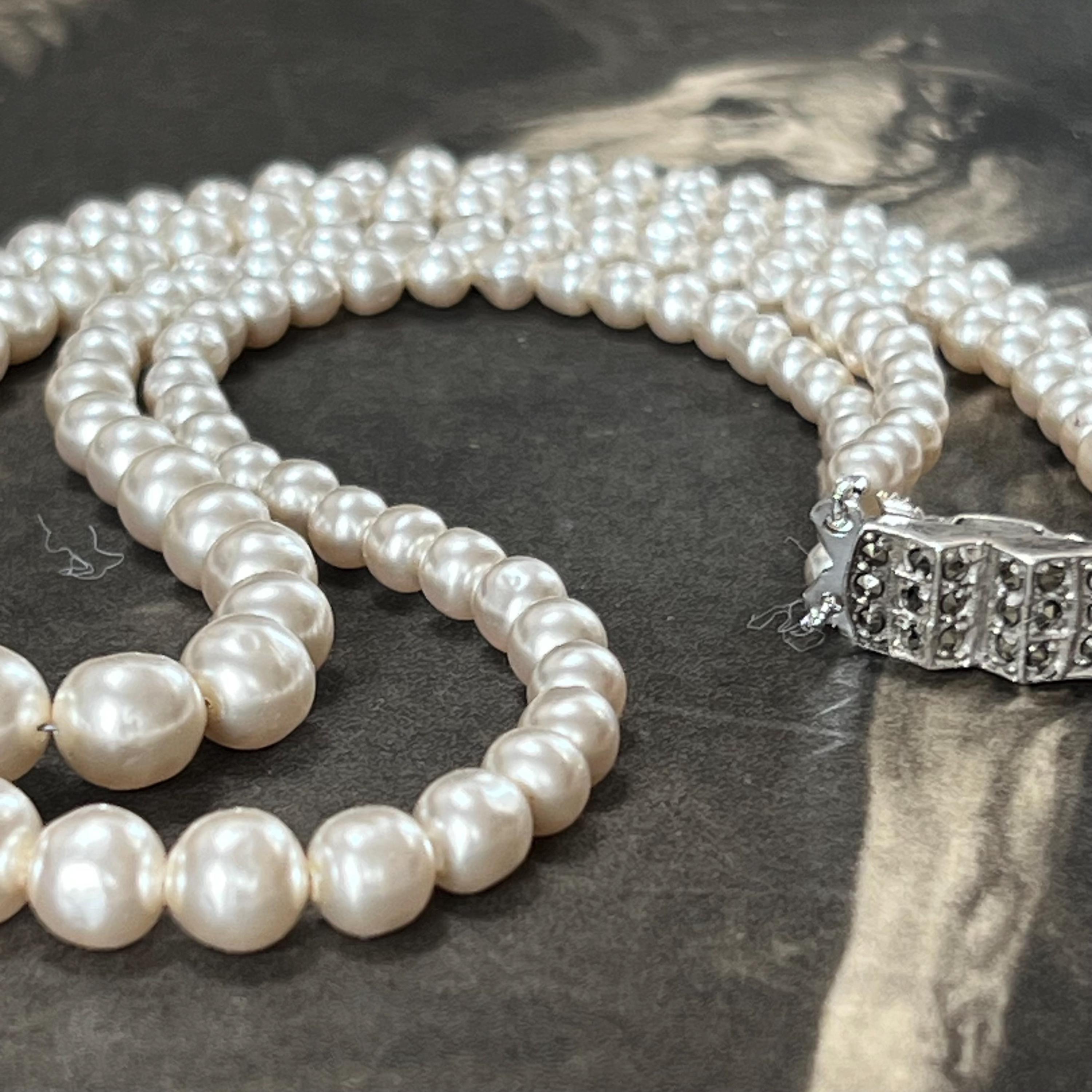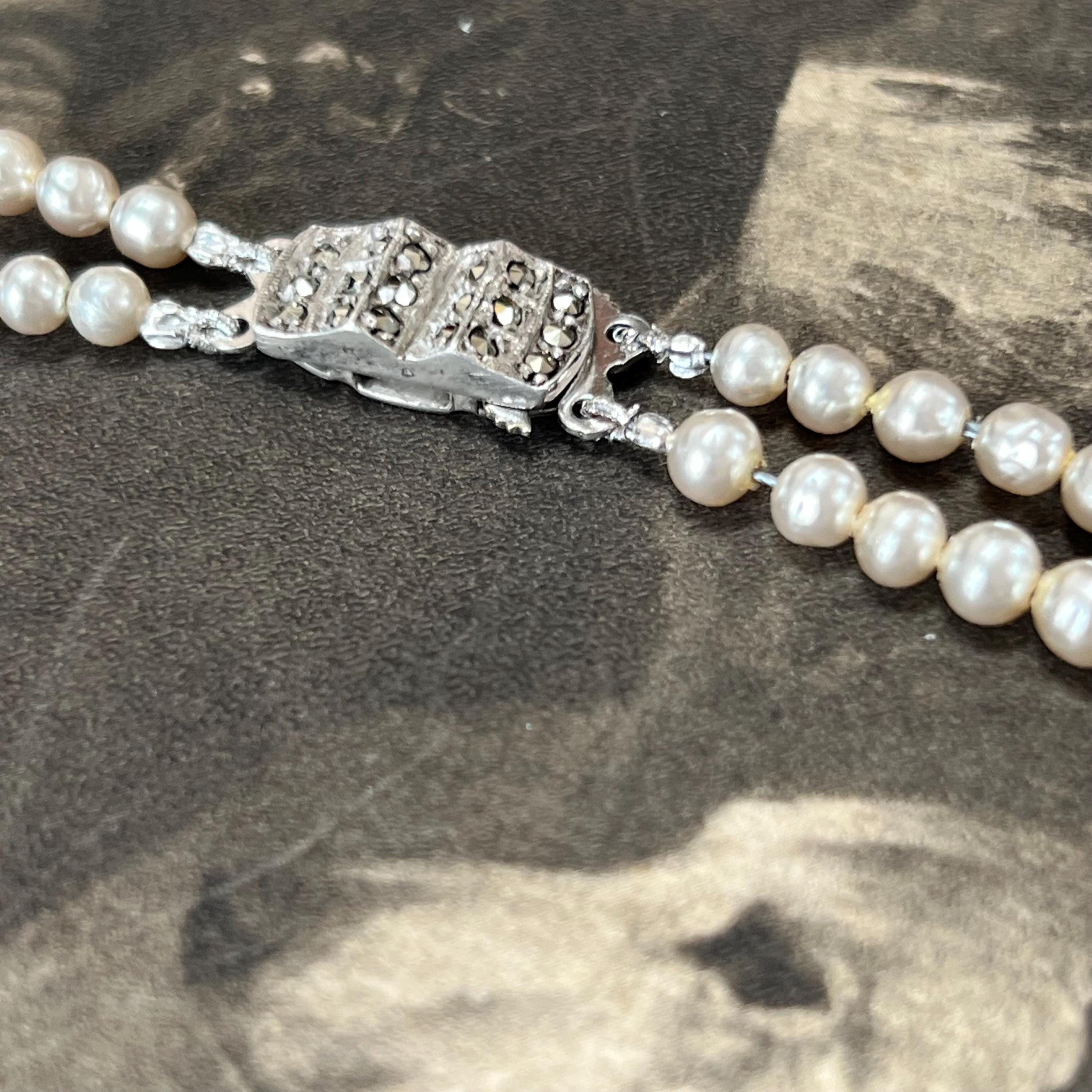 Vintage faux baroque graduated double strand pearl necklace with silver marcasite set clasp, circa 1960s. Superb vintage pearls that have a slight champagne colour, being graduated in size with a range of 5 - 10 mm in a baroque style. Two beautiful quality strands set to a silver clasp set with glittering marcasite stones, stamped ‘silver’ to the back of the clasp. The shorter strand measures 36.5 cm and the longer is 41 cm long. In excellent vintage condition with all marcasite stones present. A great retro vintage necklace that looks beautiful when worn.