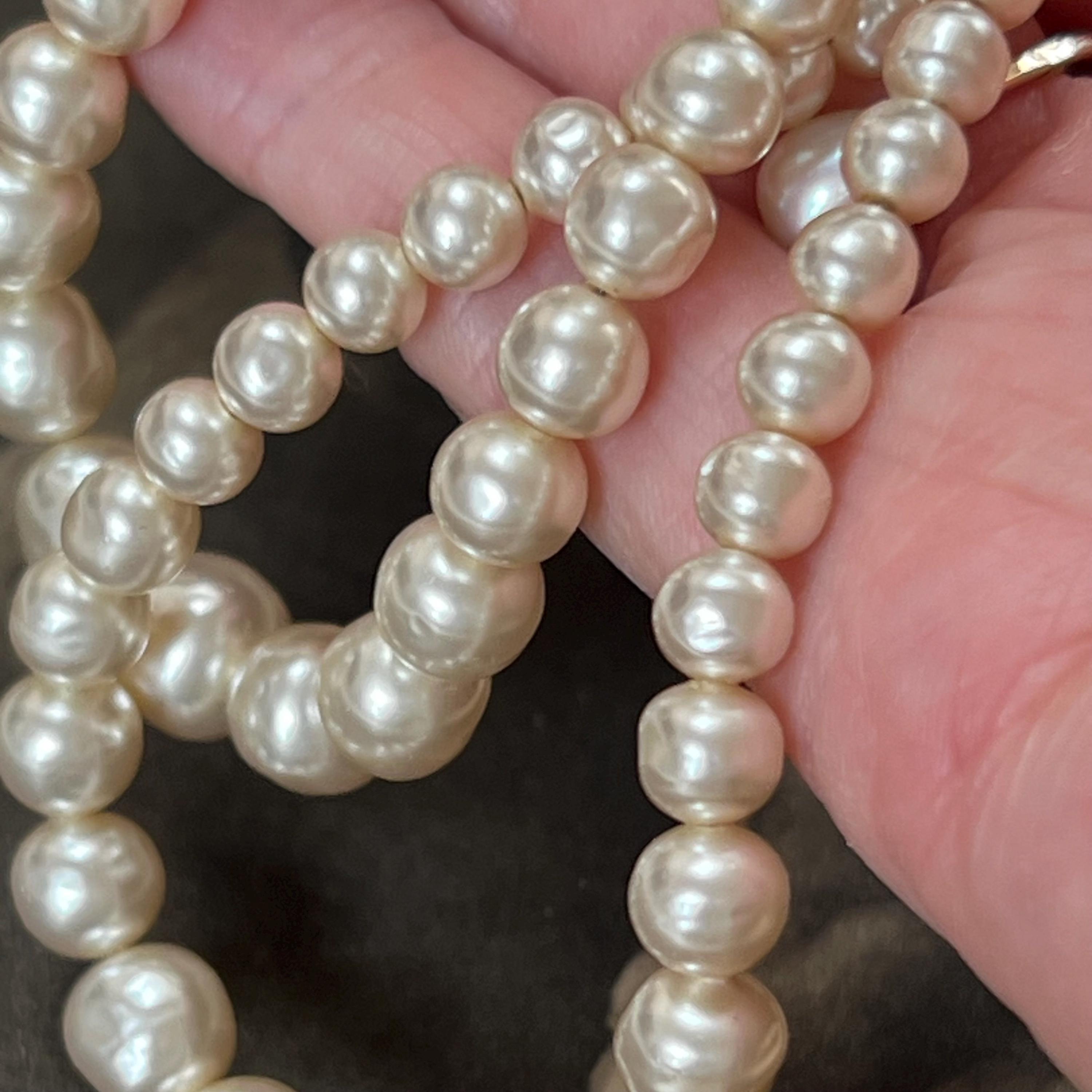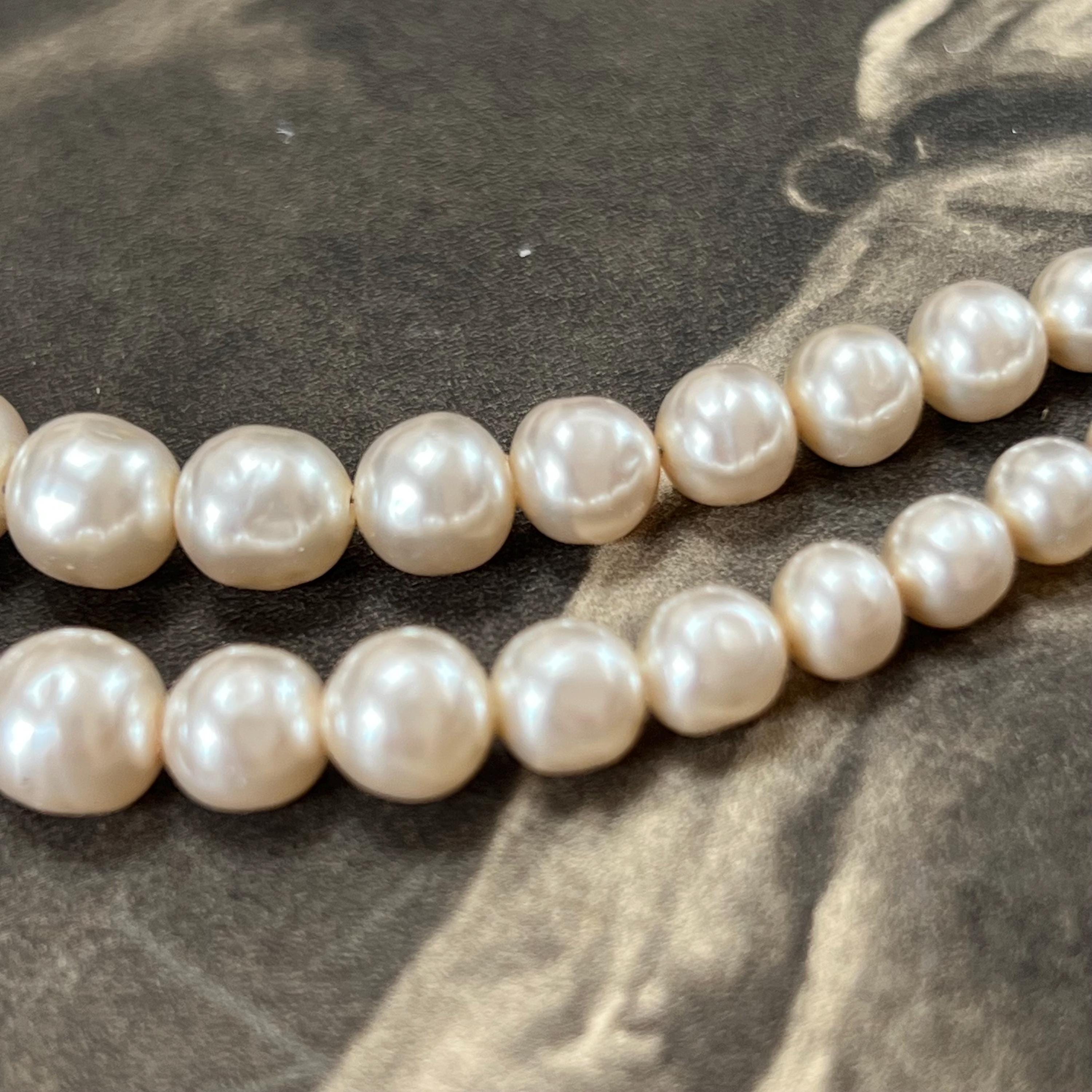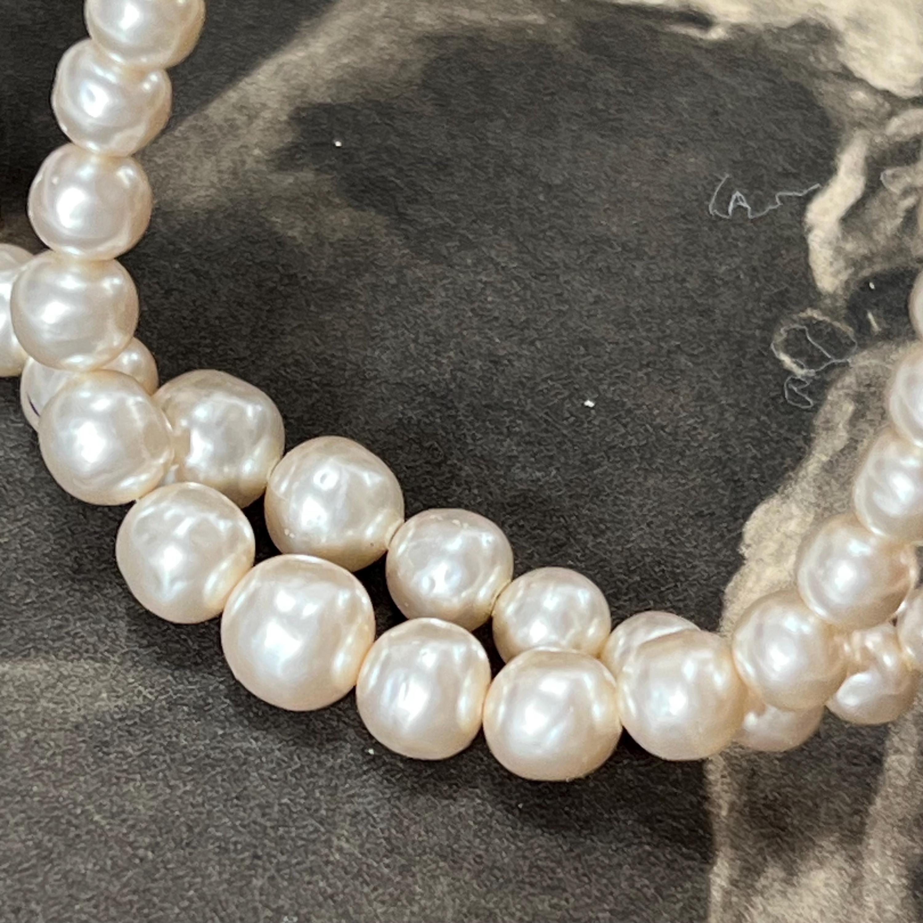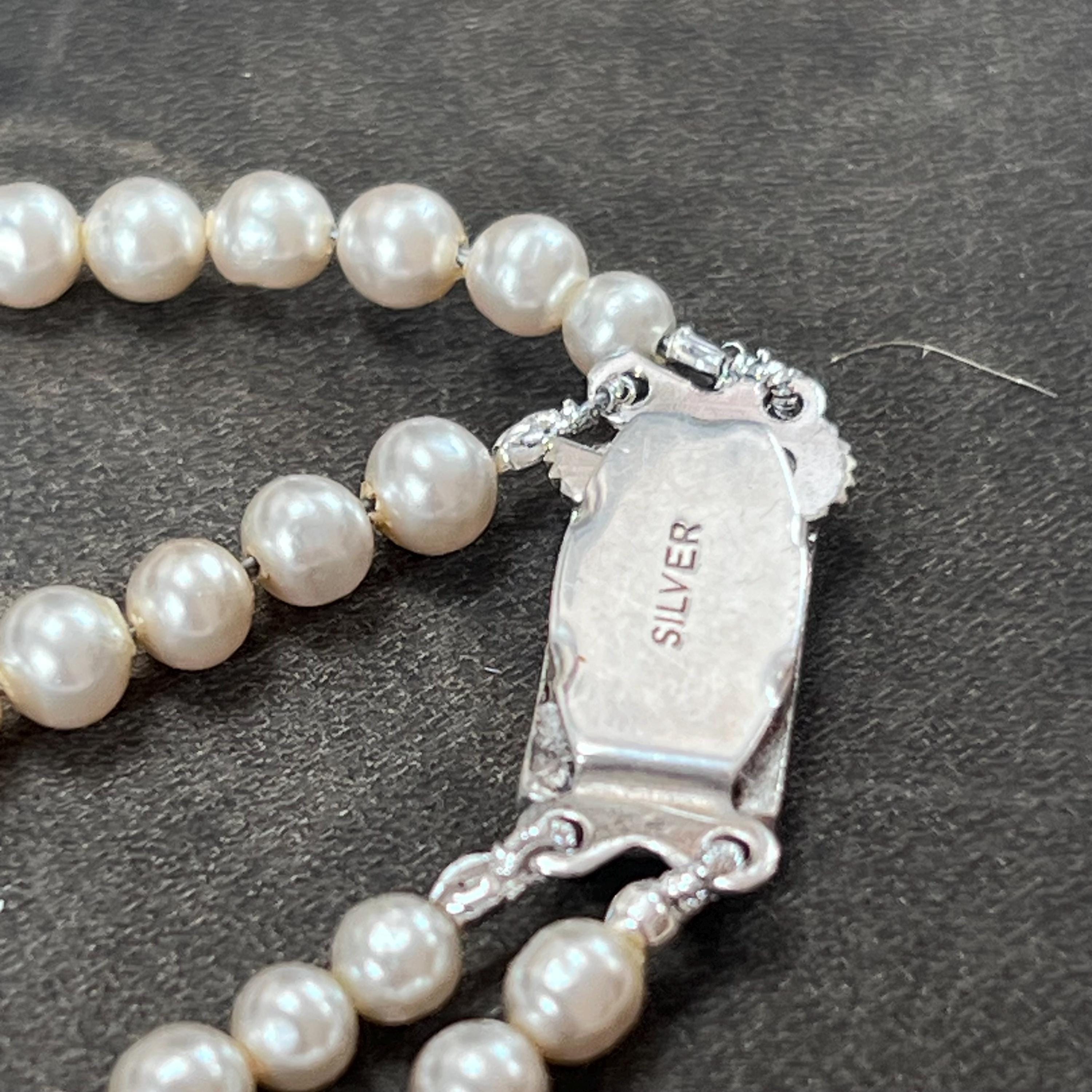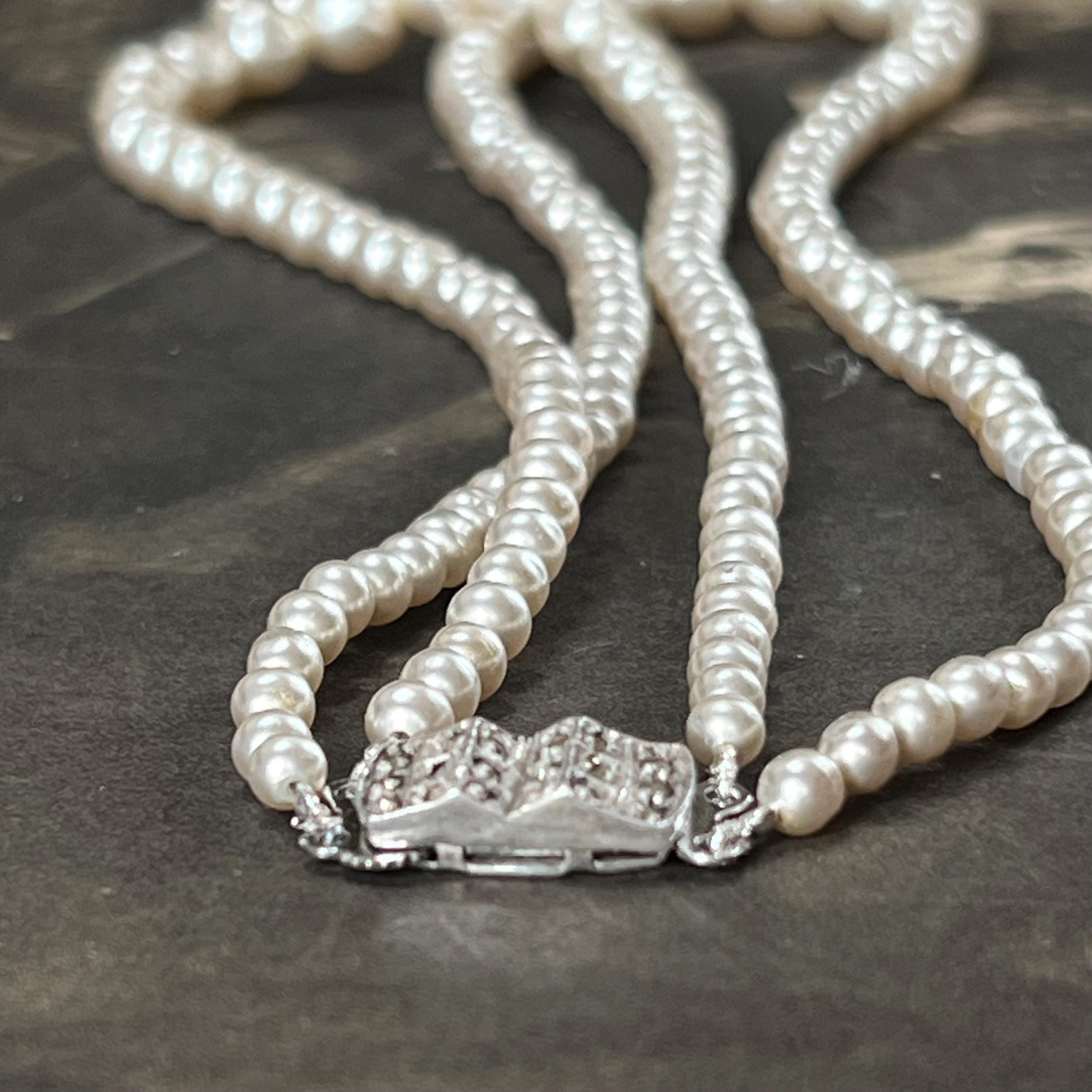 Vintage faux baroque graduated double strand pearl necklace with silver marcasite set clasp, circa 1960s. Superb vintage pearls that have a slight champagne colour, being graduated in size with a range of 5 - 10 mm in a baroque style. Two beautiful quality strands set to a silver clasp set with glittering marcasite stones, stamped ‘silver’ to the back of the clasp. The shorter strand measures 36.5 cm and the longer is 41 cm long. In excellent vintage condition with all marcasite stones present. A great retro vintage necklace that looks beautiful when worn.