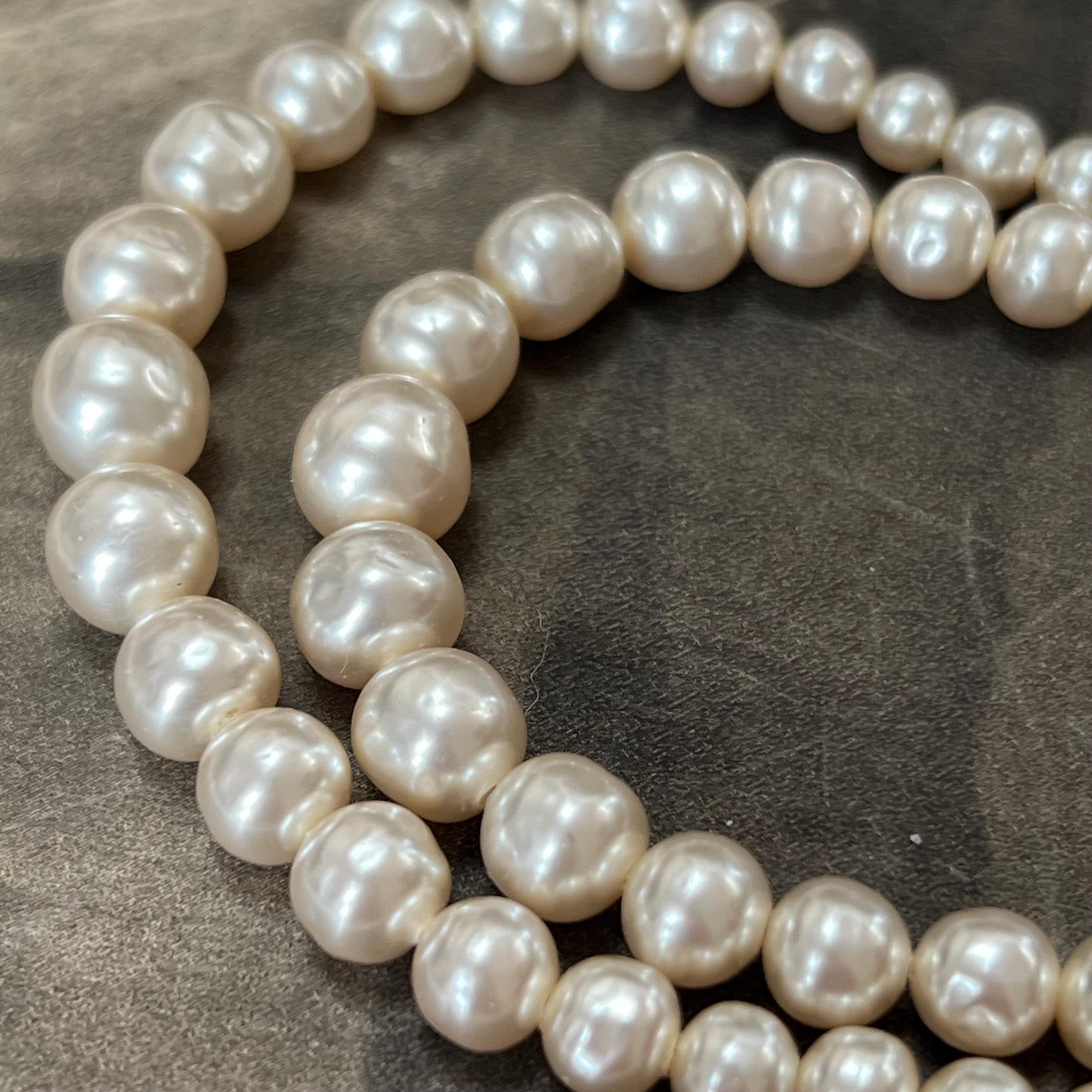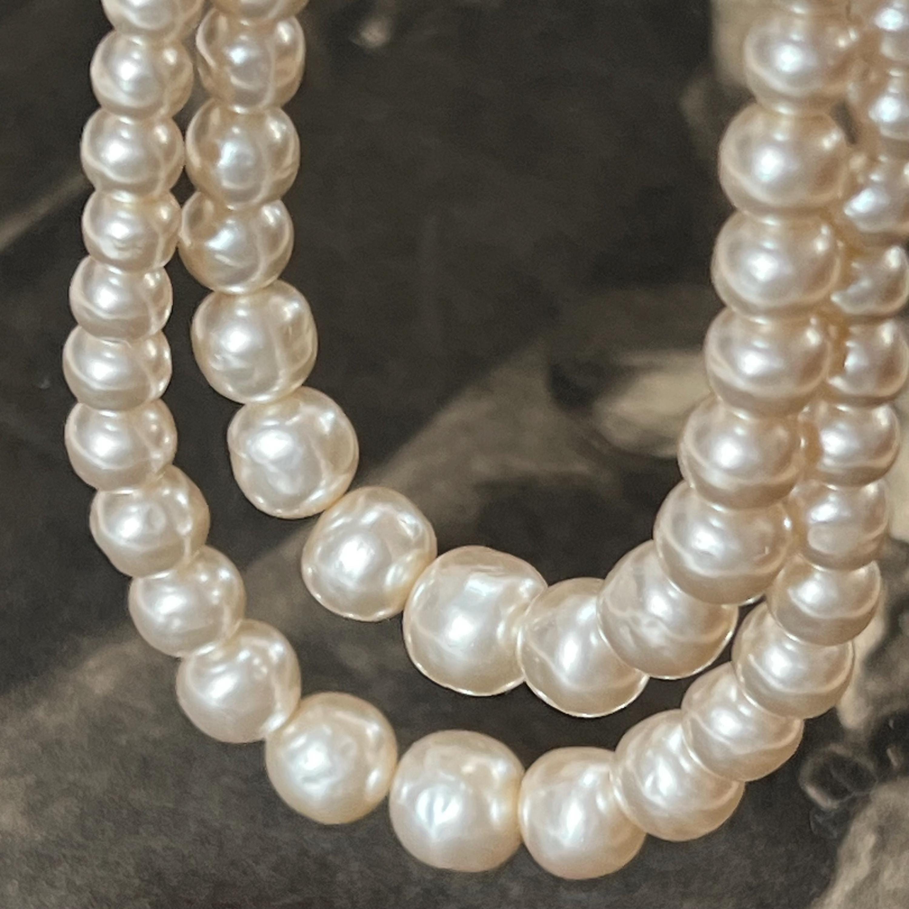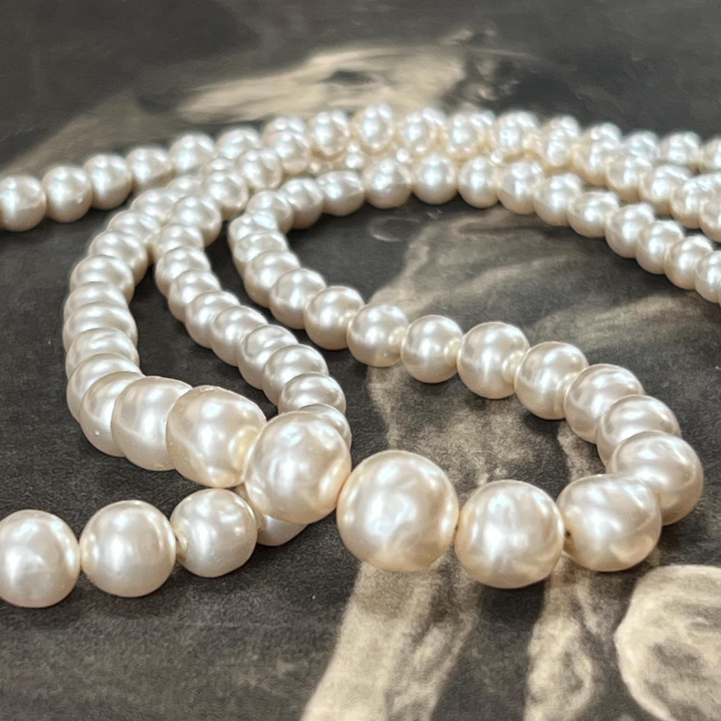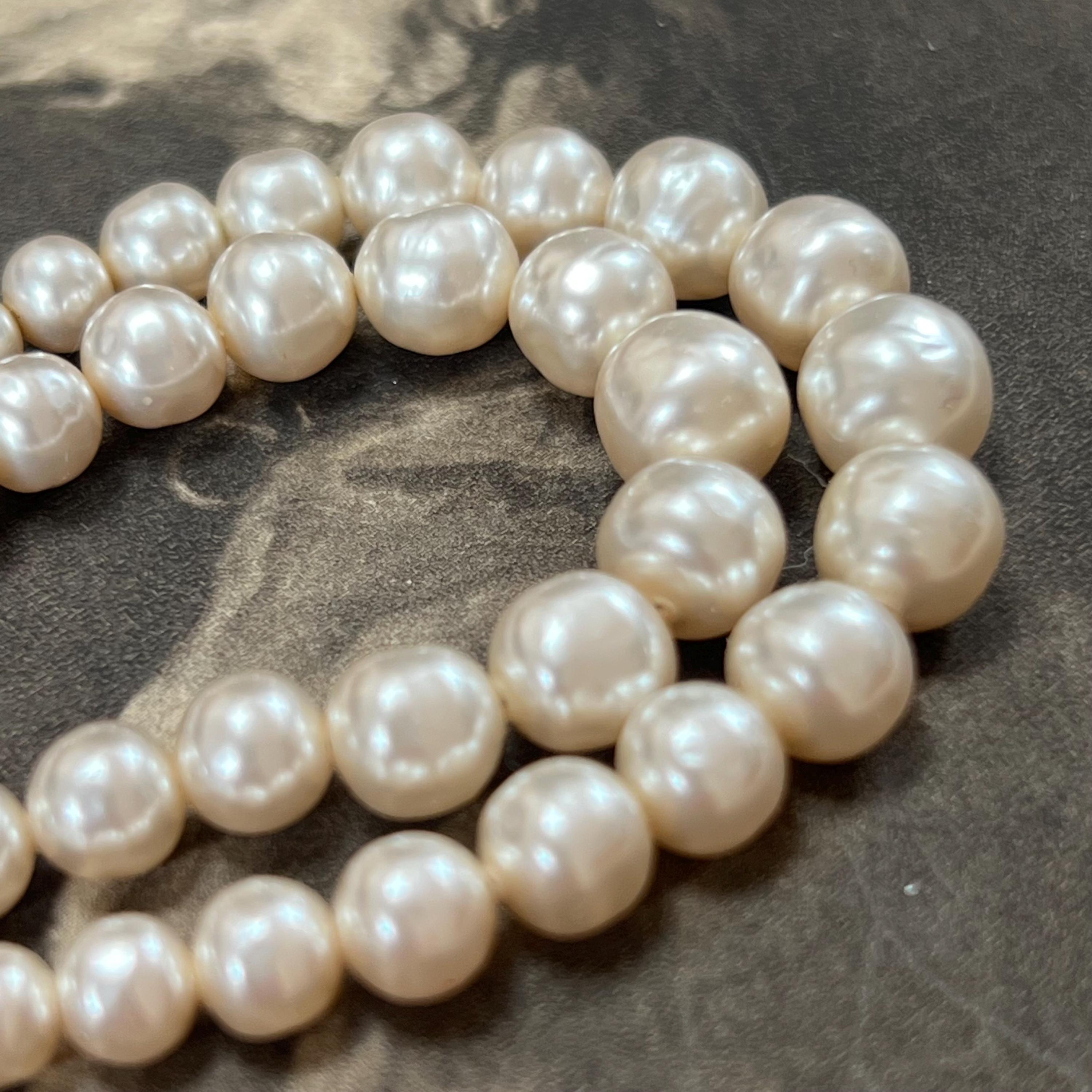 Vintage faux baroque graduated double strand pearl necklace with silver marcasite set clasp, circa 1960s. Superb vintage pearls that have a slight champagne colour, being graduated in size with a range of 5 - 10 mm in a baroque style. Two beautiful quality strands set to a silver clasp set with glittering marcasite stones, stamped ‘silver’ to the back of the clasp. The shorter strand measures 36.5 cm and the longer is 41 cm long. In excellent vintage condition with all marcasite stones present. A great retro vintage necklace that looks beautiful when worn.