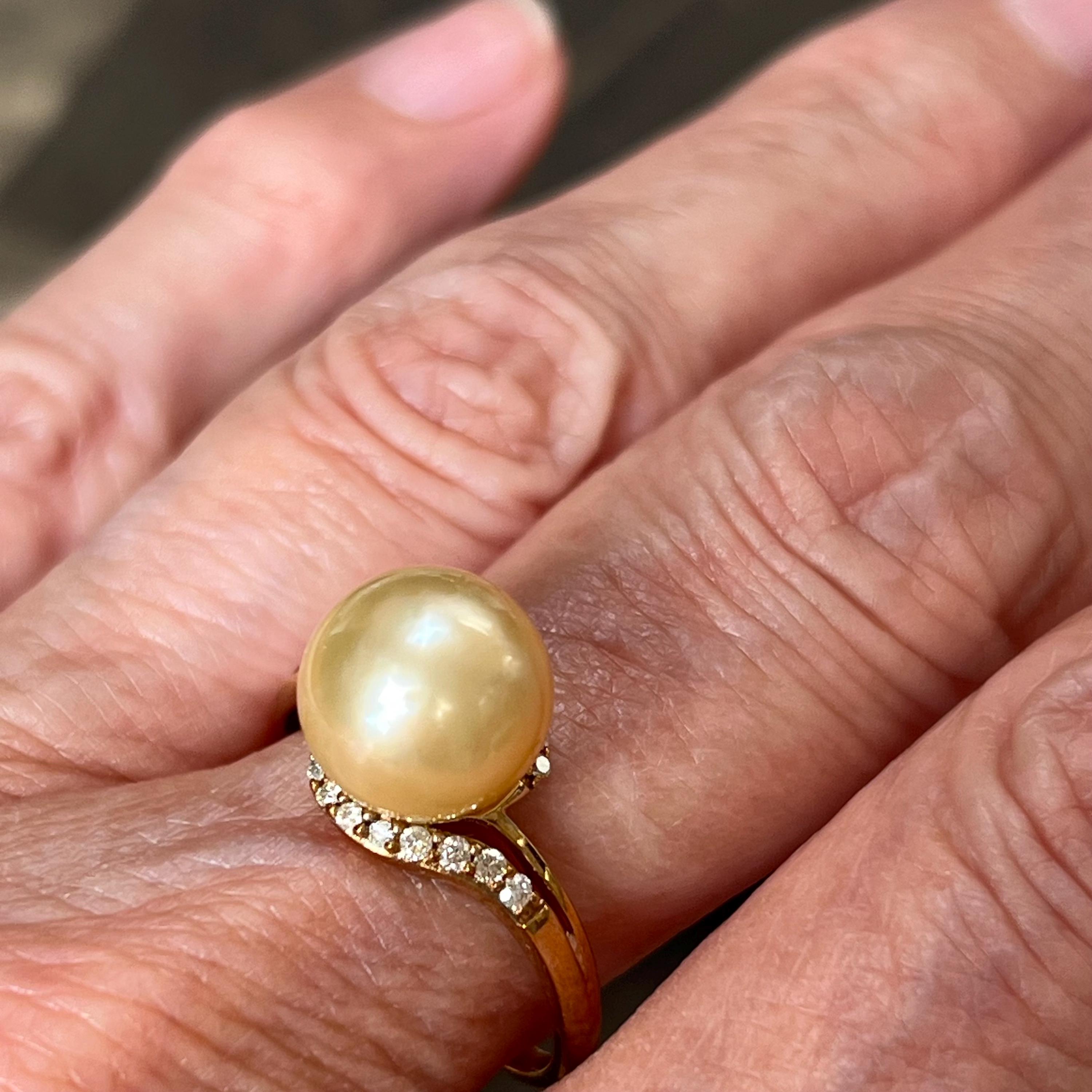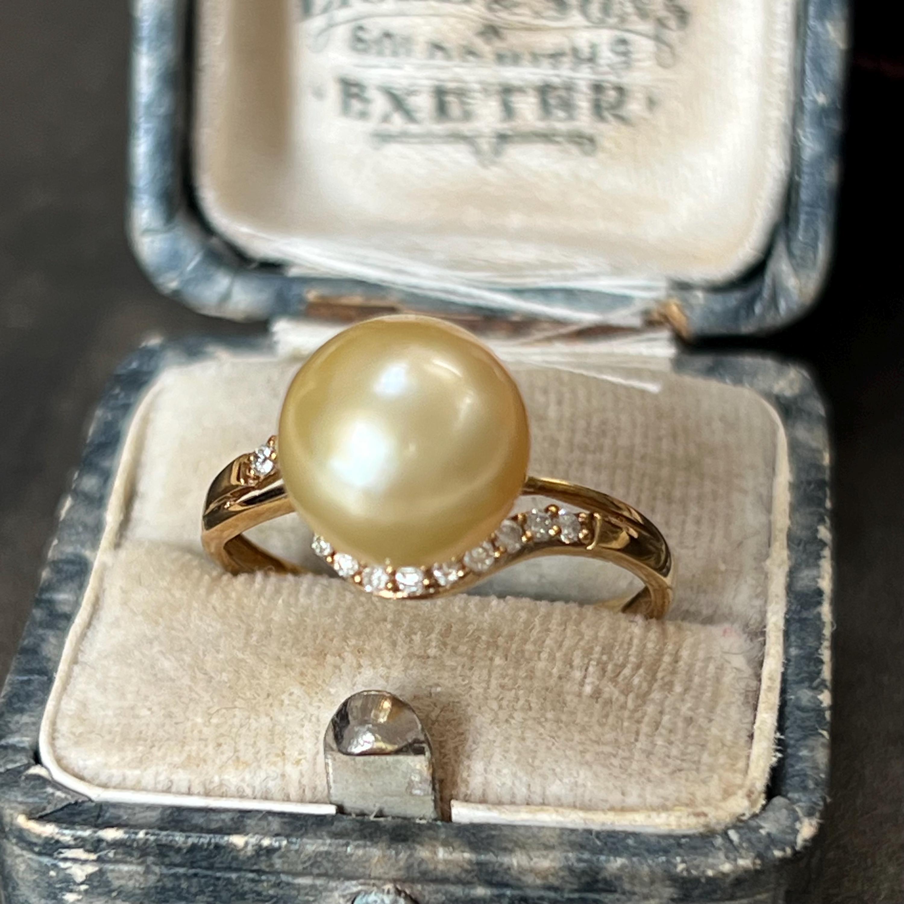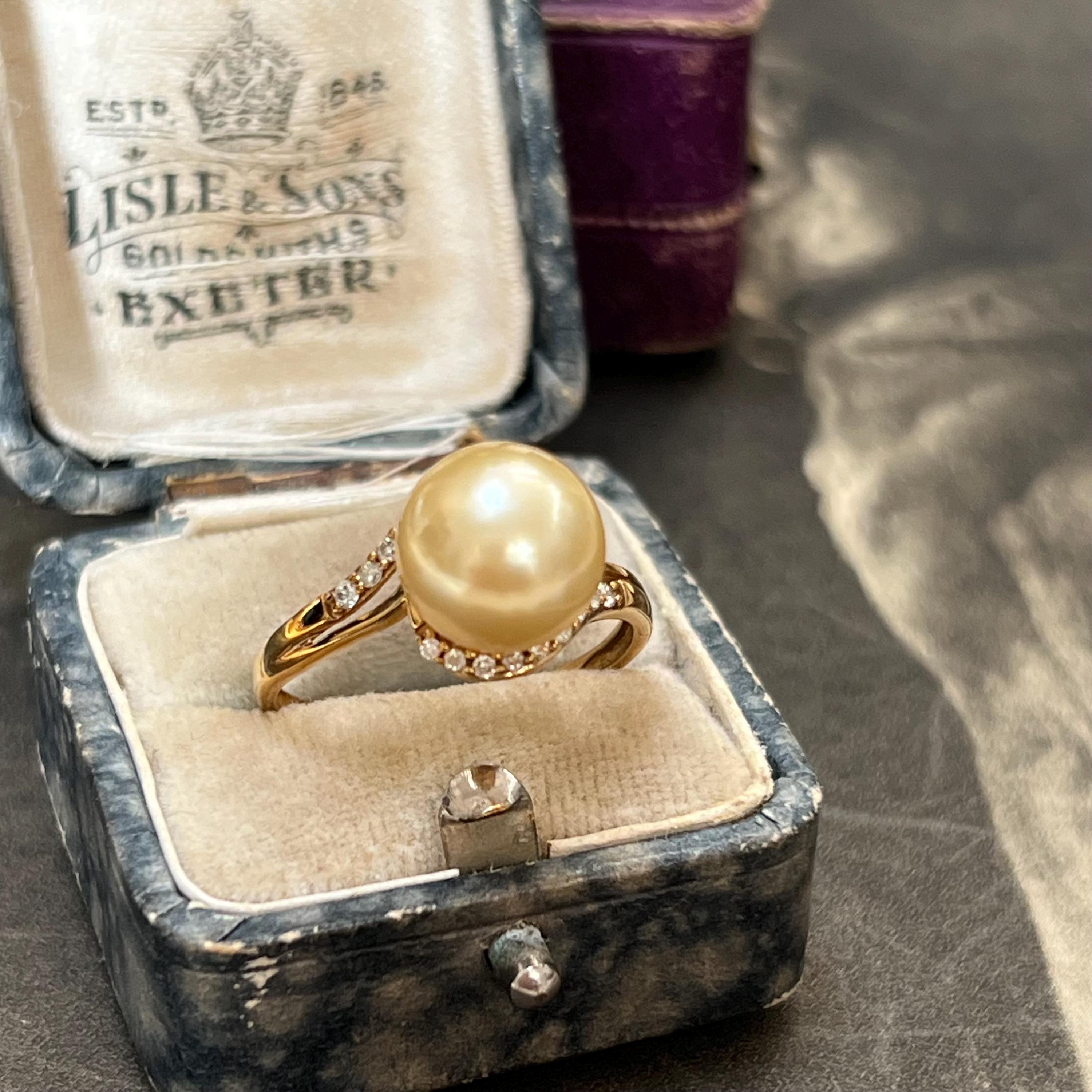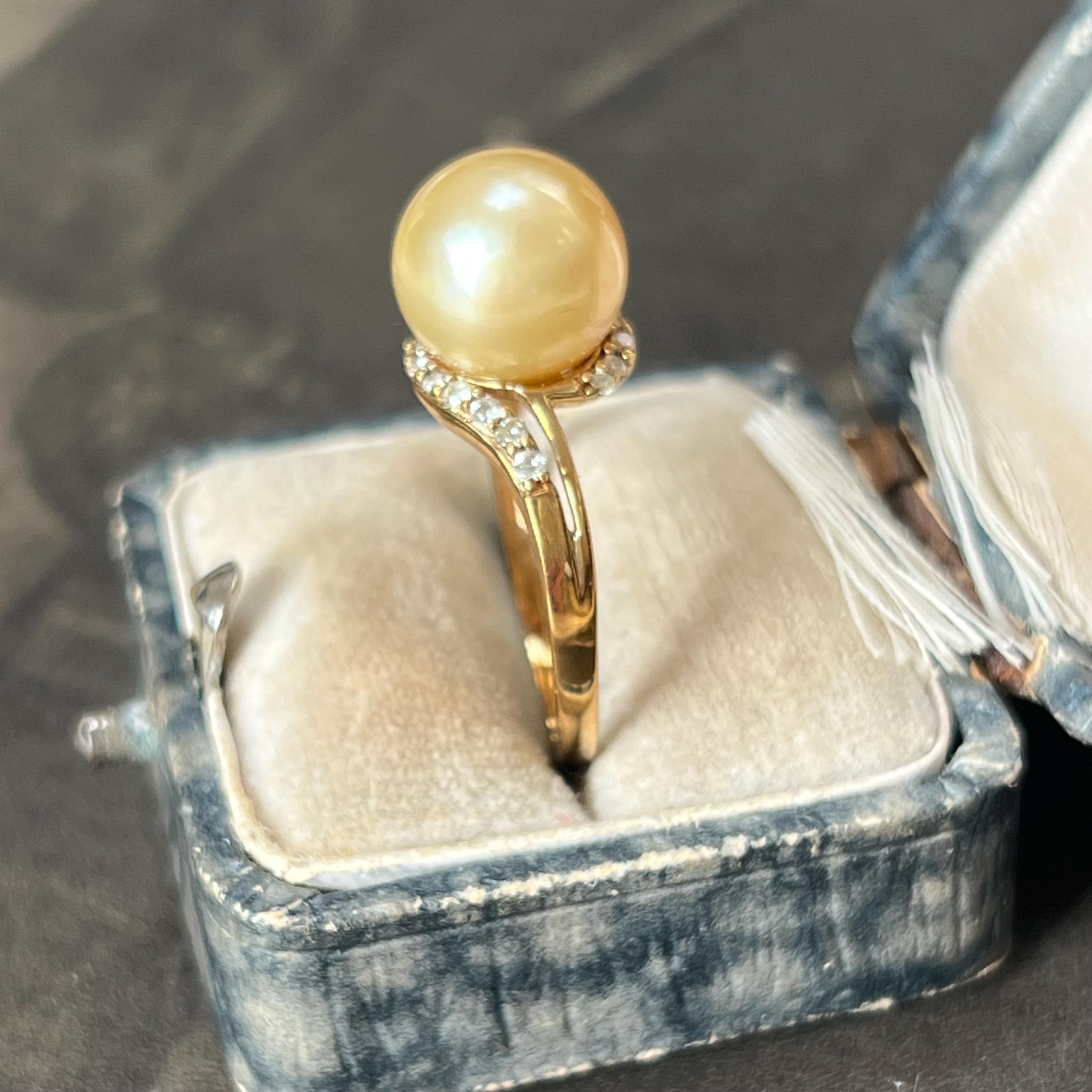 Large 10.2mm champagne-colored South Sea cultured pearl. Encircling are 18 small, brilliant-cut diamonds, meticulously set in a bypass design. Ring size R ½ size 8 7/8 (US). UK hallmark for Birmingham and the purity mark "375," 9 carat gold. Made in 2011.