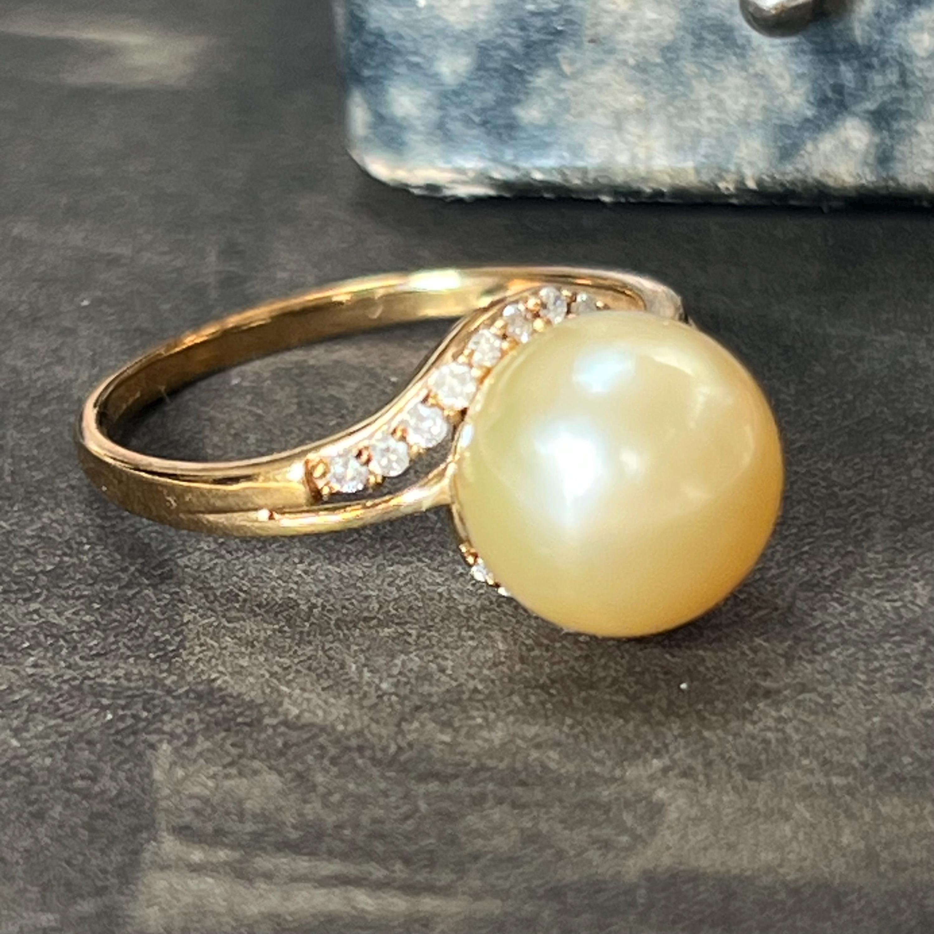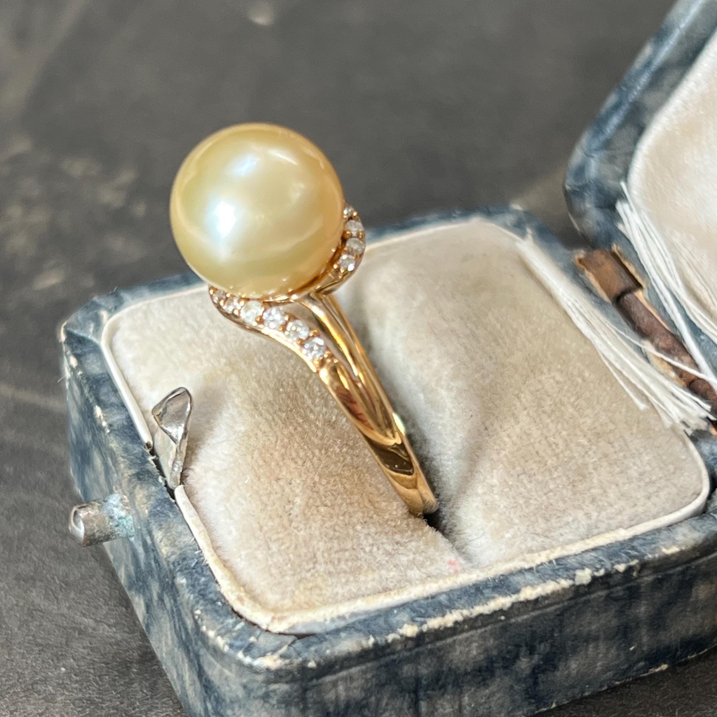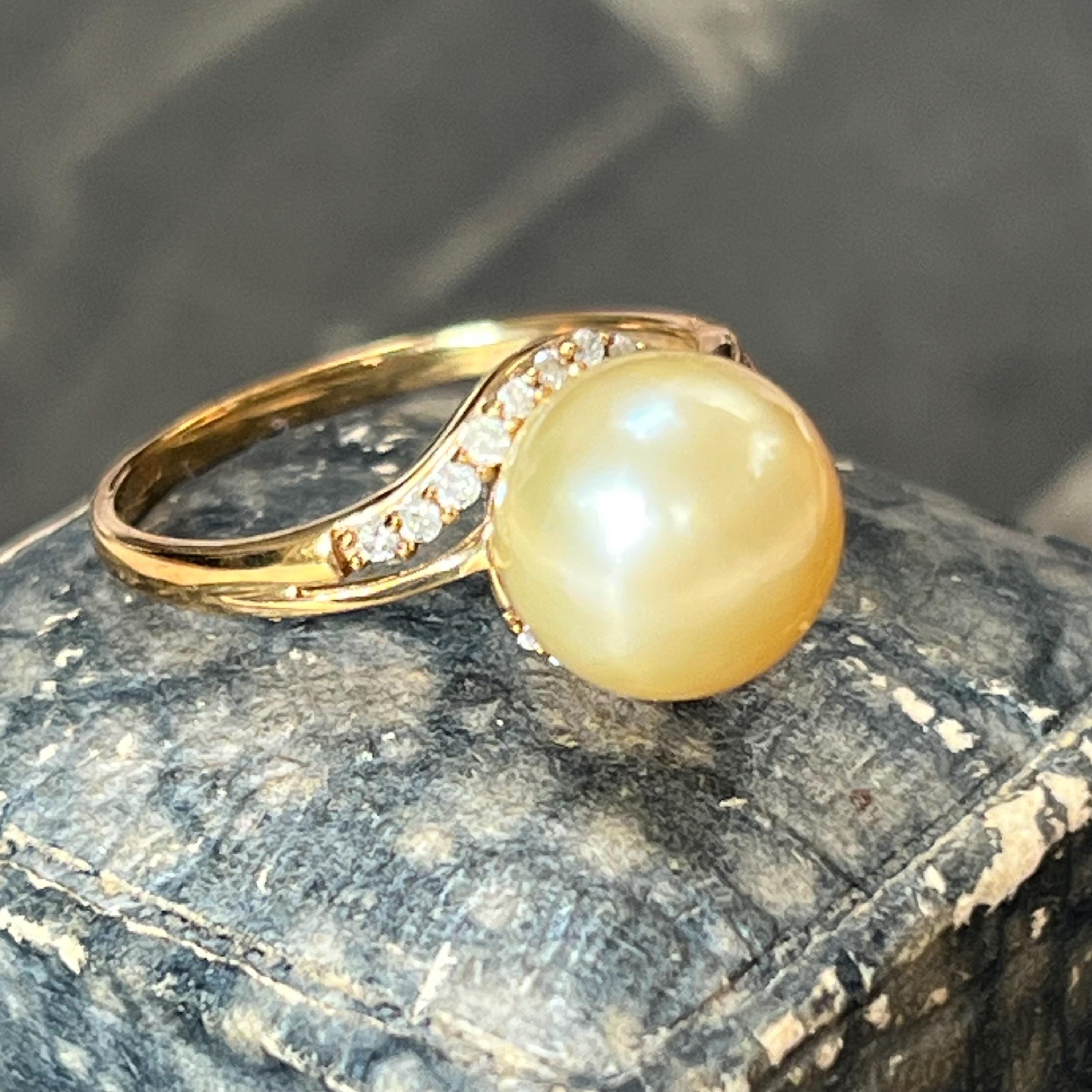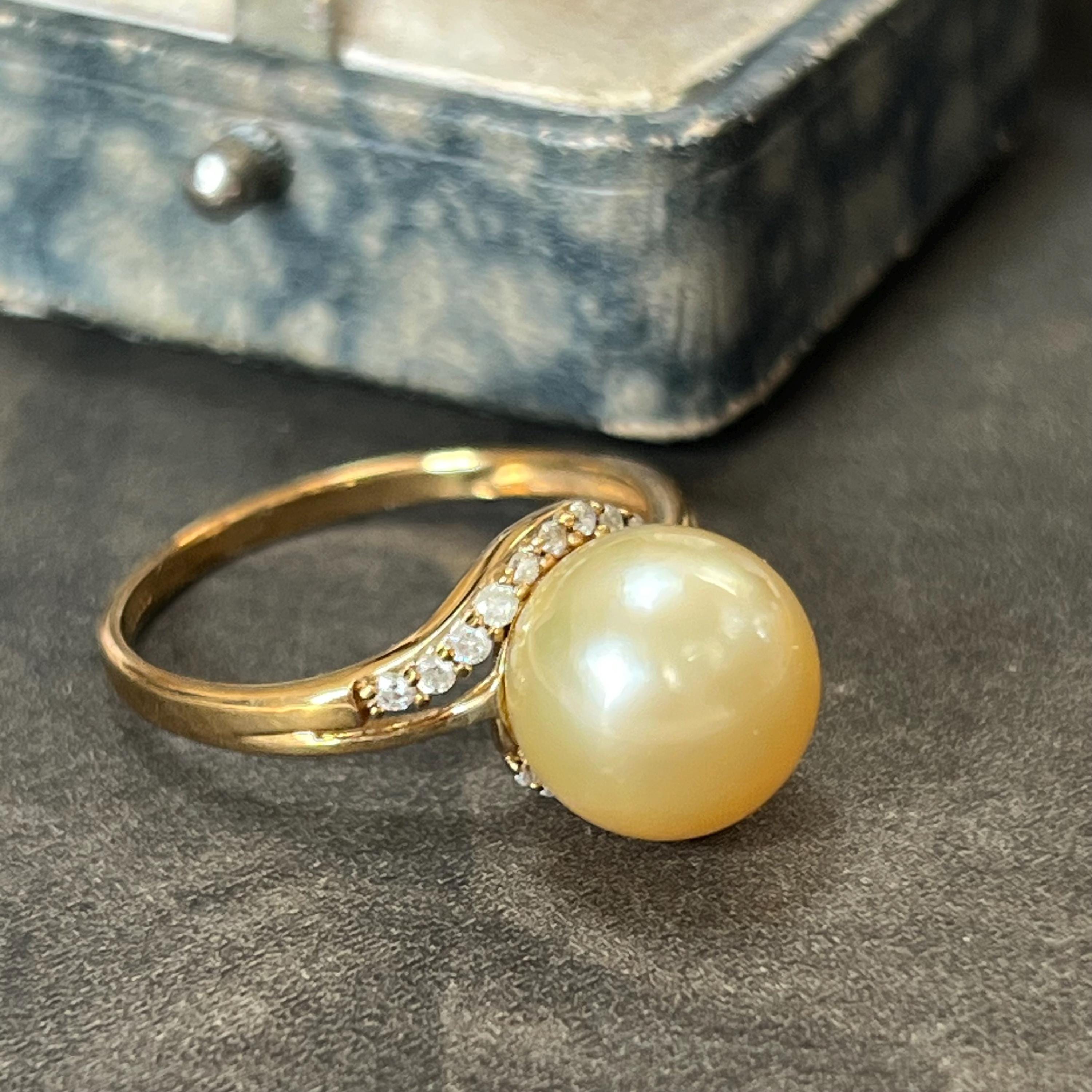 The diamonds, with an estimated total carat weight of 0.18ct, add a brilliant, scintillating touch to the ring, enhancing its overall radiance. Each diamond sparkles with a fiery brilliance, complementing the pearl's natural splendor.