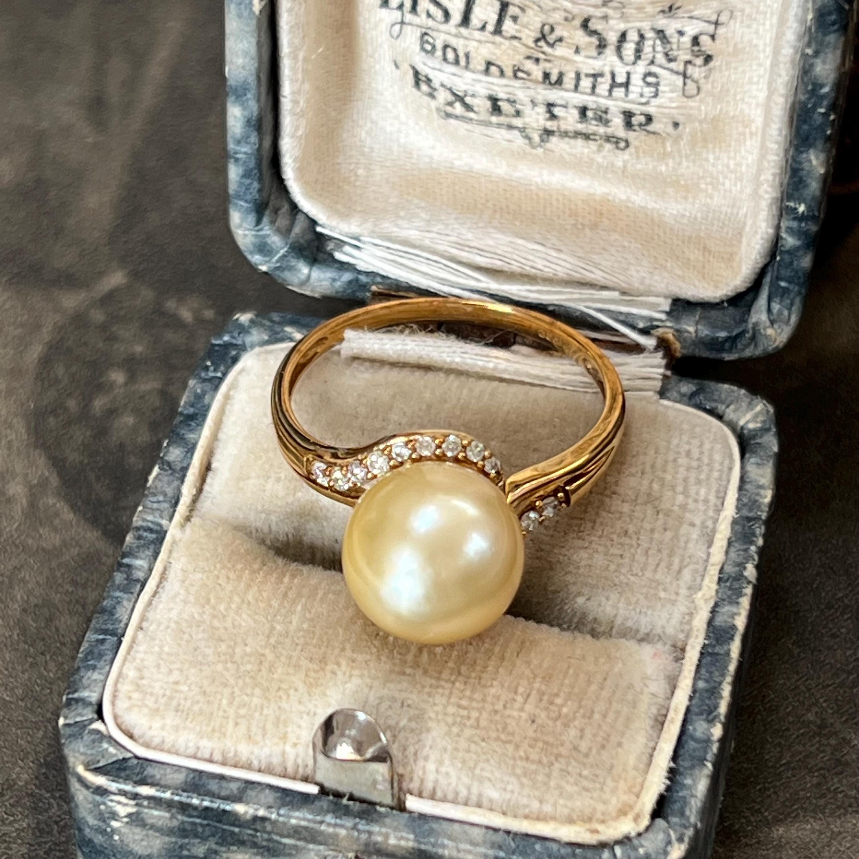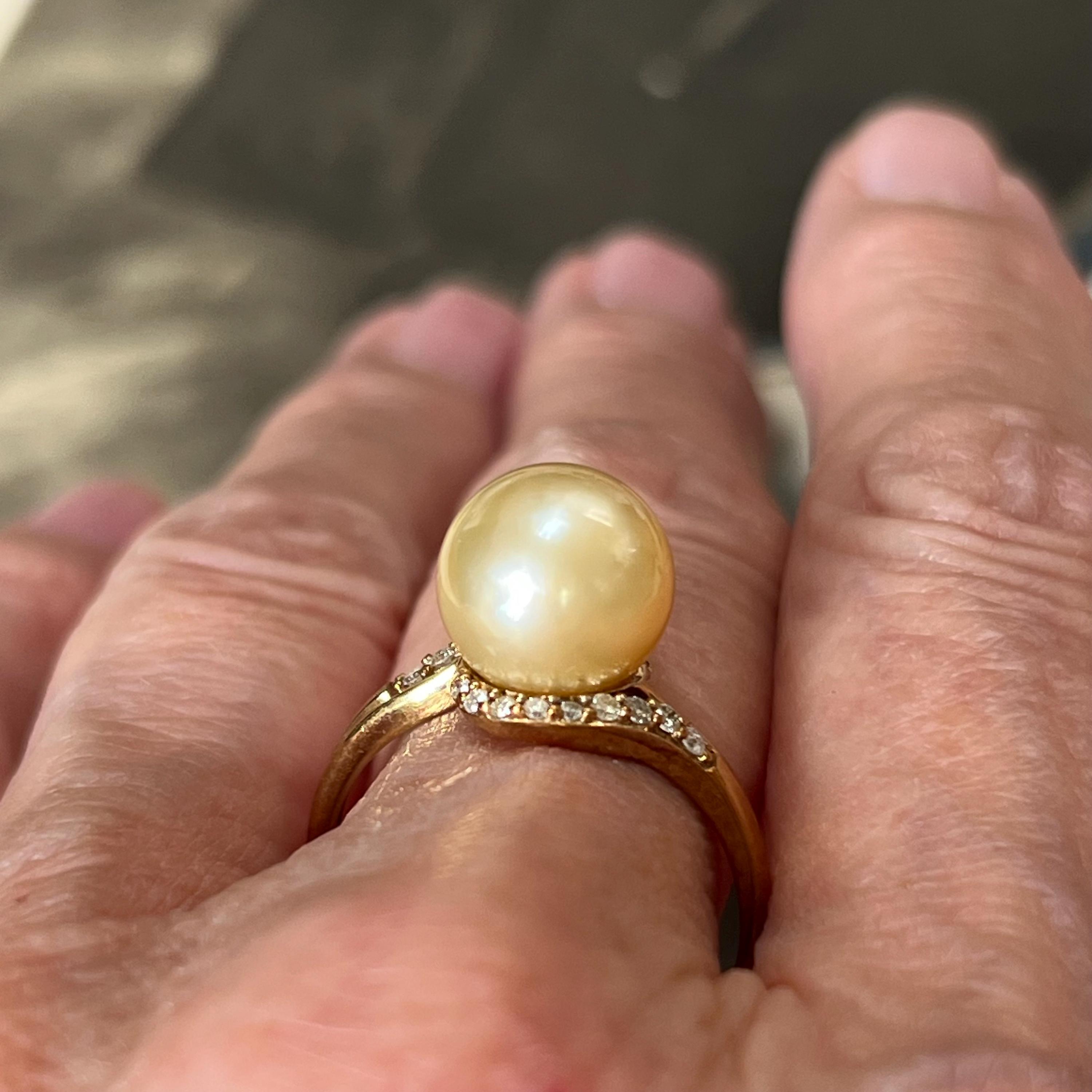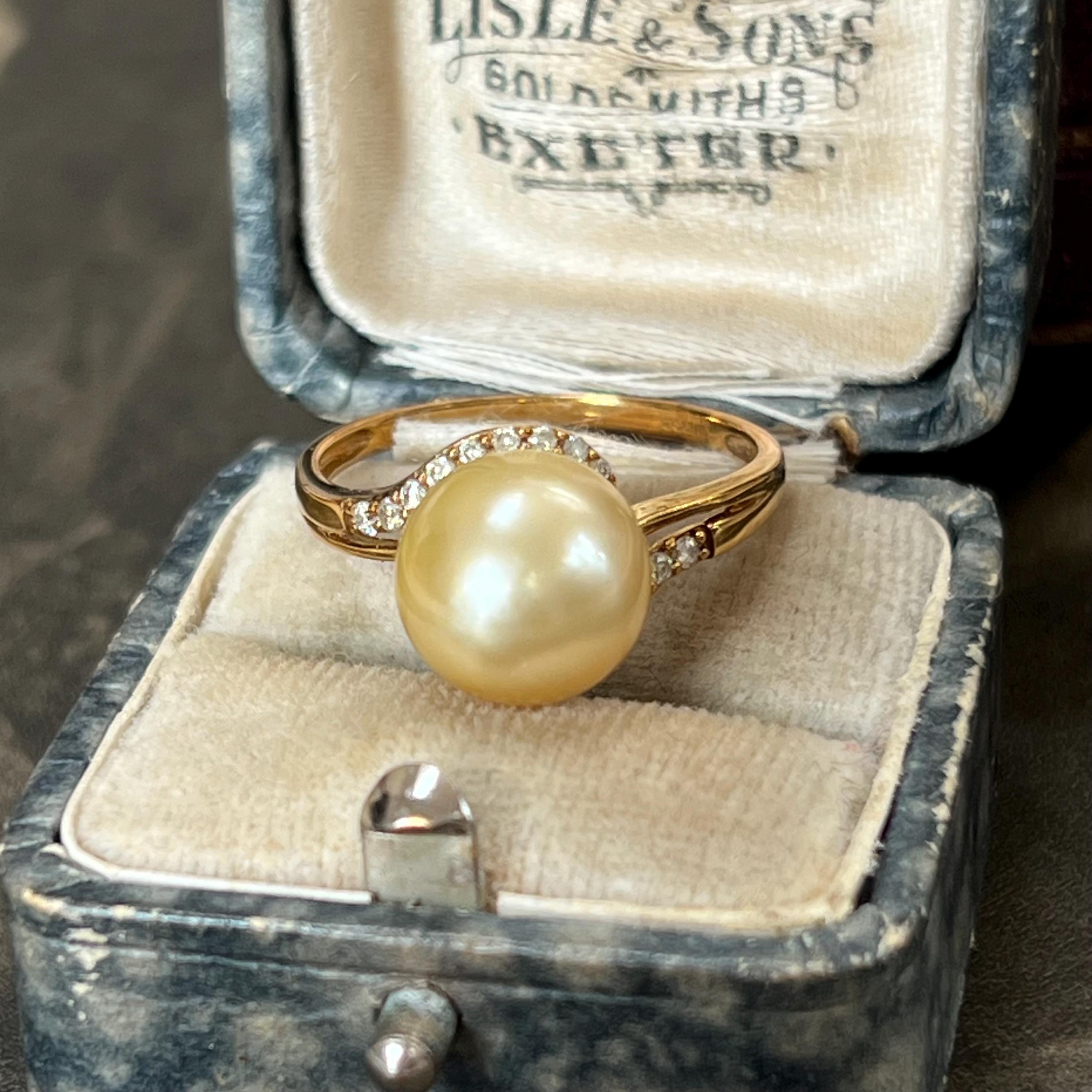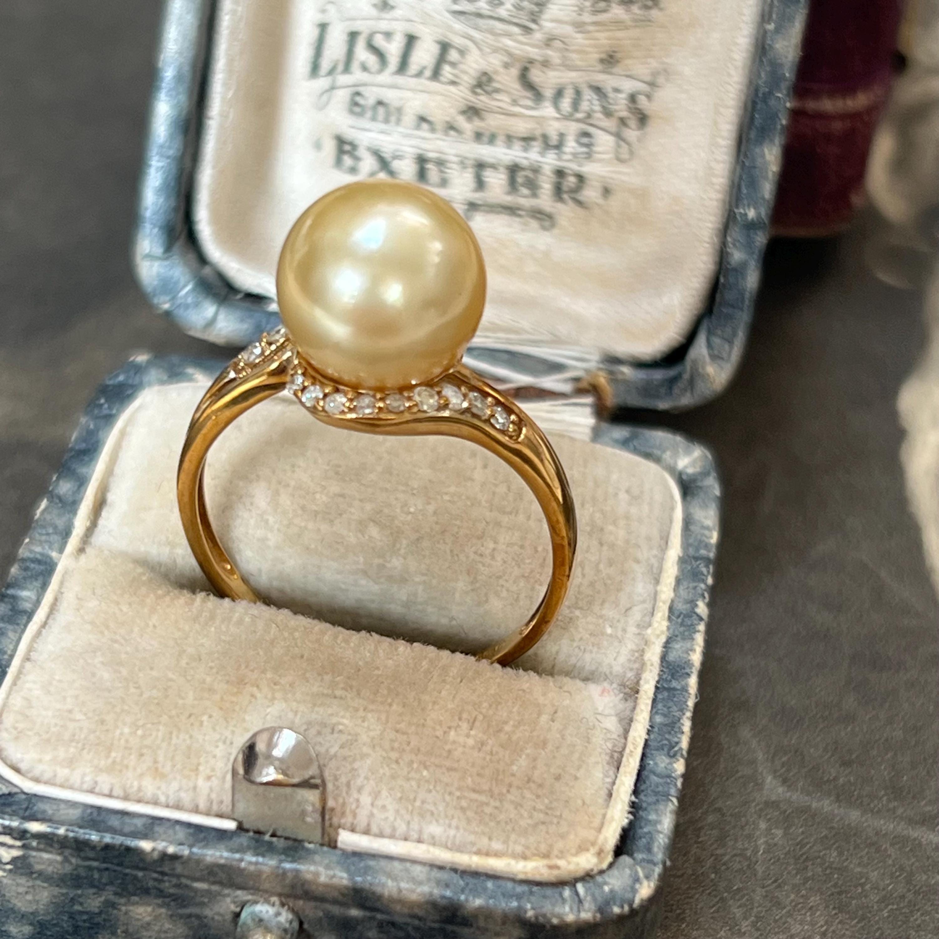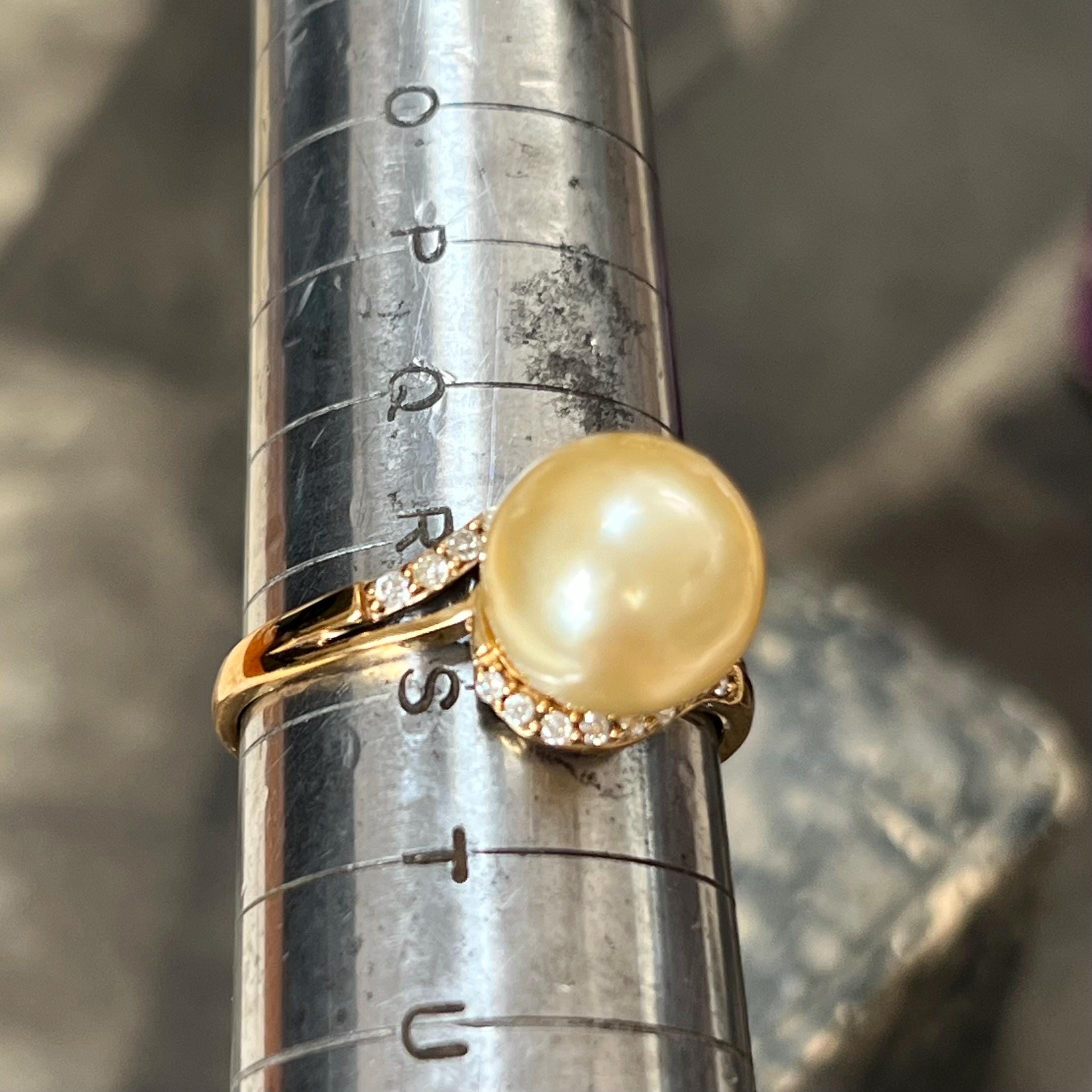 The diamonds, with an estimated total carat weight of 0.18ct, add a brilliant, scintillating touch to the ring, enhancing its overall radiance. Each diamond sparkles with a fiery brilliance, complementing the pearl's natural splendor.