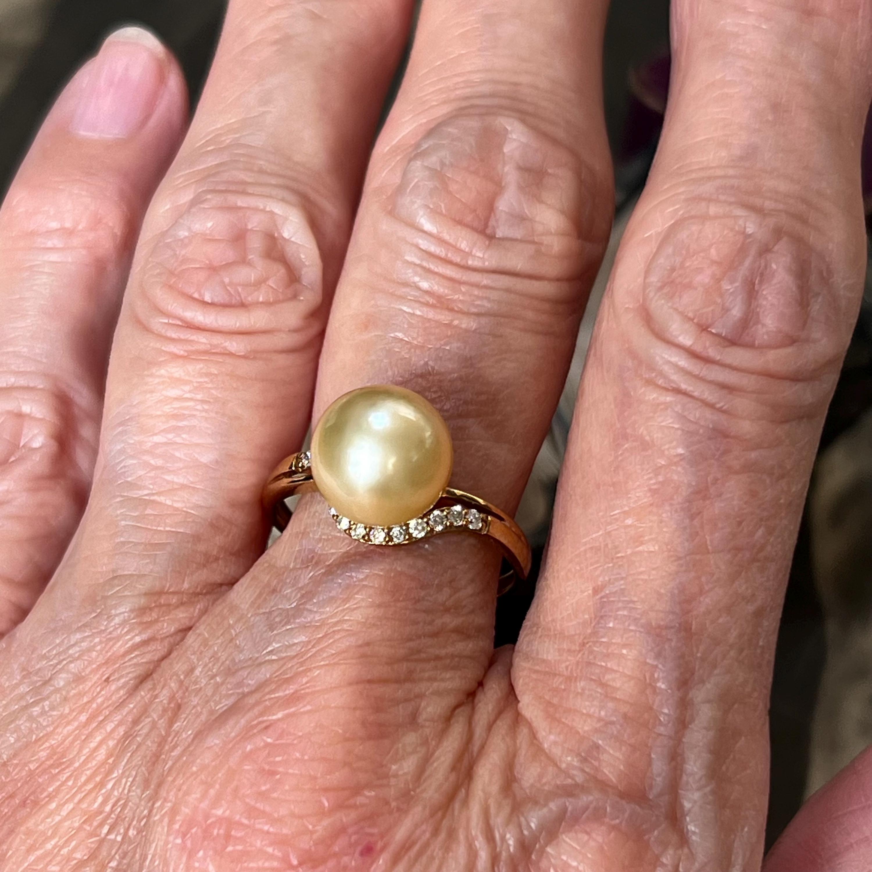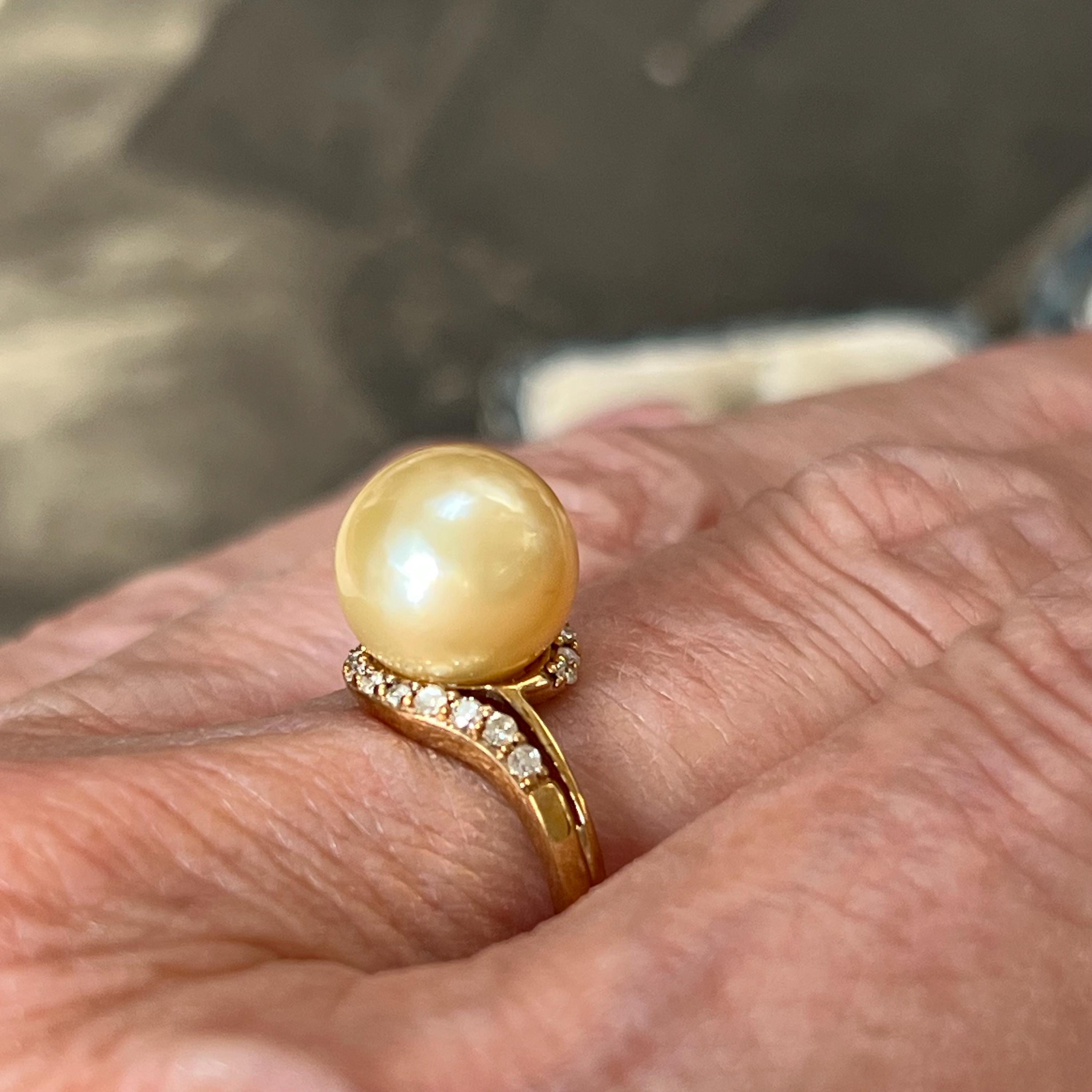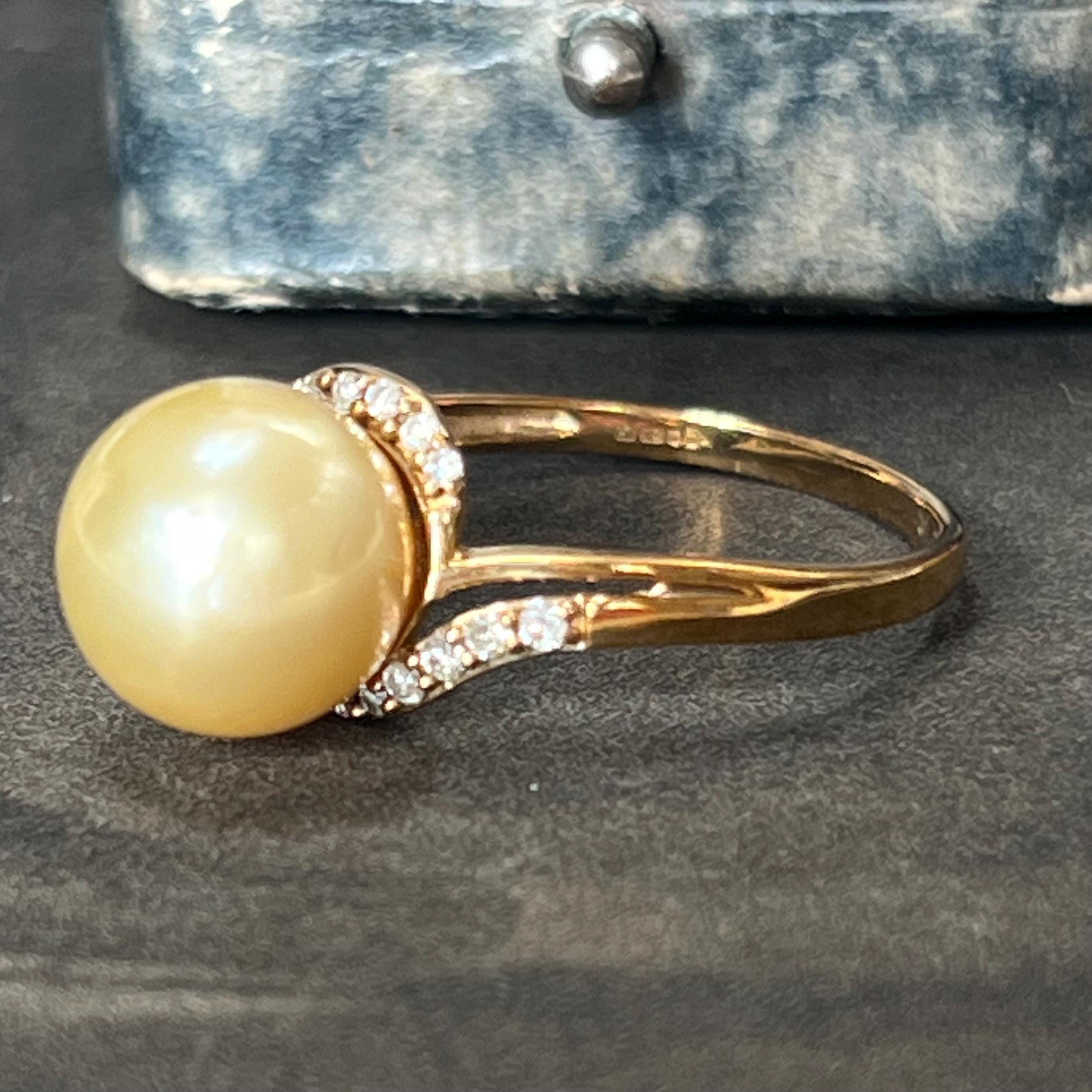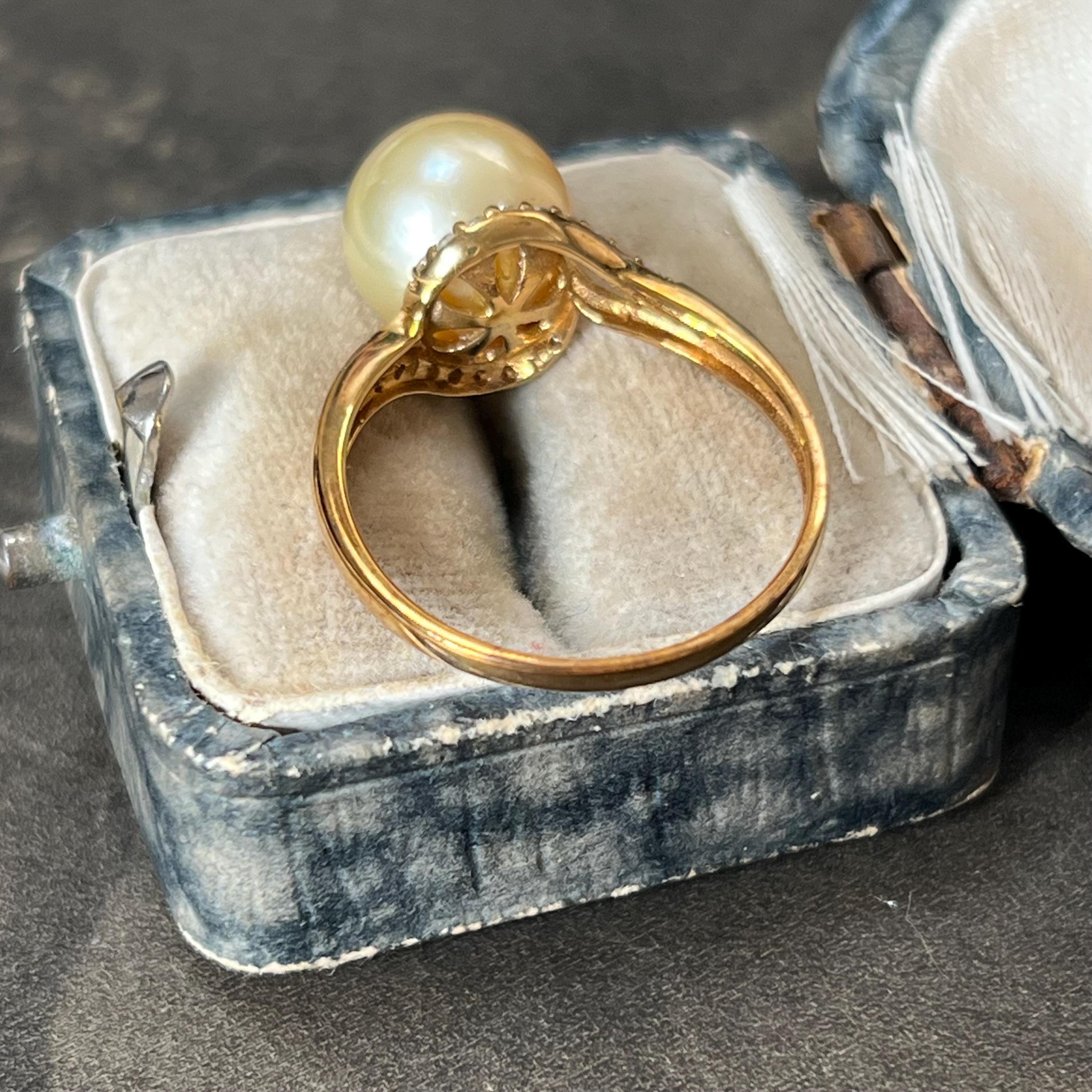 The diamonds, with an estimated total carat weight of 0.18ct, add a brilliant, scintillating touch to the ring, enhancing its overall radiance. Each diamond sparkles with a fiery brilliance, complementing the pearl's natural splendor.