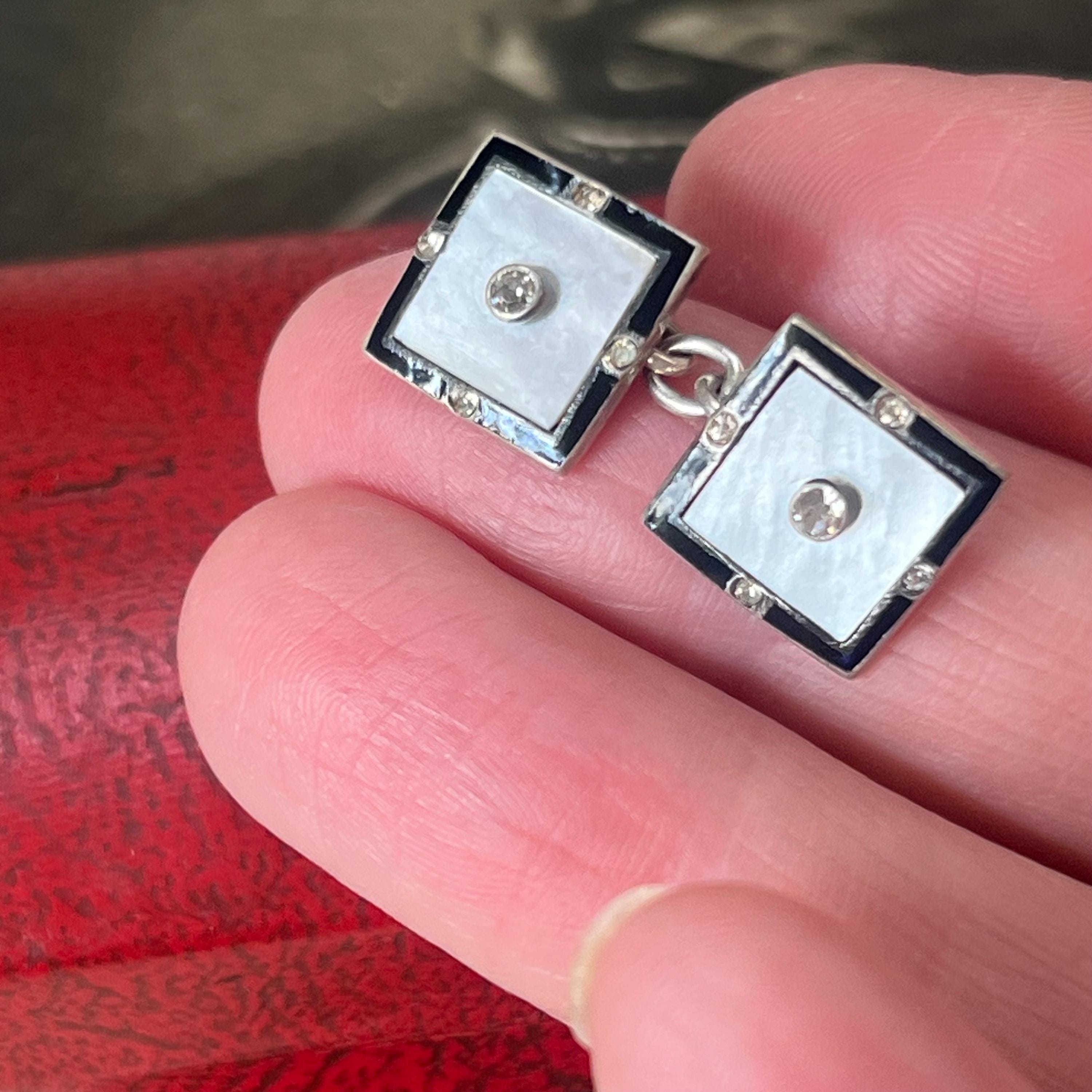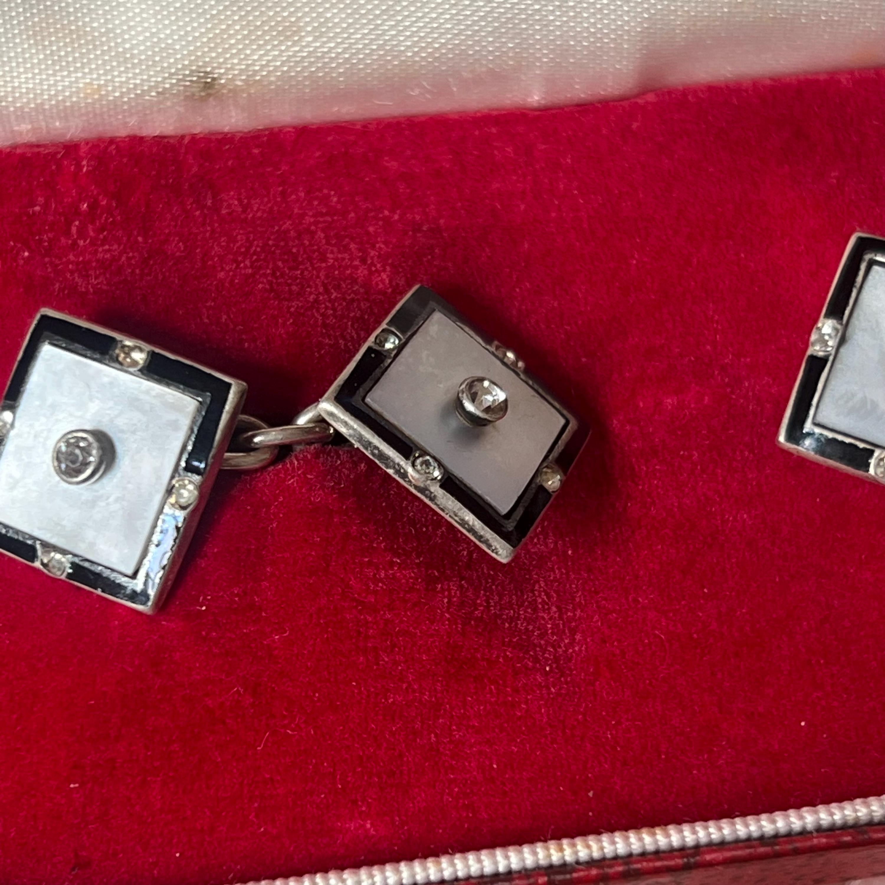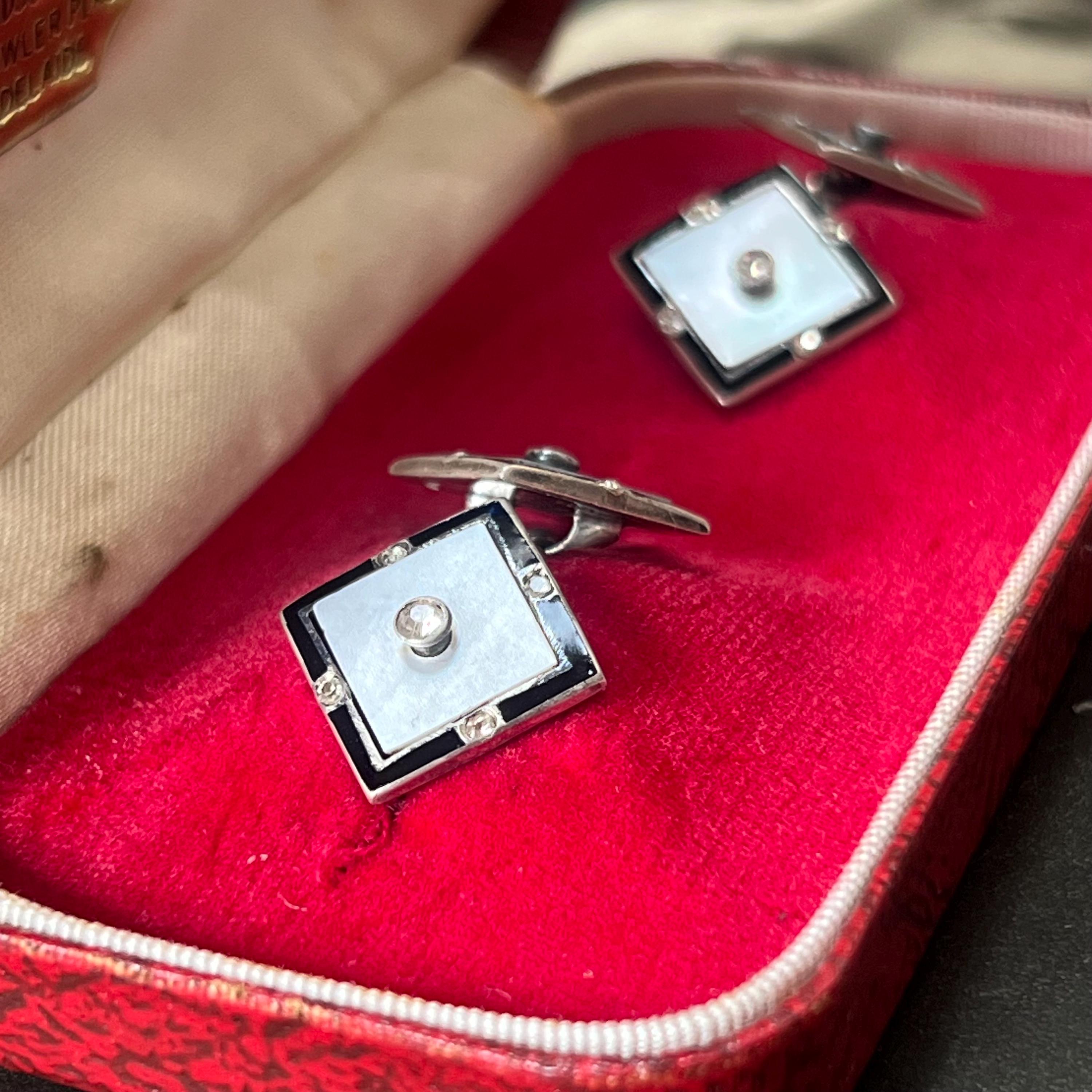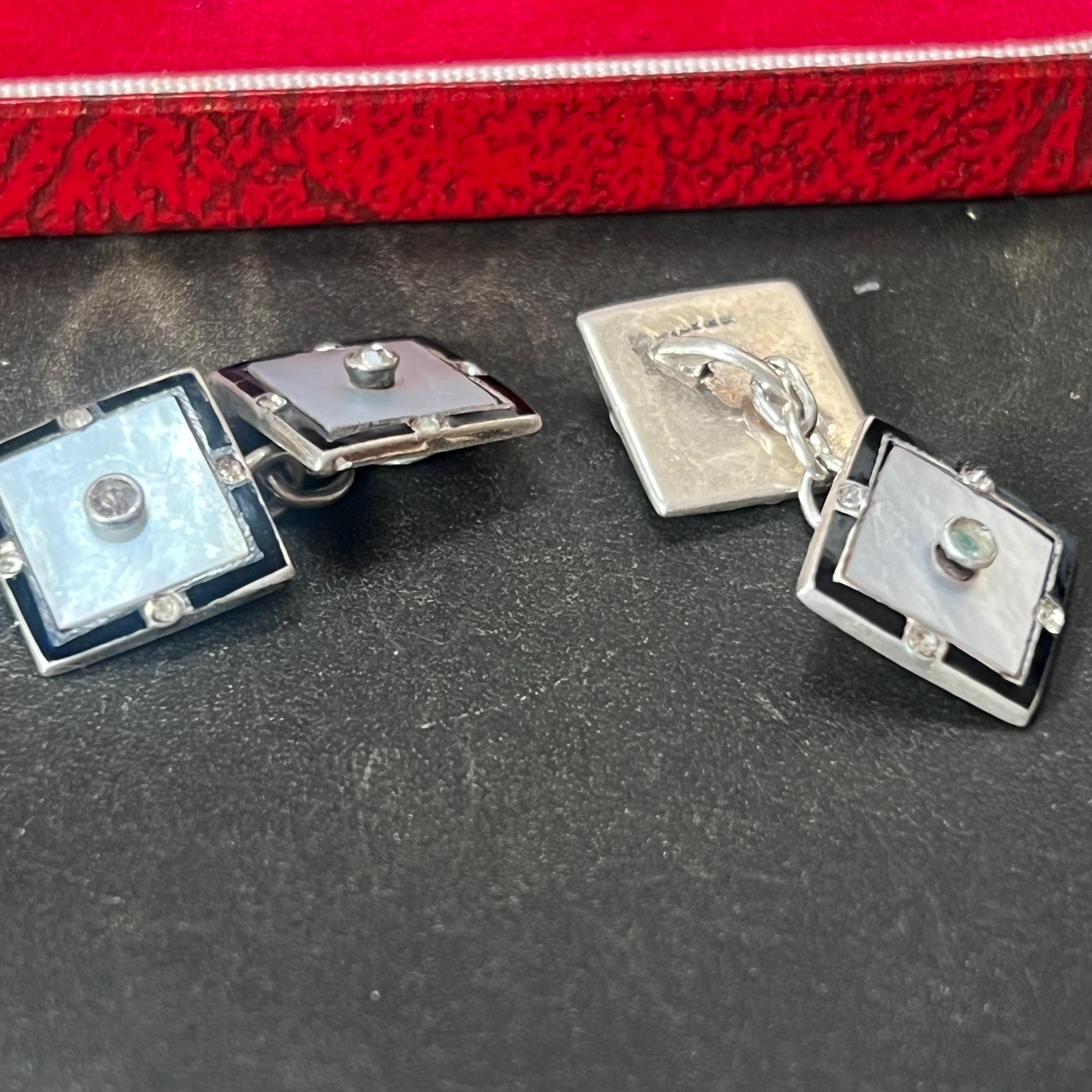 Art Deco silver and enamel mother of pearl cufflinks in original red box. These are a stunning old classic pair of cufflinks from the early 20th Century, Art Deco era. Each is set with small paste stones at quarter points between the black enamel edging. To the middle there is a small square of mother of pearl and a centre set paste stone. The cufflinks are chain back and stamped ‘silver’ and have a combined weight of 6.7 grams. There is normal and associated historic wear commensurate with pieces of this era but overall in good antique condition.
