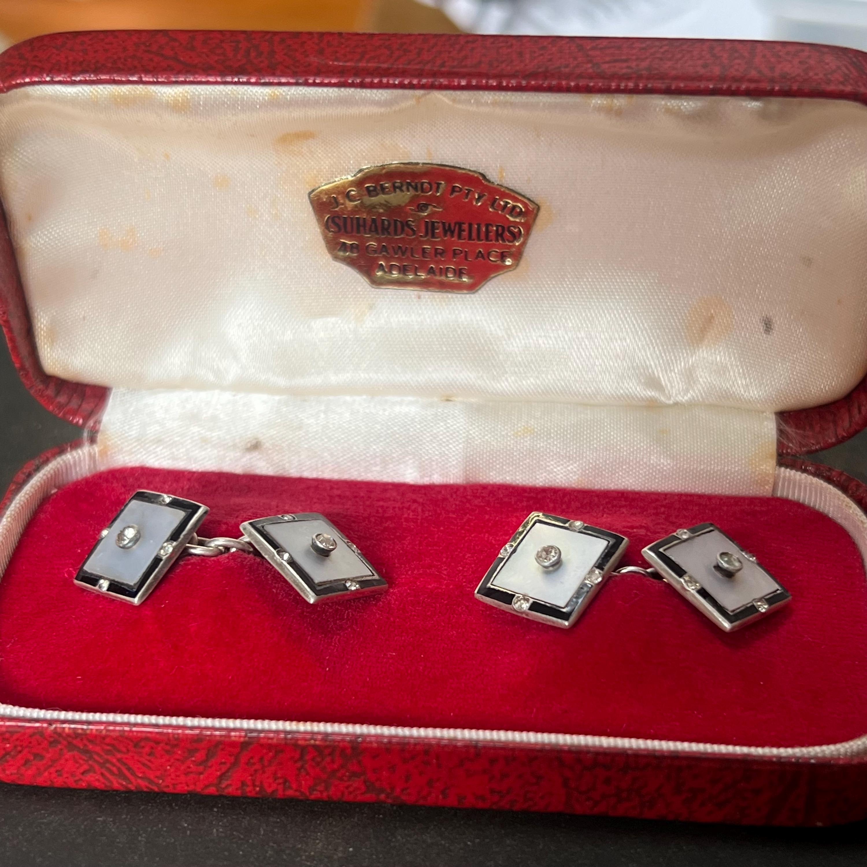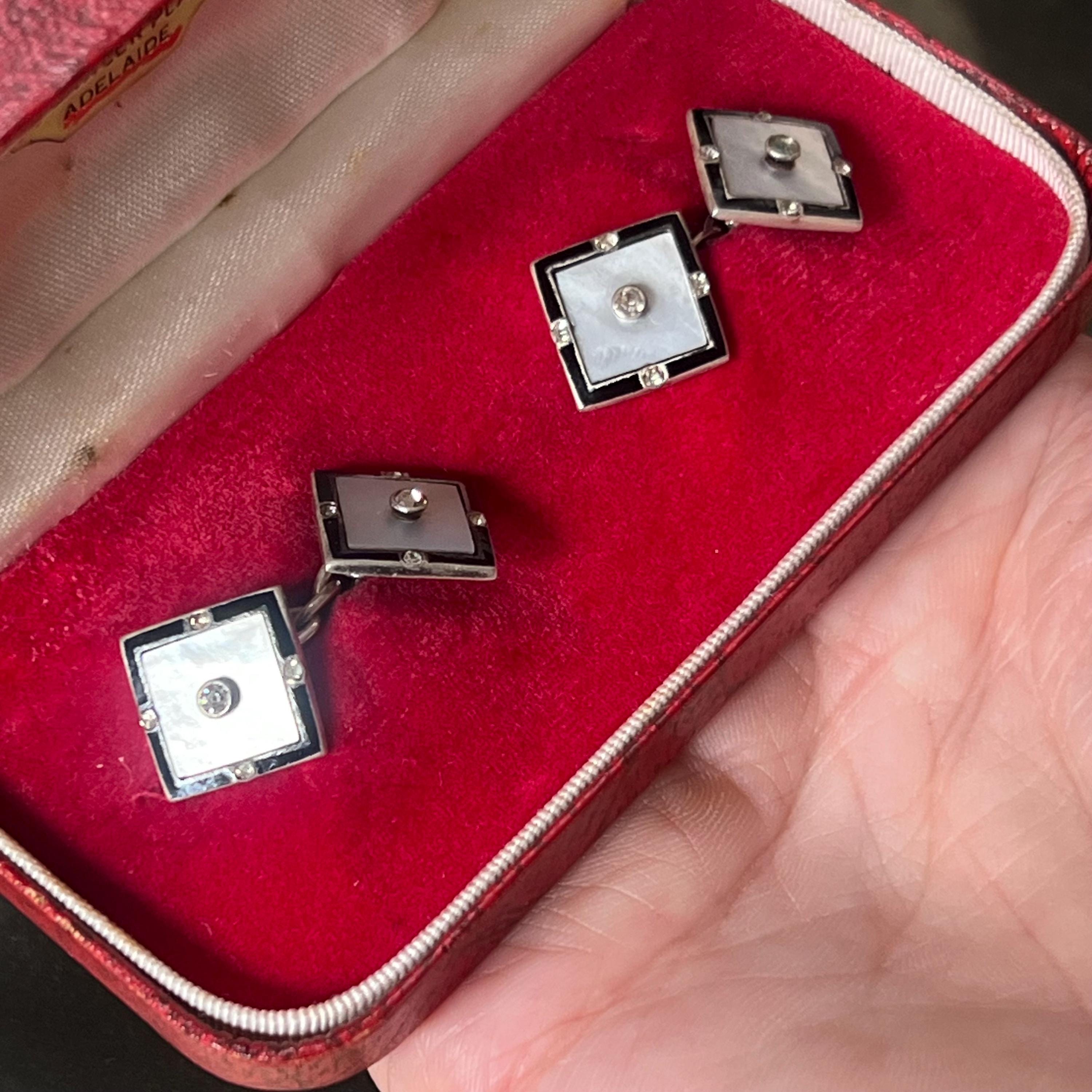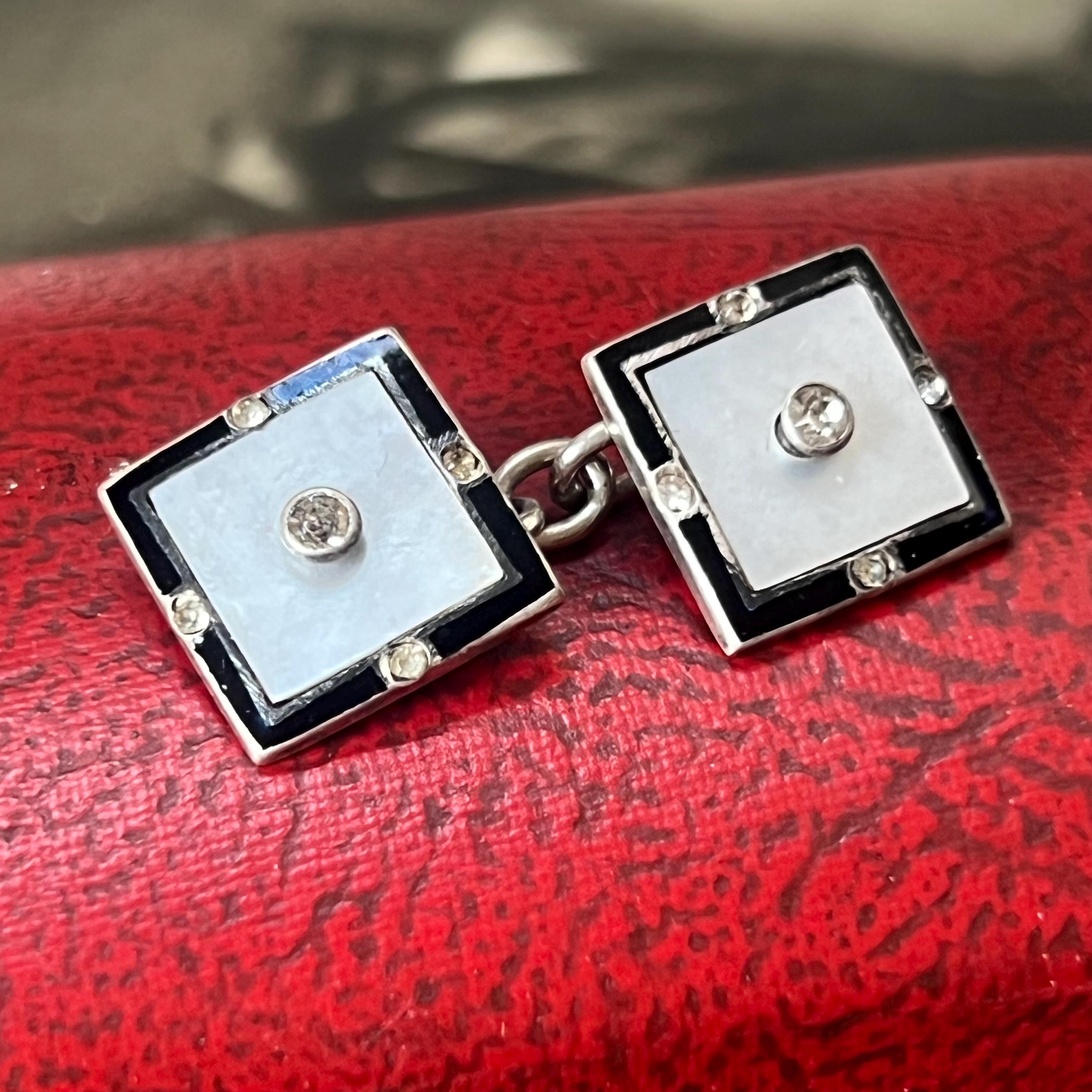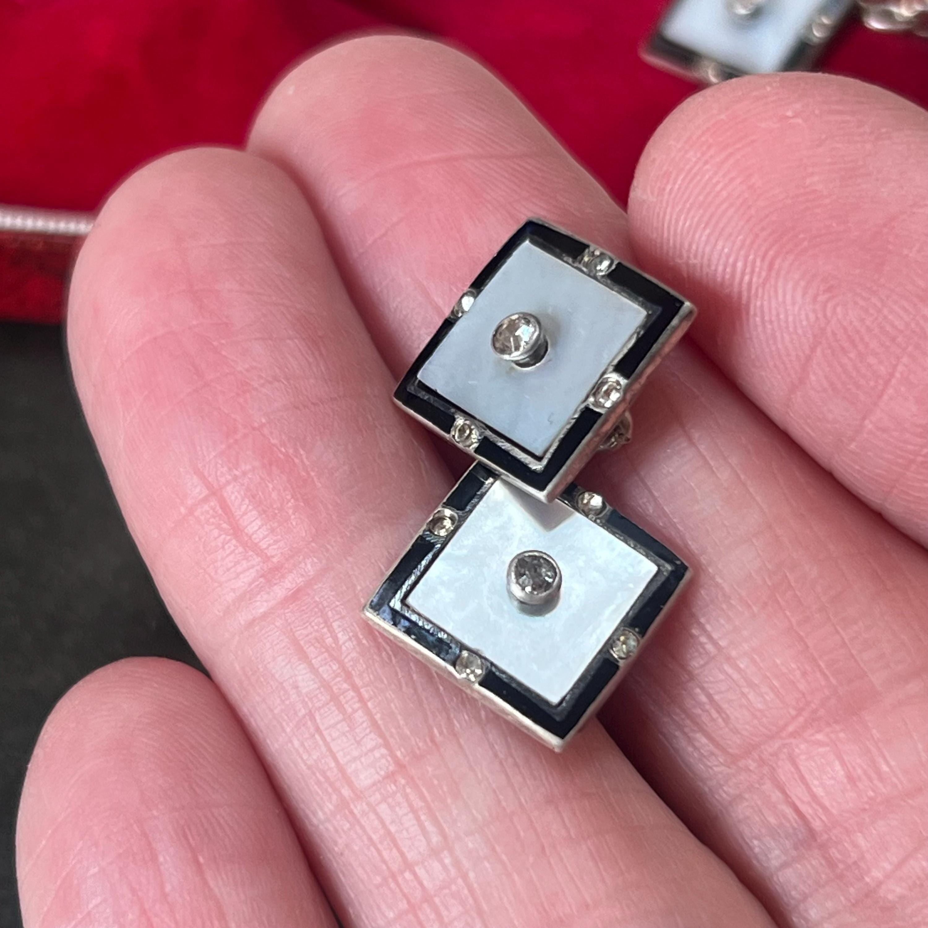 Art Deco silver and enamel mother of pearl cufflinks in original red box. These are a stunning old classic pair of cufflinks from the early 20th Century, Art Deco era. Each is set with small paste stones at quarter points between the black enamel edging. To the middle there is a small square of mother of pearl and a centre set paste stone. The cufflinks are chain back and stamped ‘silver’ and have a combined weight of 6.7 grams. There is normal and associated historic wear commensurate with pieces of this era but overall in good antique condition.
