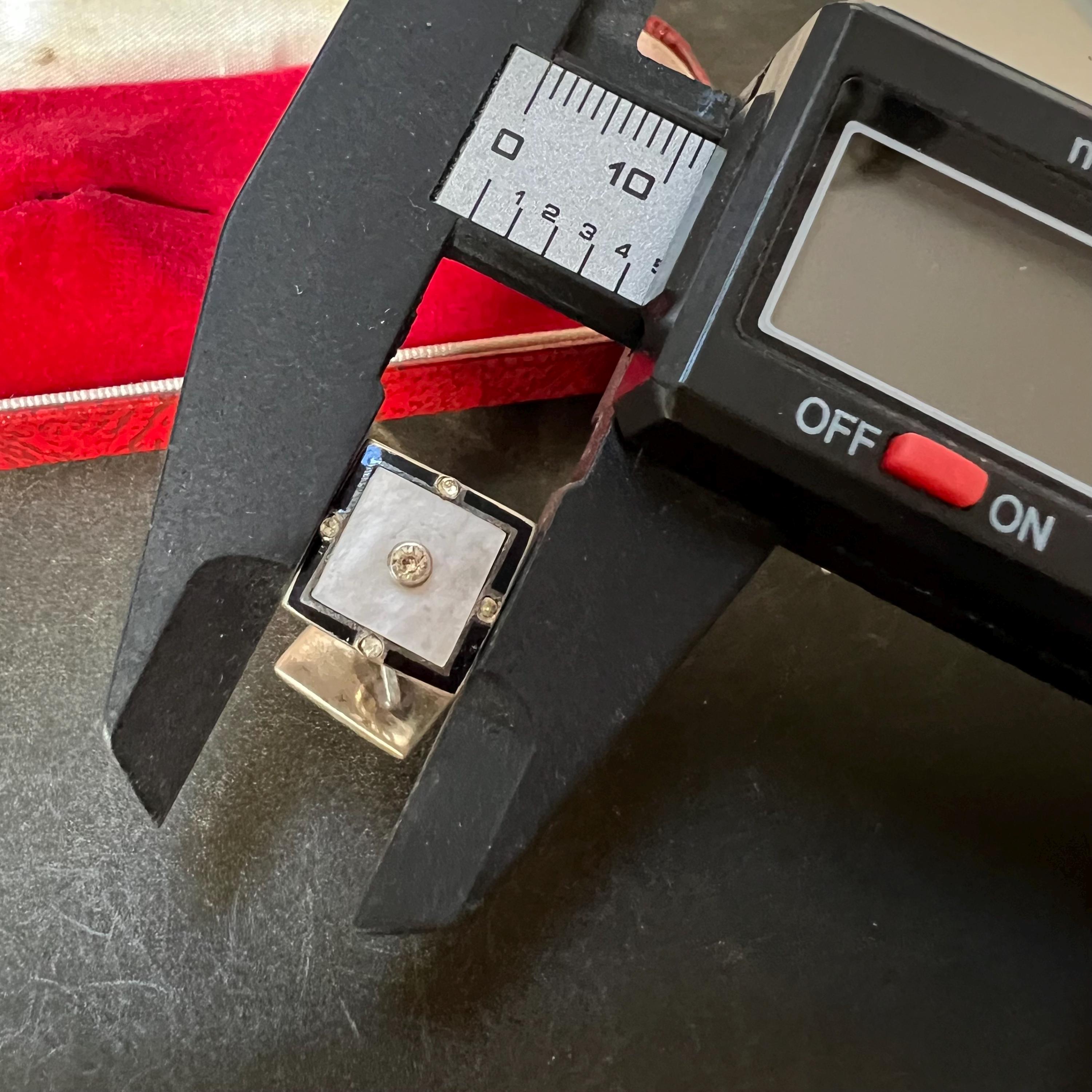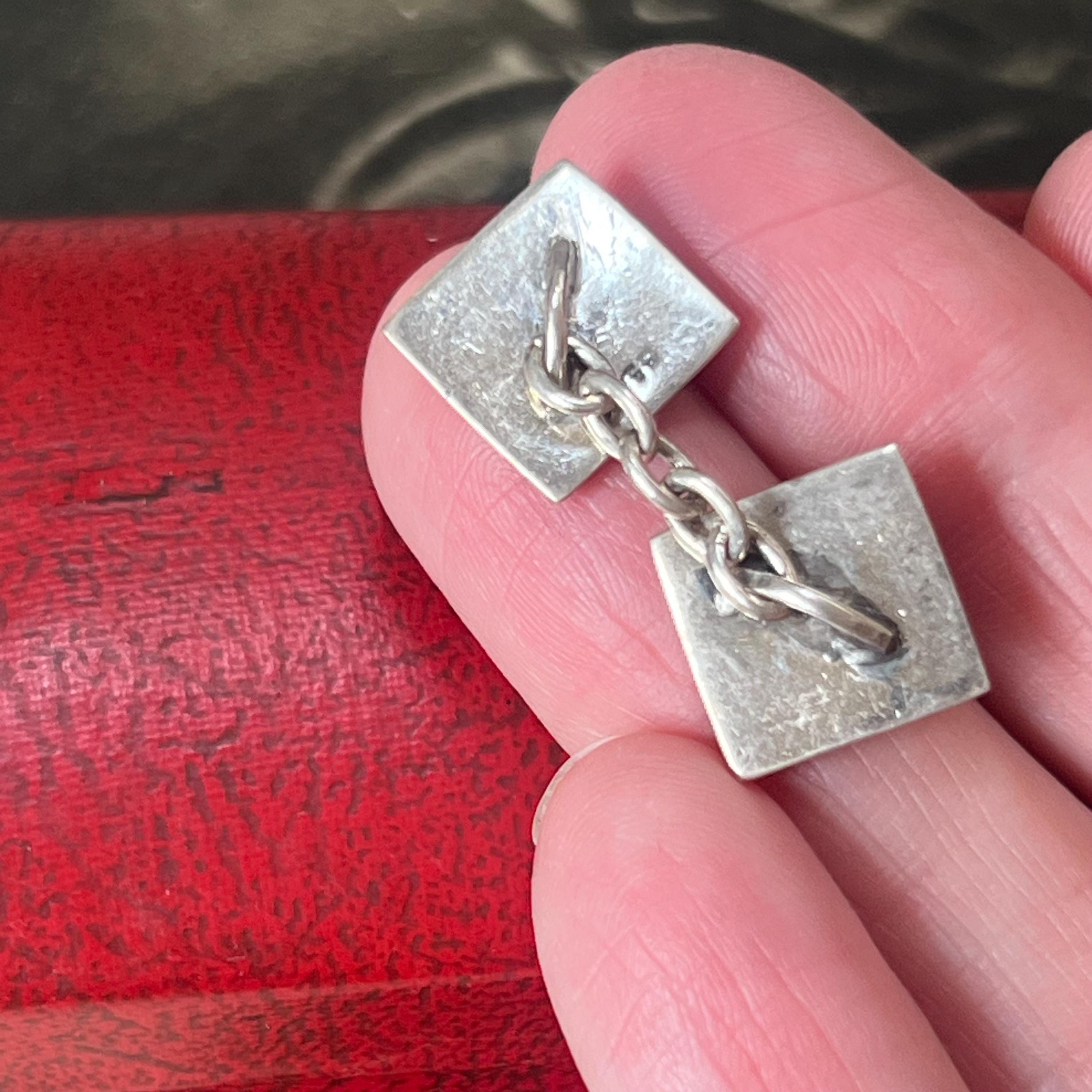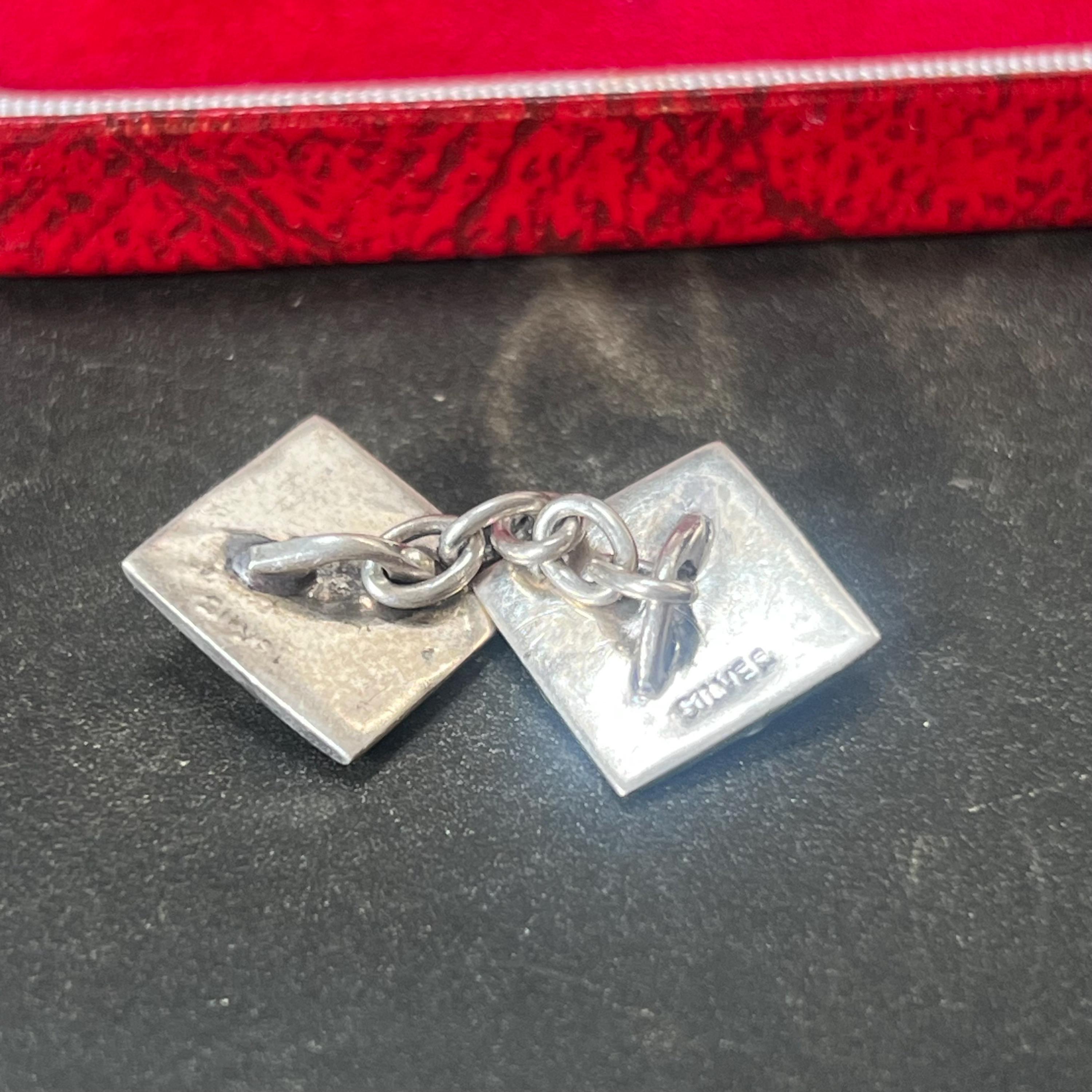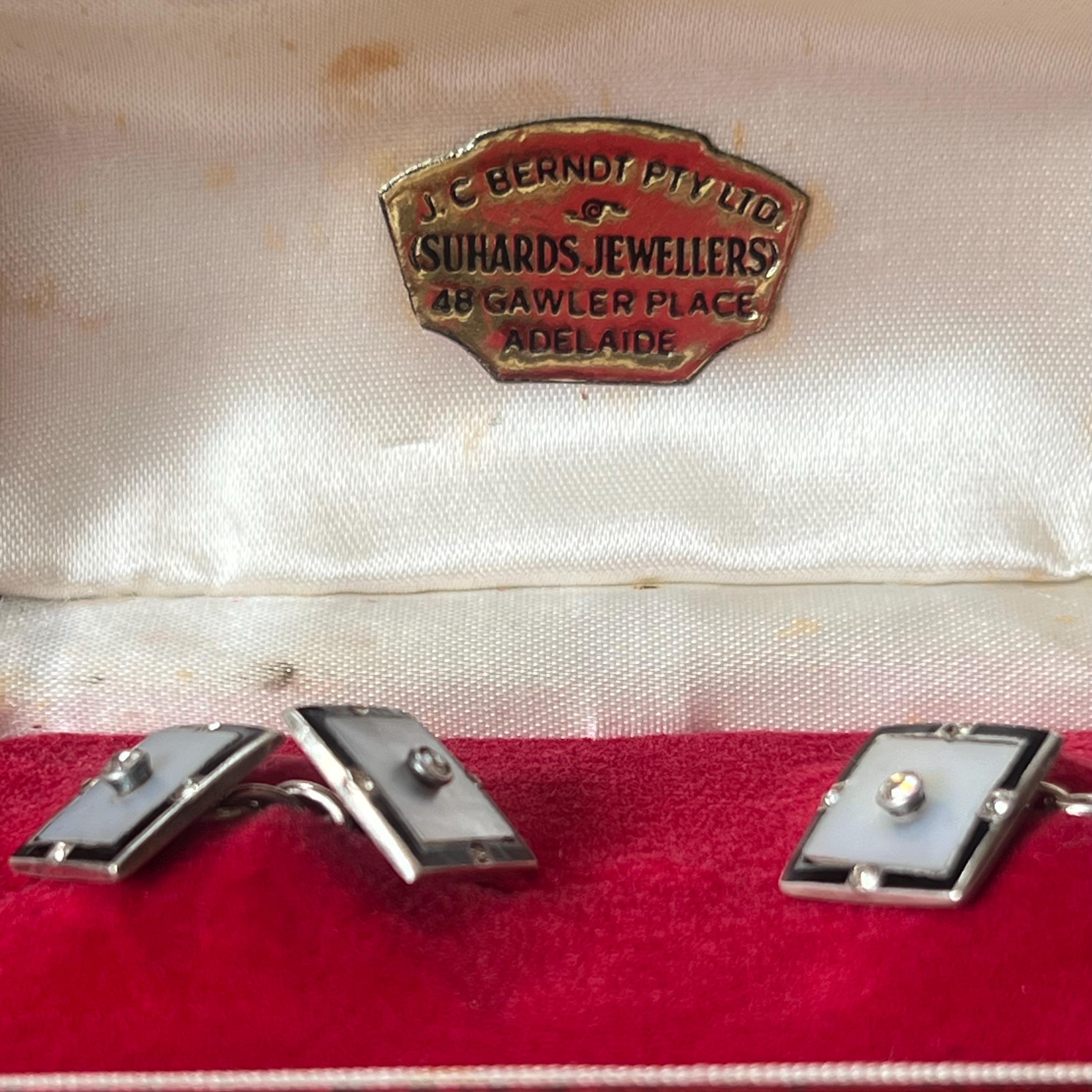 Art Deco silver and enamel mother of pearl cufflinks in original red box. These are a stunning old classic pair of cufflinks from the early 20th Century, Art Deco era. Each is set with small paste stones at quarter points between the black enamel edging. To the middle there is a small square of mother of pearl and a centre set paste stone. The cufflinks are chain back and stamped ‘silver’ and have a combined weight of 6.7 grams. There is normal and associated historic wear commensurate with pieces of this era but overall in good antique condition.