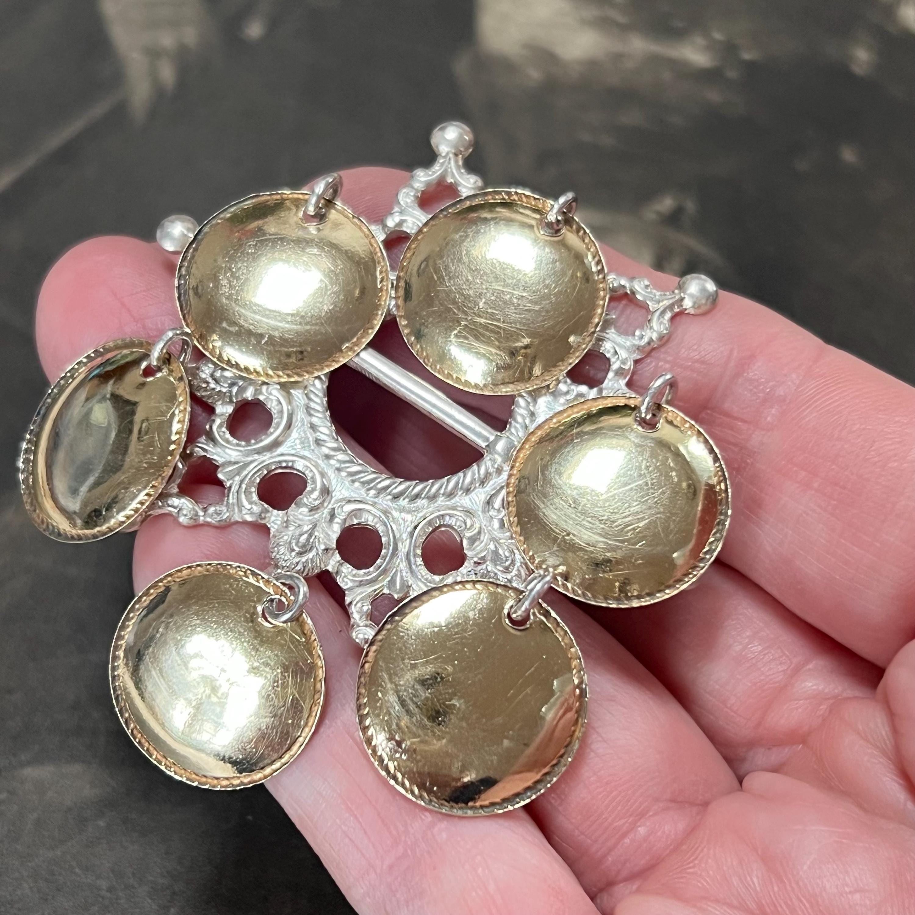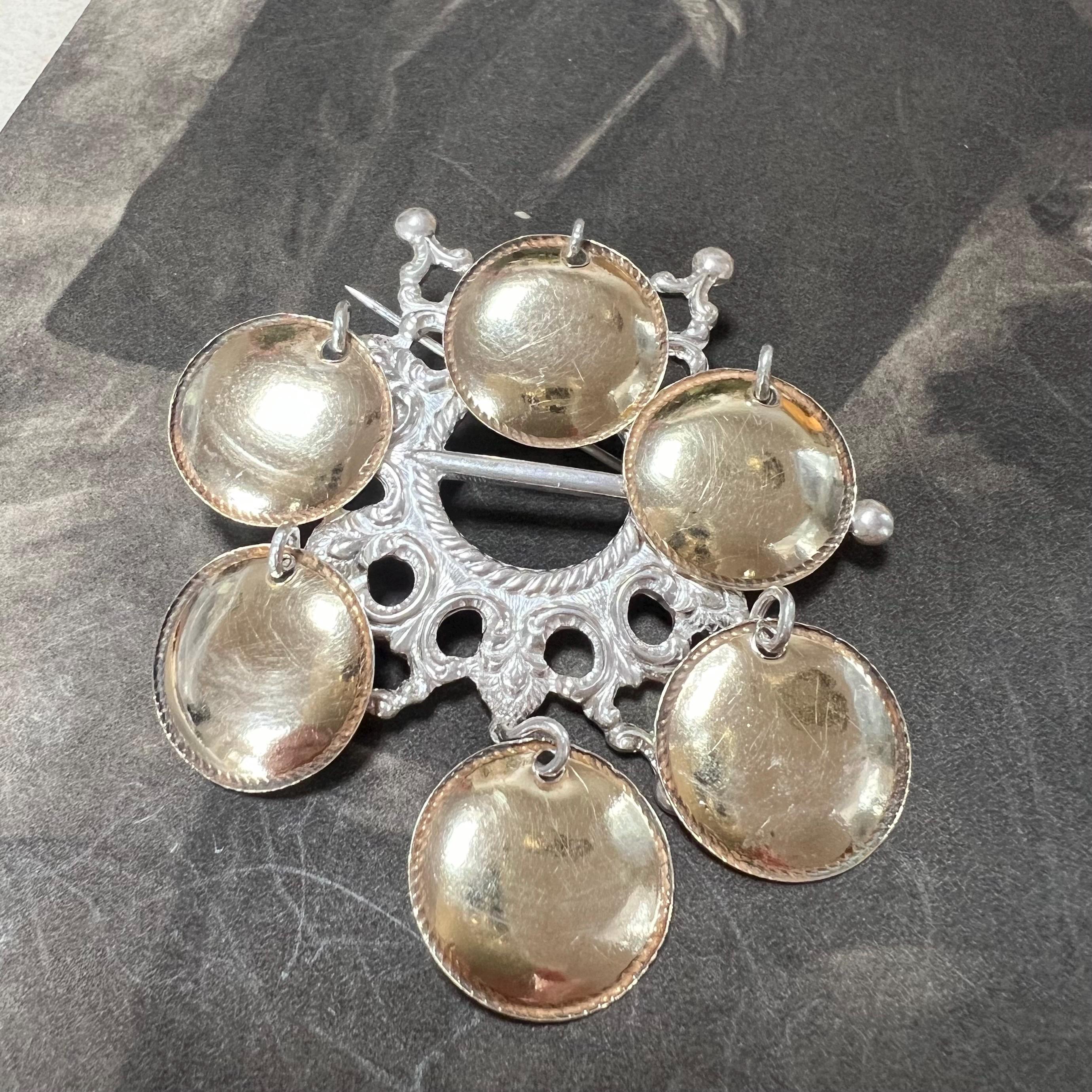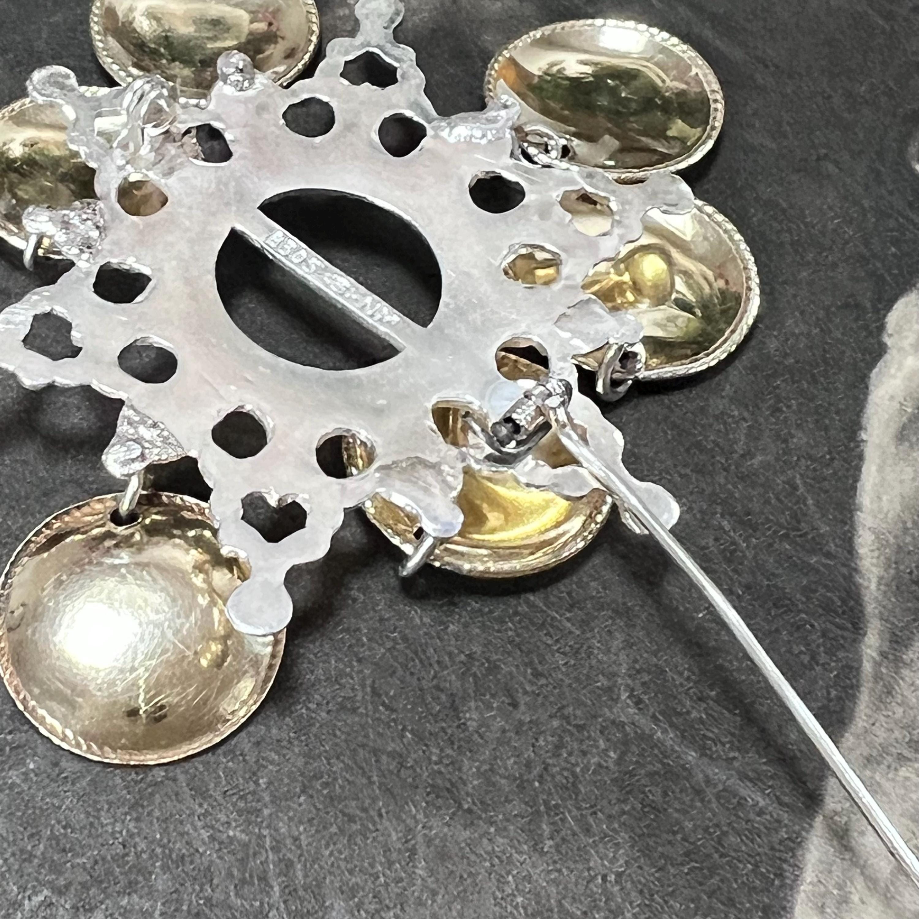 Large Silver and Gilt Antique Snowflake Solje Brooch 830S Norwegian silver. A stunning and older Solje brooch in a snowflake design. Stamped to the back ‘830’ and ‘NM’. The mark NM often represents an abbreviation of ‘Norskt Monster’ meaning; Norwegian Pattern. It is a kind of copyright mark for Norway.
