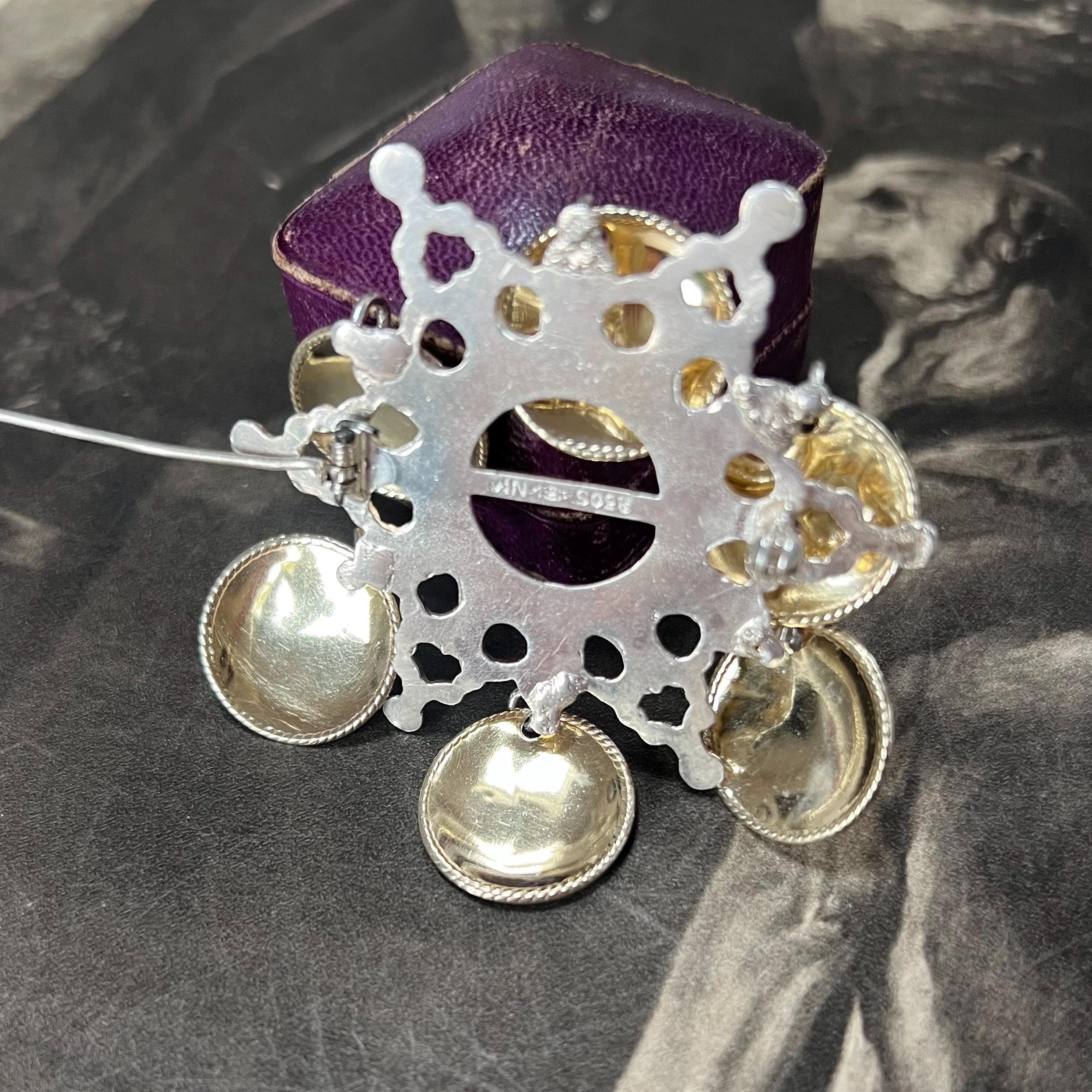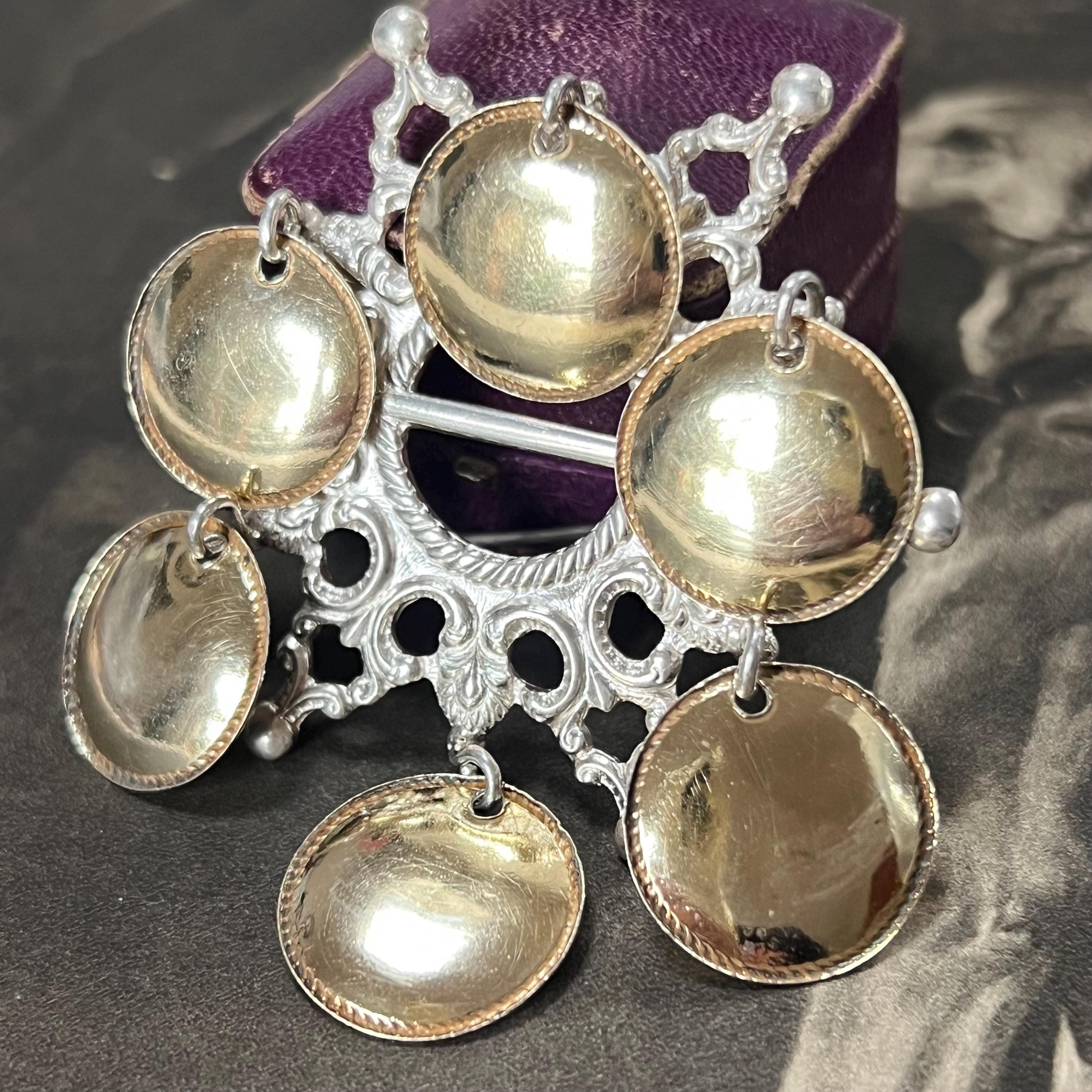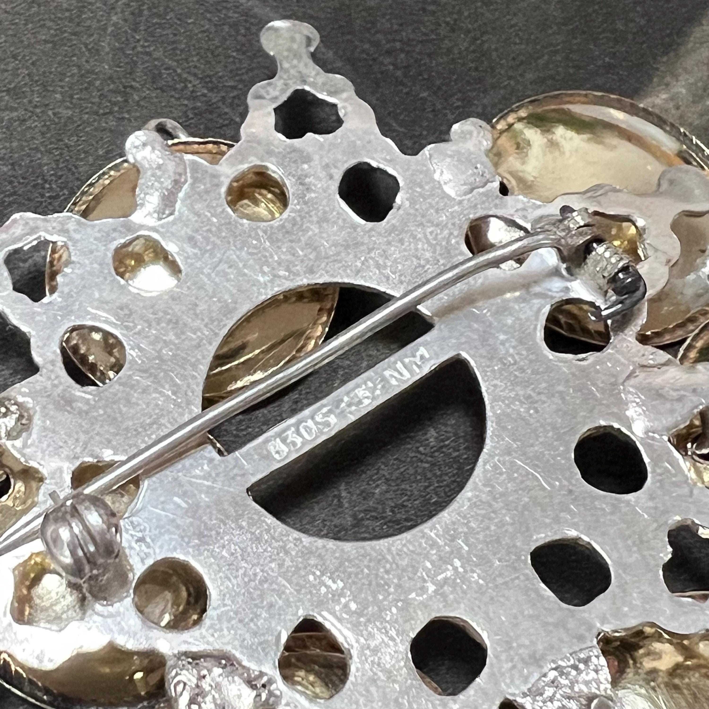 Large Silver and Gilt Antique Snowflake Solje Brooch 830S Norwegian silver. A stunning and older Solje brooch in a snowflake design. Stamped to the back ‘830’ and ‘NM’. The mark NM often represents an abbreviation of ‘Norskt Monster’ meaning; Norwegian Pattern. It is a kind of copyright mark for Norway.