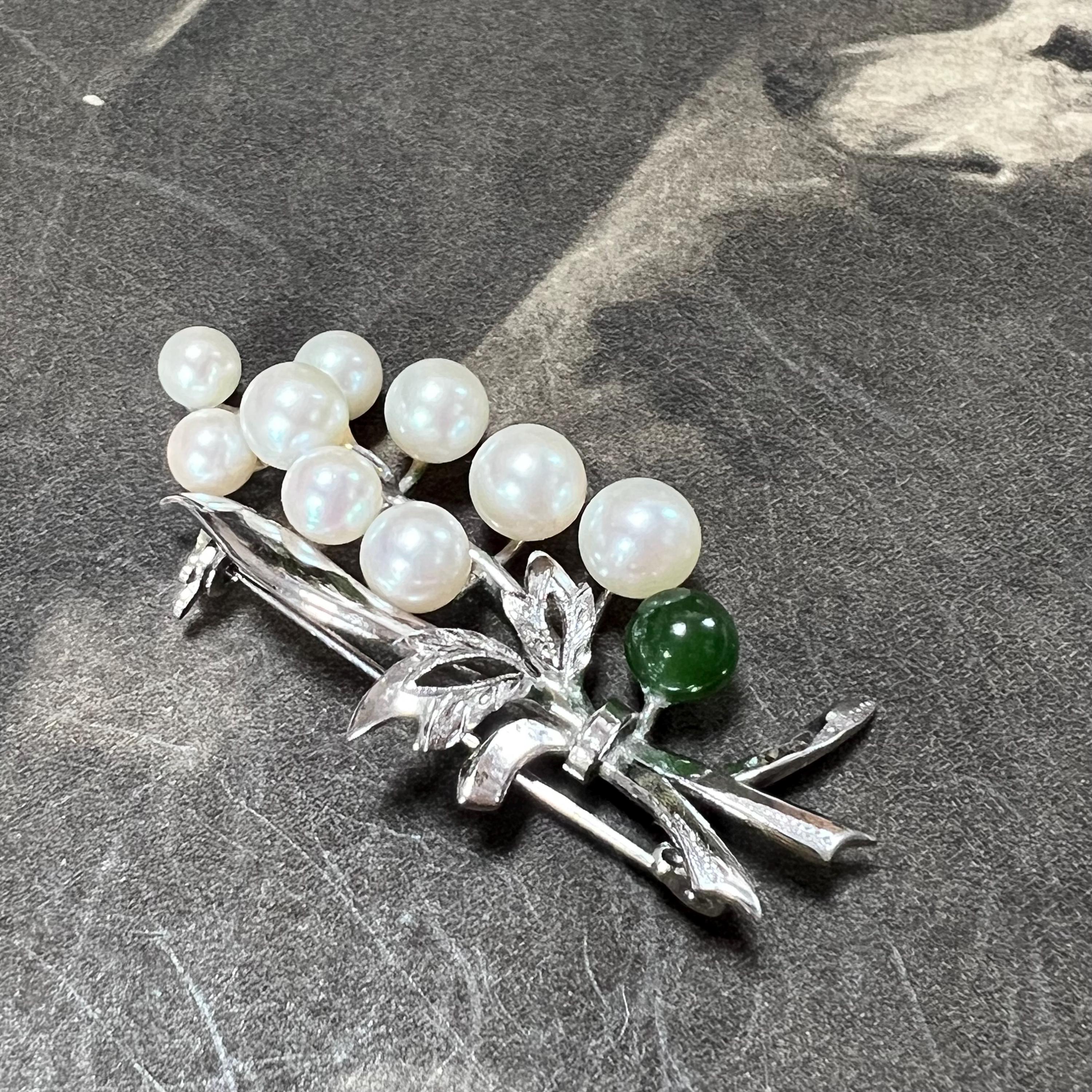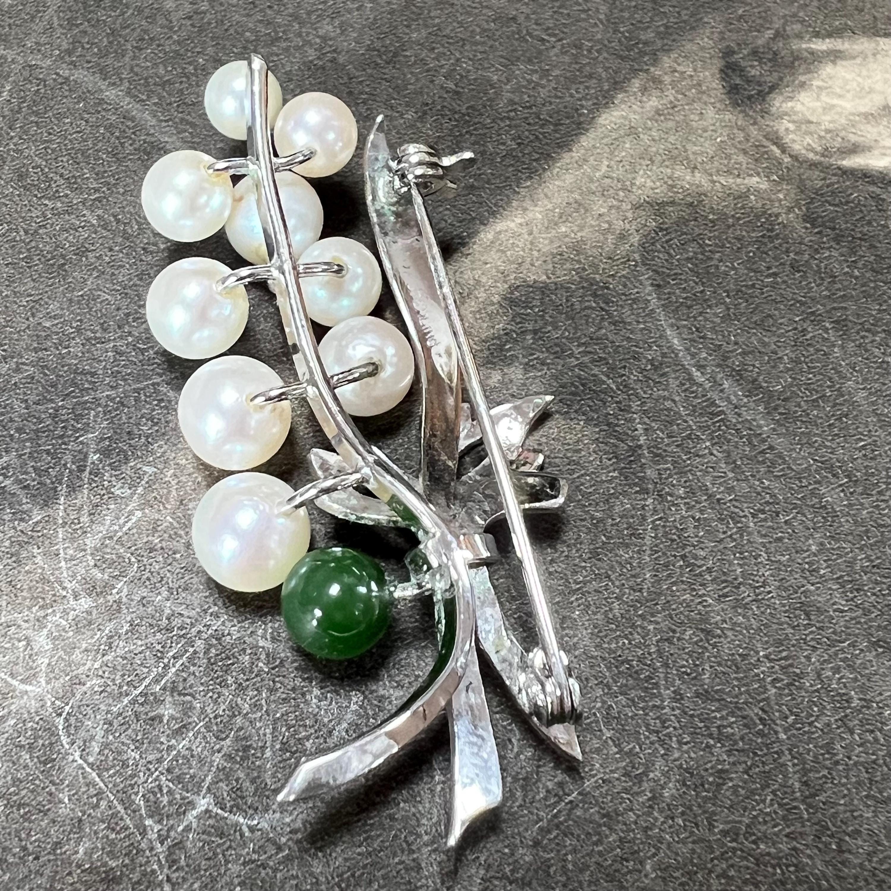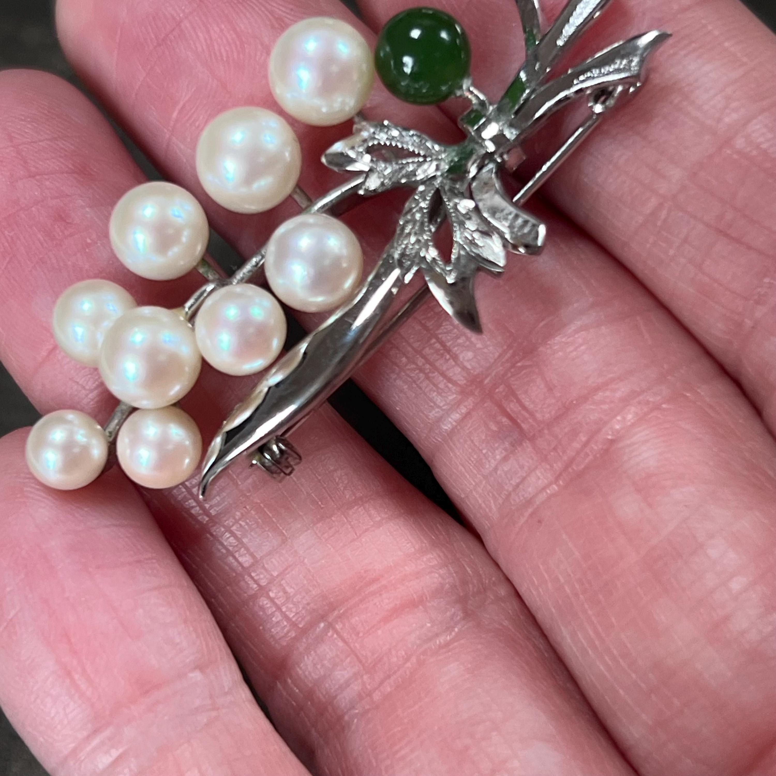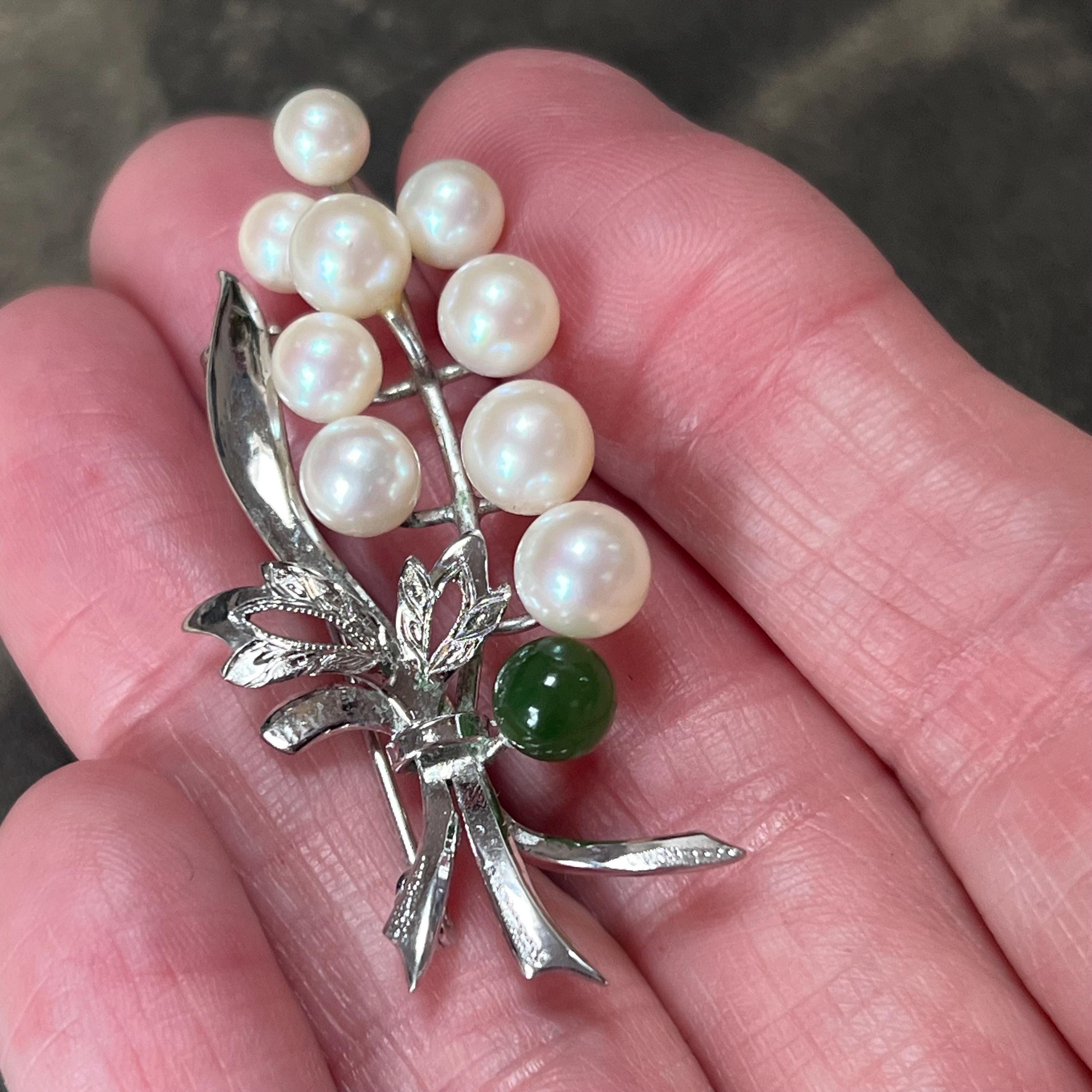 Vintage silver and jade Akoya saltwater pearl brooch. A stunning brooch set with an array of fine grade akoya cultured pearls to a spray of silver designed as a floral tribute having a single nephrite jade to one point as a counter balance that reflects the colours of nature. The brooch has a total of 9 x saltwater pearls with a size range of 7 - 9 mm. The brooch measures 49 mm long by 25 mm wide at its longest and widest points. A pin to the back with a roll over safety catch makes it secure to wear. Stamped ‘sterling’ to the back this brooch is in excellent vintage condition, circa 1960s - 1970s and has a weight of 7.4 grams.