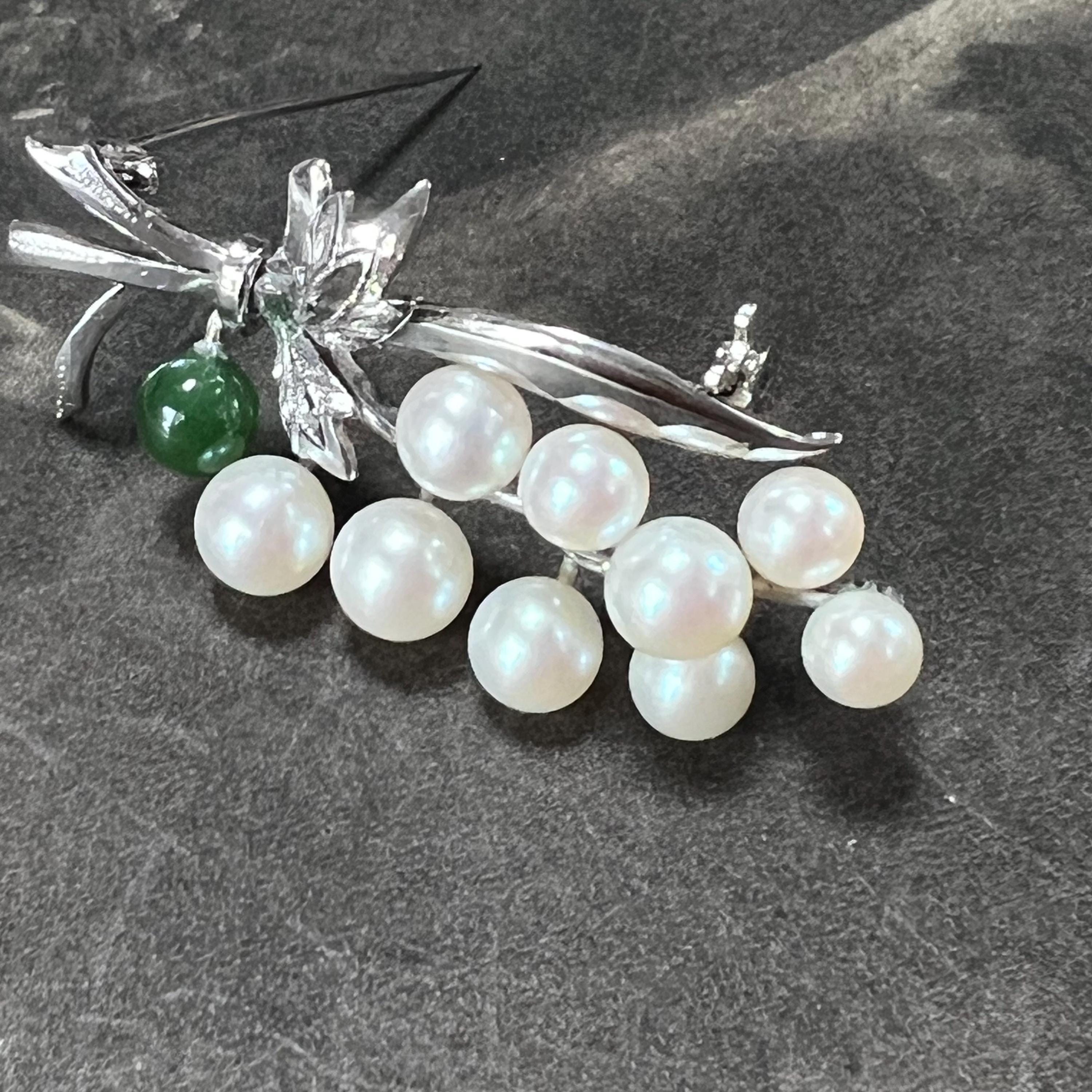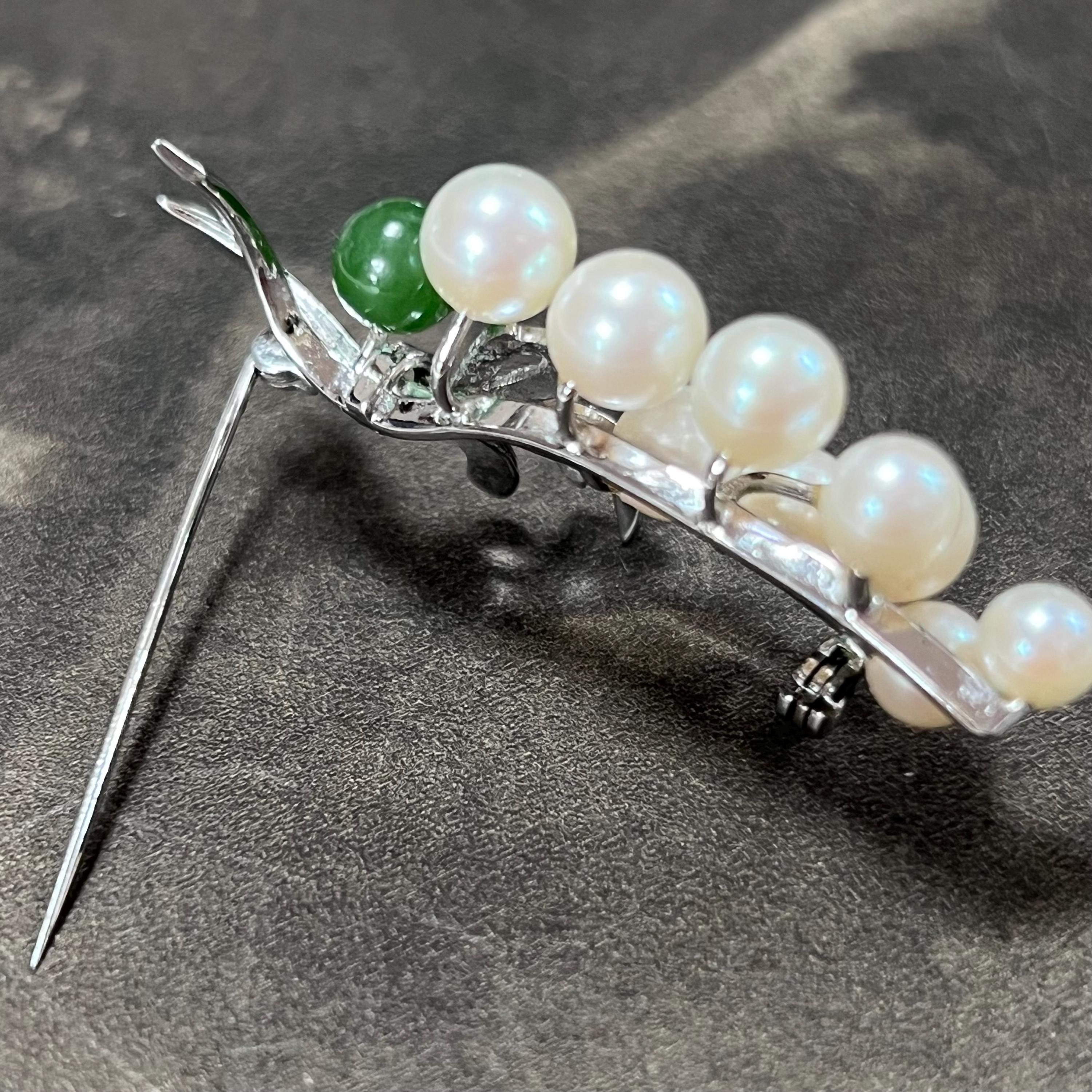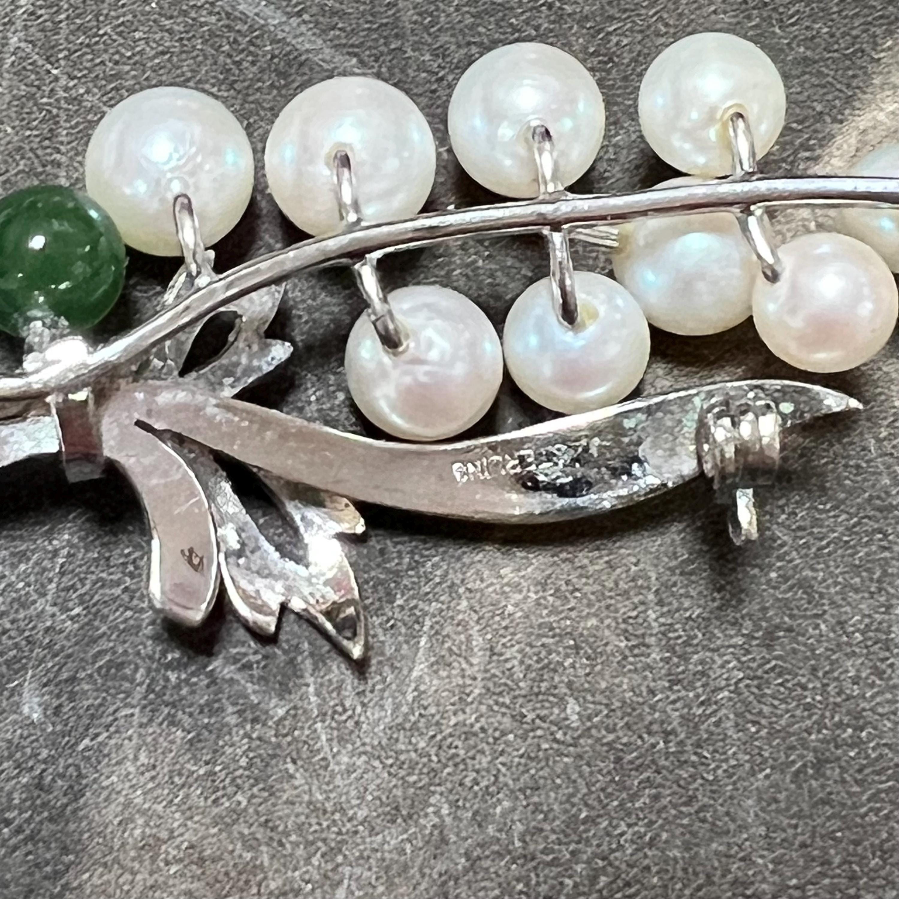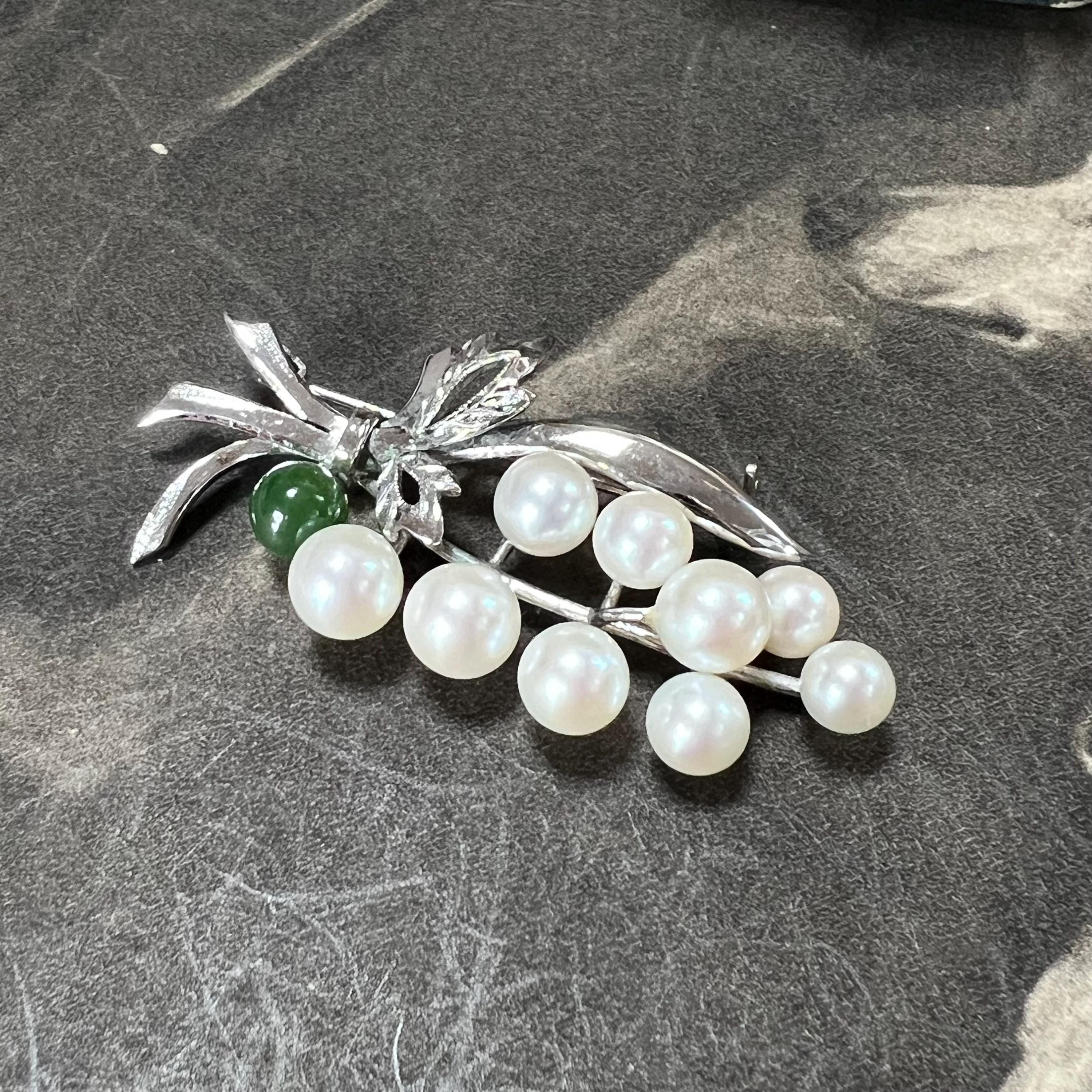 Vintage silver and jade Akoya saltwater pearl brooch. A stunning brooch set with an array of fine grade akoya cultured pearls to a spray of silver designed as a floral tribute having a single nephrite jade to one point as a counter balance that reflects the colours of nature. The brooch has a total of 9 x saltwater pearls with a size range of 7 - 9 mm. The brooch measures 49 mm long by 25 mm wide at its longest and widest points. A pin to the back with a roll over safety catch makes it secure to wear. Stamped ‘sterling’ to the back this brooch is in excellent vintage condition, circa 1960s - 1970s and has a weight of 7.4 grams.