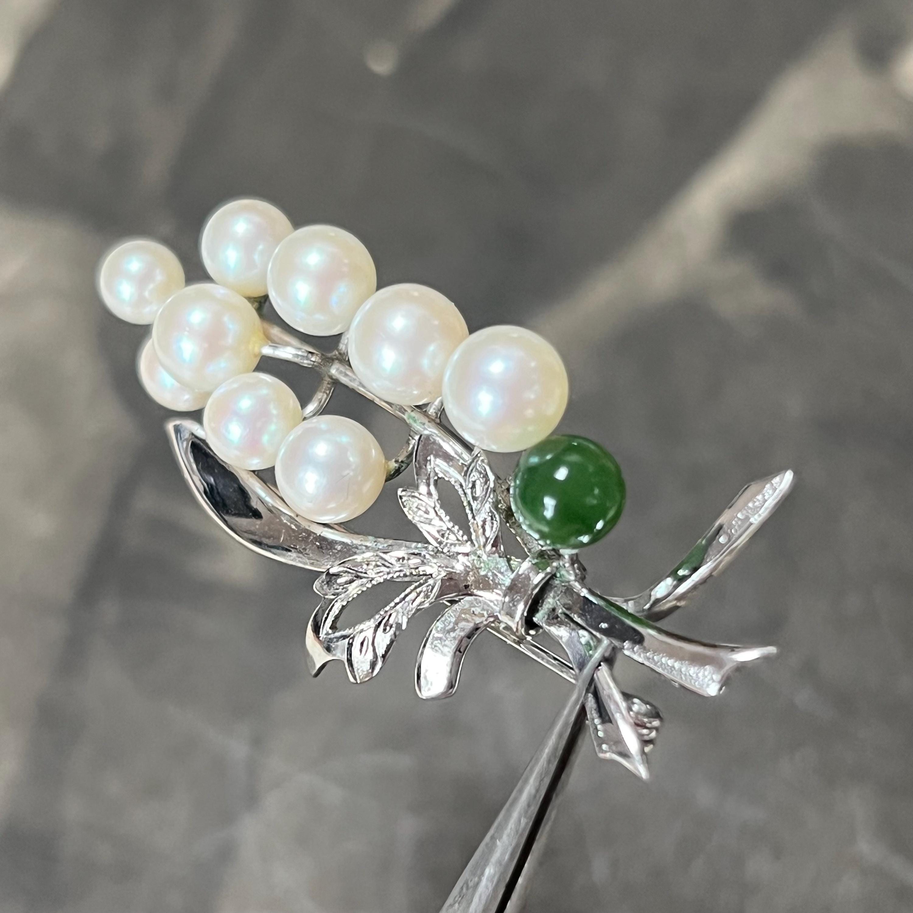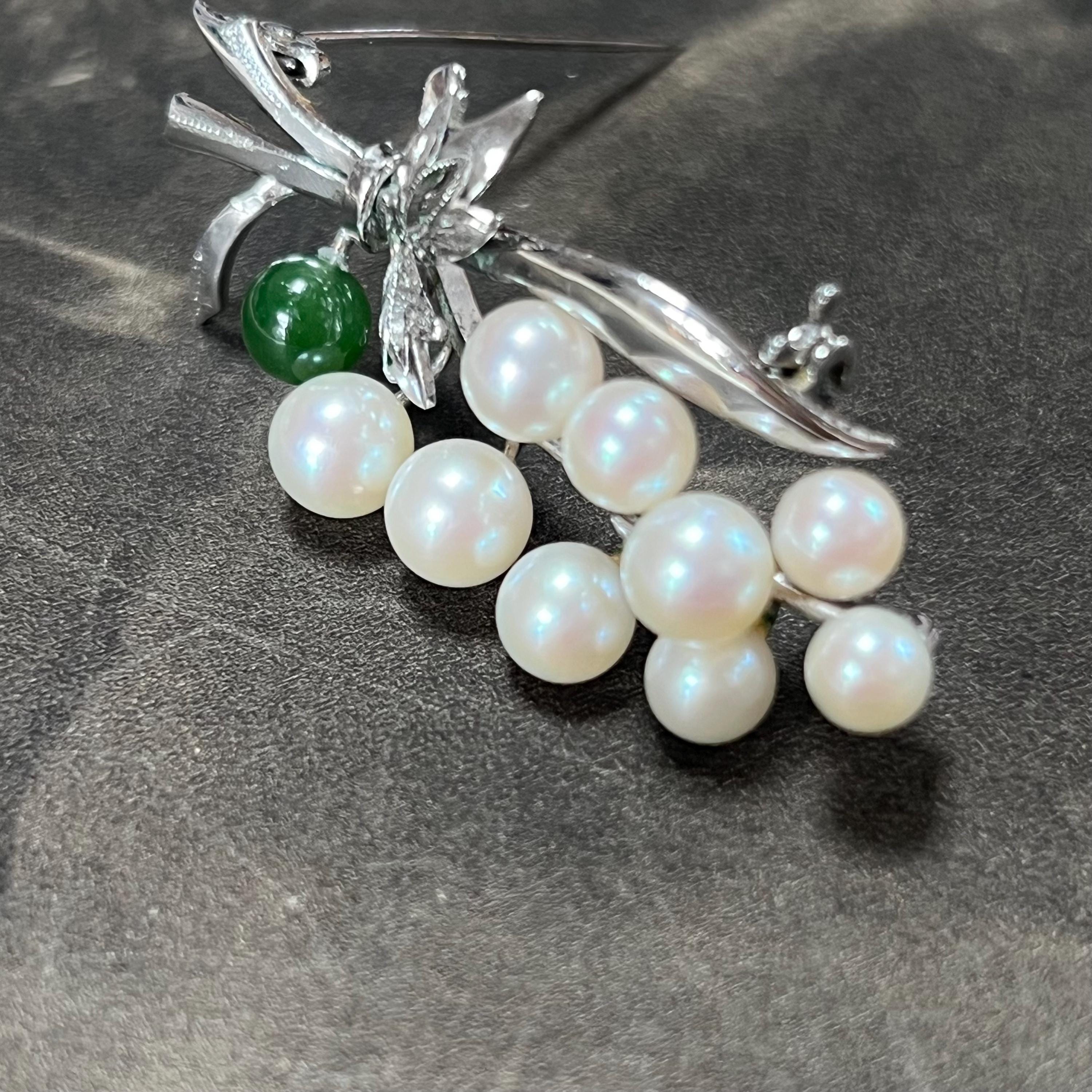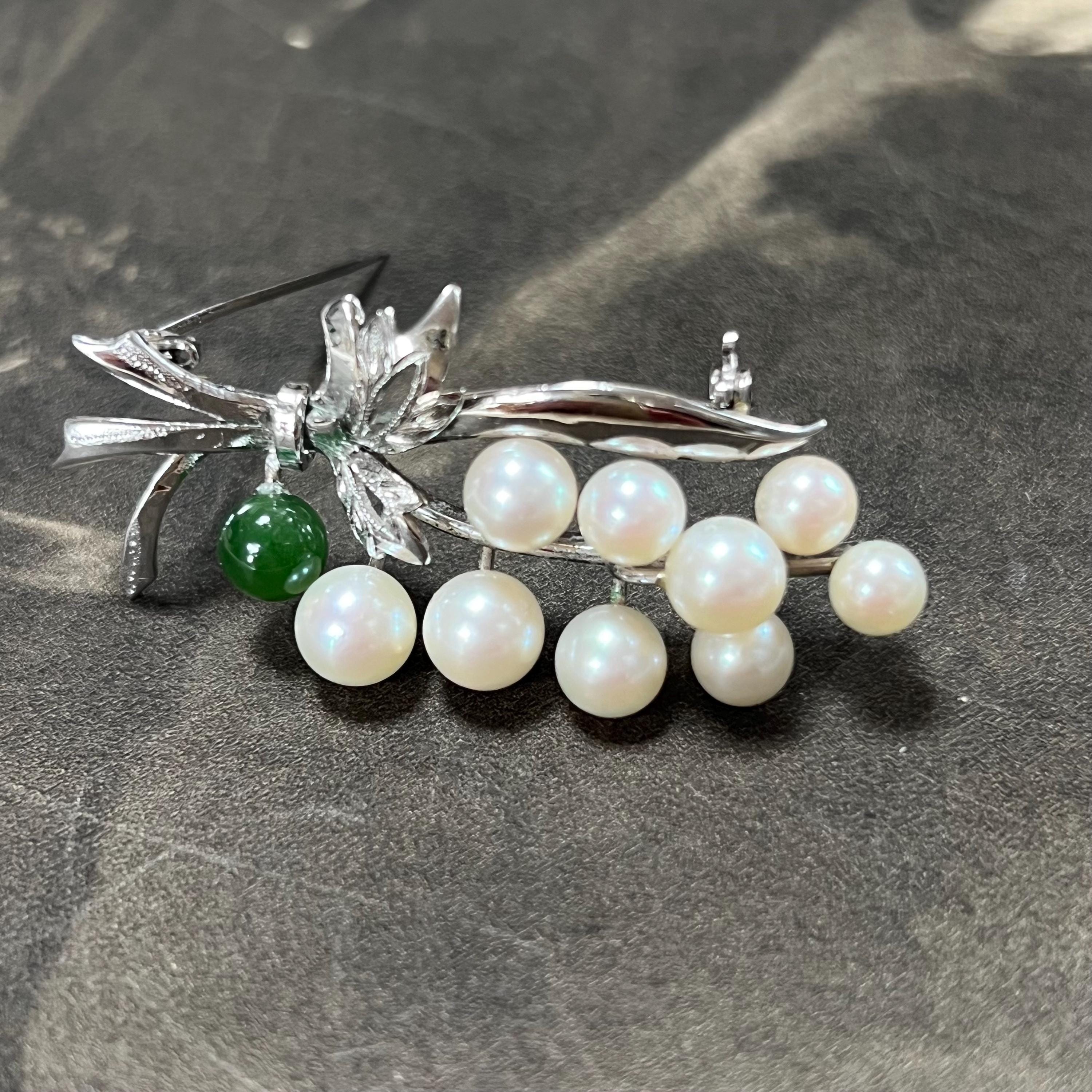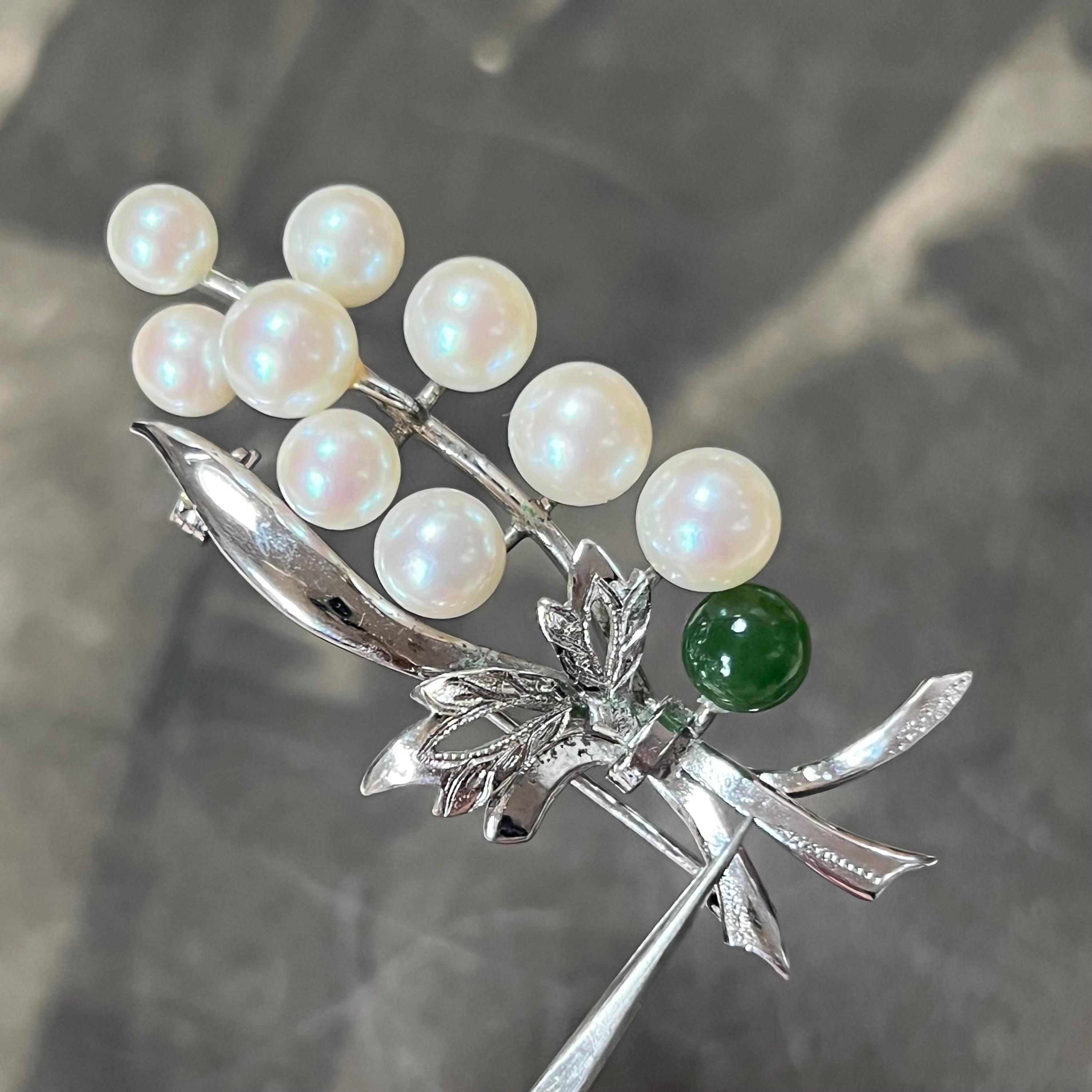 Vintage silver and jade Akoya saltwater pearl brooch. A stunning brooch set with an array of fine grade akoya cultured pearls to a spray of silver designed as a floral tribute having a single nephrite jade to one point as a counter balance that reflects the colours of nature. The brooch has a total of 9 x saltwater pearls with a size range of 7 - 9 mm. The brooch measures 49 mm long by 25 mm wide at its longest and widest points. A pin to the back with a roll over safety catch makes it secure to wear. Stamped ‘sterling’ to the back this brooch is in excellent vintage condition, circa 1960s - 1970s and has a weight of 7.4 grams.