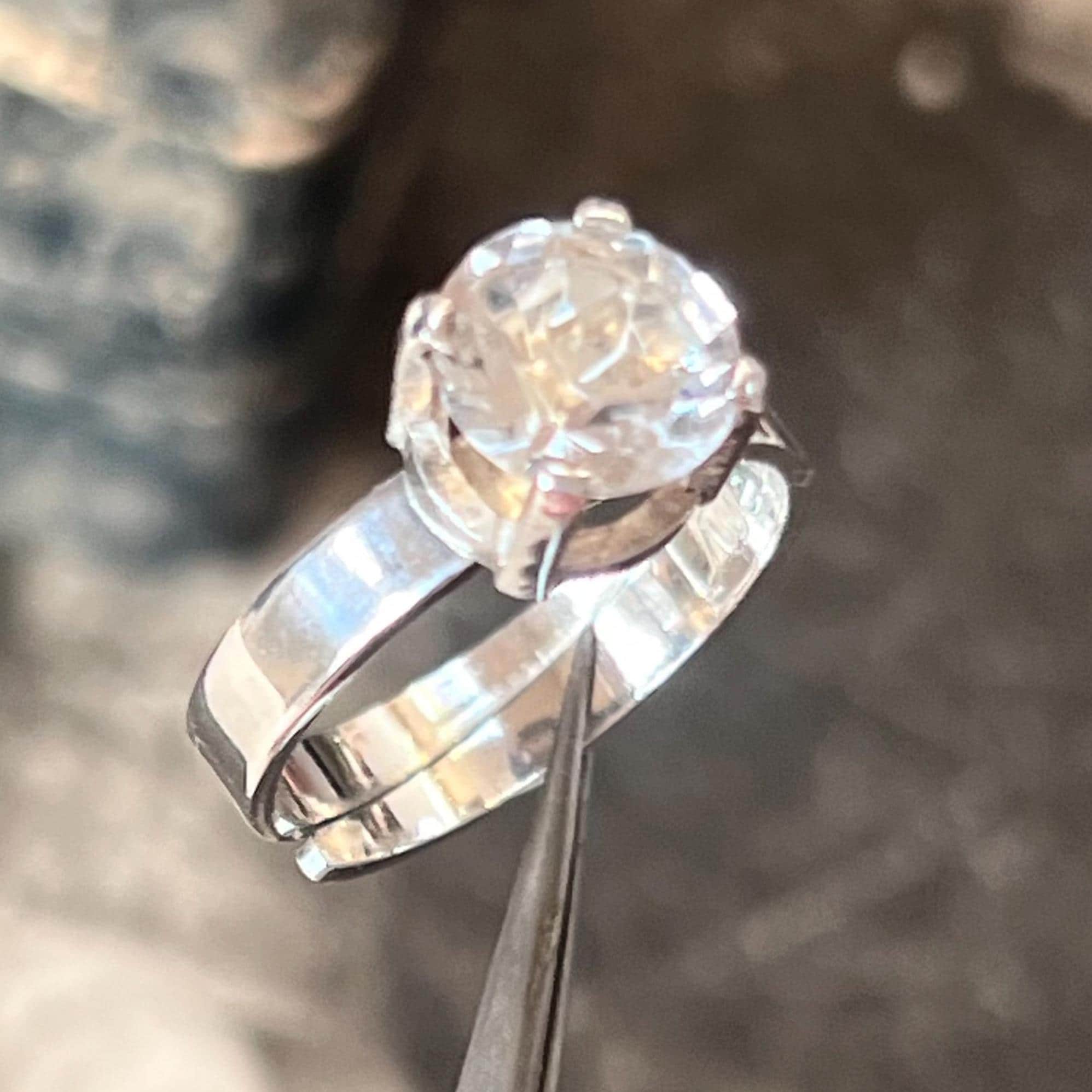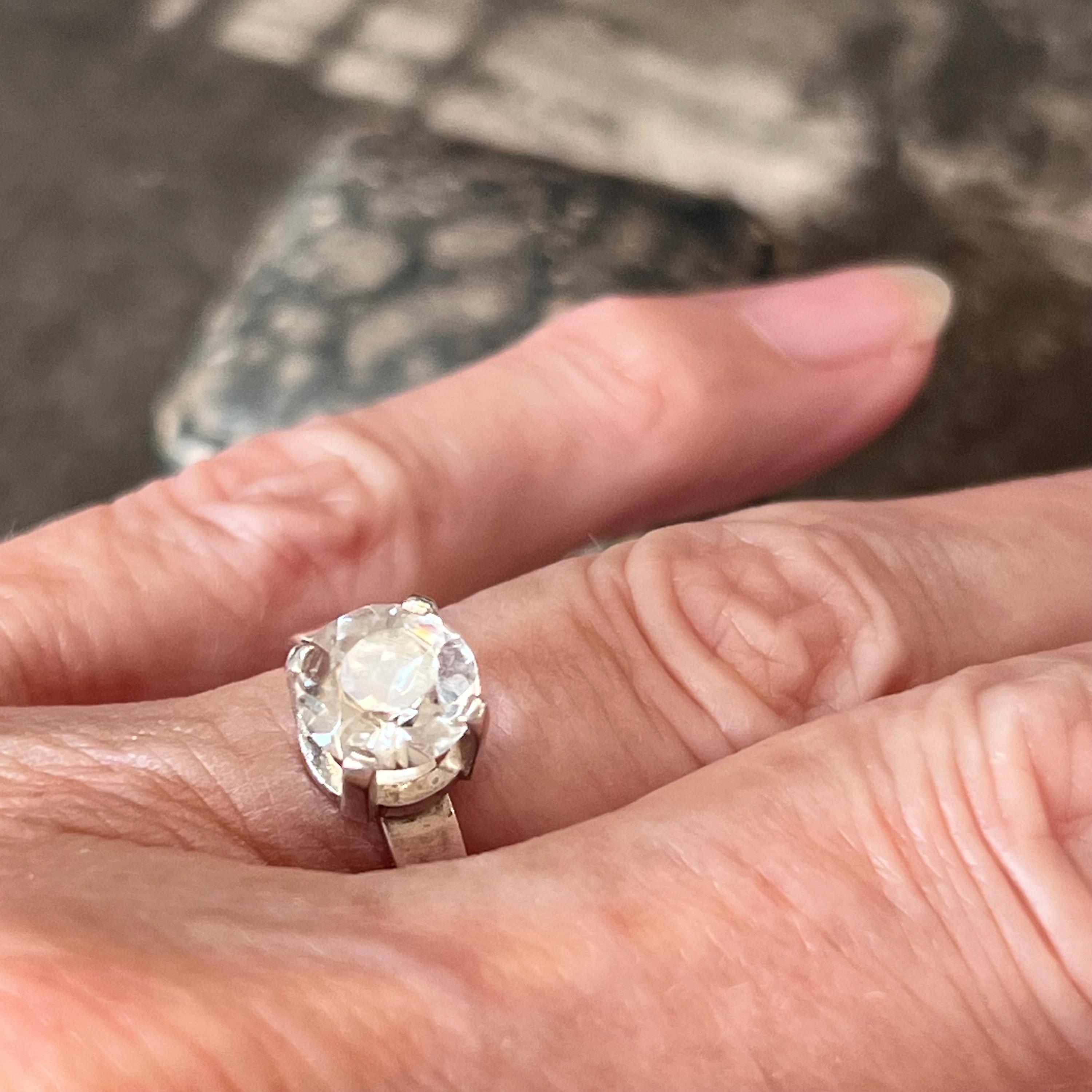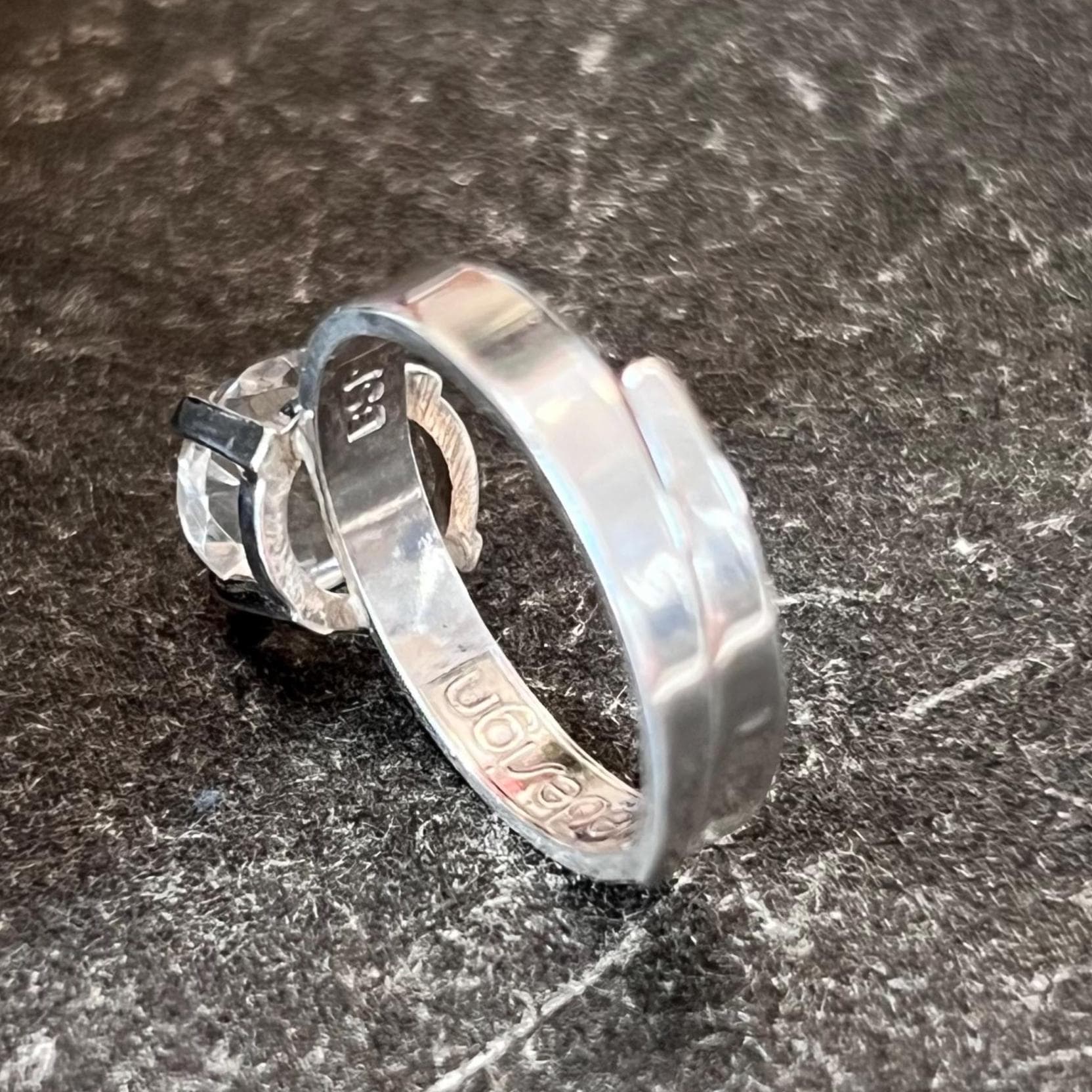 A striking vintage Swedish rock crystal ring by renowned designer Bengt Hallberg, crafted circa 1975 in solid 925 sterling silver. This collectible Scandinavian piece features a 7.5 mm round-cut rock crystal, sparkling with crisp, icy brilliance. Fully stamped ‘BeH’ (Bengt Hallberg), ‘Swedesign’, ‘925S’, and ‘BSP’ for Bent Stausholm Polsen of Denmark, confirming authenticity and origin.